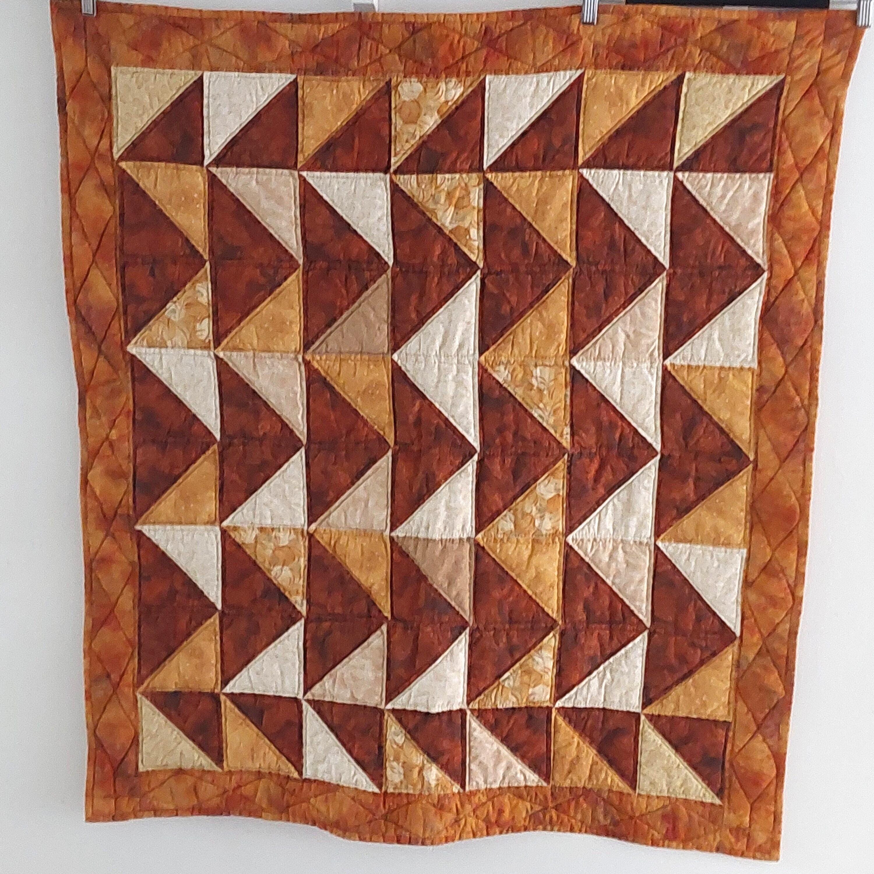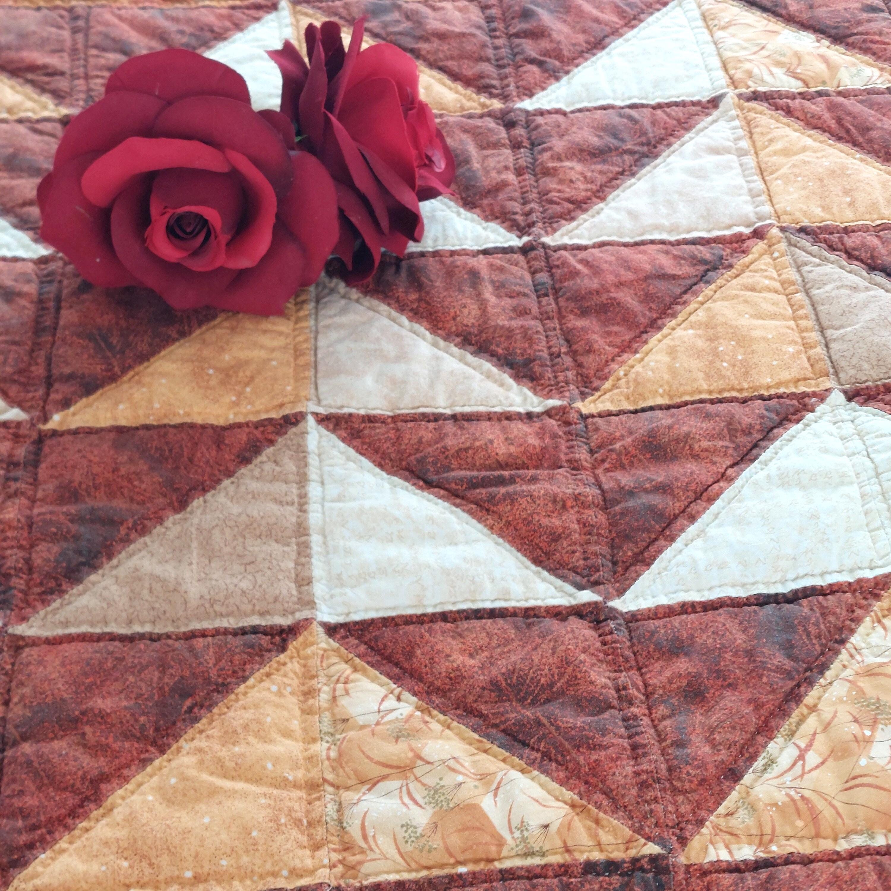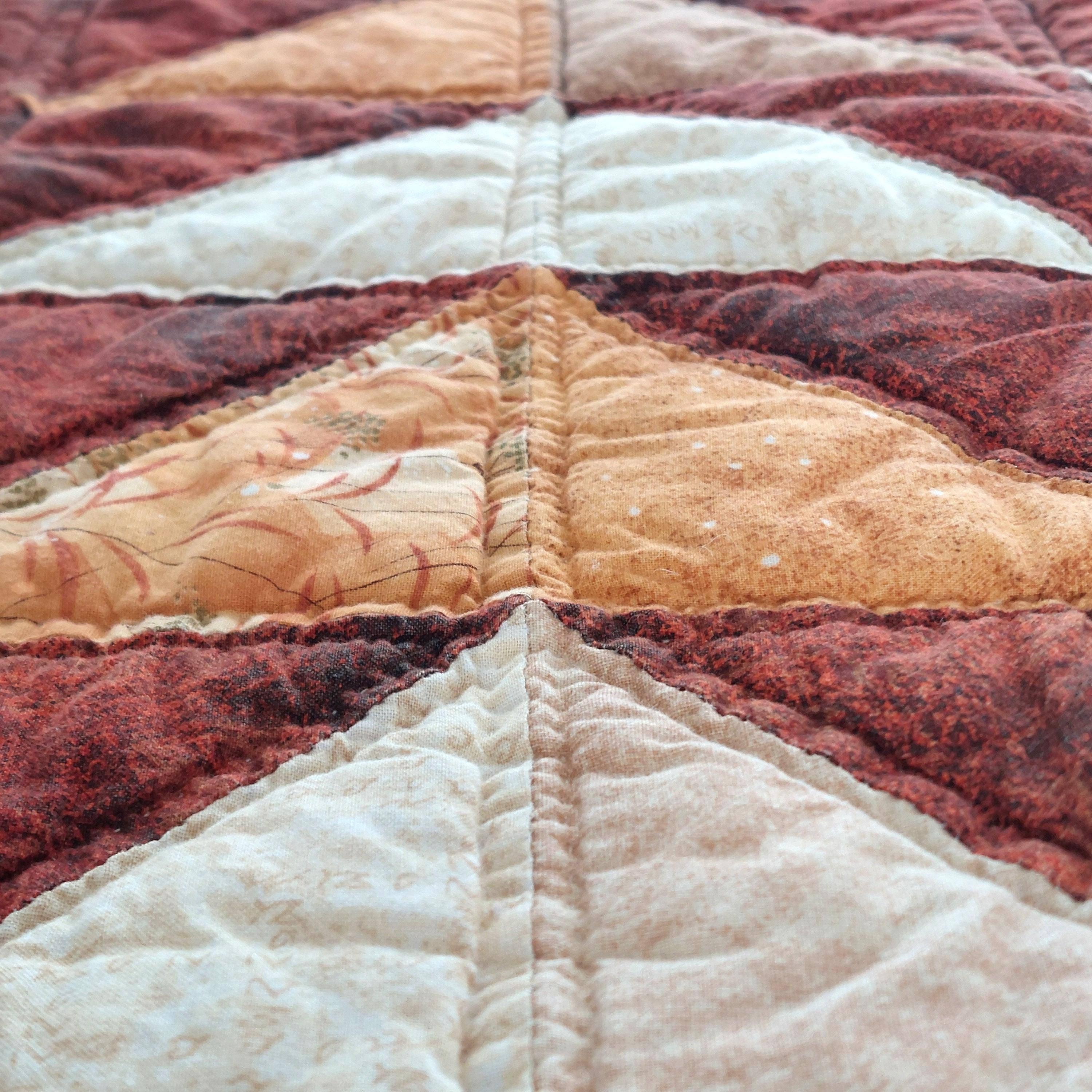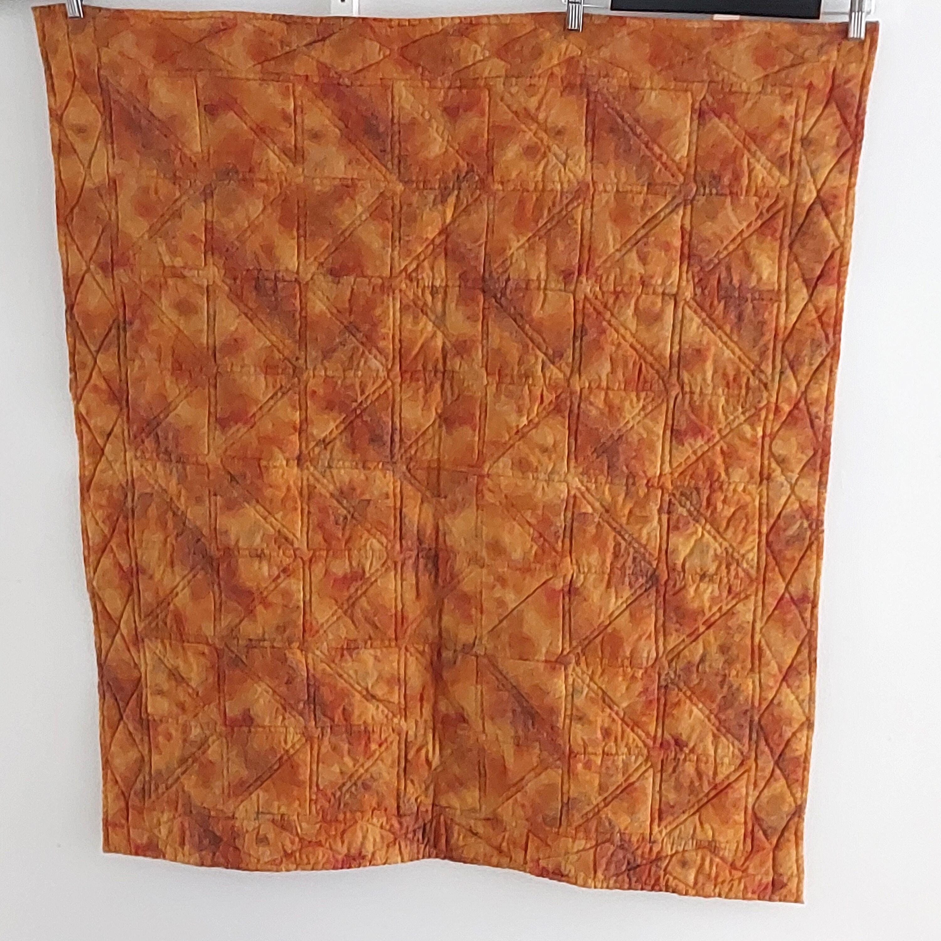 This vintage quilted table topper or wall hanging measures 42 by 37 inches and features rich orange shades. Handmade with a combination of machine and hand stitching, it offers authentic country decor charm.