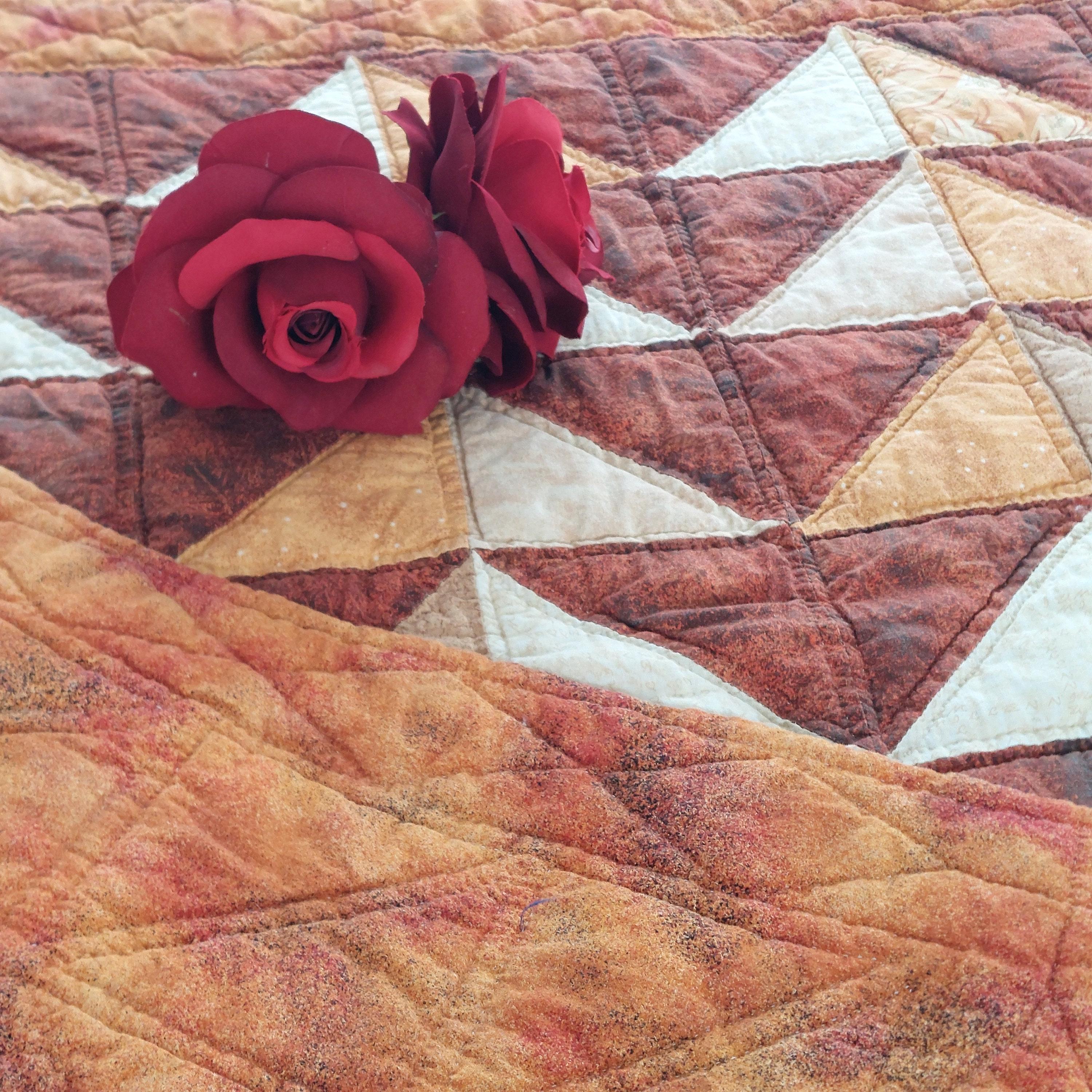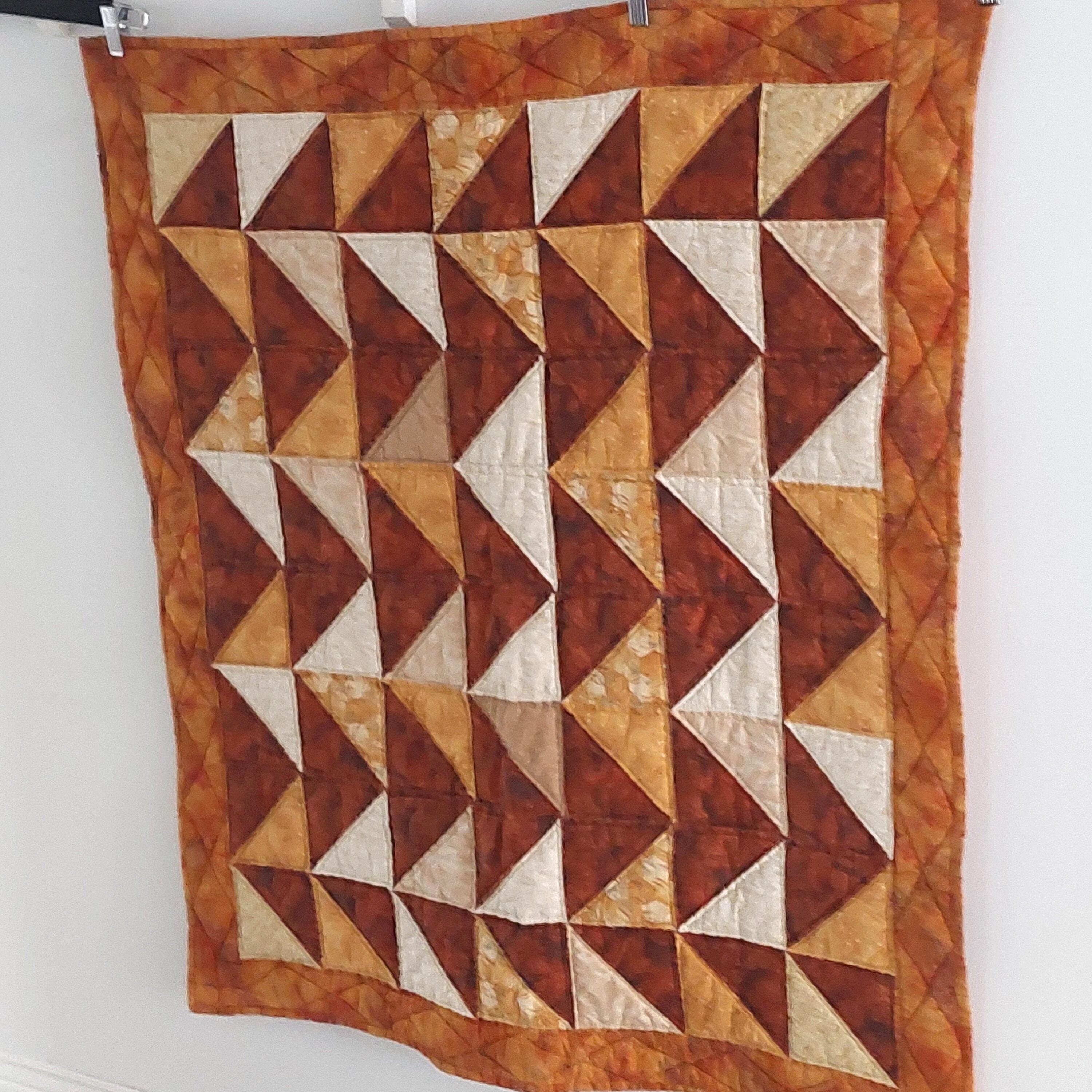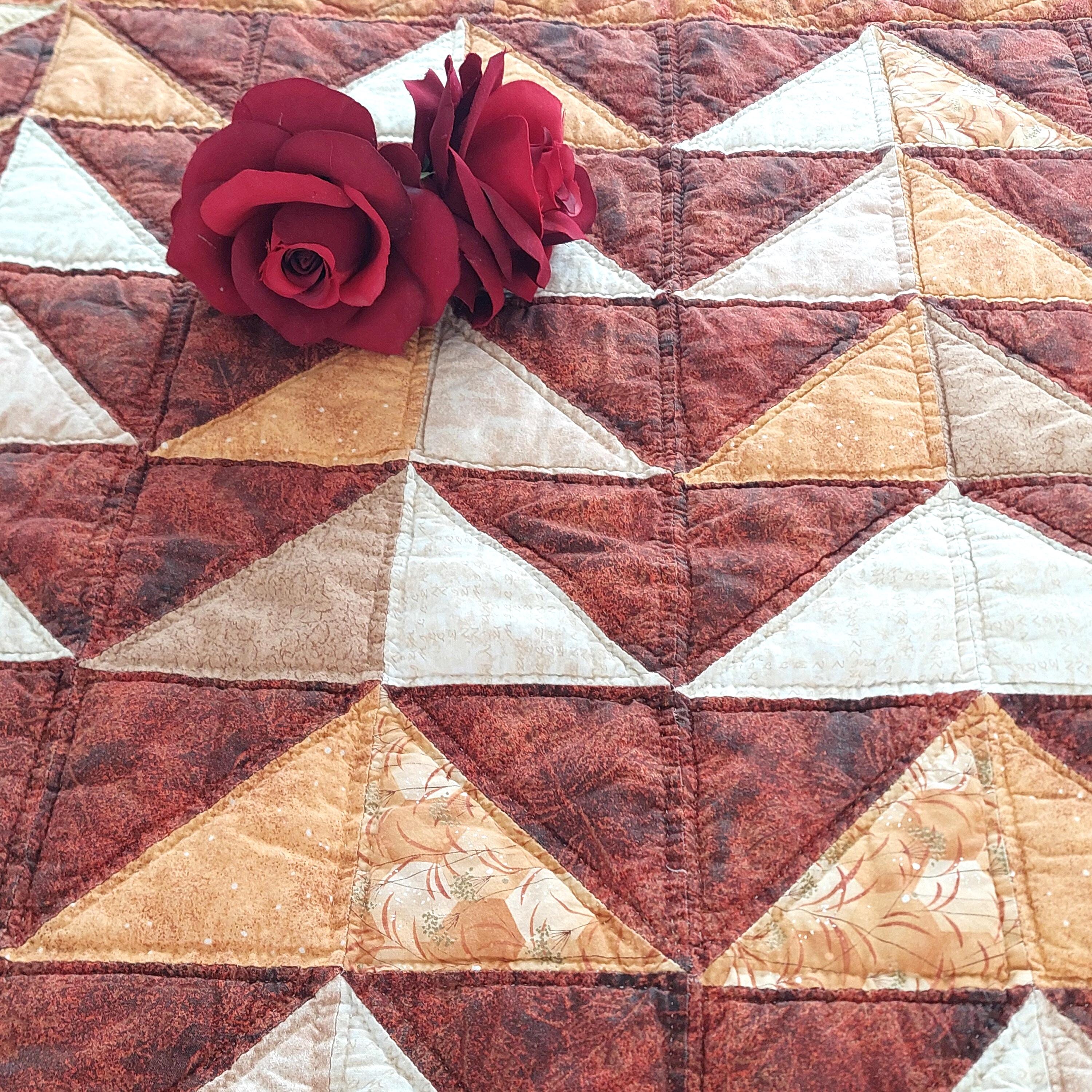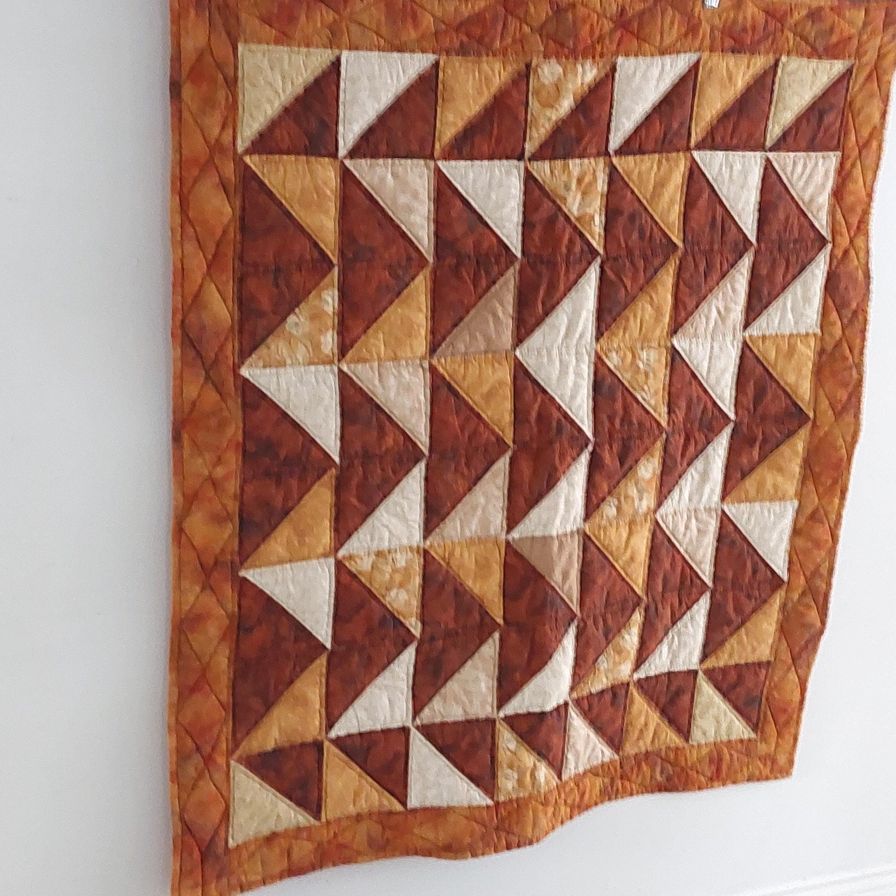 This vintage quilted table topper or wall hanging measures 42 by 37 inches and features rich orange shades. Handmade with a combination of machine and hand stitching, it offers authentic country decor charm.