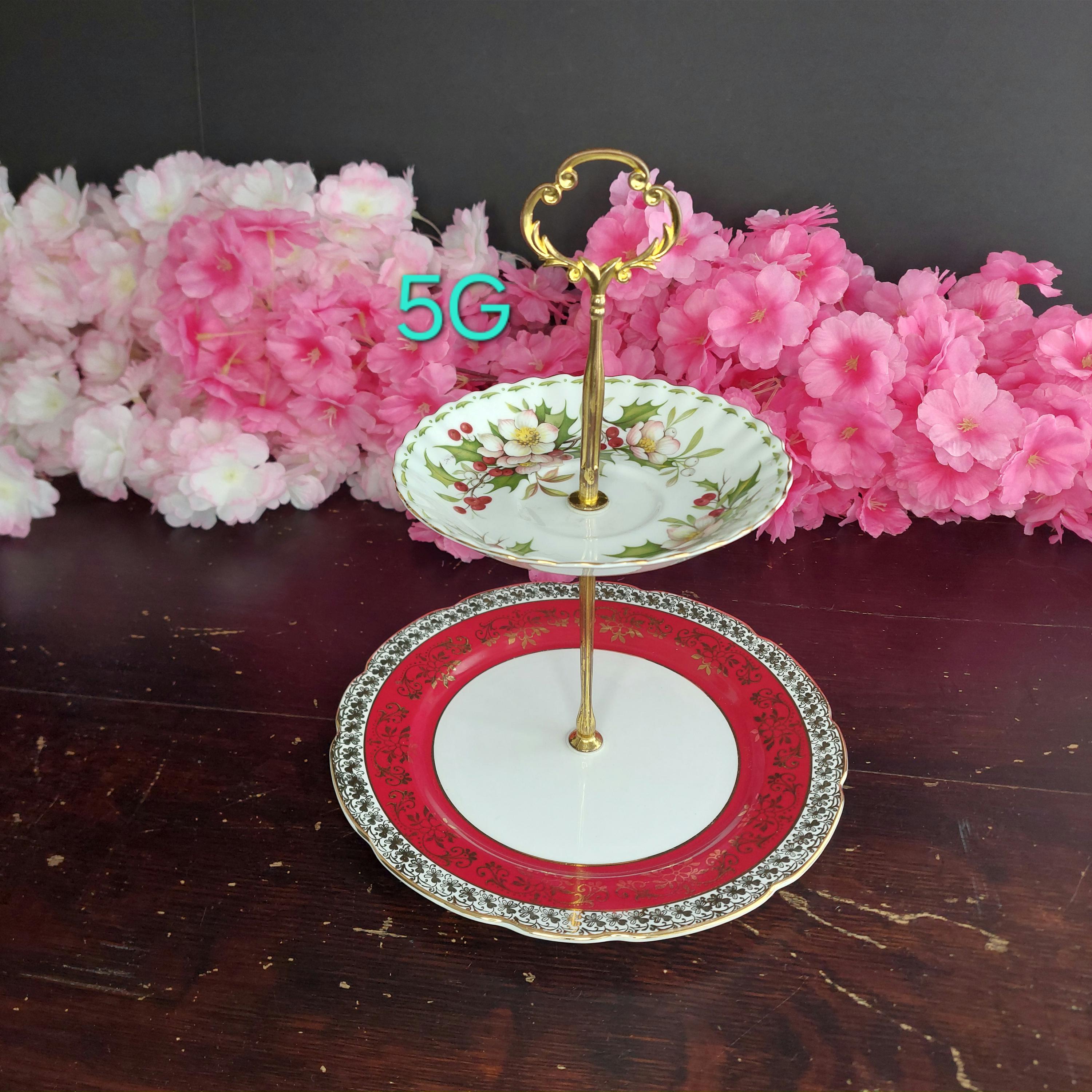 Two tier small cake stand, made by me, using vintage English bone china saucer, side and salad plates, paired with new gold or silver tone hardware (as pictured). All saucers & plates are bone china. All made in England.