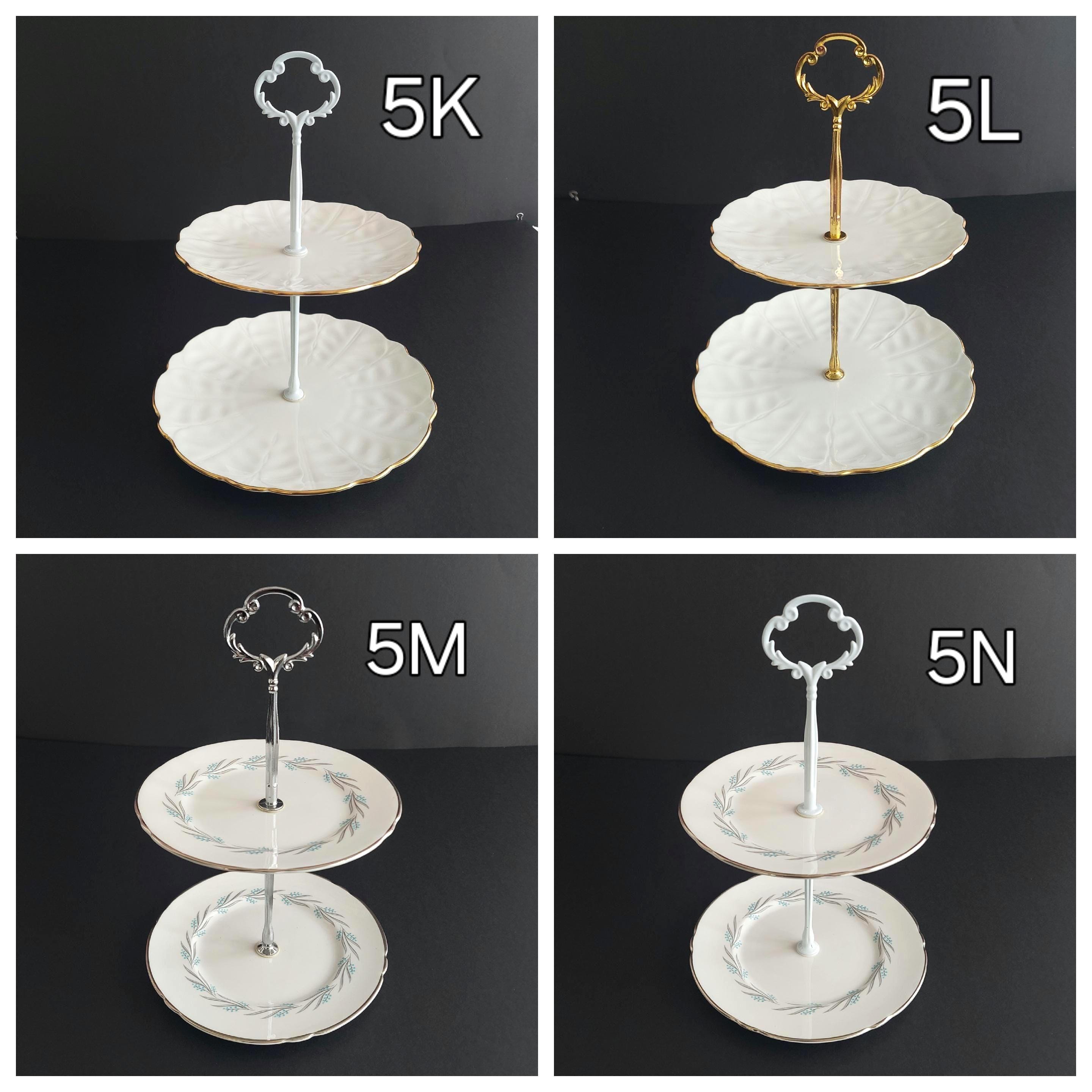 Two tier small cake stand, made by me, using vintage English bone china saucer, side and salad plates, paired with new gold or silver tone hardware (as pictured). Choice of new pink hardware. All saucers & plates are bone china. All made in England.