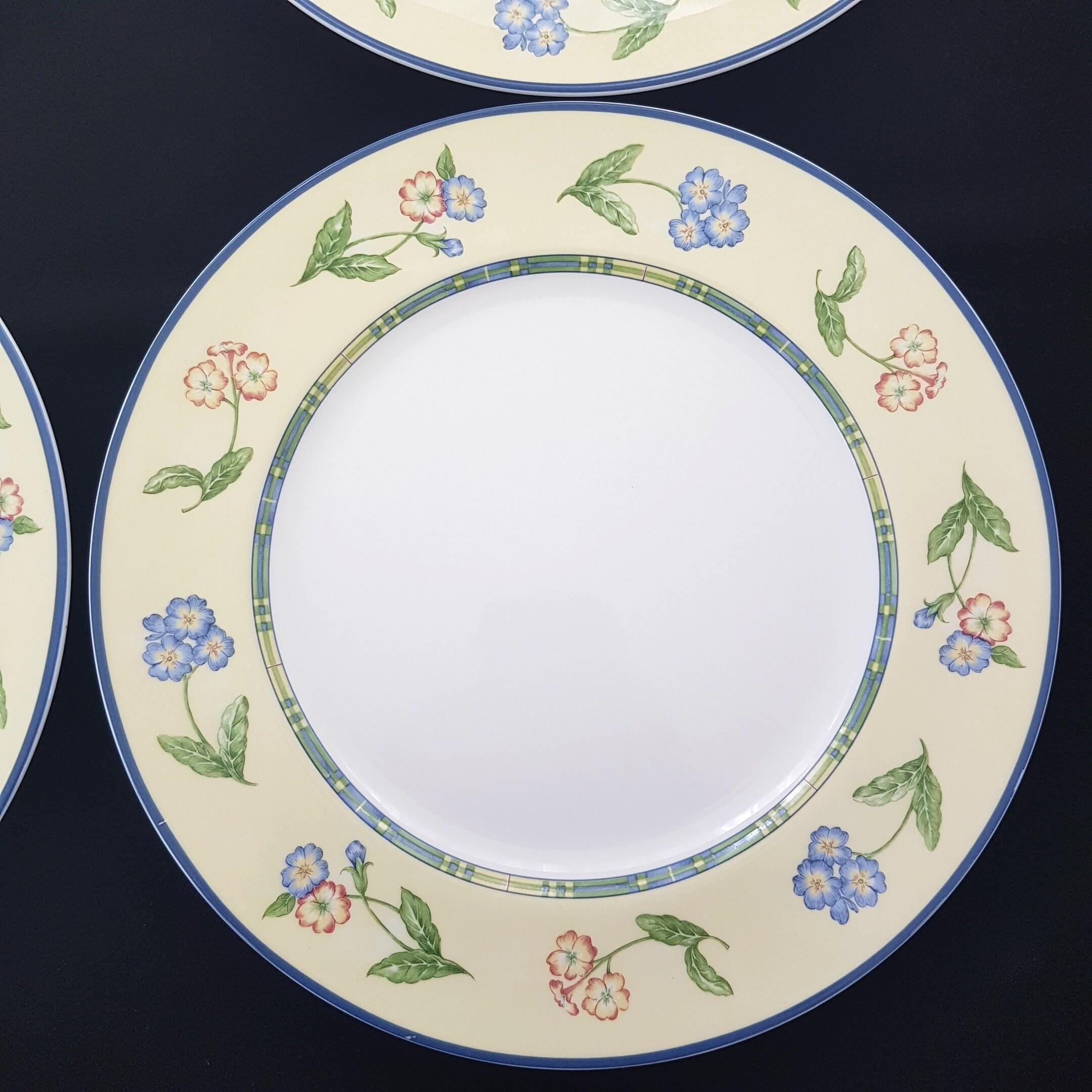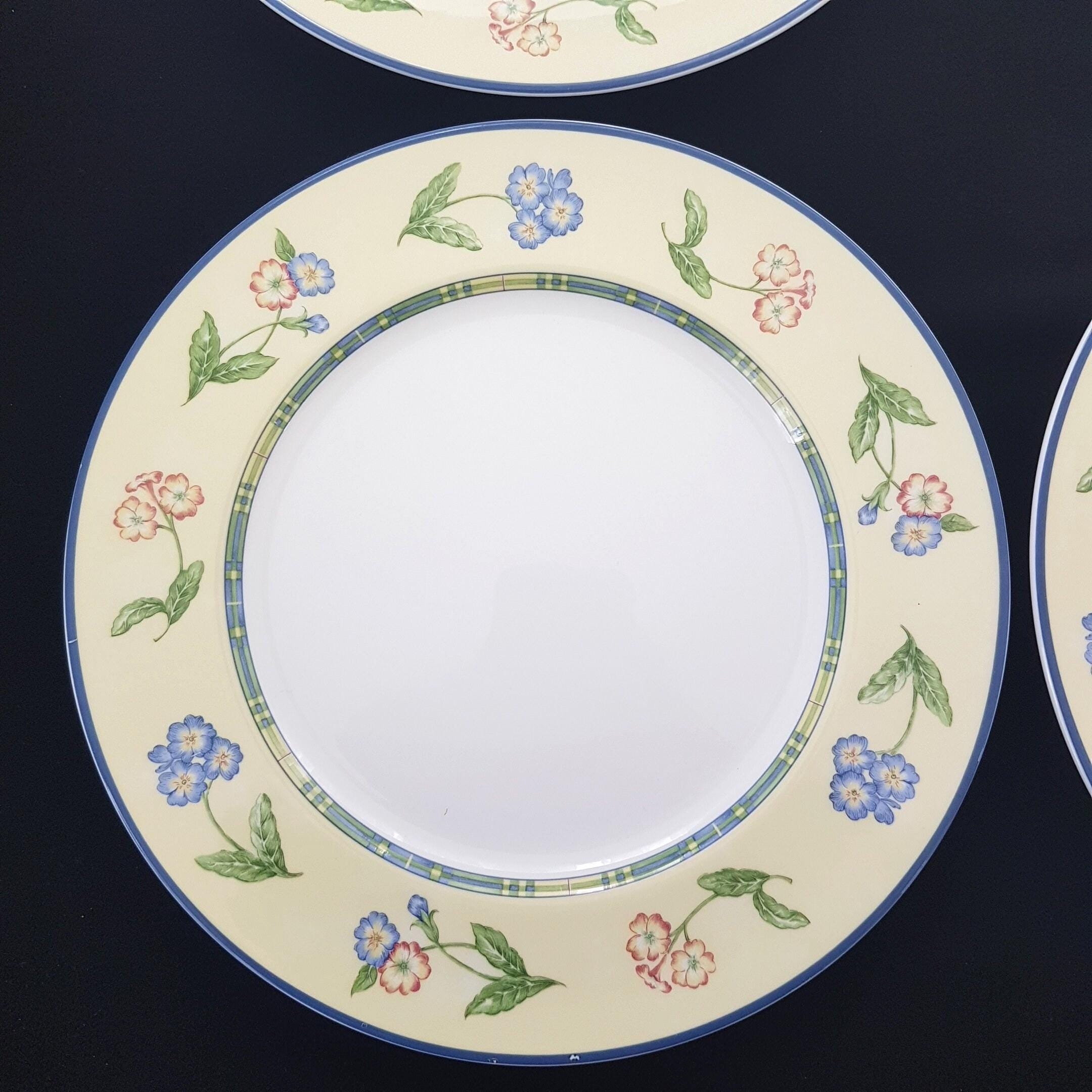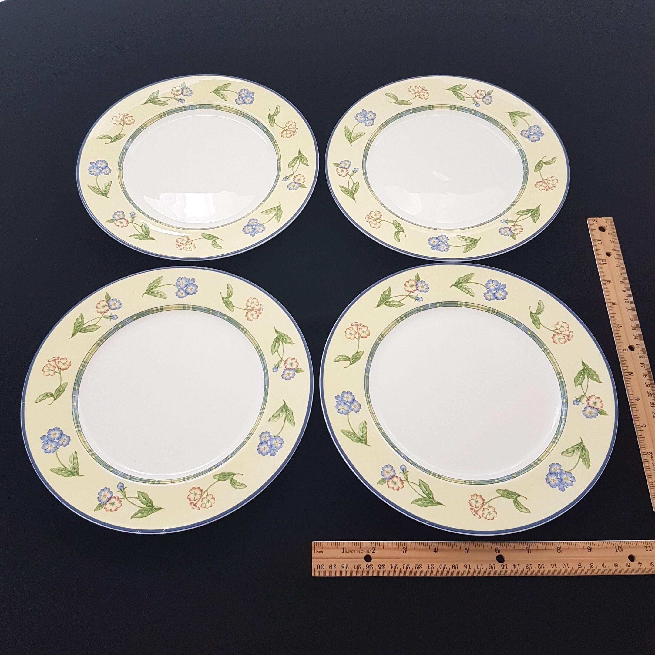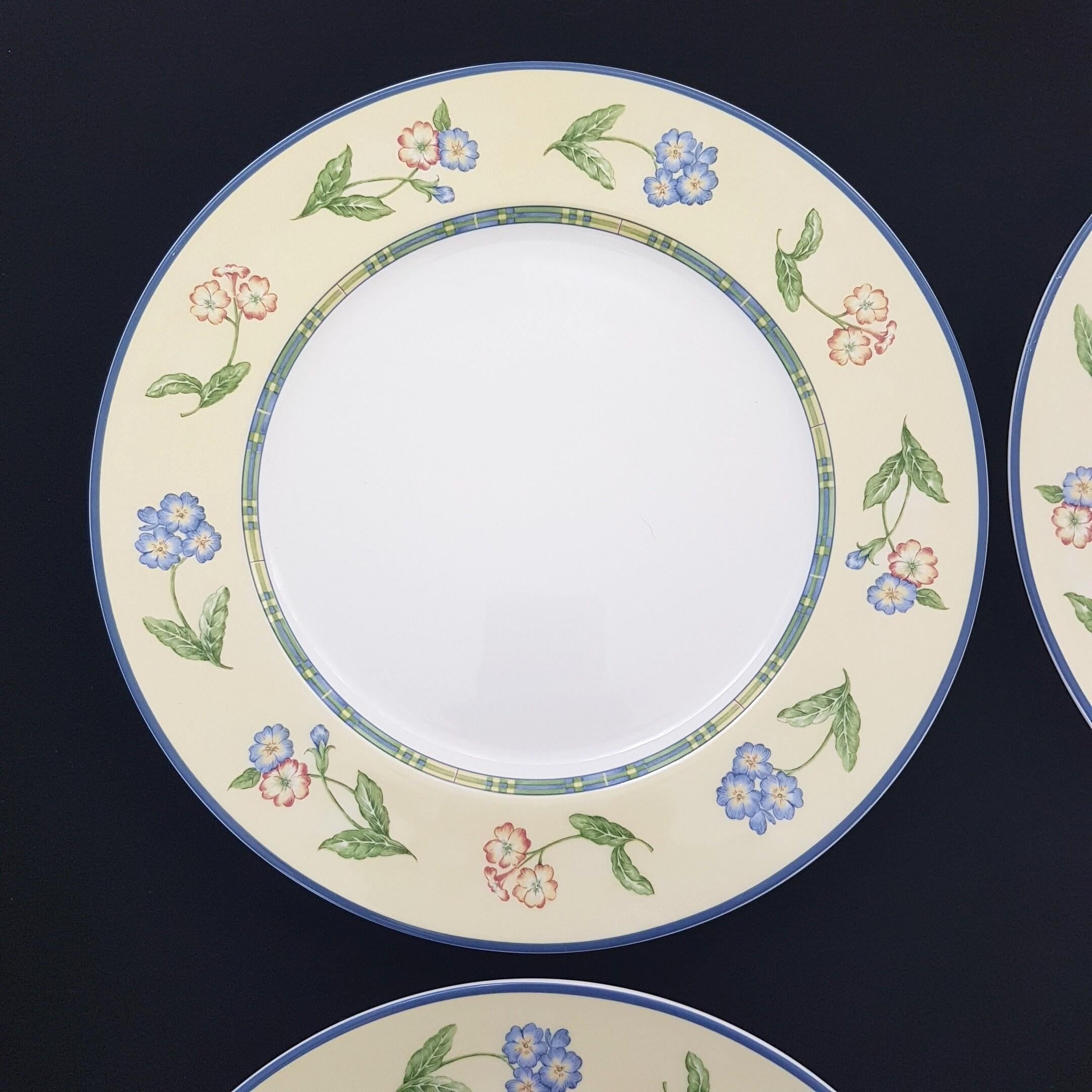 Vintage bone china dinner plate set in Grafton Living's Highland Border. A pretty floral pattern in red and blue on a light yellow background. Center is crisp white with a yellow and blue tartan ring and blue painted edge. Made in England, circa 1998