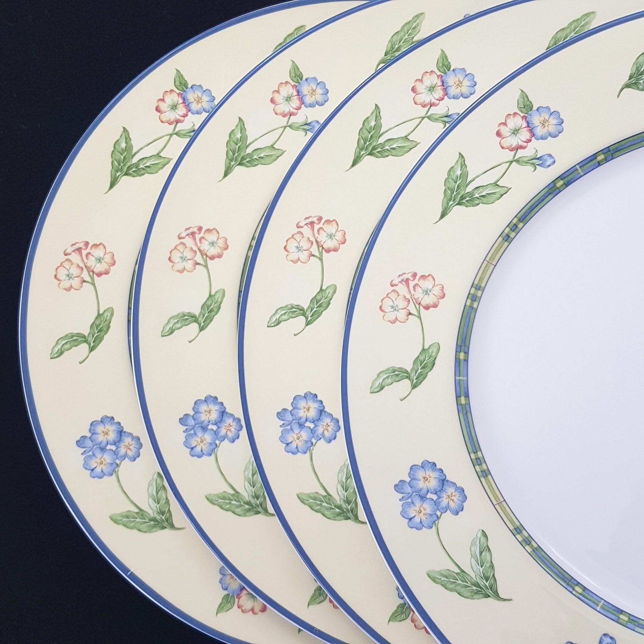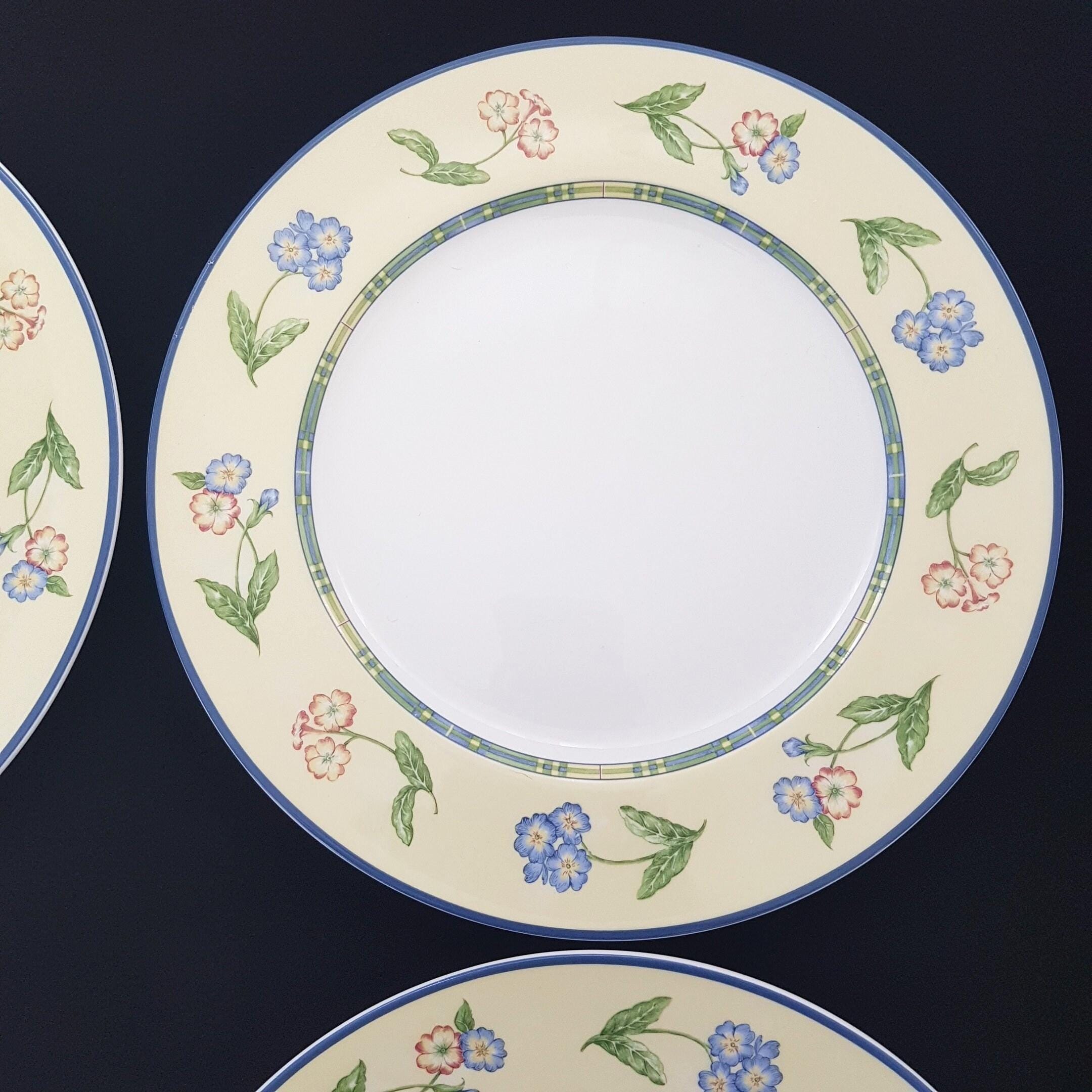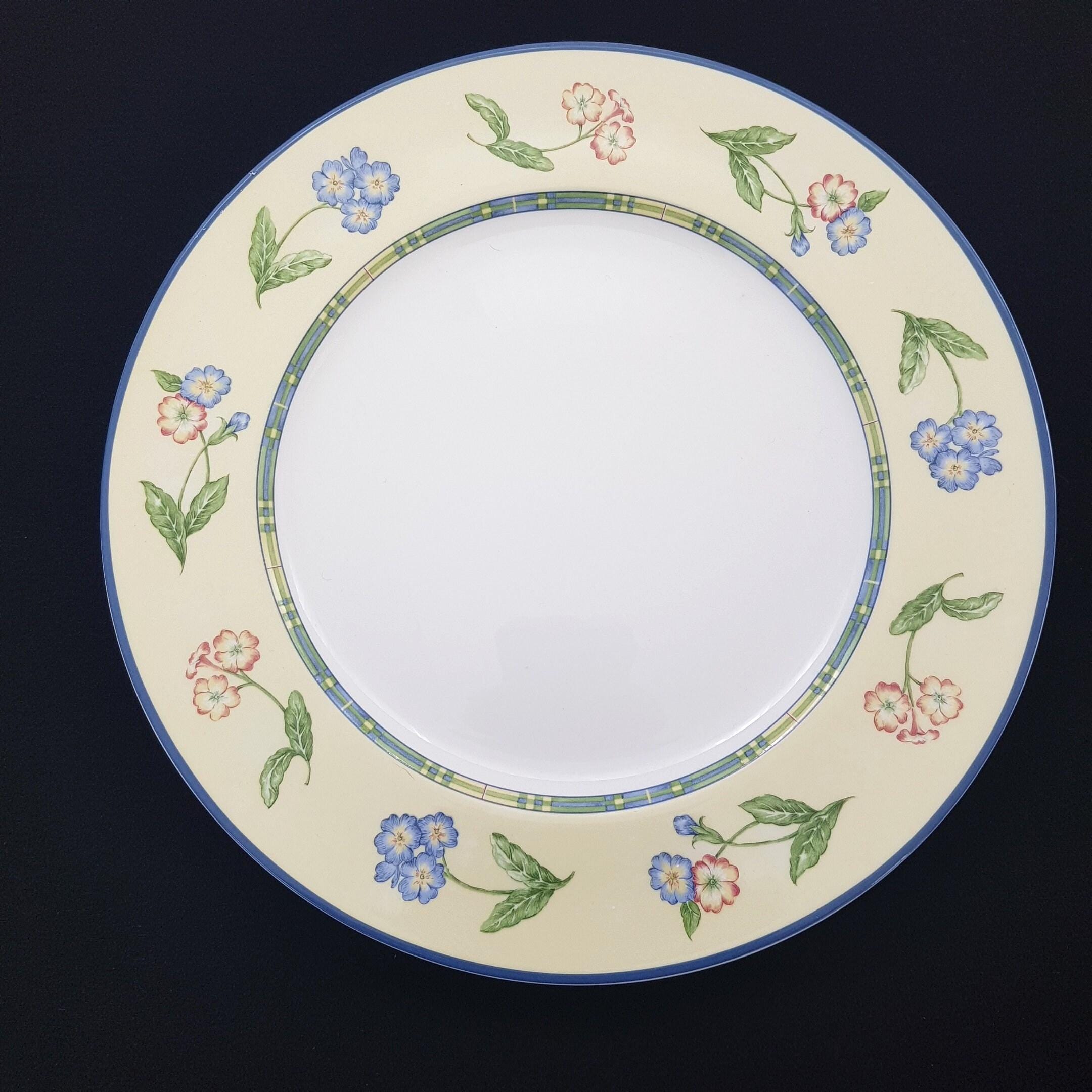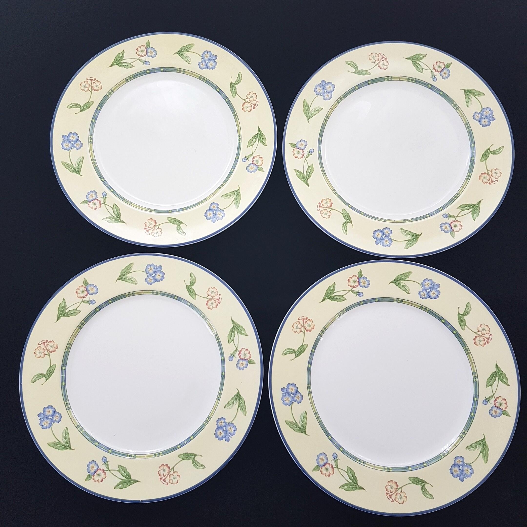 Vintage bone china dinner plate set in Grafton Living's Highland Border. A pretty floral pattern in red and blue on a light yellow background. Center is crisp white with a yellow and blue tartan ring and blue painted edge. Made in England, circa 1998