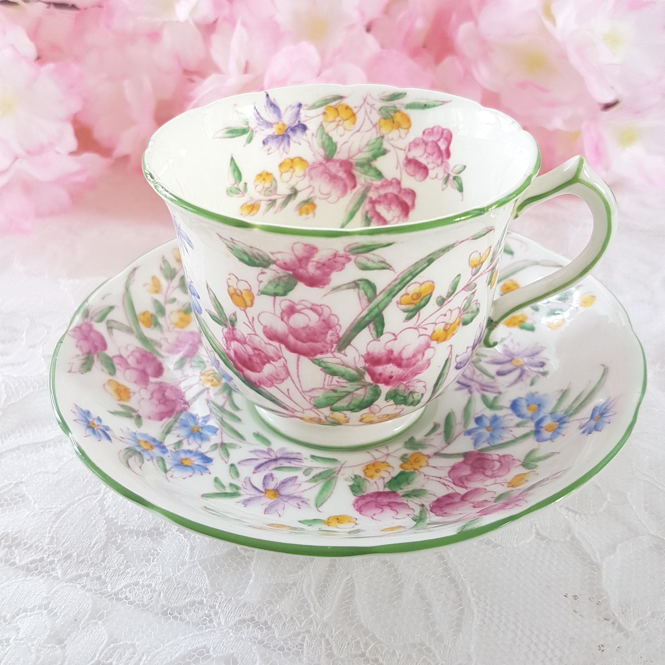 Vintage floral bone china tea cup and saucer by Hammersley & Co (England) Floral pattern in pink, blue, yellow and green with green painted edges. Made in England, circa 1970s