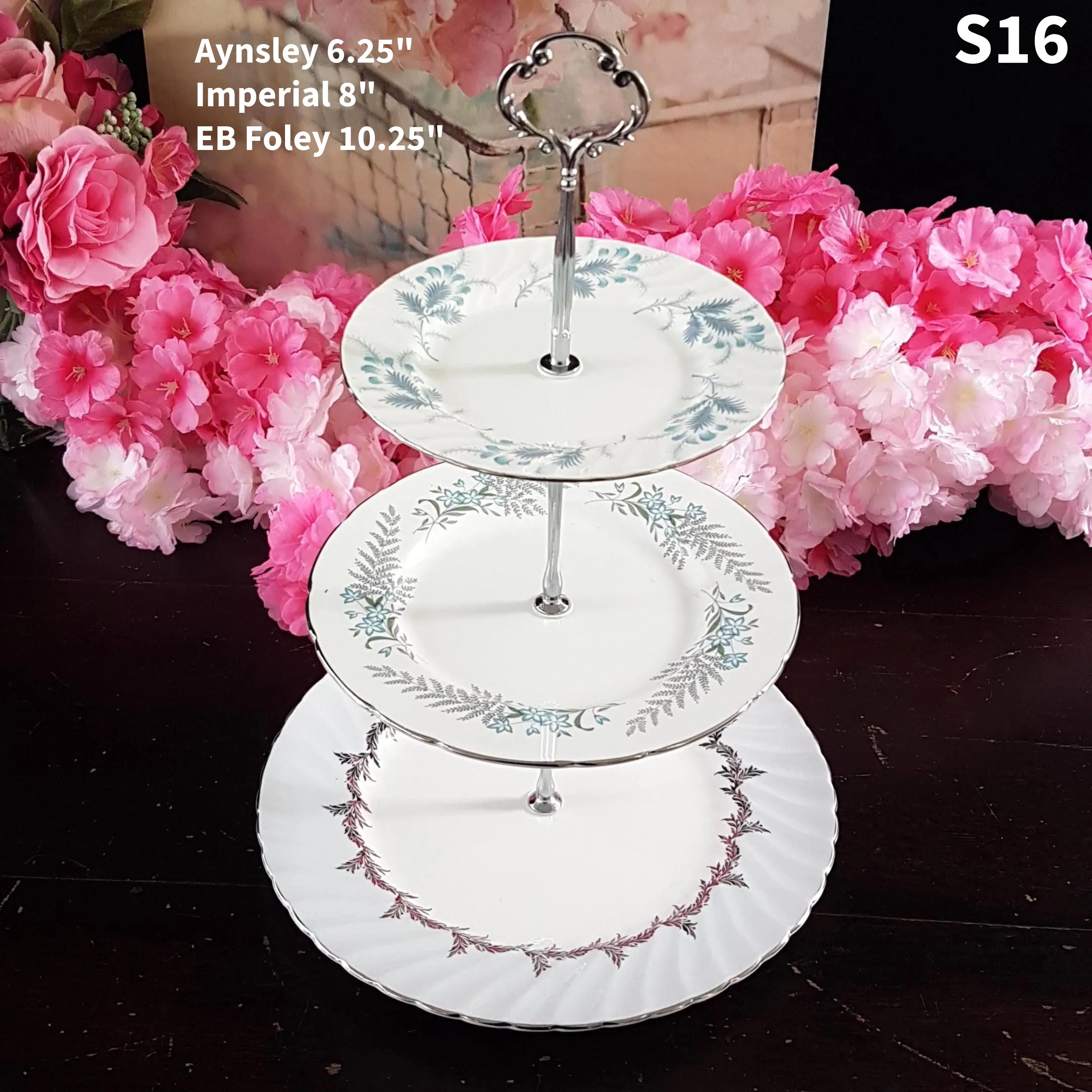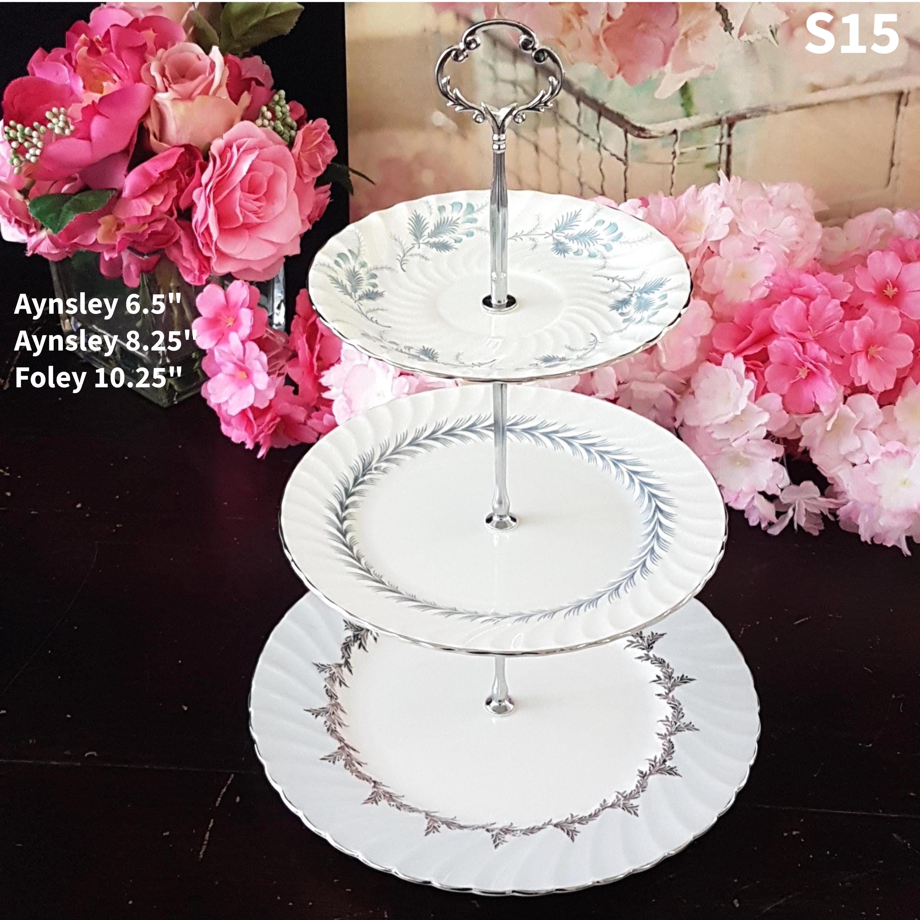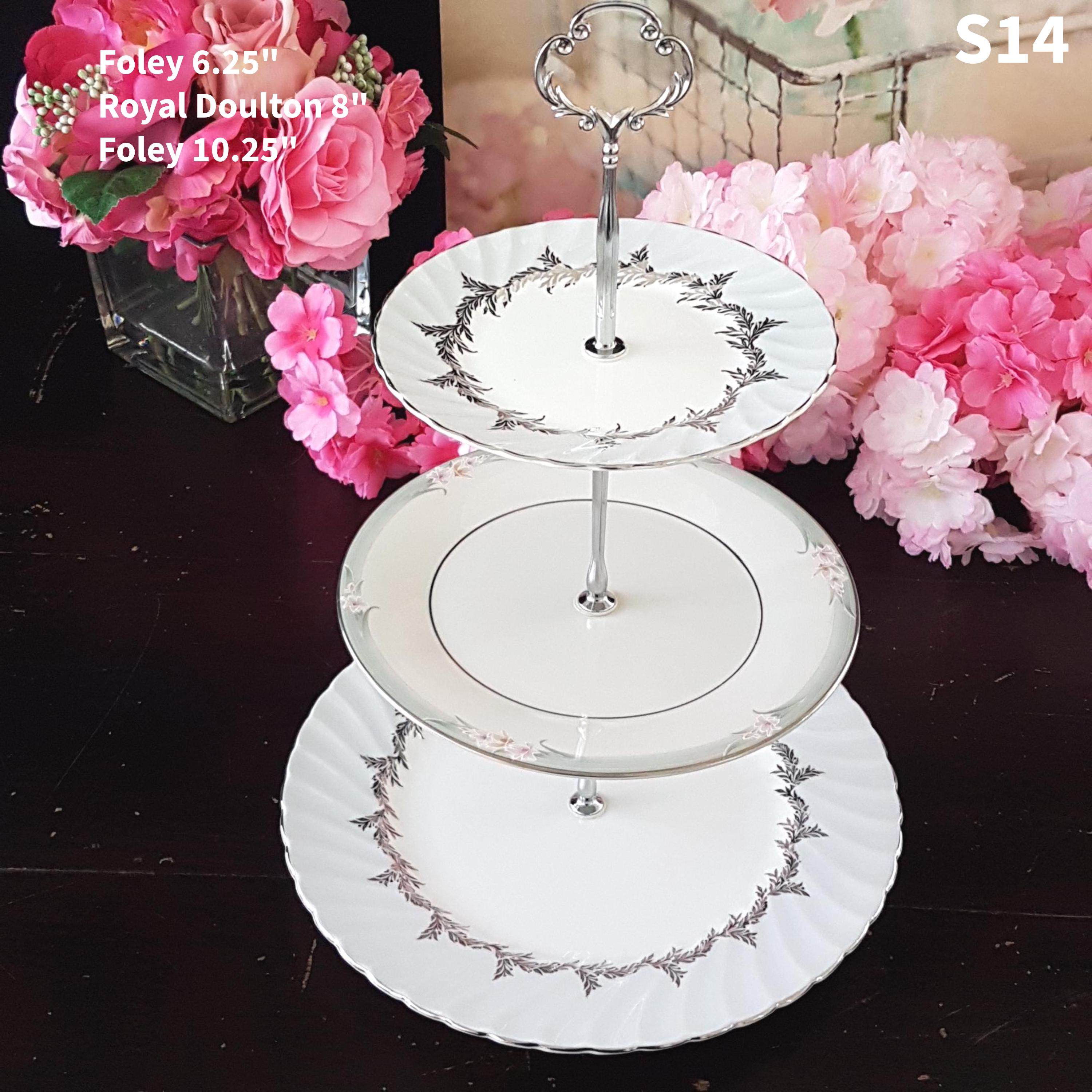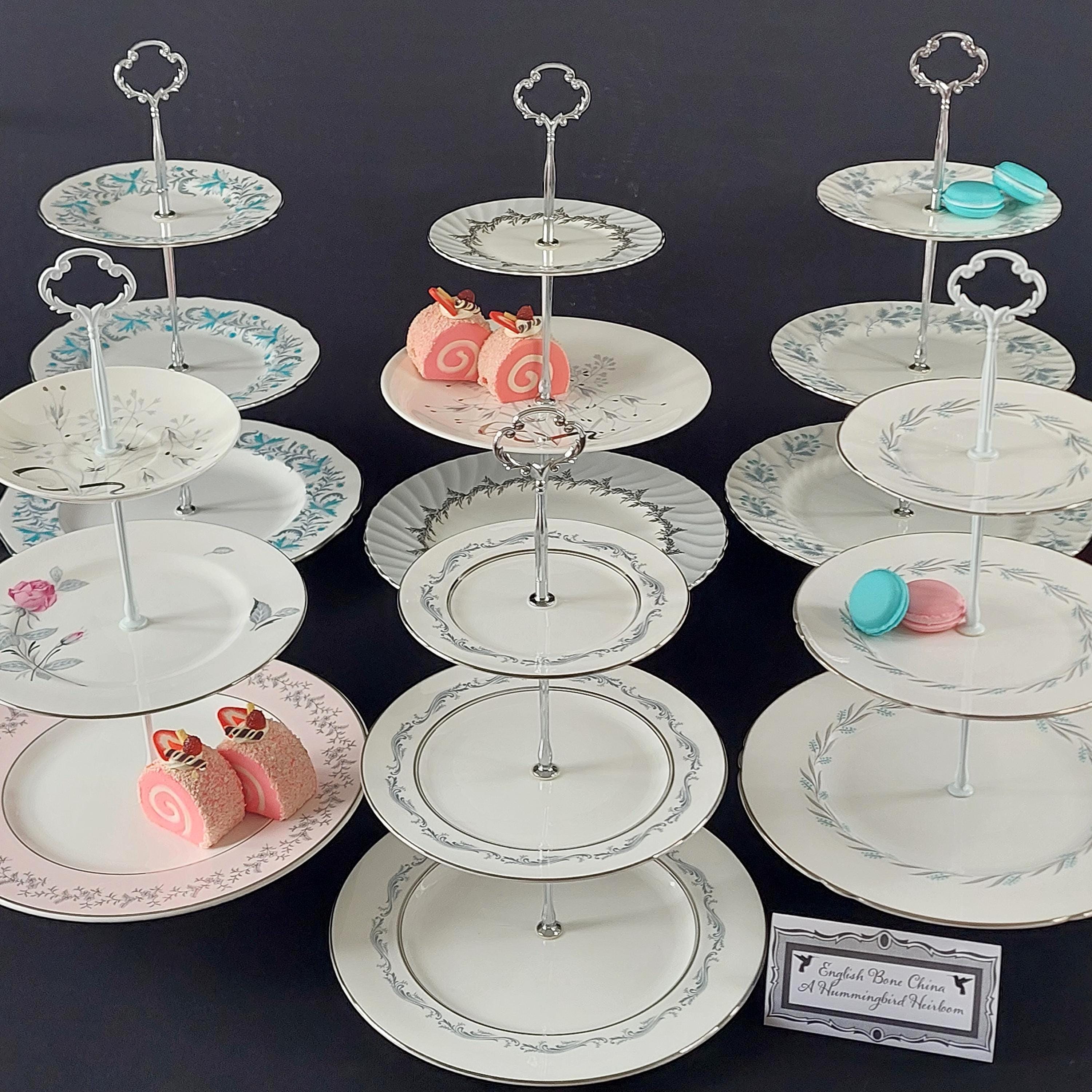 Three tier cake stands, made by me, using mismatched vintage English bone china plates with silver platinum edge.