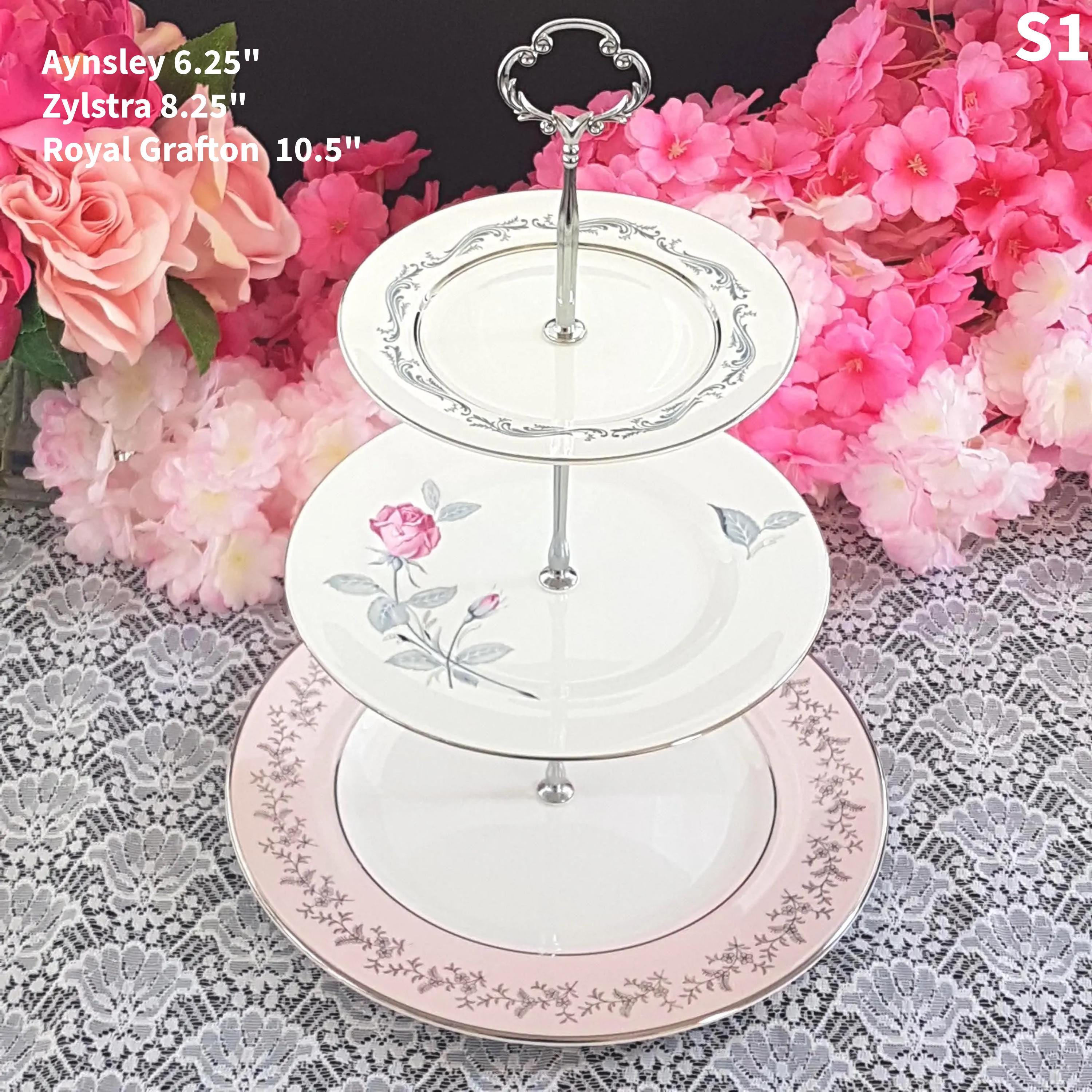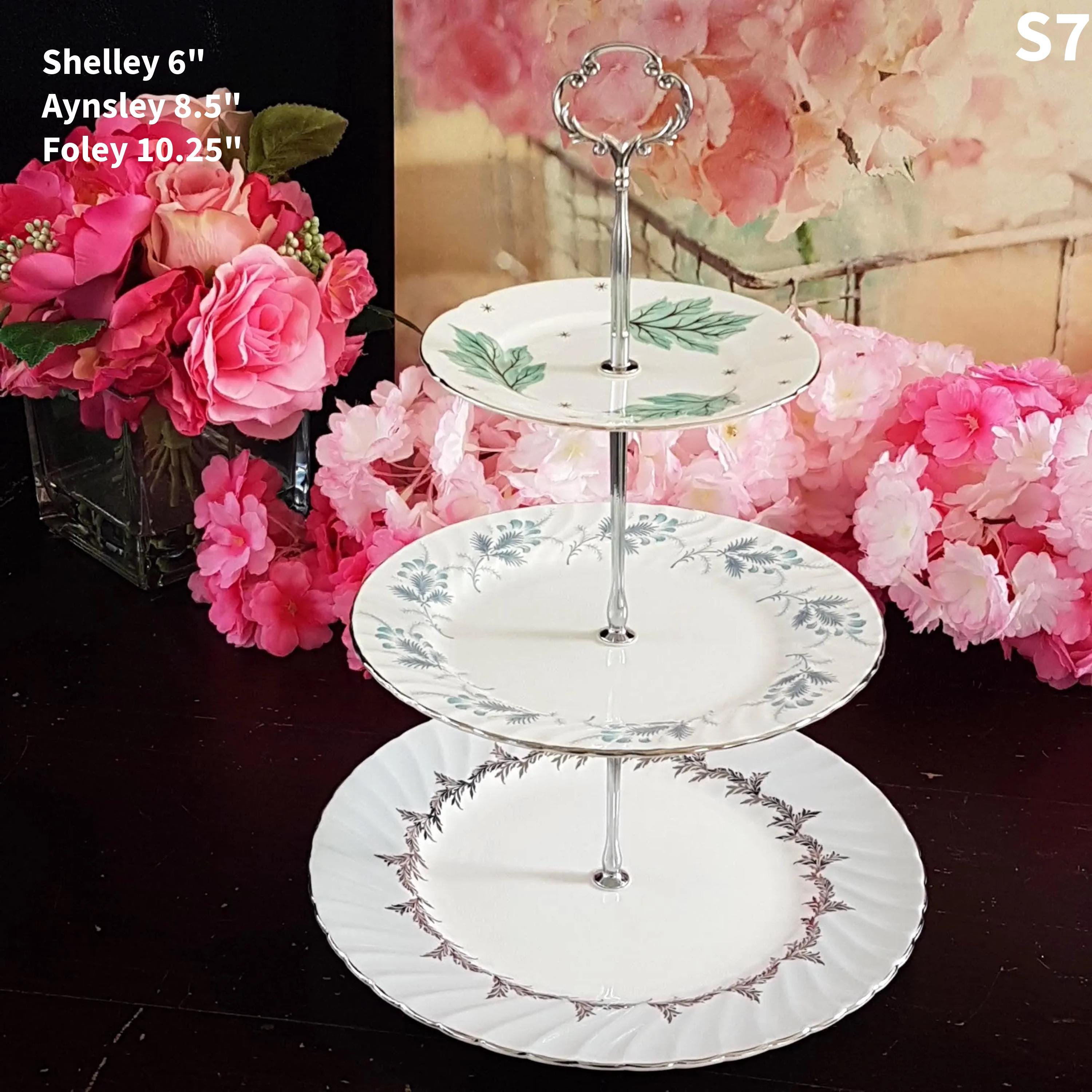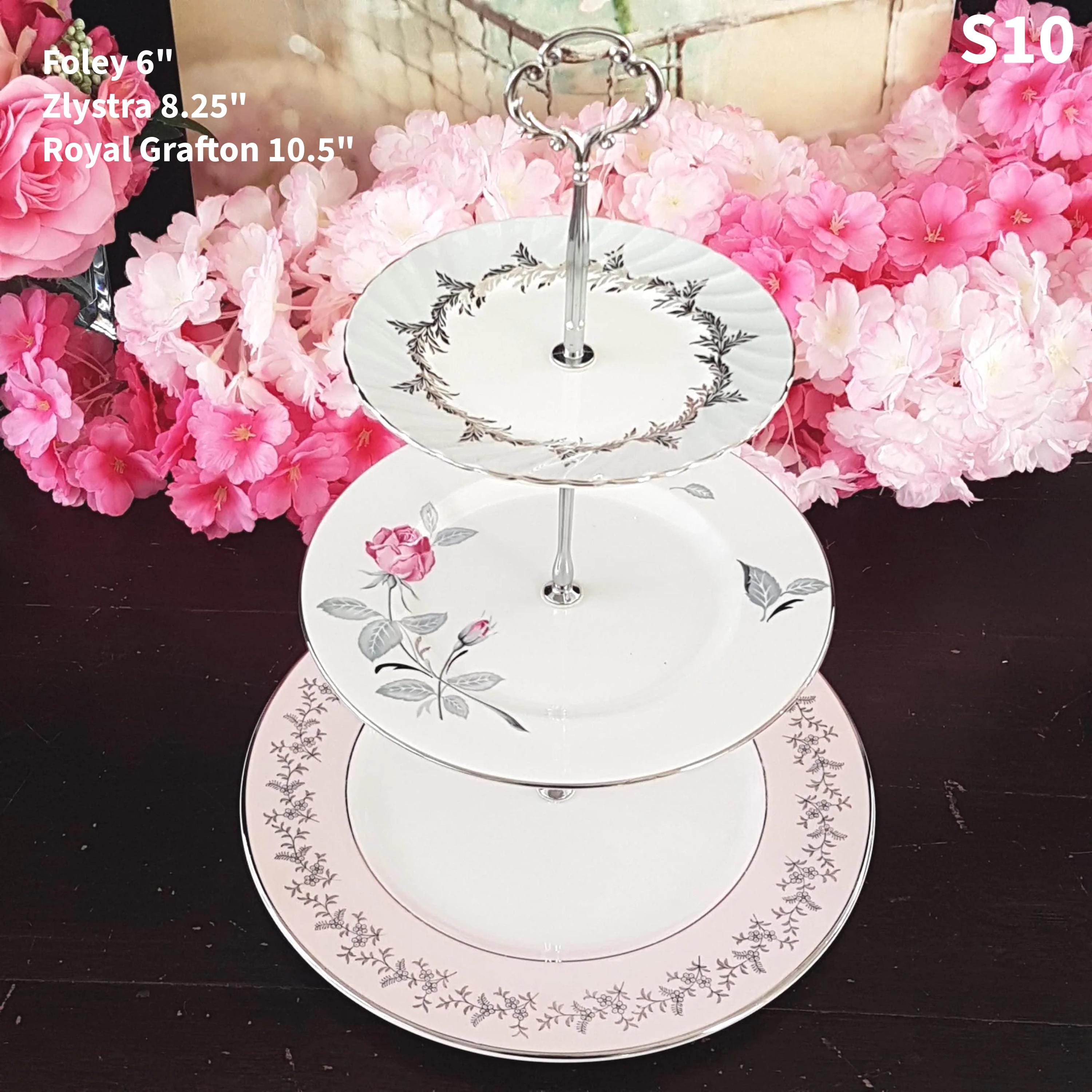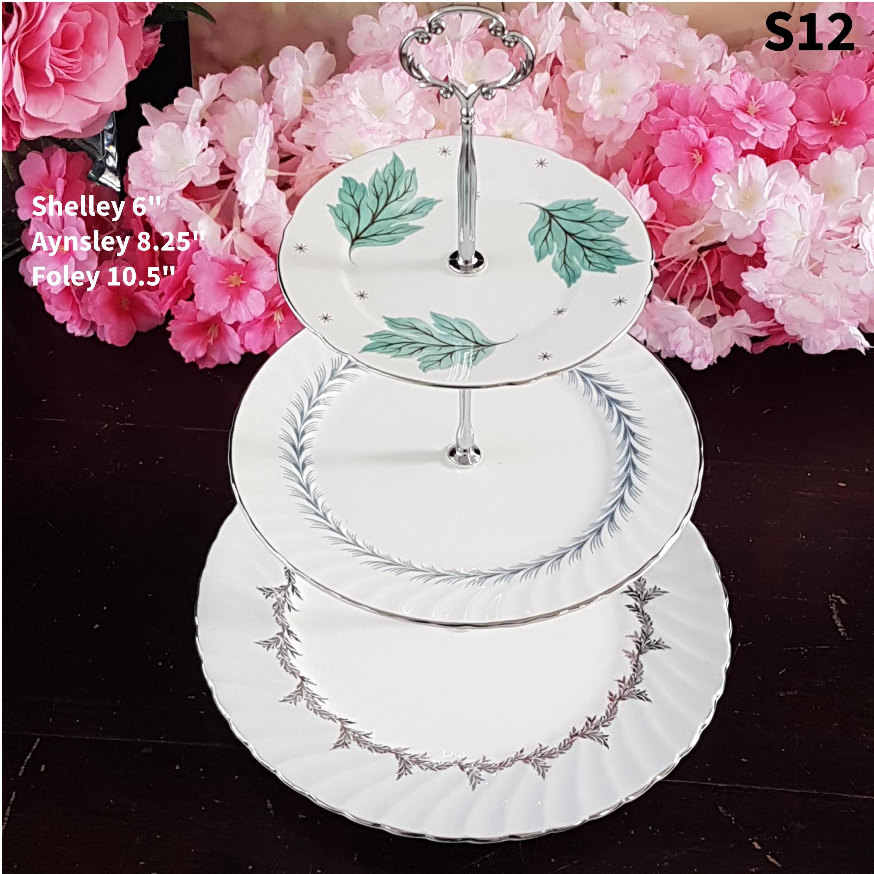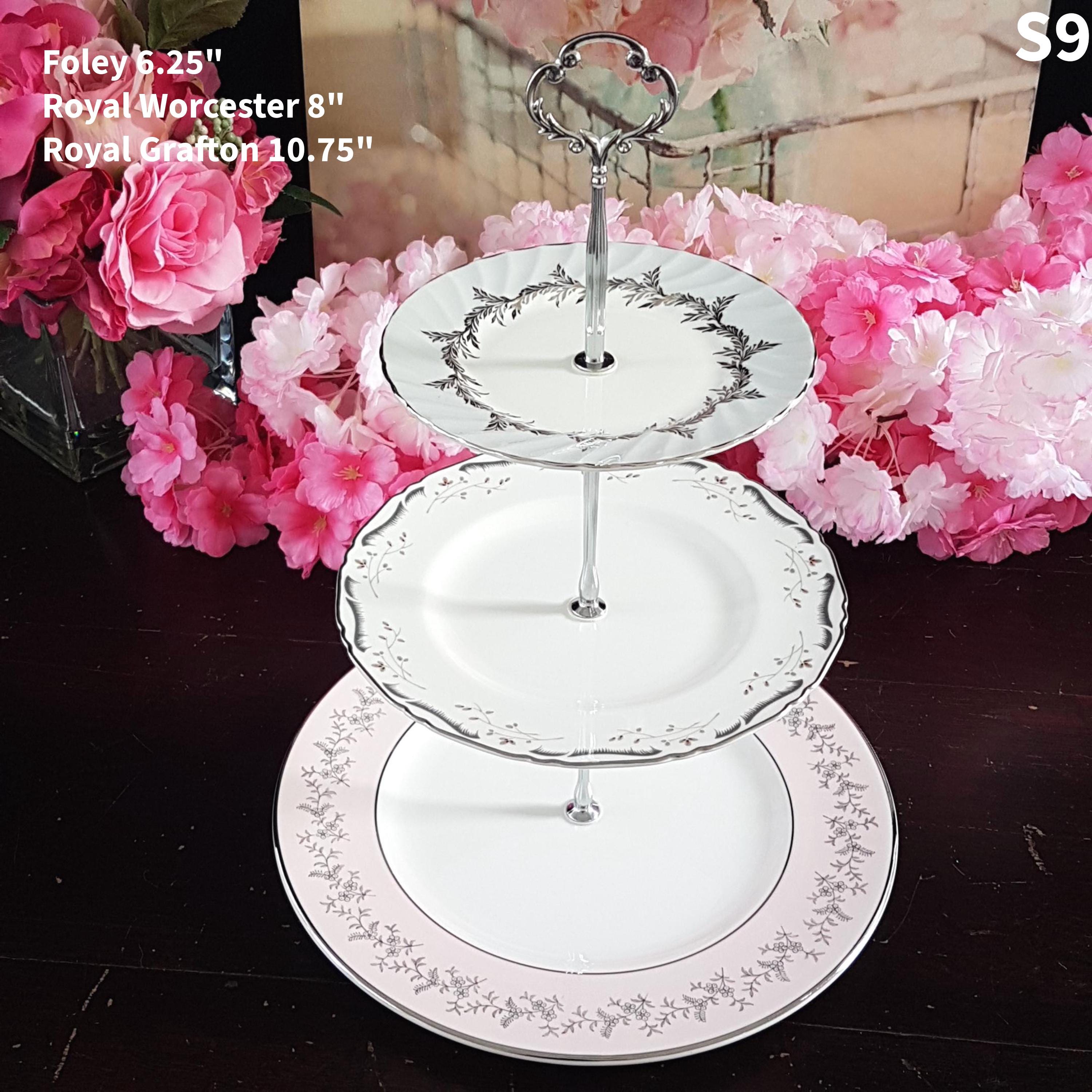 Three tier cake stands, made by me, using mismatched vintage English bone china plates with silver platinum edge.