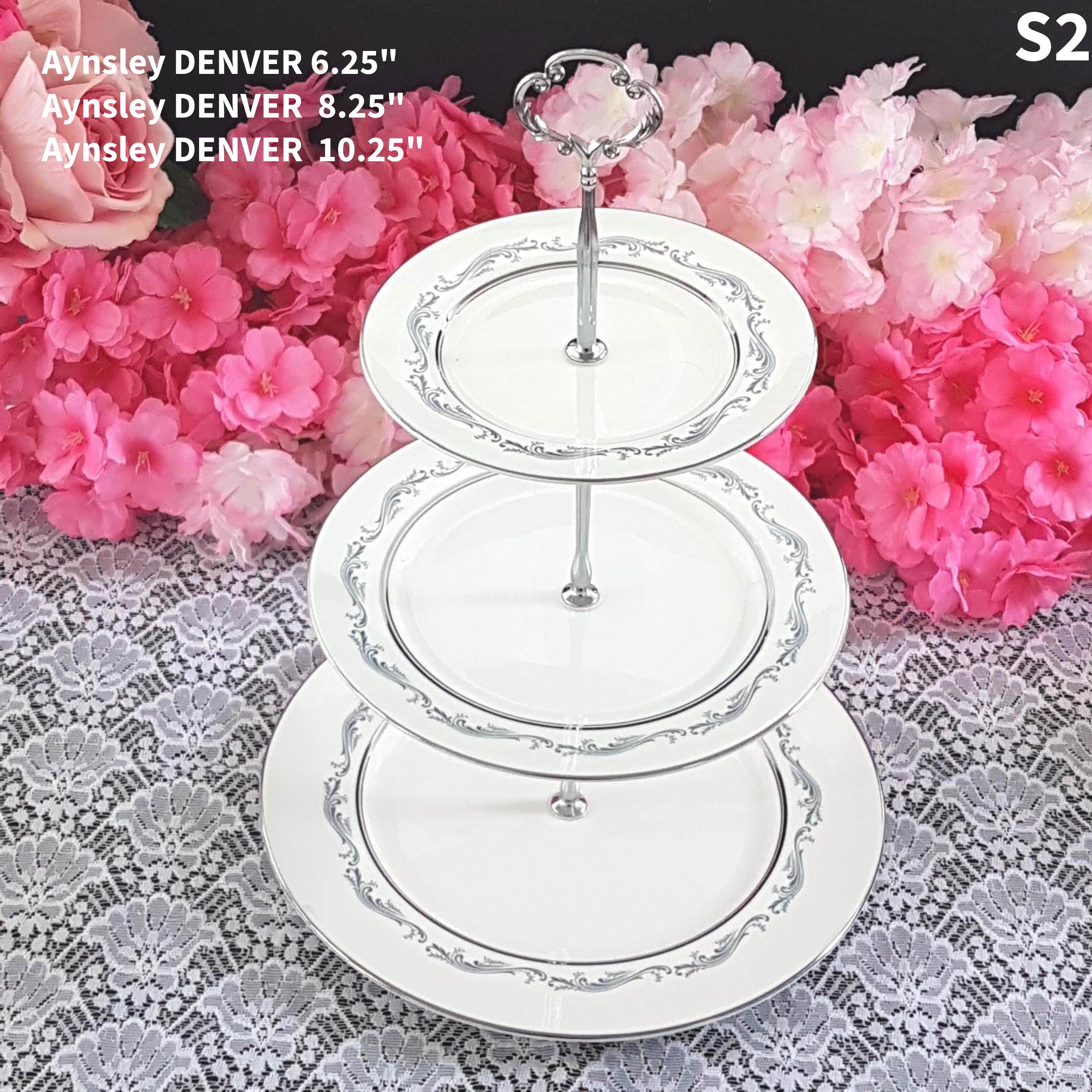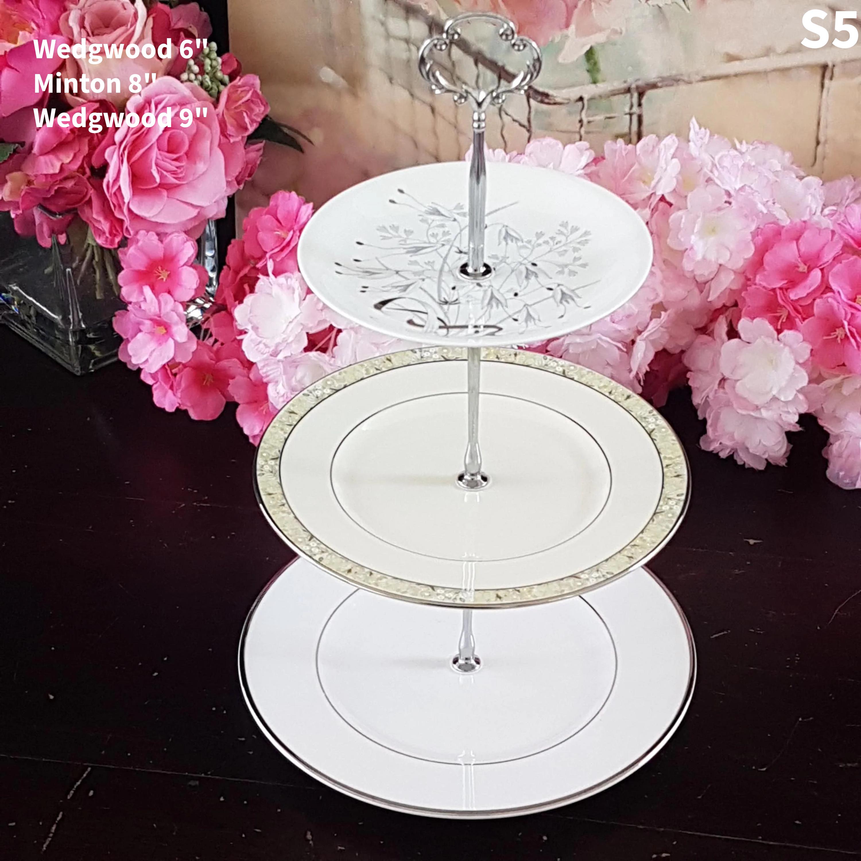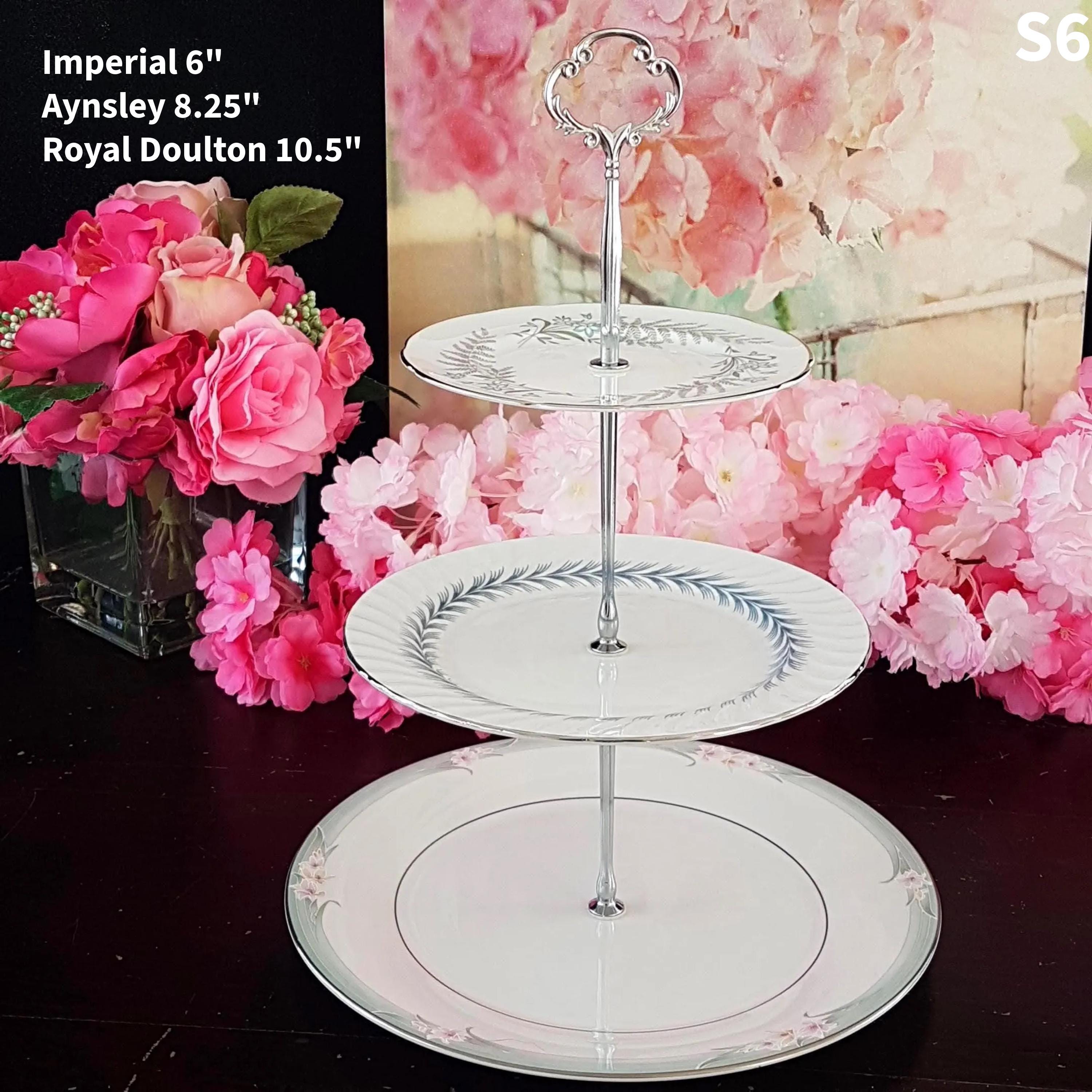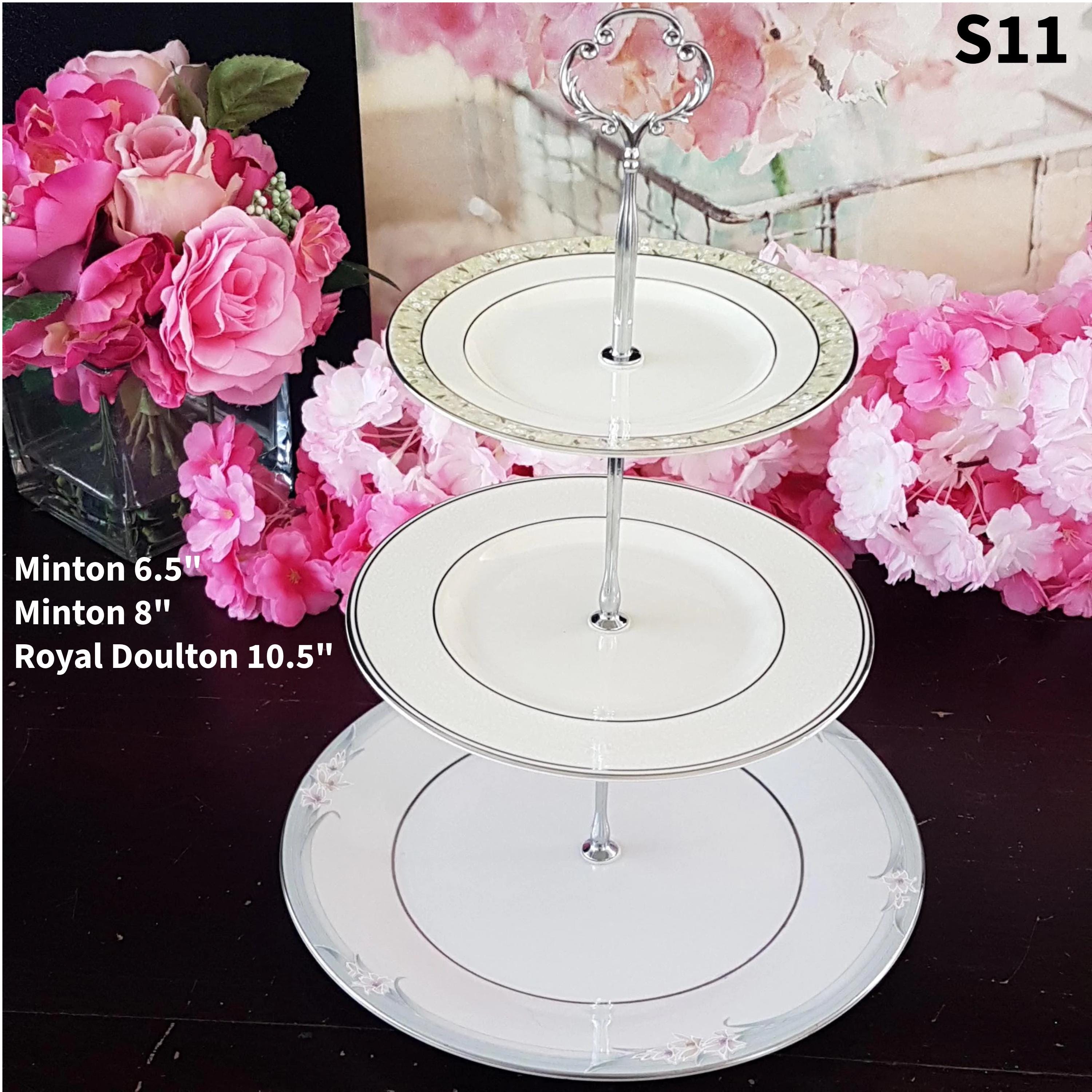 Three tier cake stands, made by me, using mismatched vintage English bone china plates with silver platinum edge.