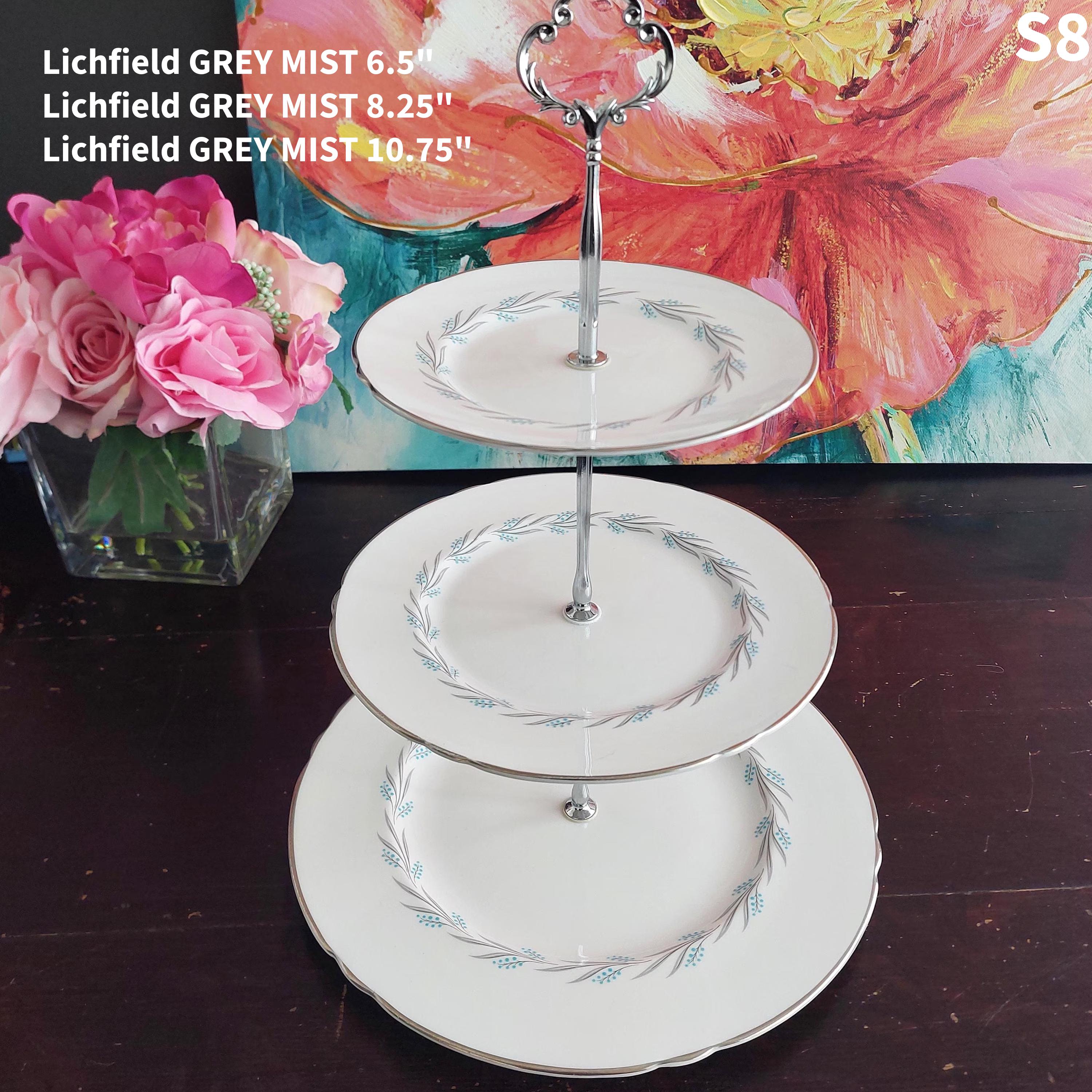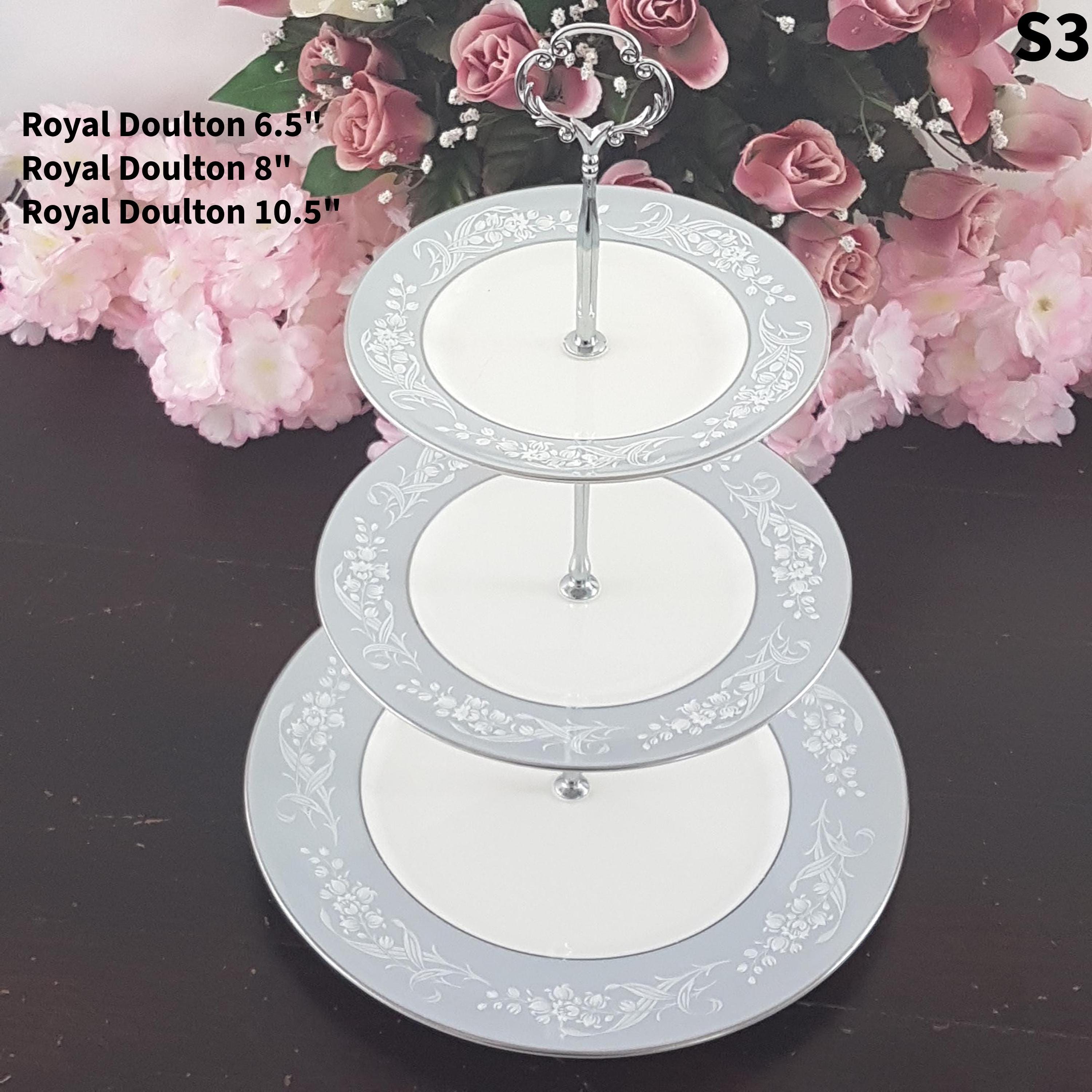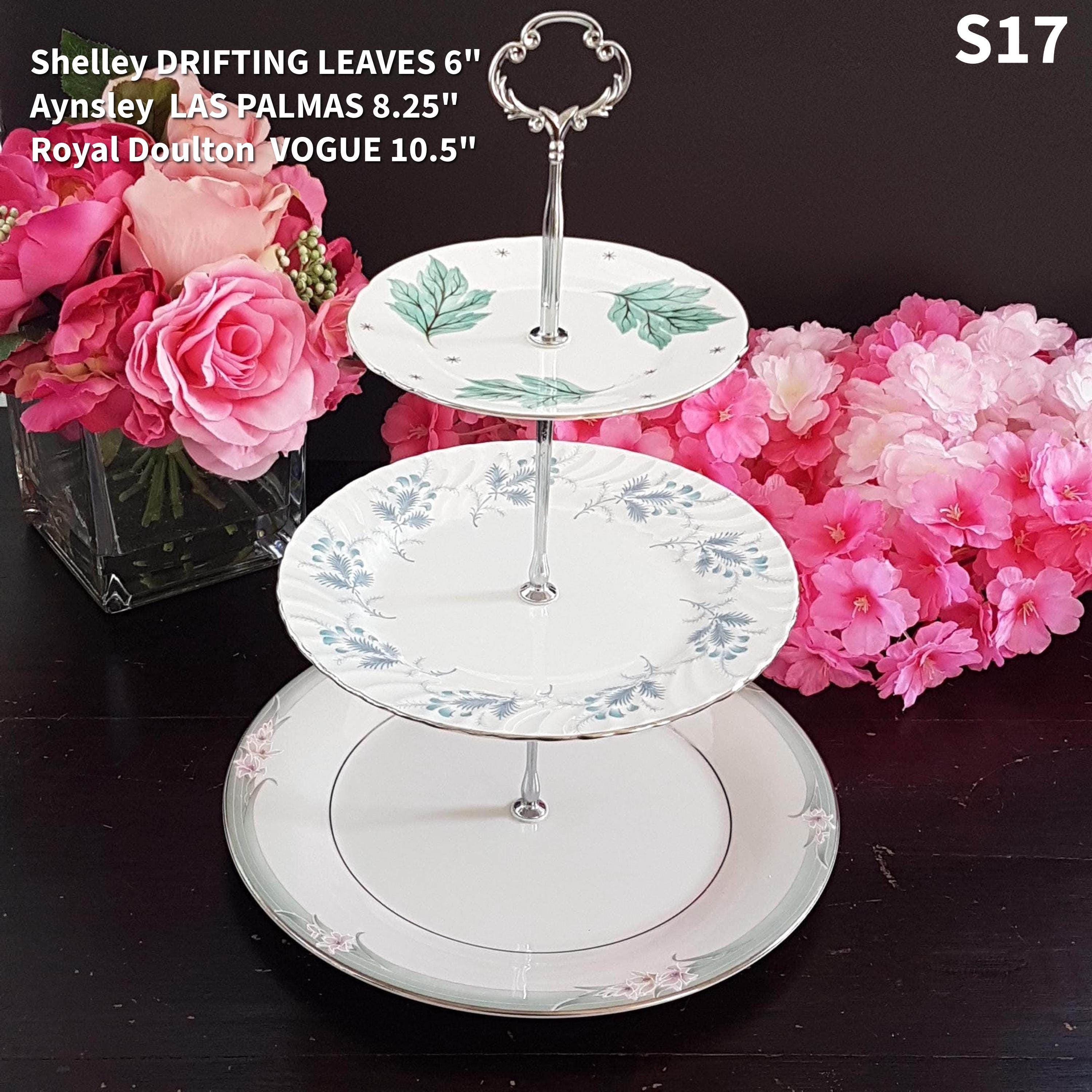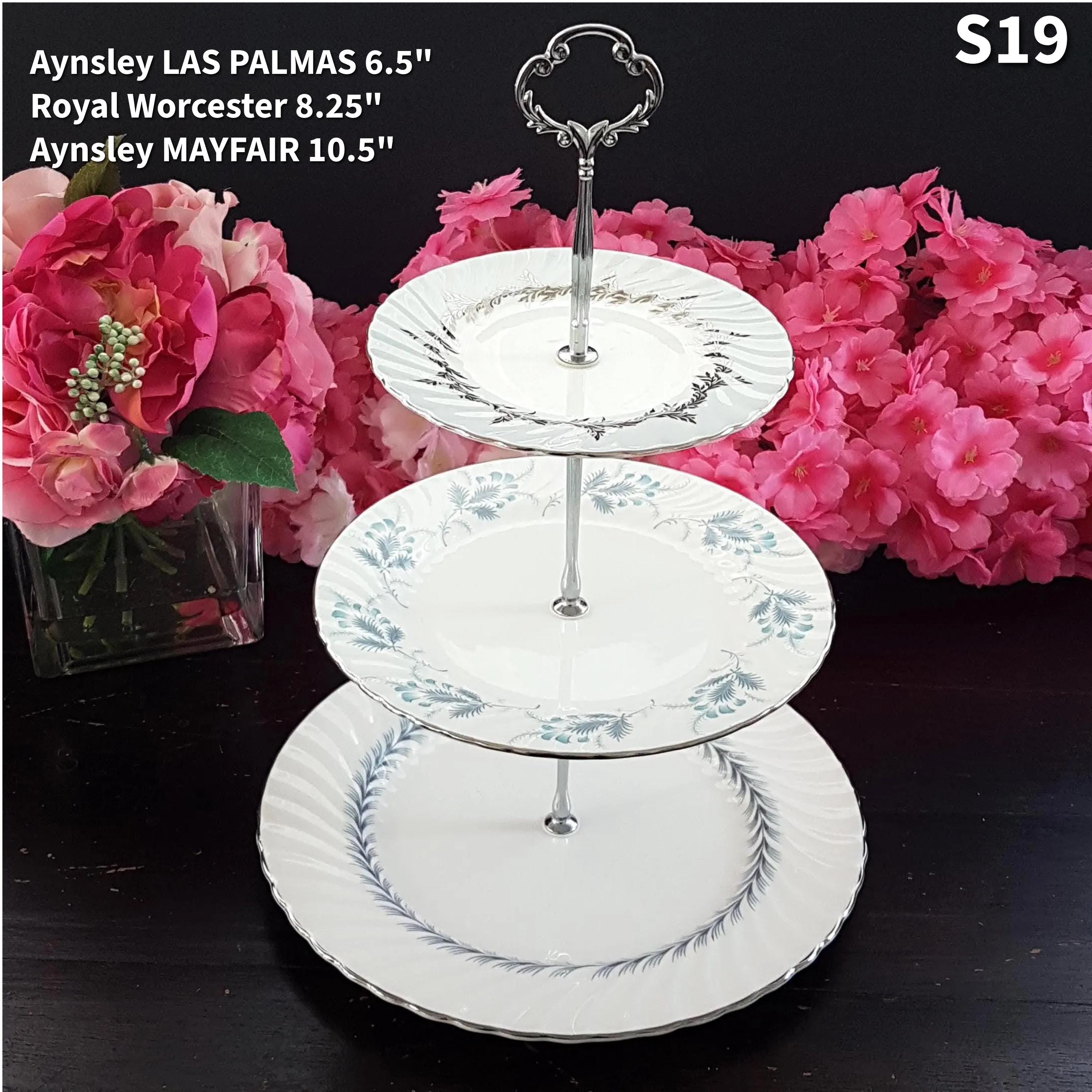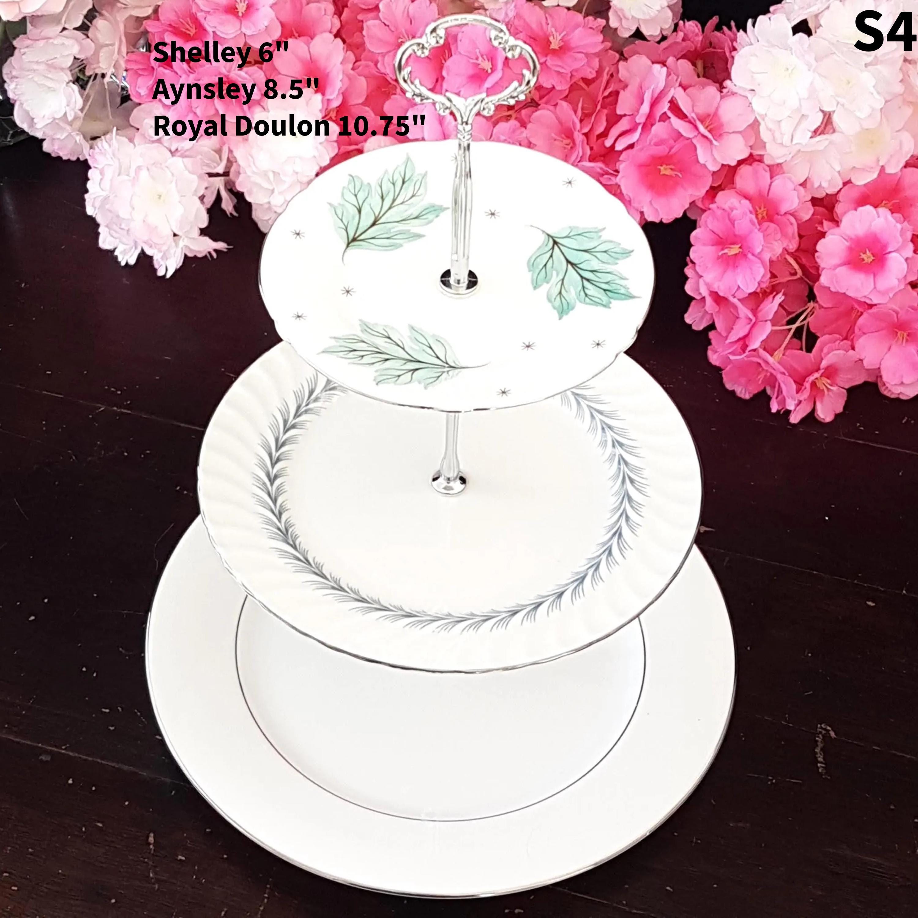 Three tier cake stands, made by me, using mismatched vintage English bone china plates with silver platinum edge.