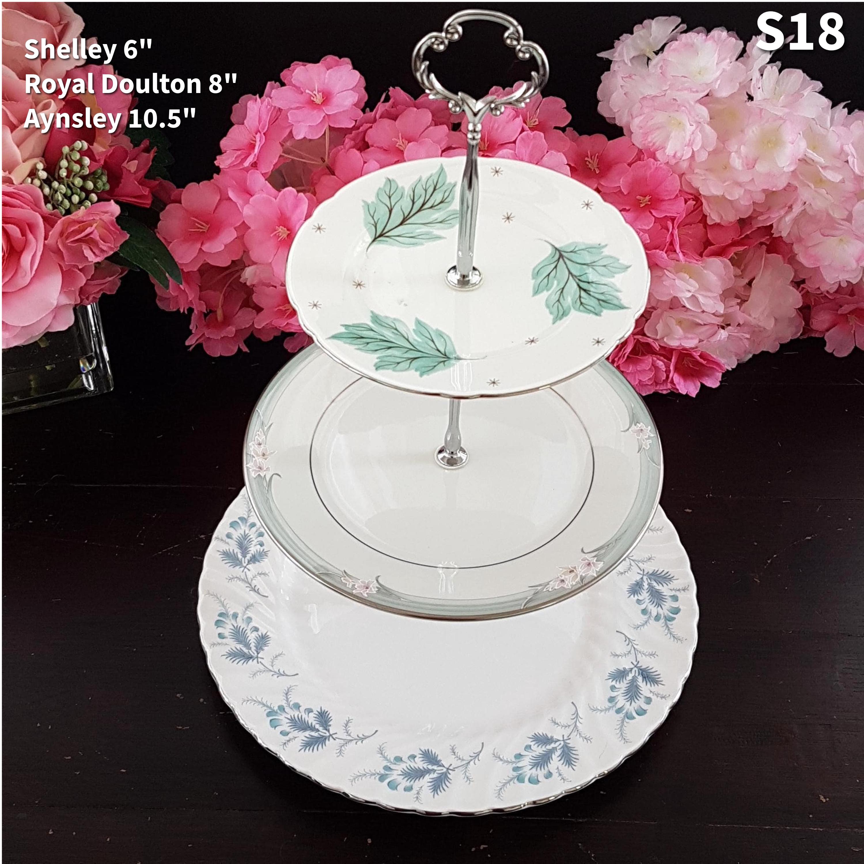 Plates are a mix of mismatched patterns and plate types, by renowned bone china makers, such as Royal Albert, Royal Doulton, Aynsley, Shelley, Minton, Foley, Paragon