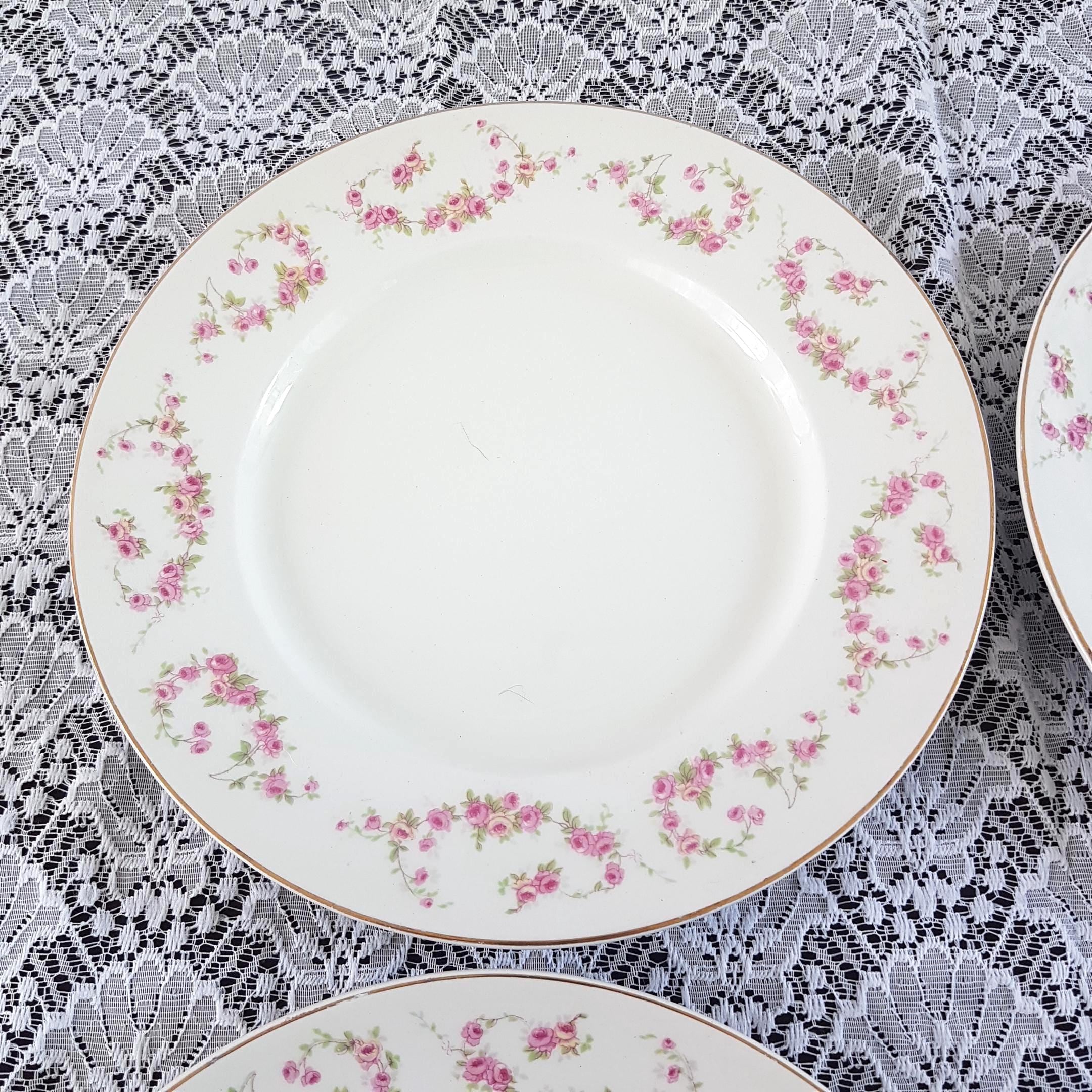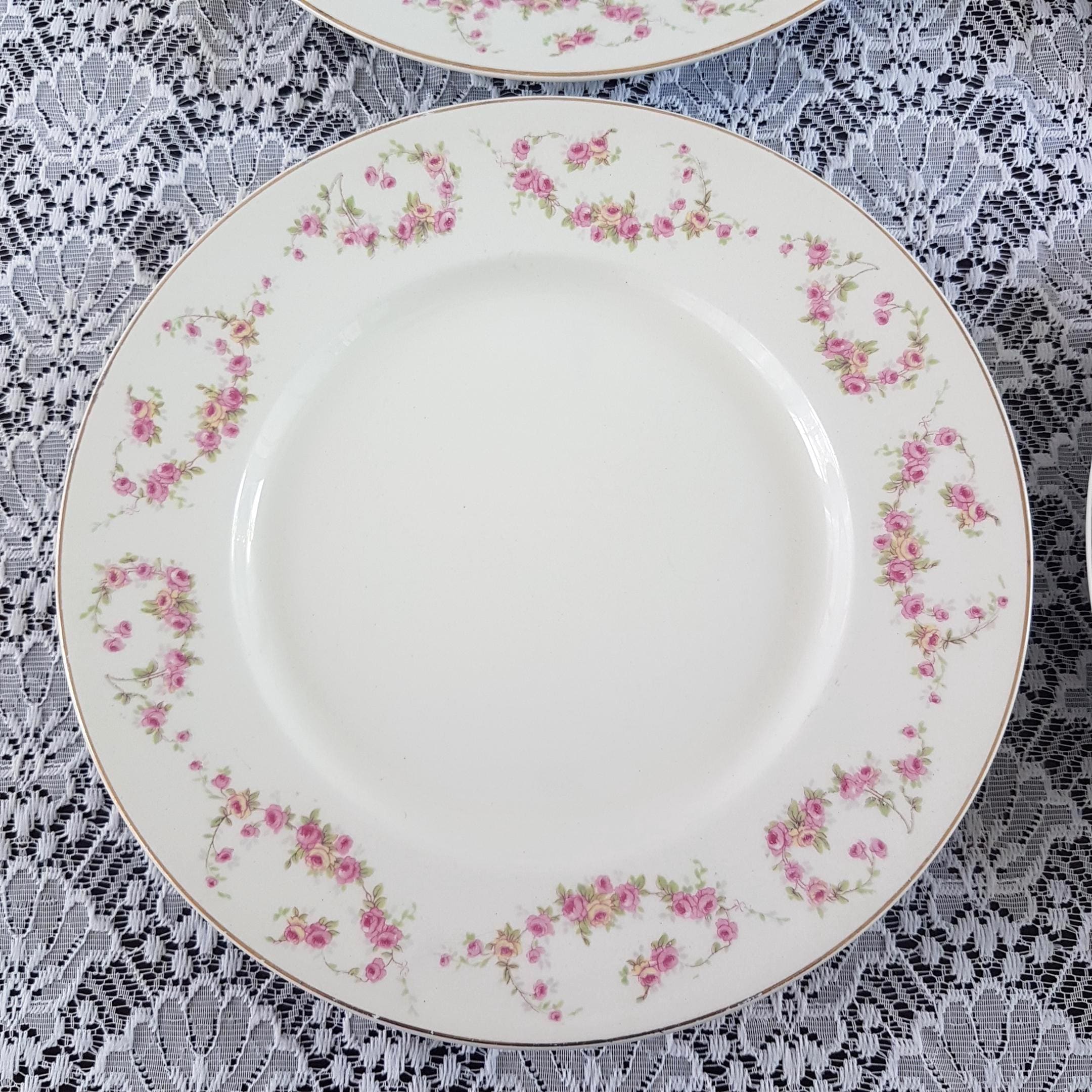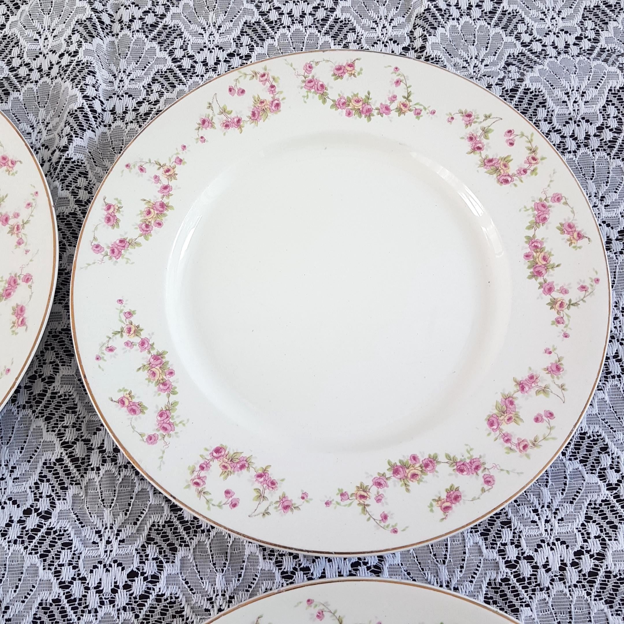 Antique ironstone dinner plates featuring pink and light yellow rose swags, very similar to Bridal Rose pattern. Gold edge. Made by Wood & Sons, England, circa 1910-1916