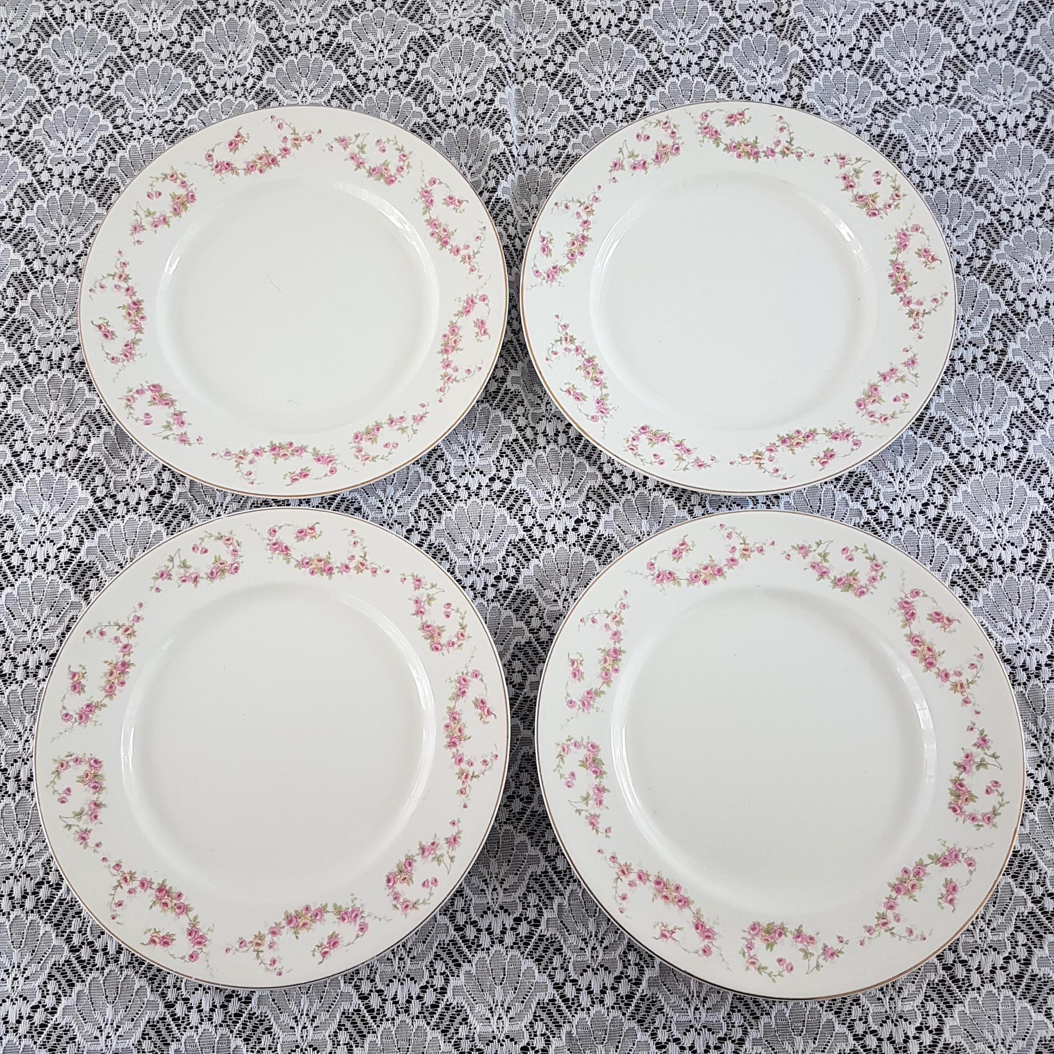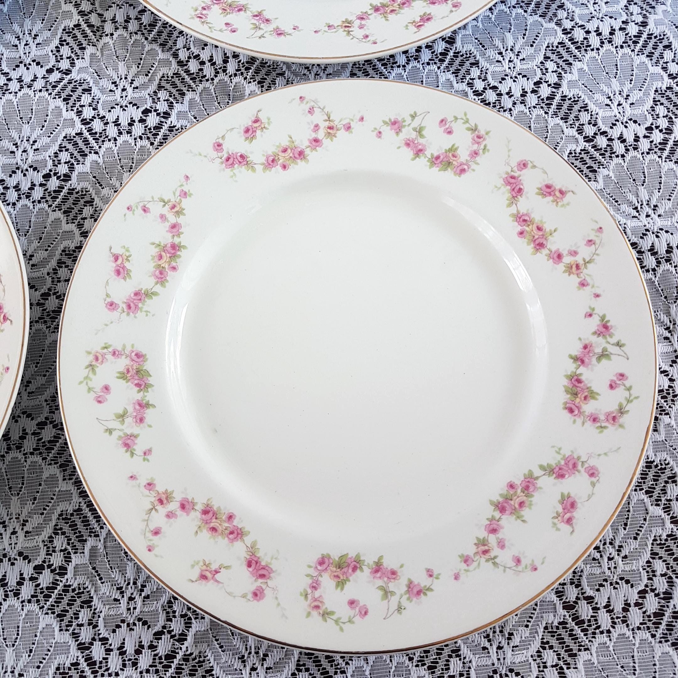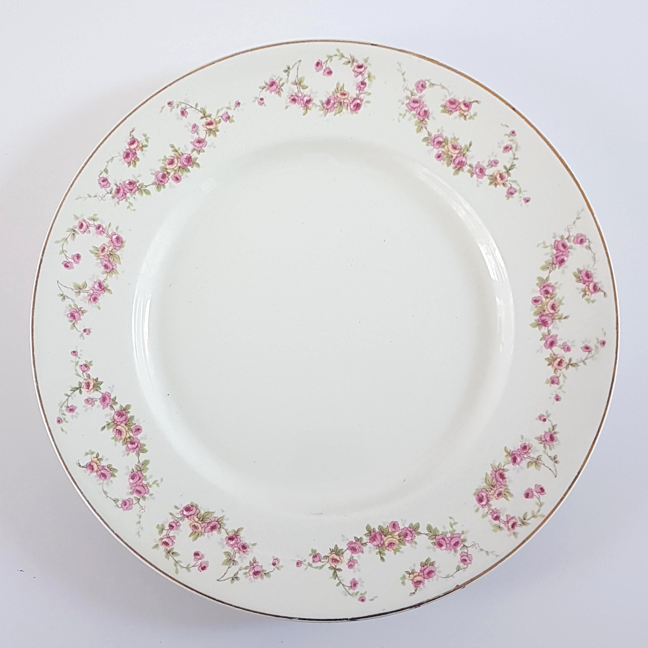 Antique ironstone dinner plates featuring pink and light yellow rose swags, very similar to Bridal Rose pattern. Gold edge. Made by Wood & Sons, England, circa 1910-1916
