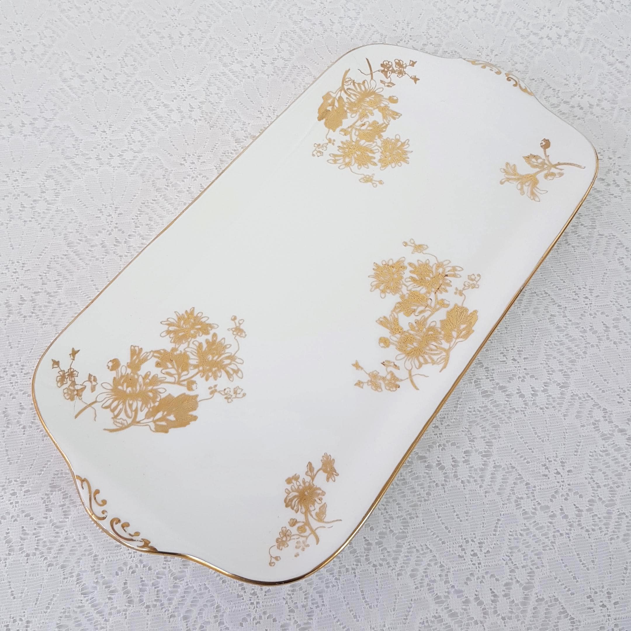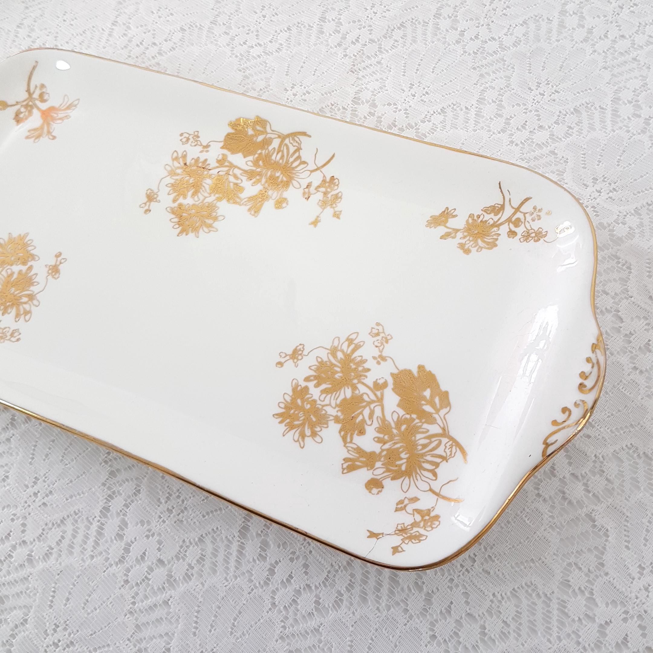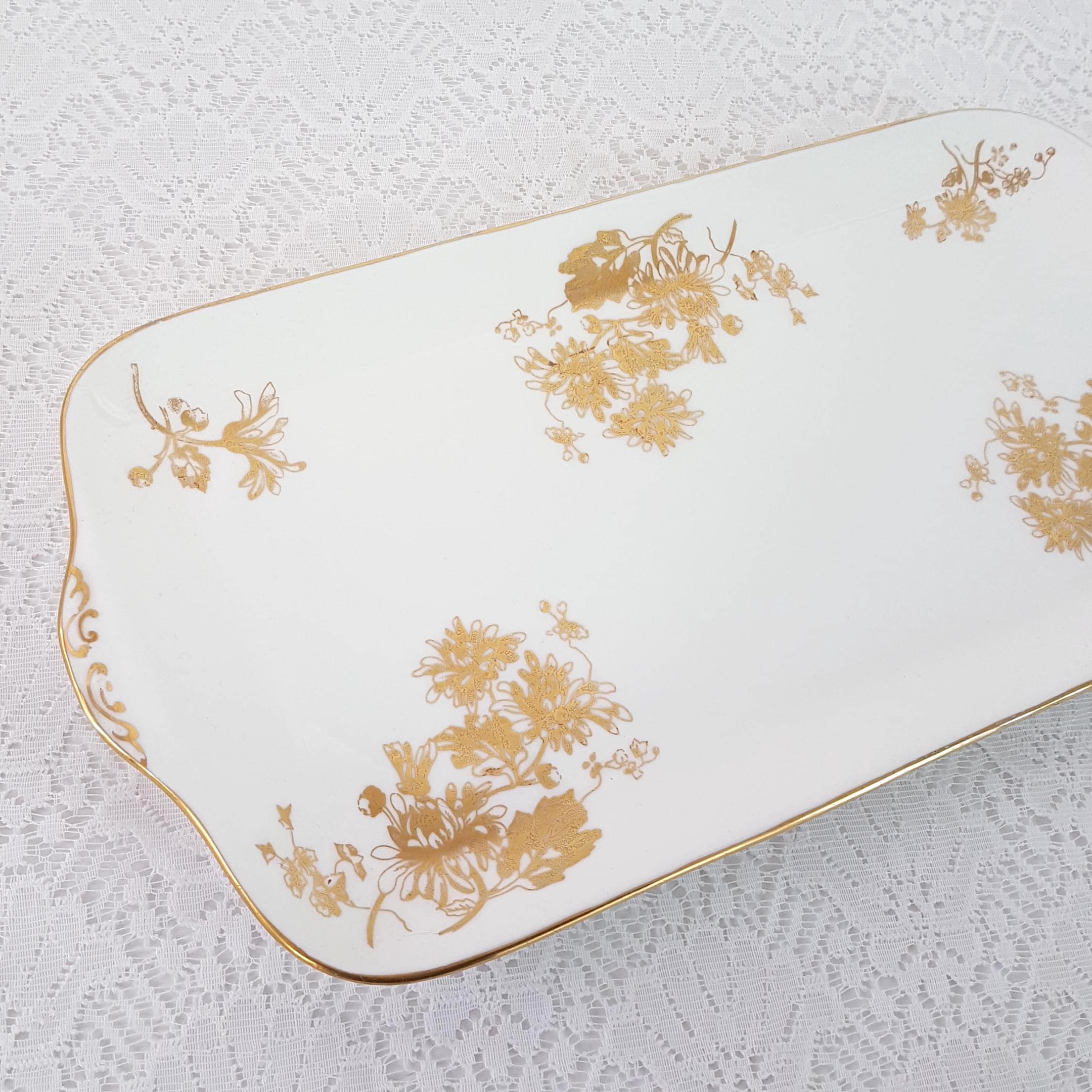 Vintage Hammersley bone china rectangular sandwich serving tray. Gold Chrysanthemum pattern features gold gilt flowers on crisp white English bone china. Gold accents on the handles and gold edge. Made in England, circa 1912-39