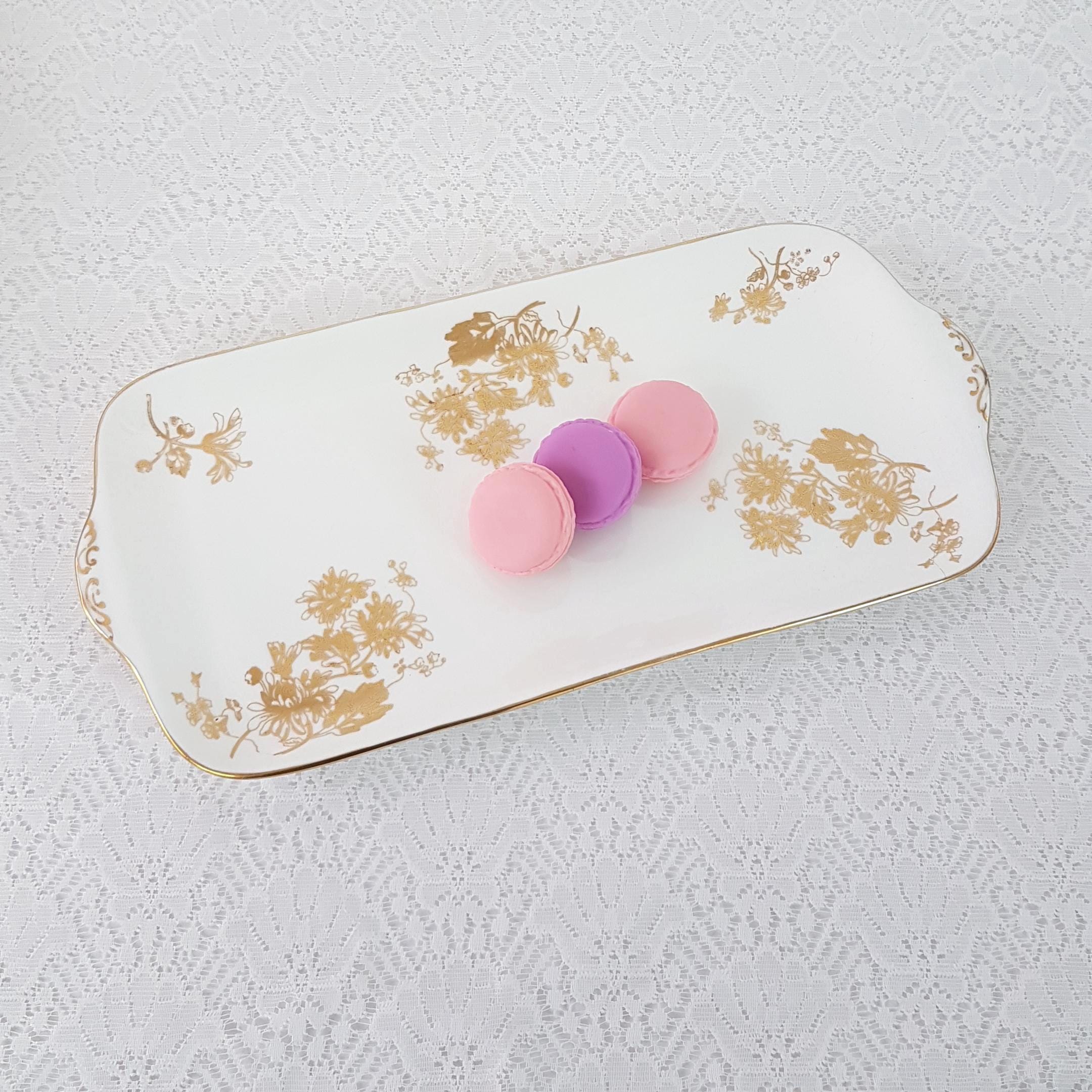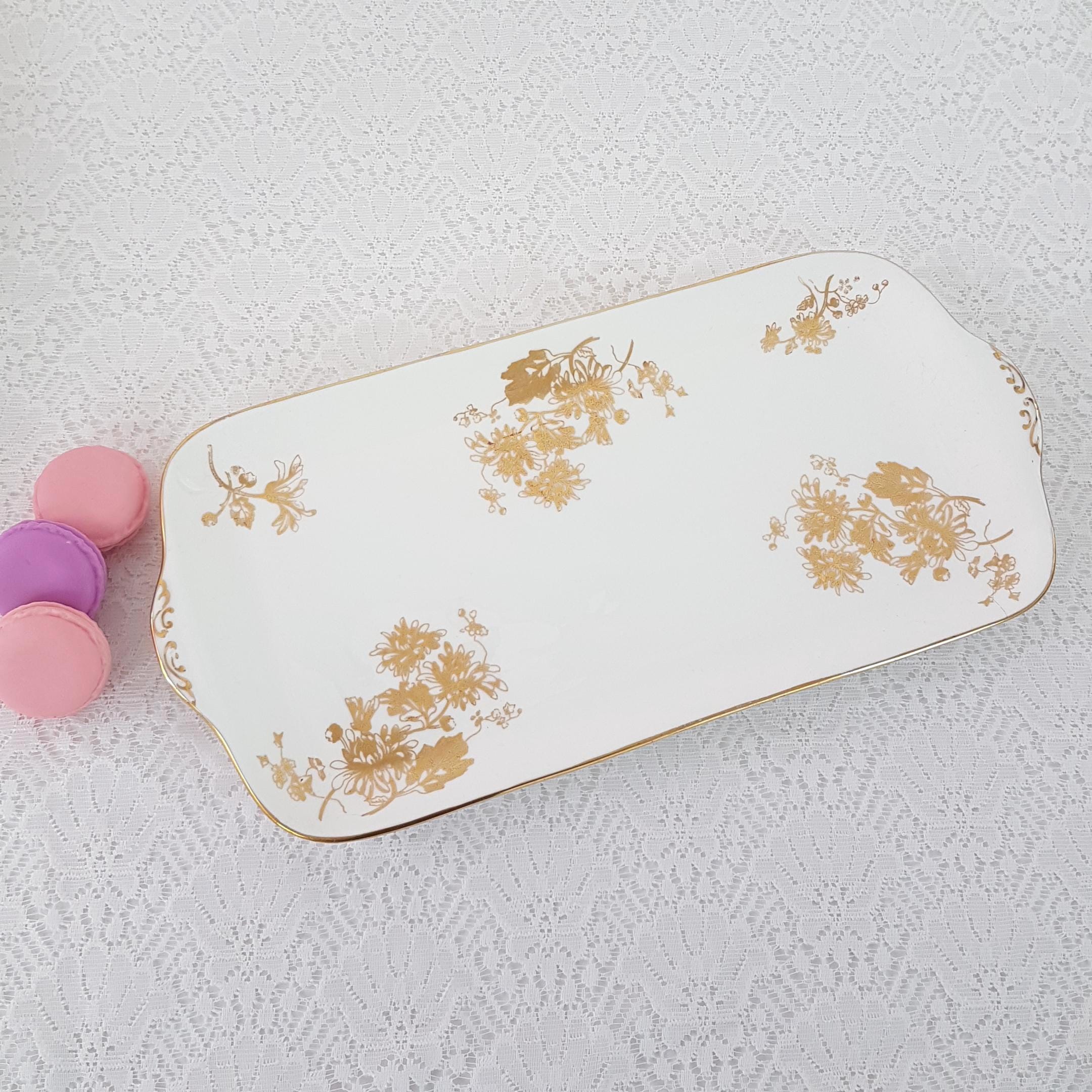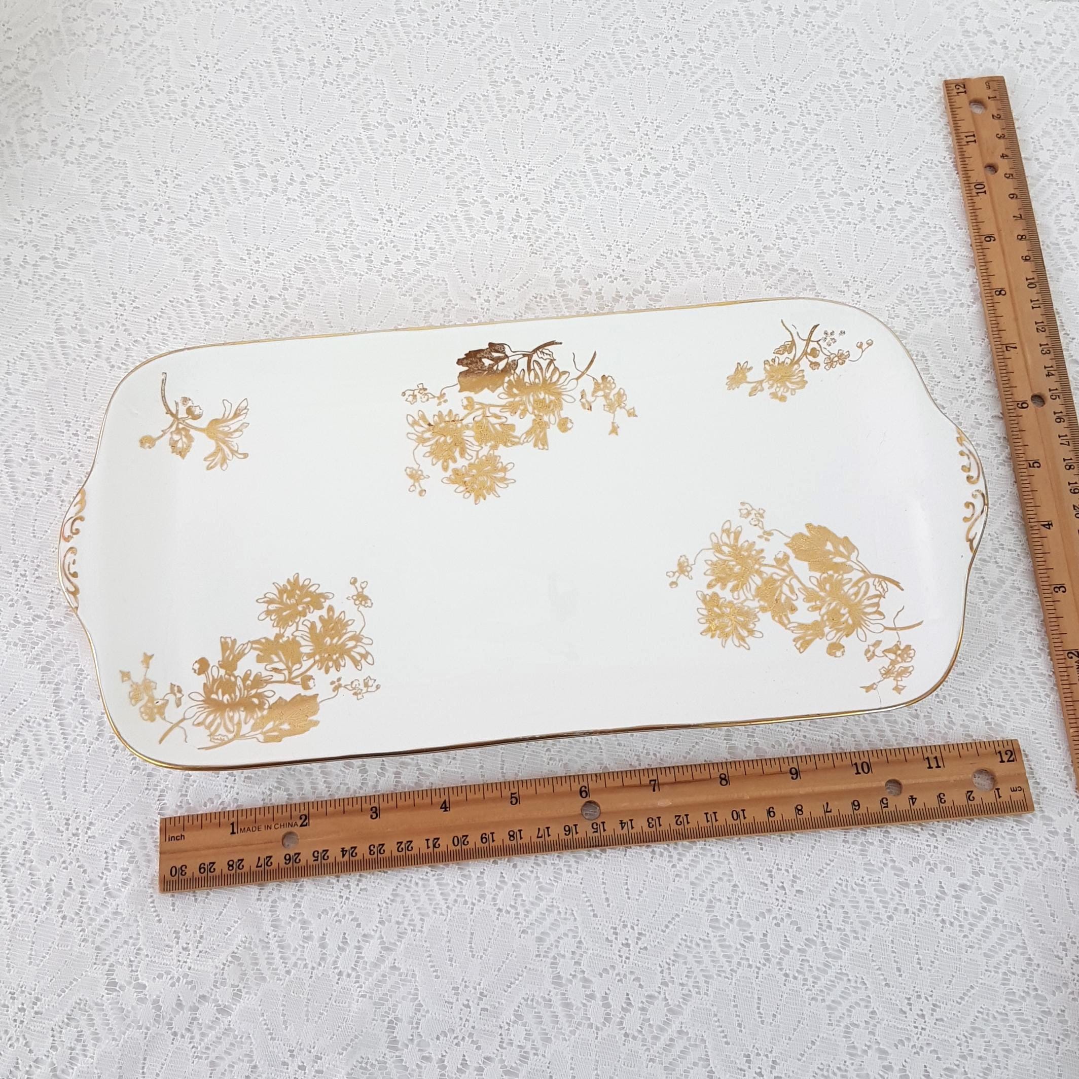 Vintage Hammersley bone china rectangular sandwich serving tray. Gold Chrysanthemum pattern features gold gilt flowers on crisp white English bone china. Gold accents on the handles and gold edge. Made in England, circa 1912-39