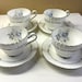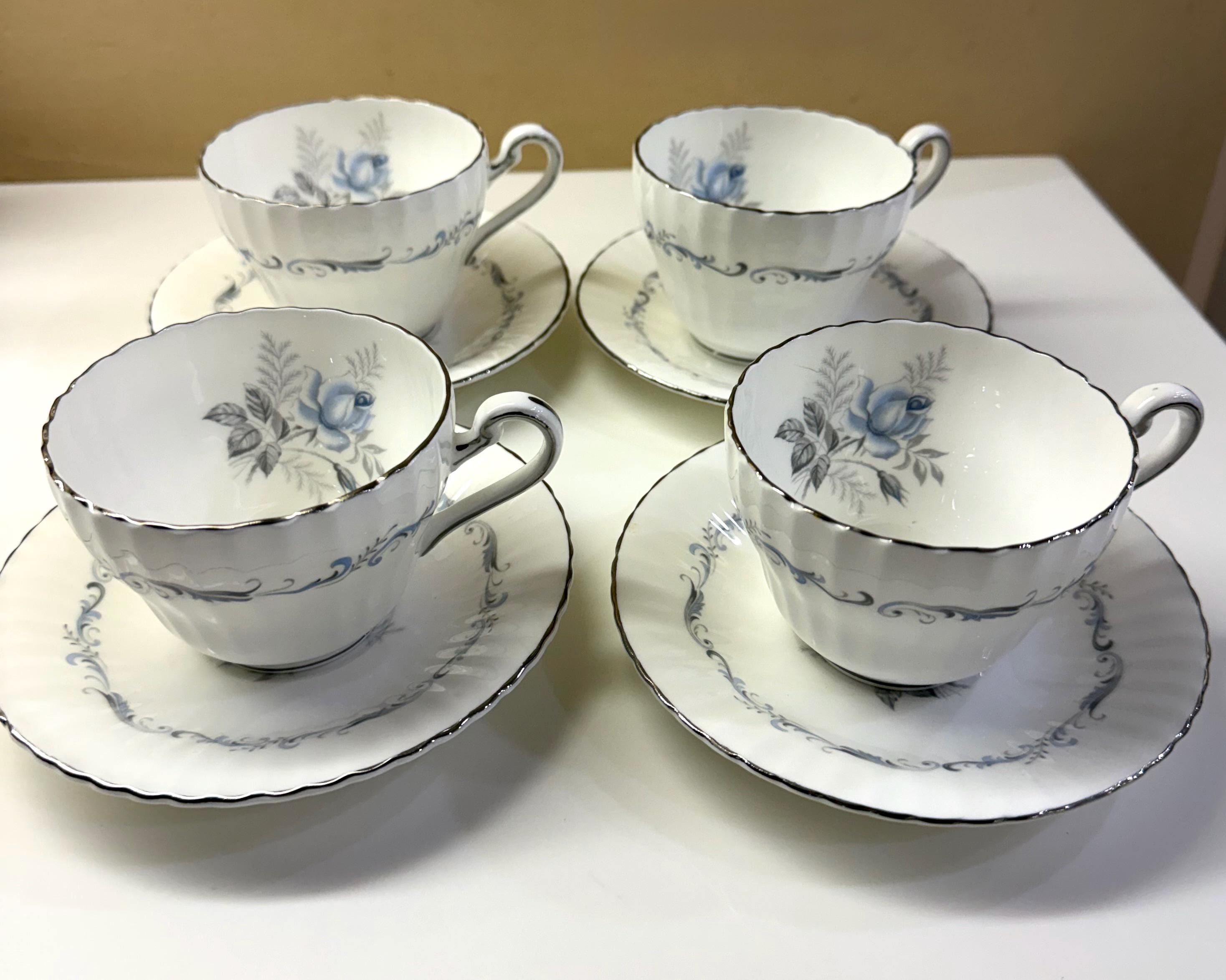 Vintage Paragon bone china tea cups & saucers for 4. Fine English bone china featuring light blue roses & scrolls with gray leaves on crisp white with silver/platinum trim. Made in England, circa 1960s