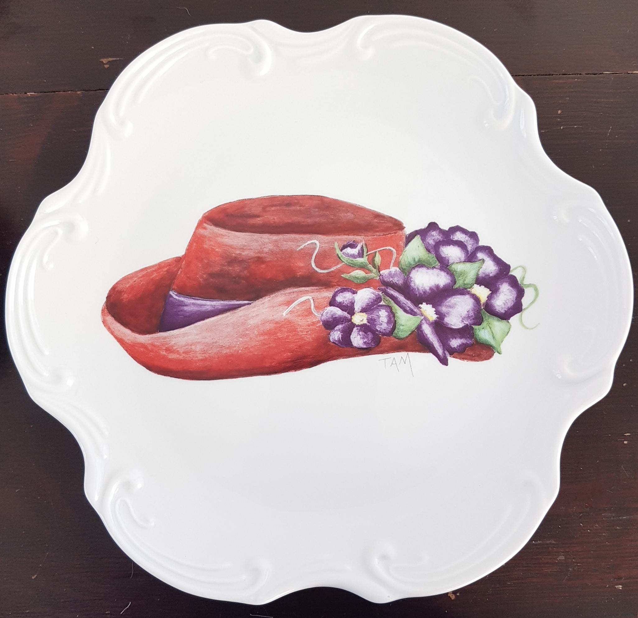 Vintage salad plates featuring a red hat with purple band and purple flowers on crisp white porcelain. Raised scrolls on scalloped edge.