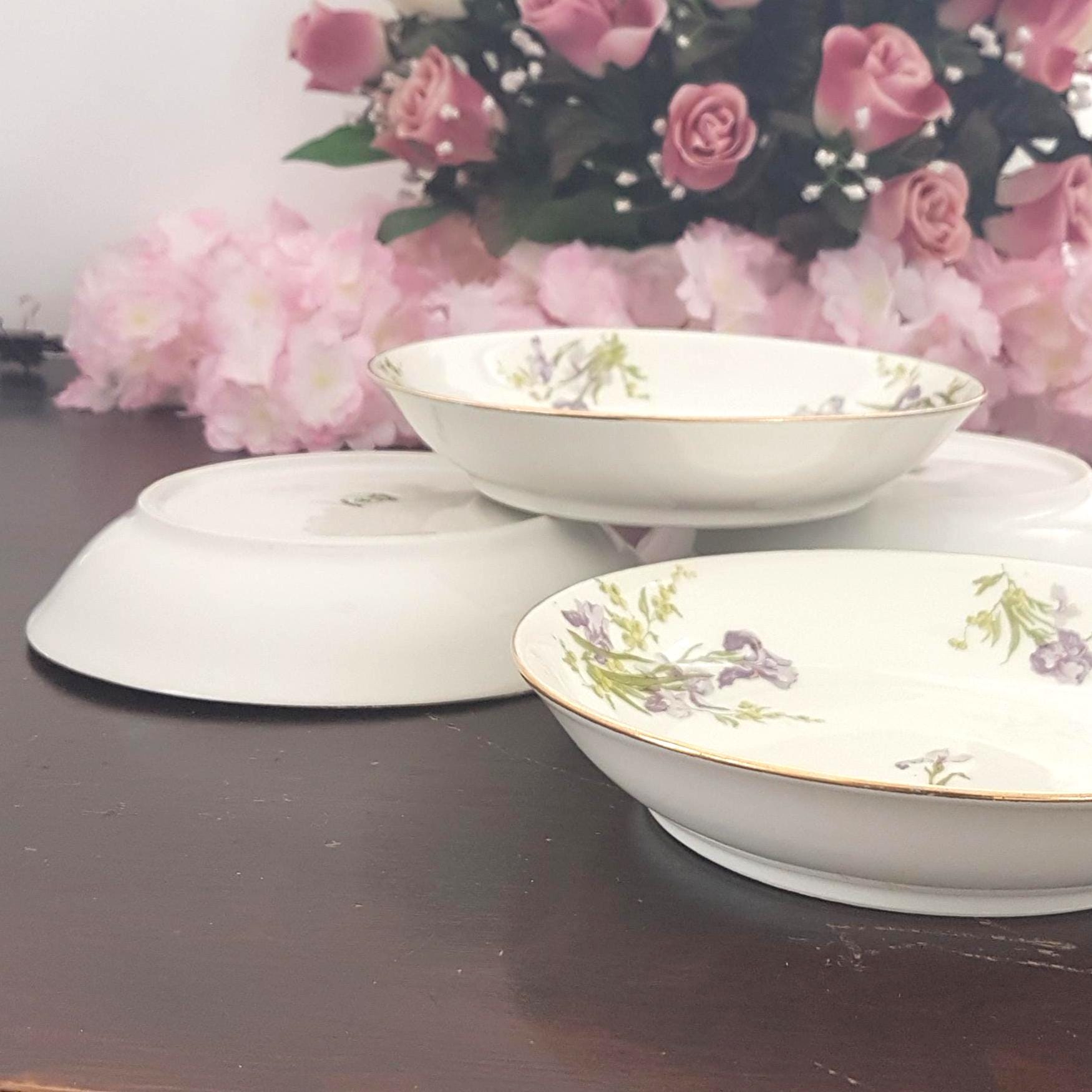 Vintage Limoges pasta or salad bowls with mauve purple iris flowers on white porcelain. Bowls are shallow with gold edge. Made in France. circa 1920s