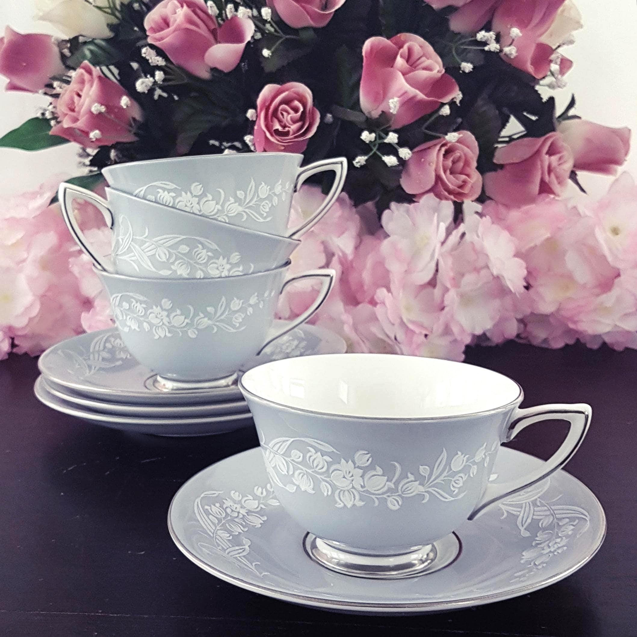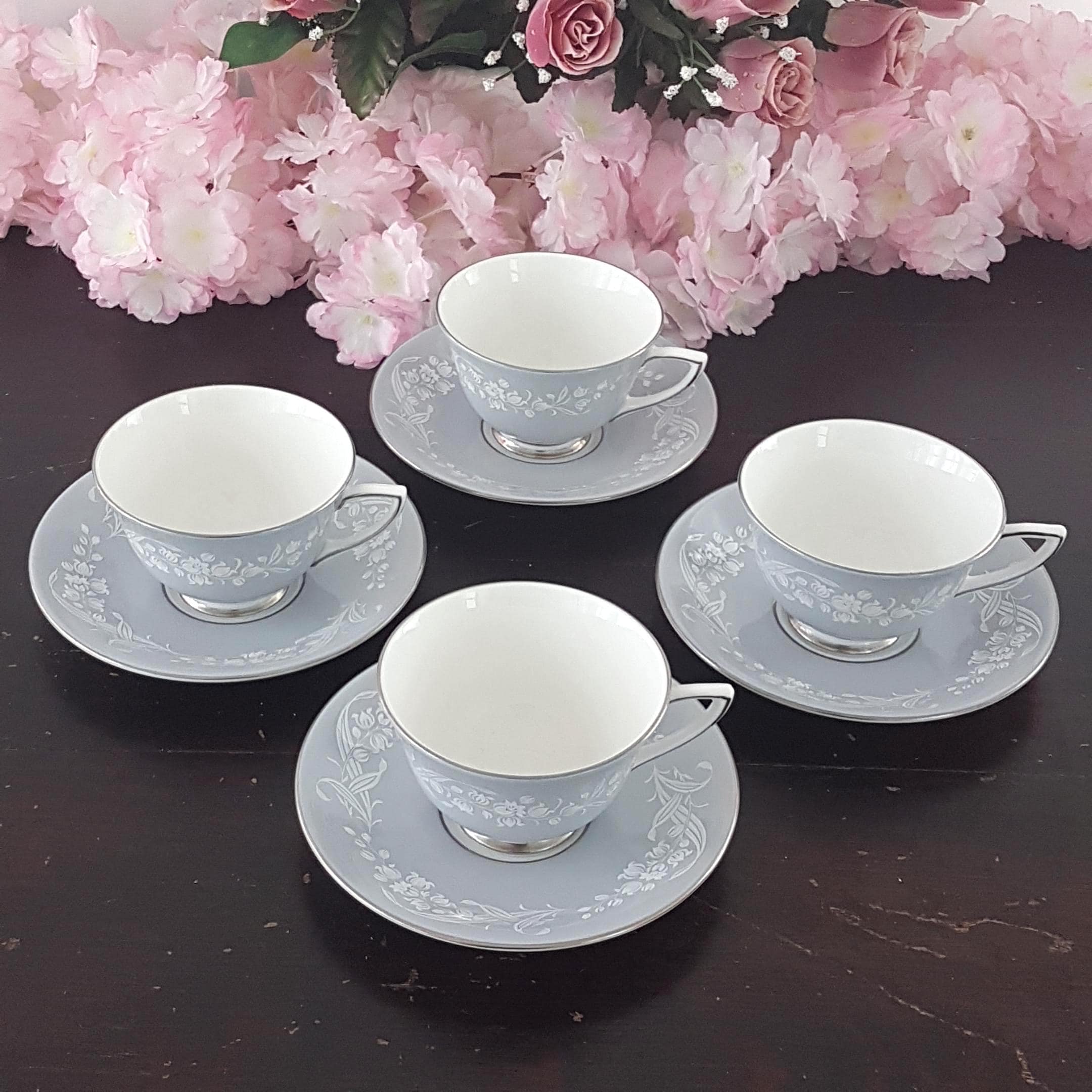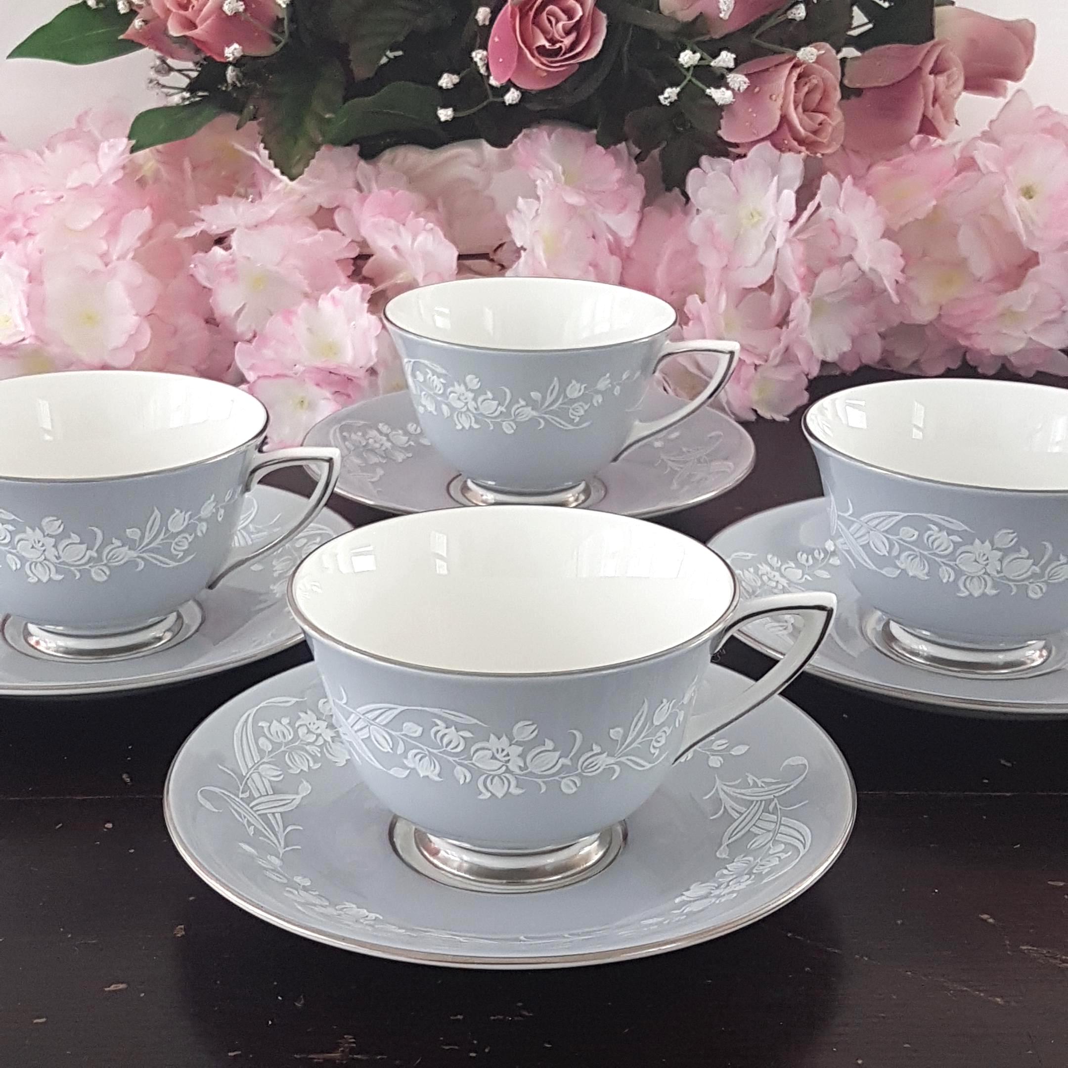 8 pc vintage Royal Doulton Valleyfield bone china tea cup set for 4. Pattern features gray with mauve undertone band, white flowers and silver / platinum trim. Made in England, 1953 - 1969