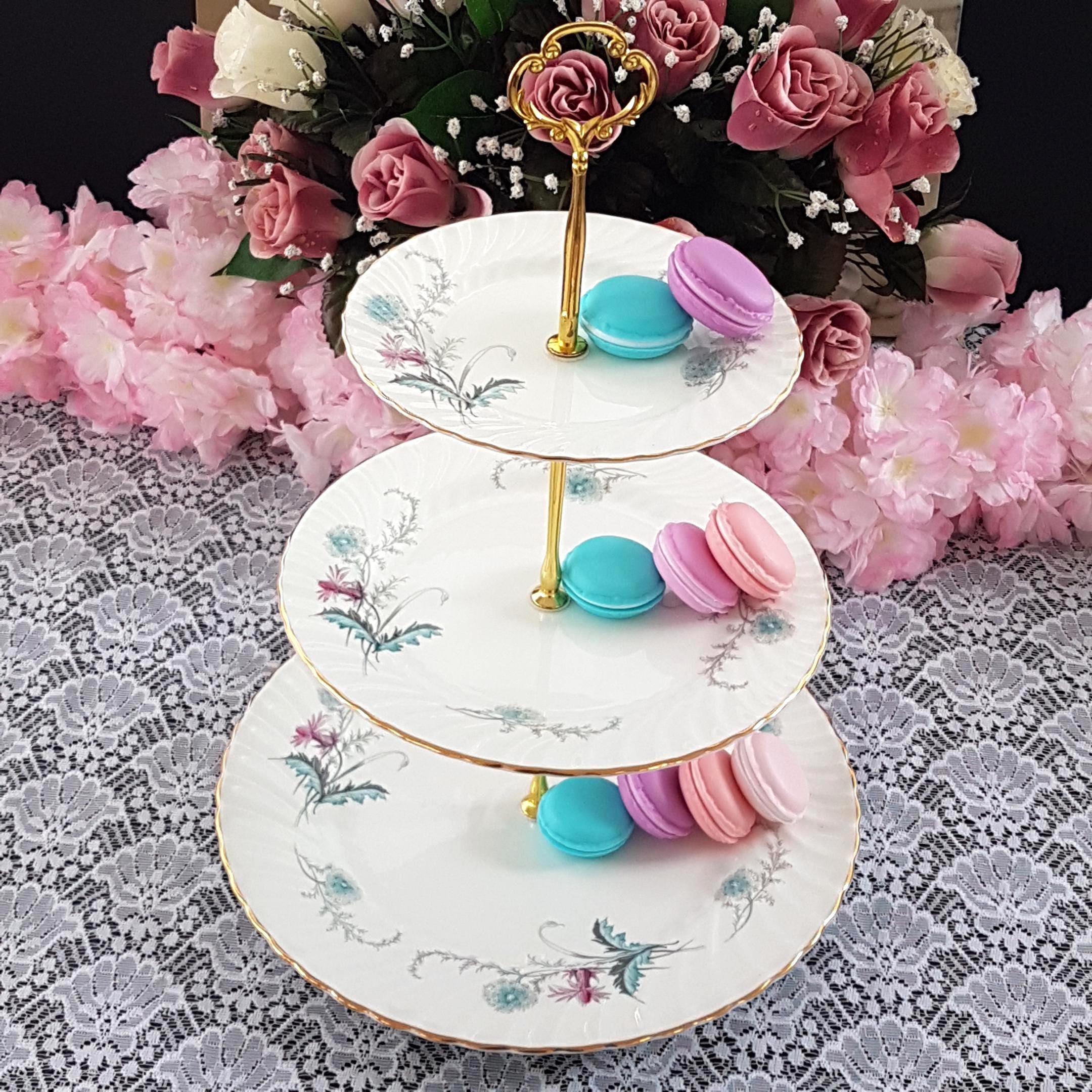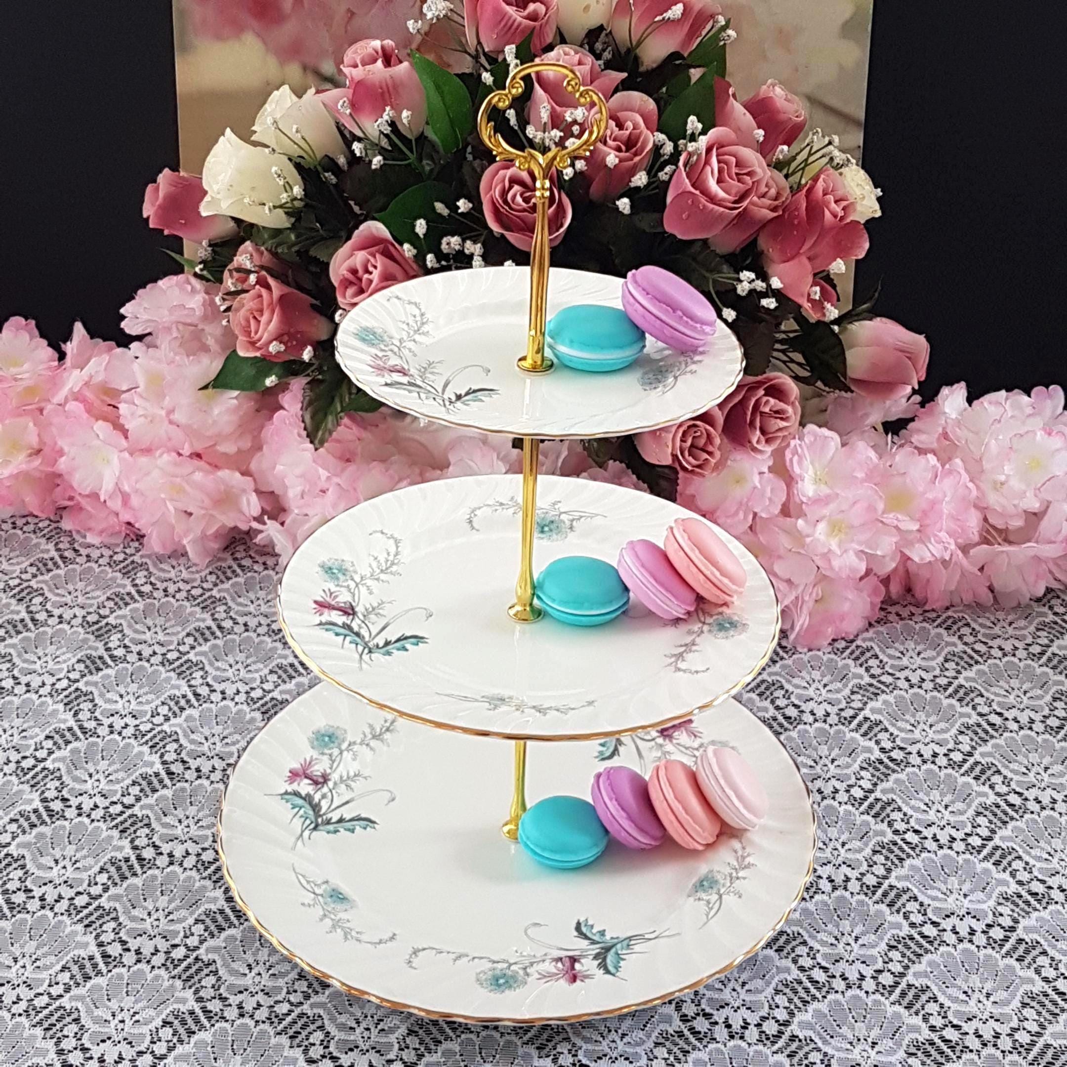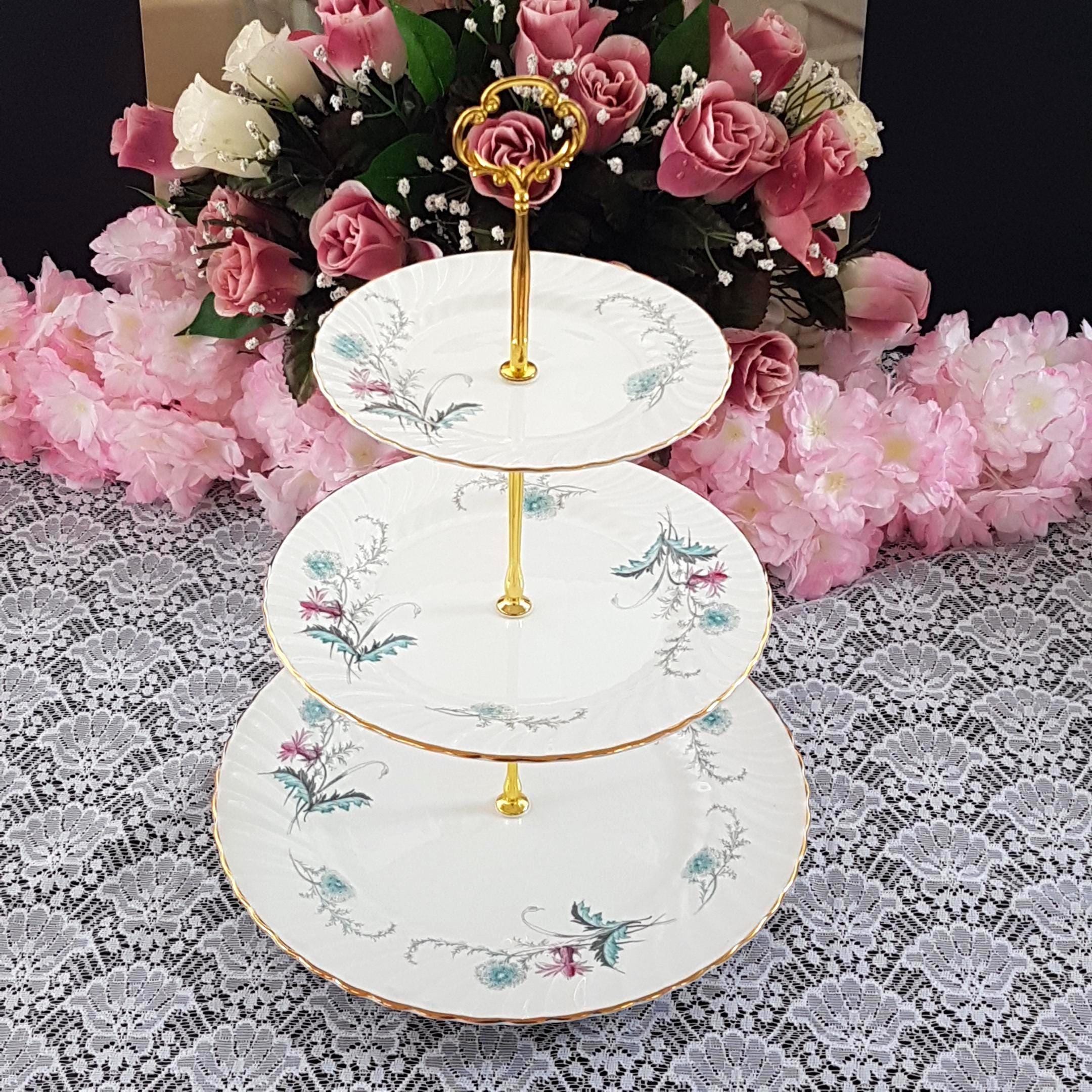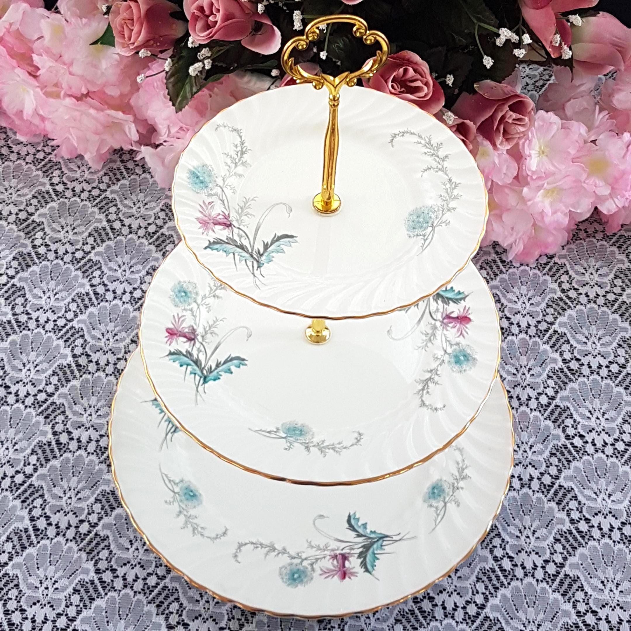 Bring timeless English charm to your table with this elegant, three-tier cake stand, handcrafted by me using genuine vintage Aynsley (England) âWaysideâ bone china plates. Perfect for afternoon tea, weddings, birthdays, or as a unique gift, each stand features a delicate floral design in fresh pink and turquoise blue, set on crisp white, swirled bone china.