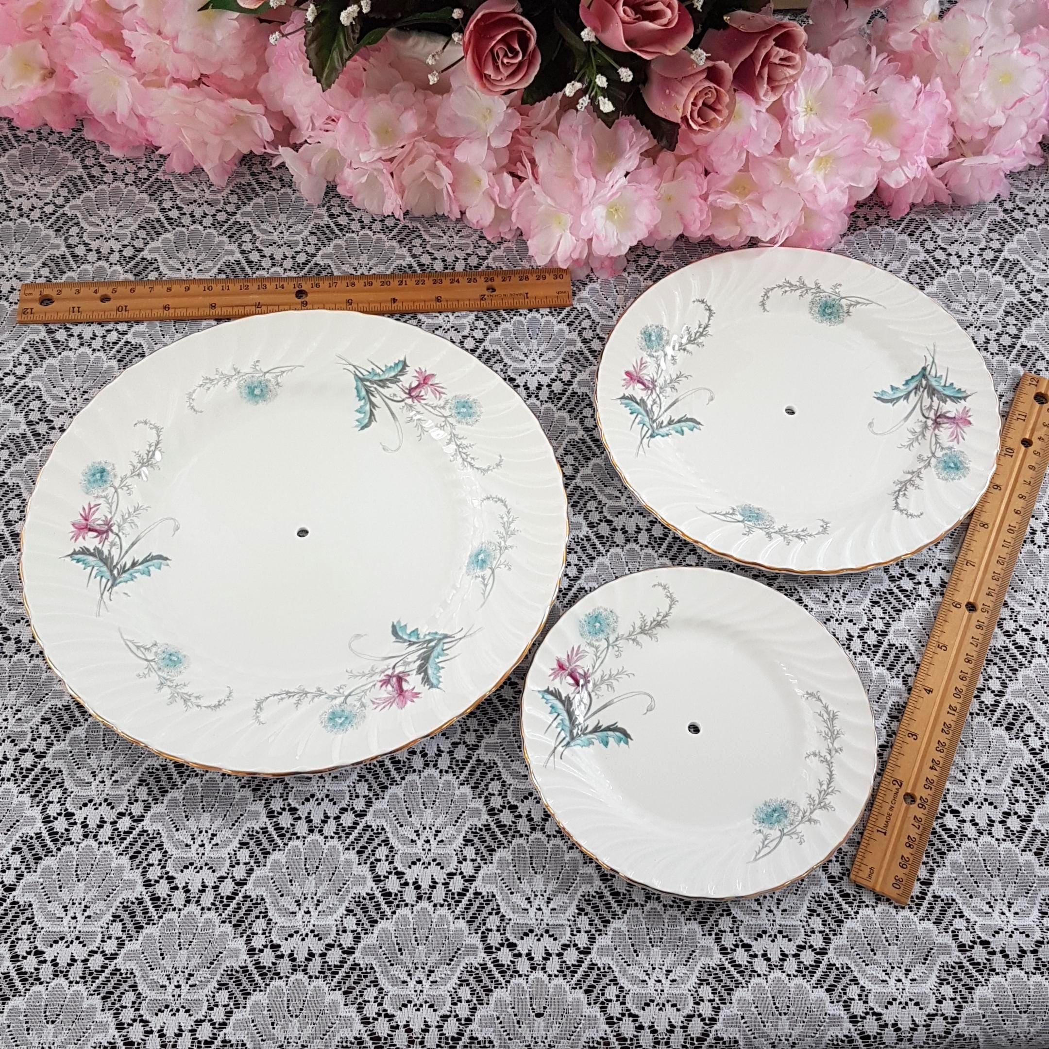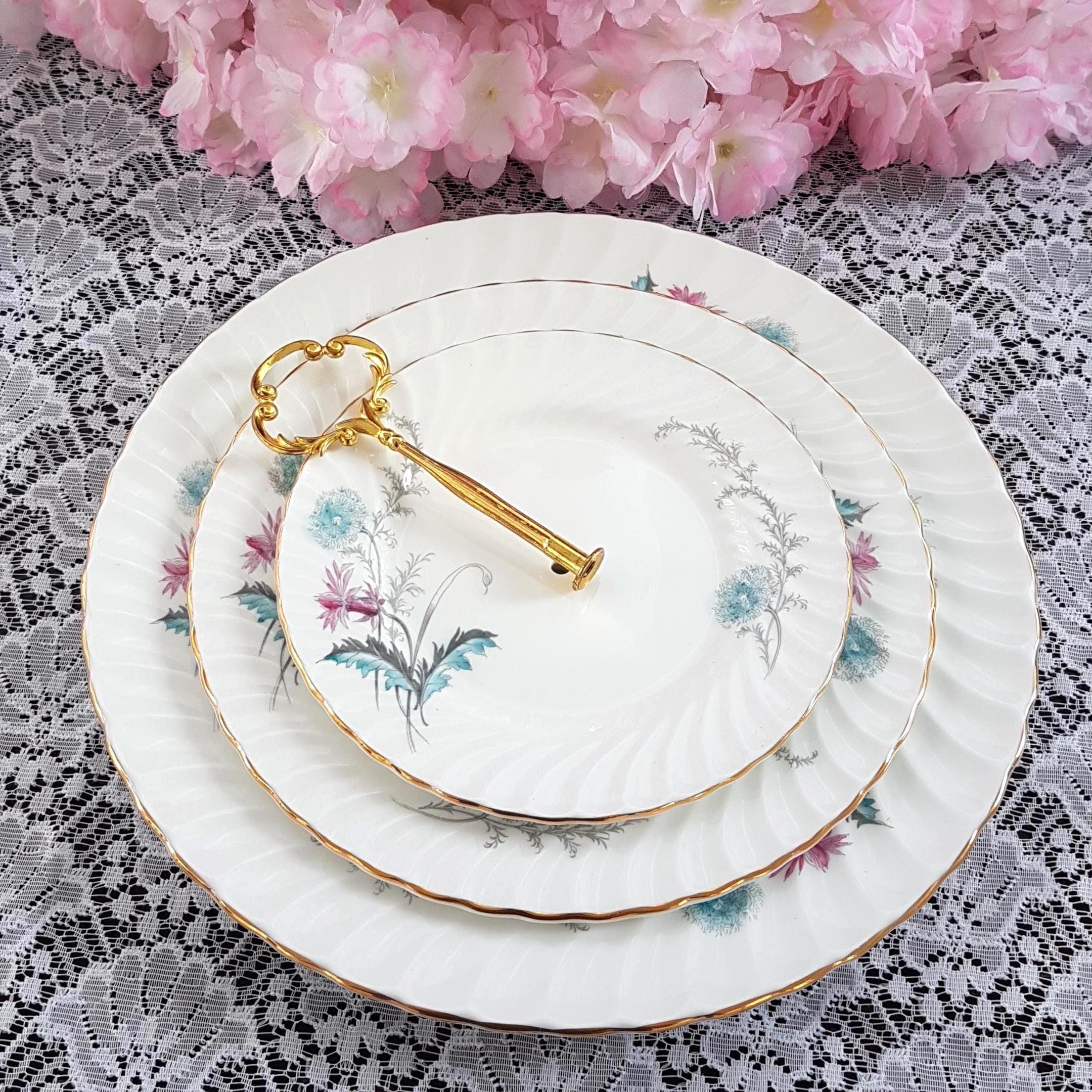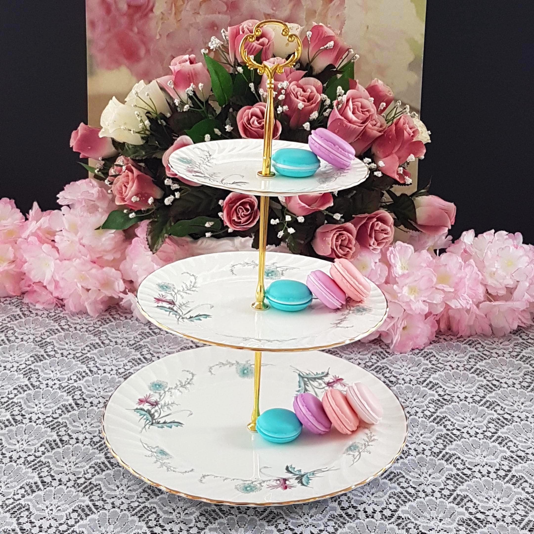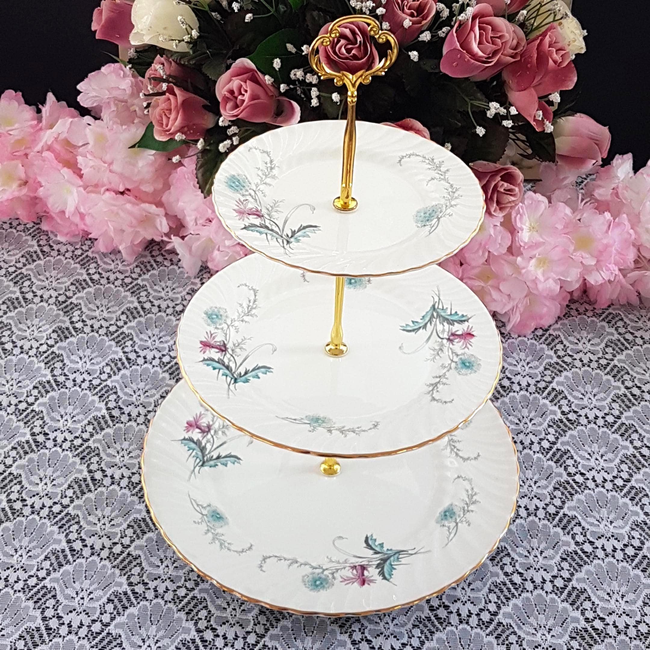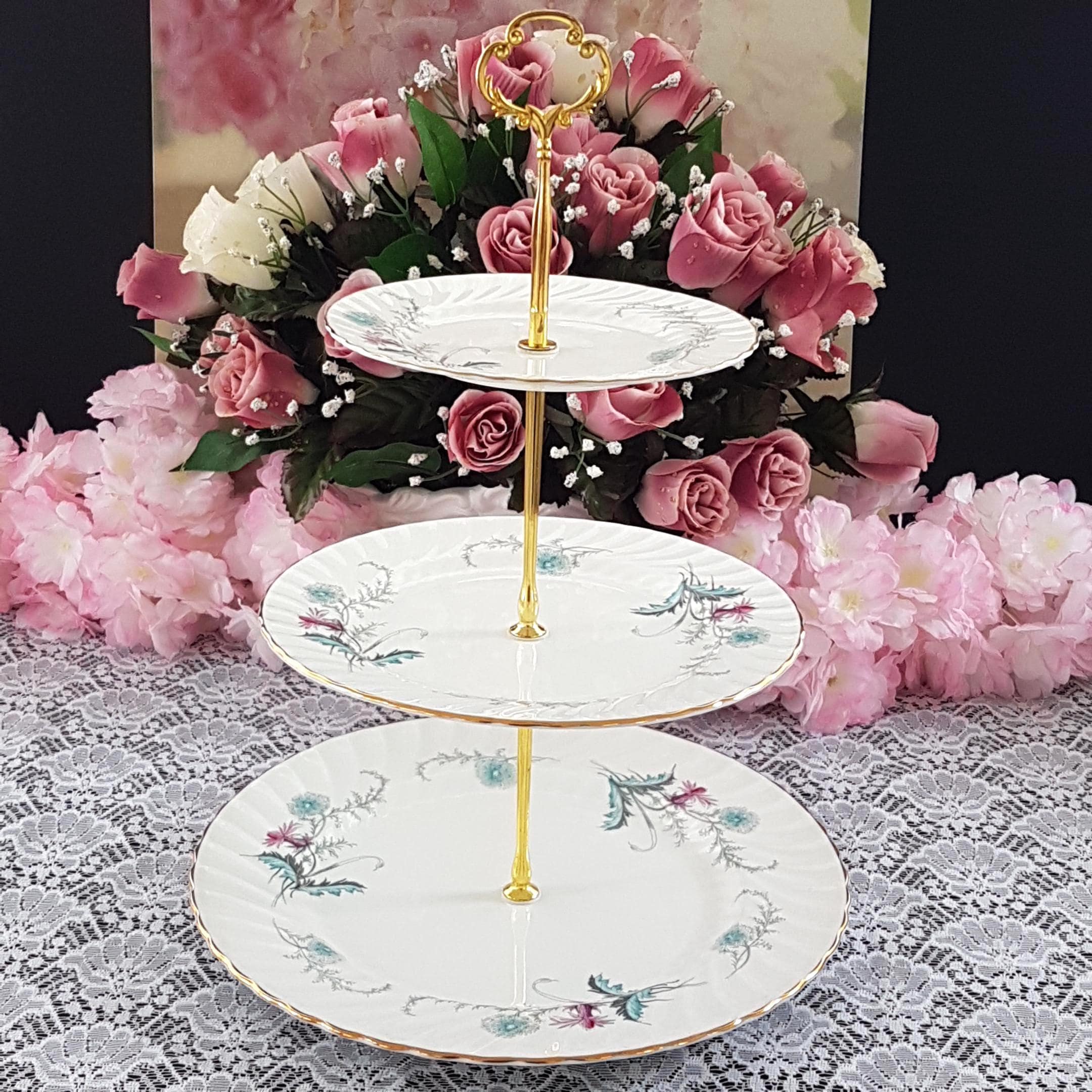 Bring timeless English charm to your table with this elegant, three-tier cake stand, handcrafted by me using genuine vintage Aynsley (England) âWaysideâ bone china plates. Perfect for afternoon tea, weddings, birthdays, or as a unique gift, each stand features a delicate floral design in fresh pink and turquoise blue, set on crisp white, swirled bone china.