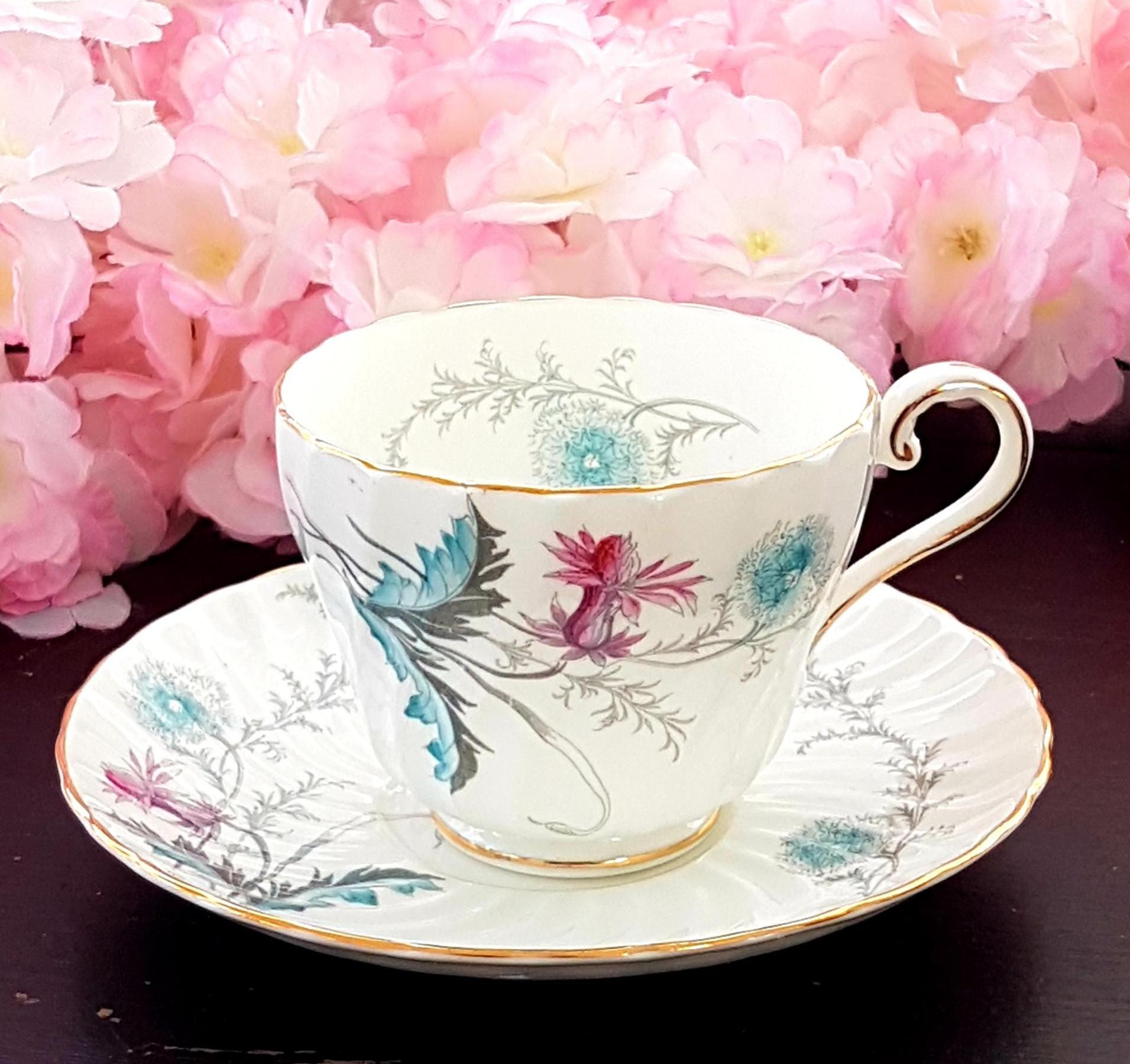 Vintage Aynsley (England) bone china tea cup and saucer in Wayside. This pattern features pink and turquoise blue flowers on crisp white swirled bone china. Made in England, circa 1960-1970s