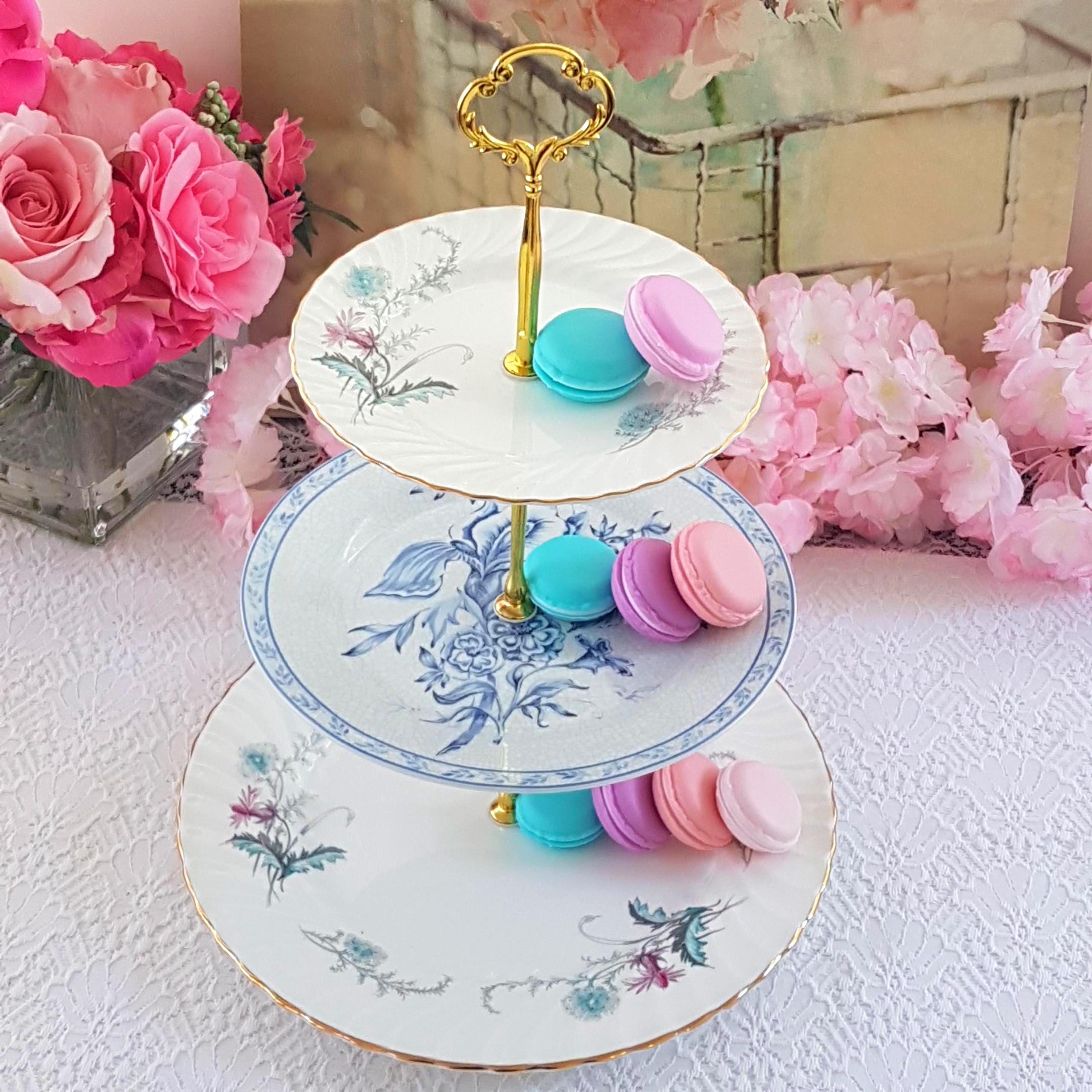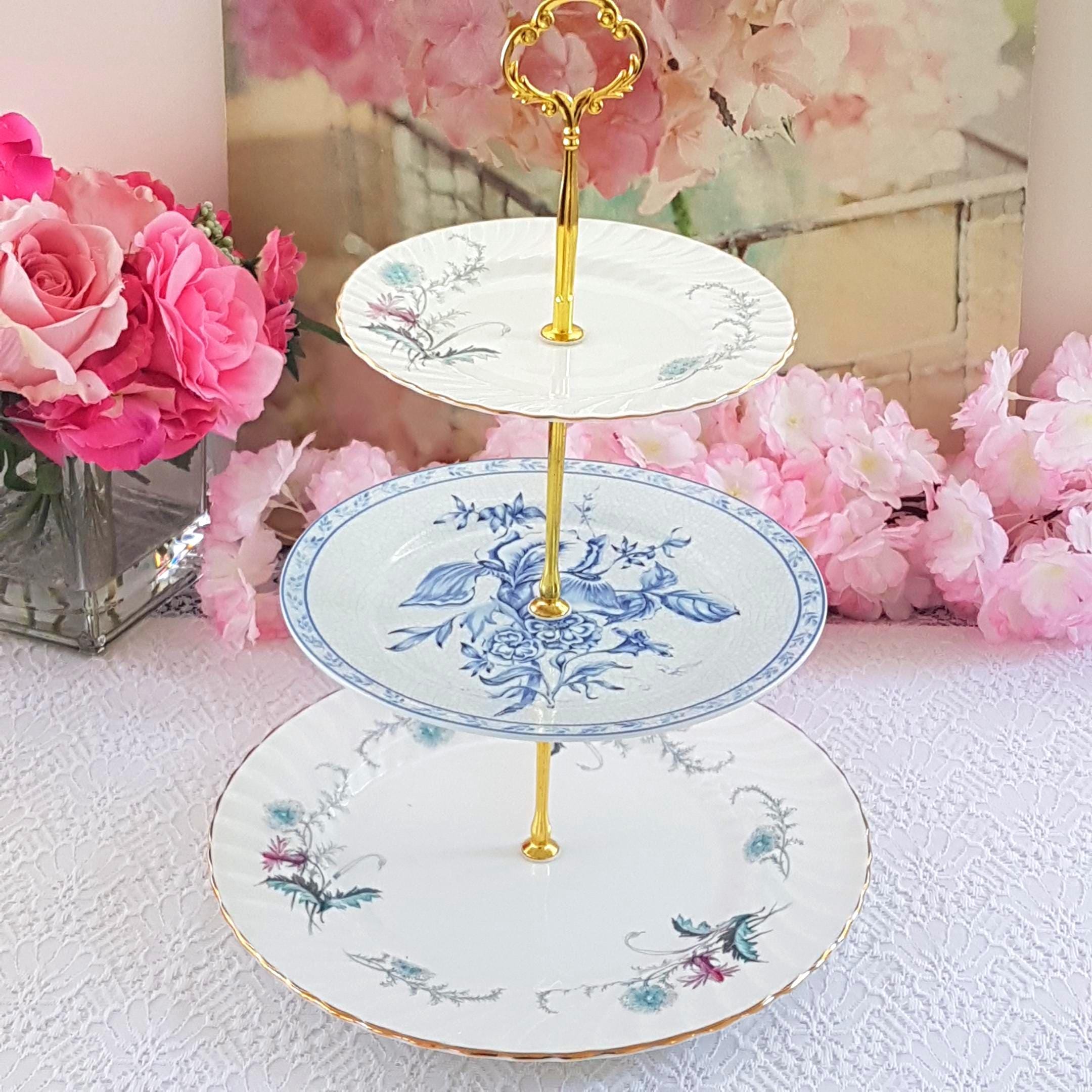 Three tier cake stand, made by me, using mismatched vintage blue floral plates. To complement the gold edge, plates are paired with new gold tone hardware.
