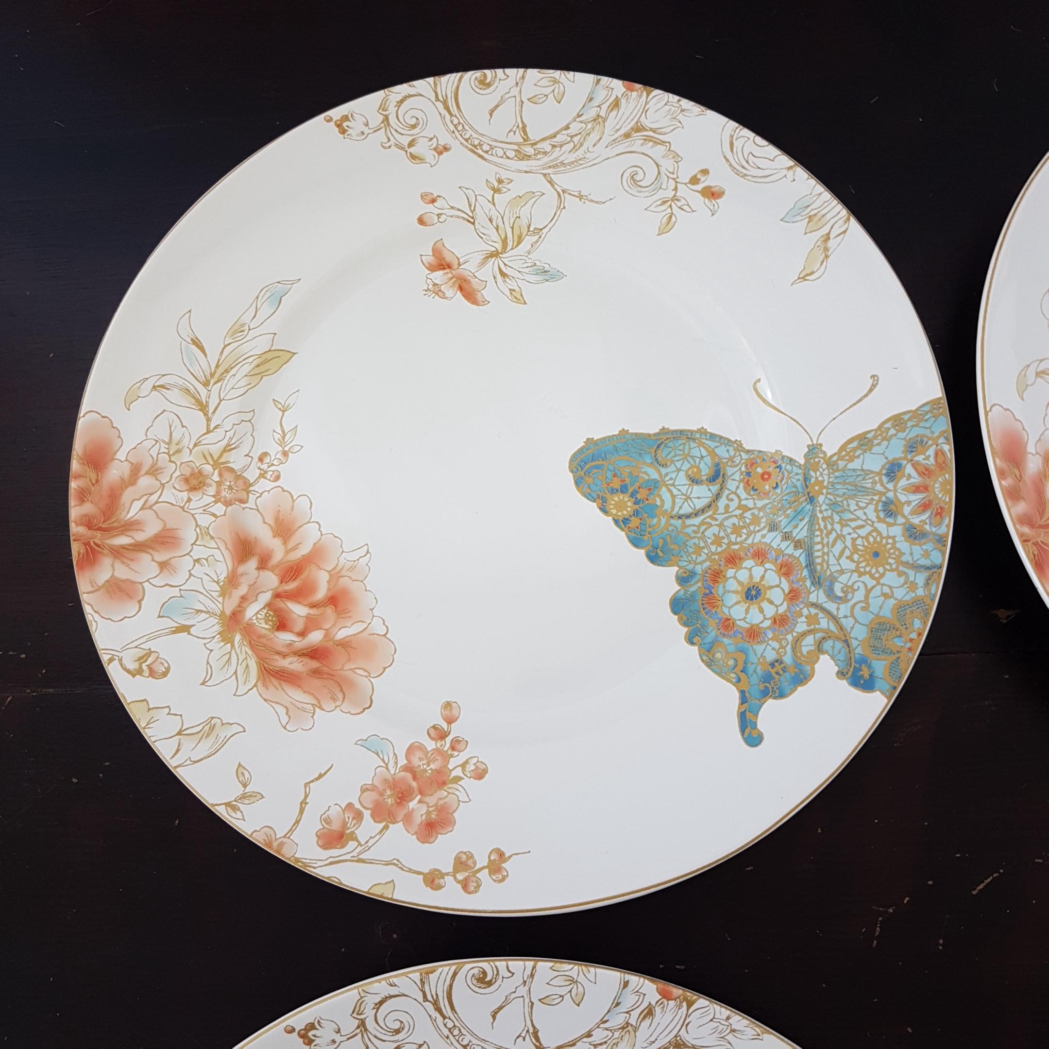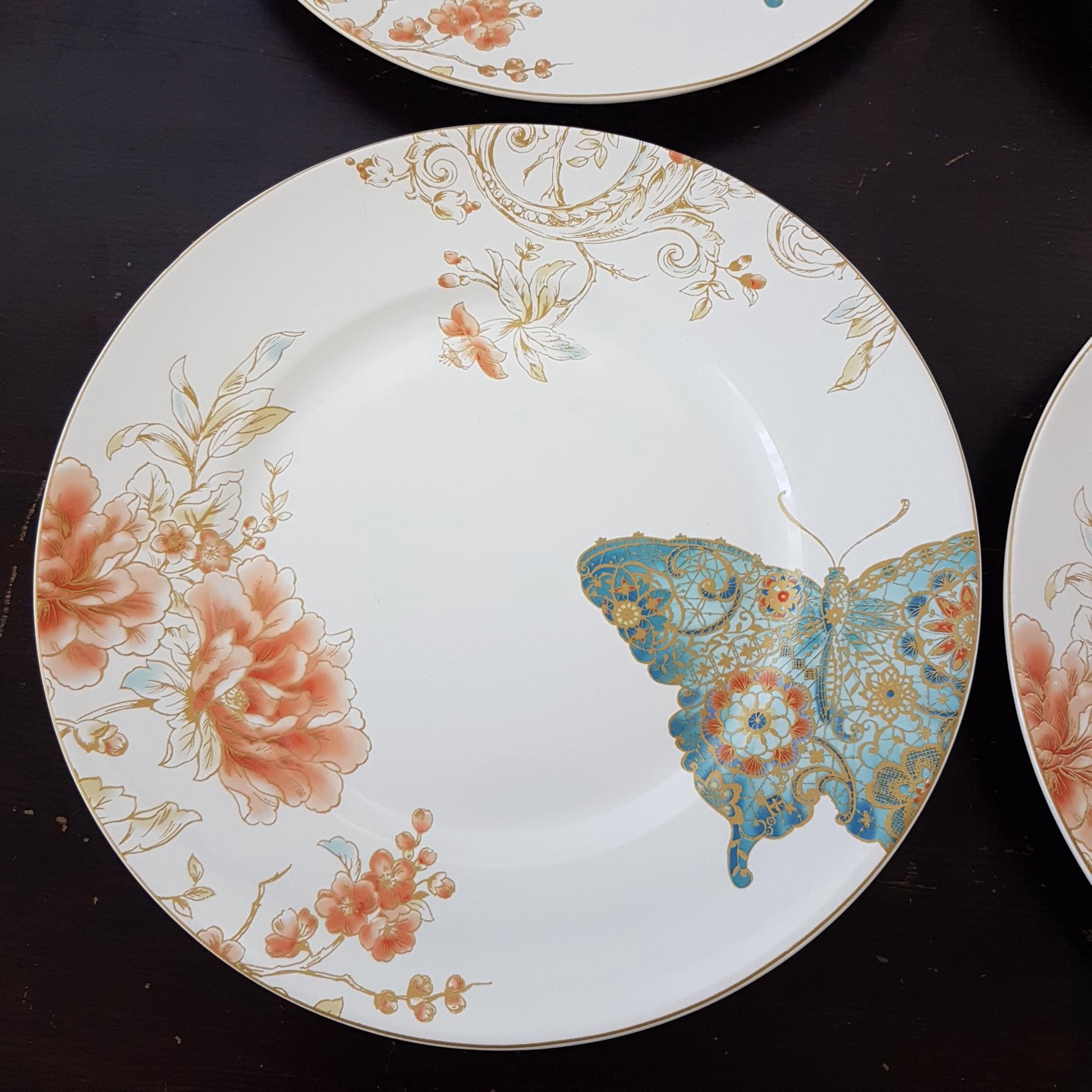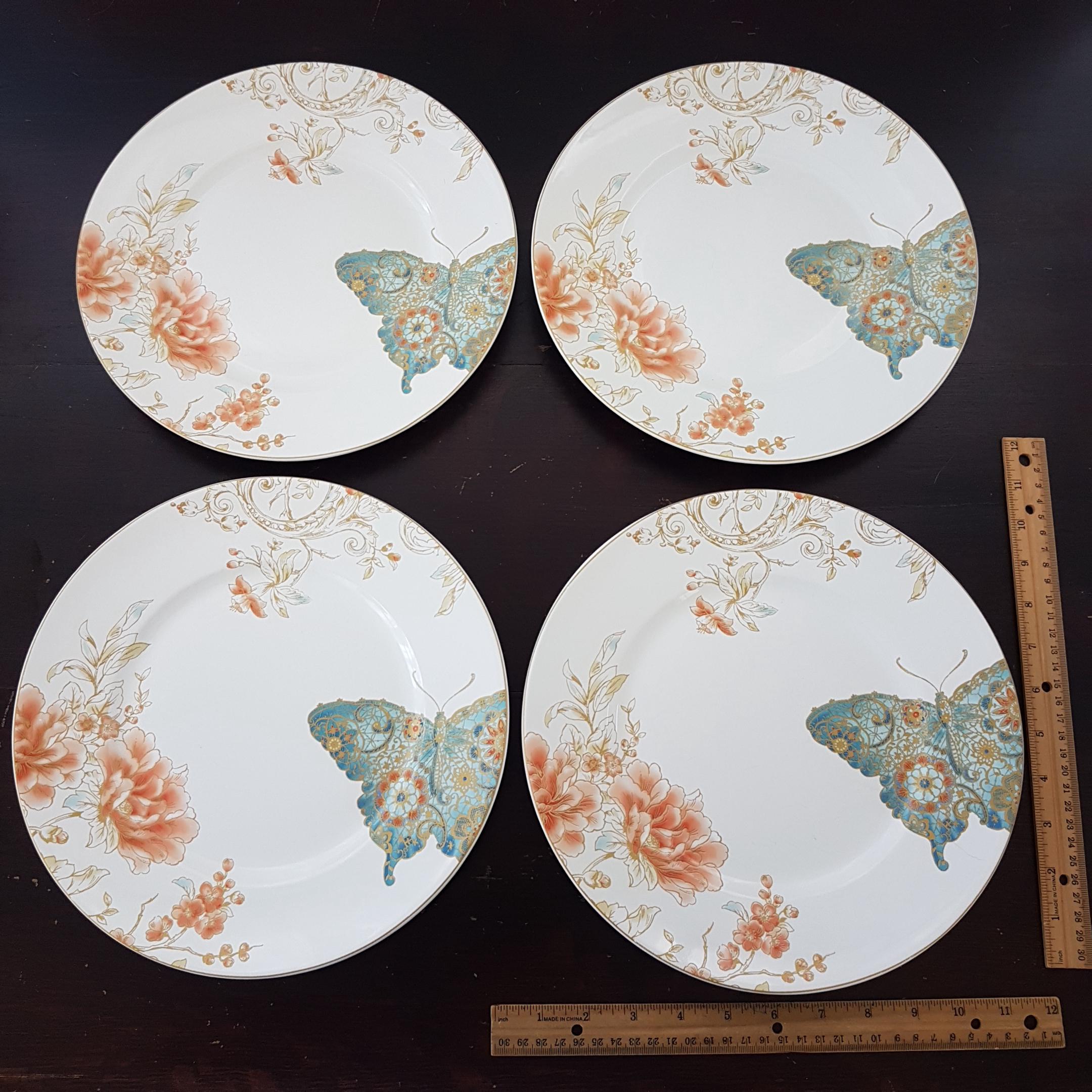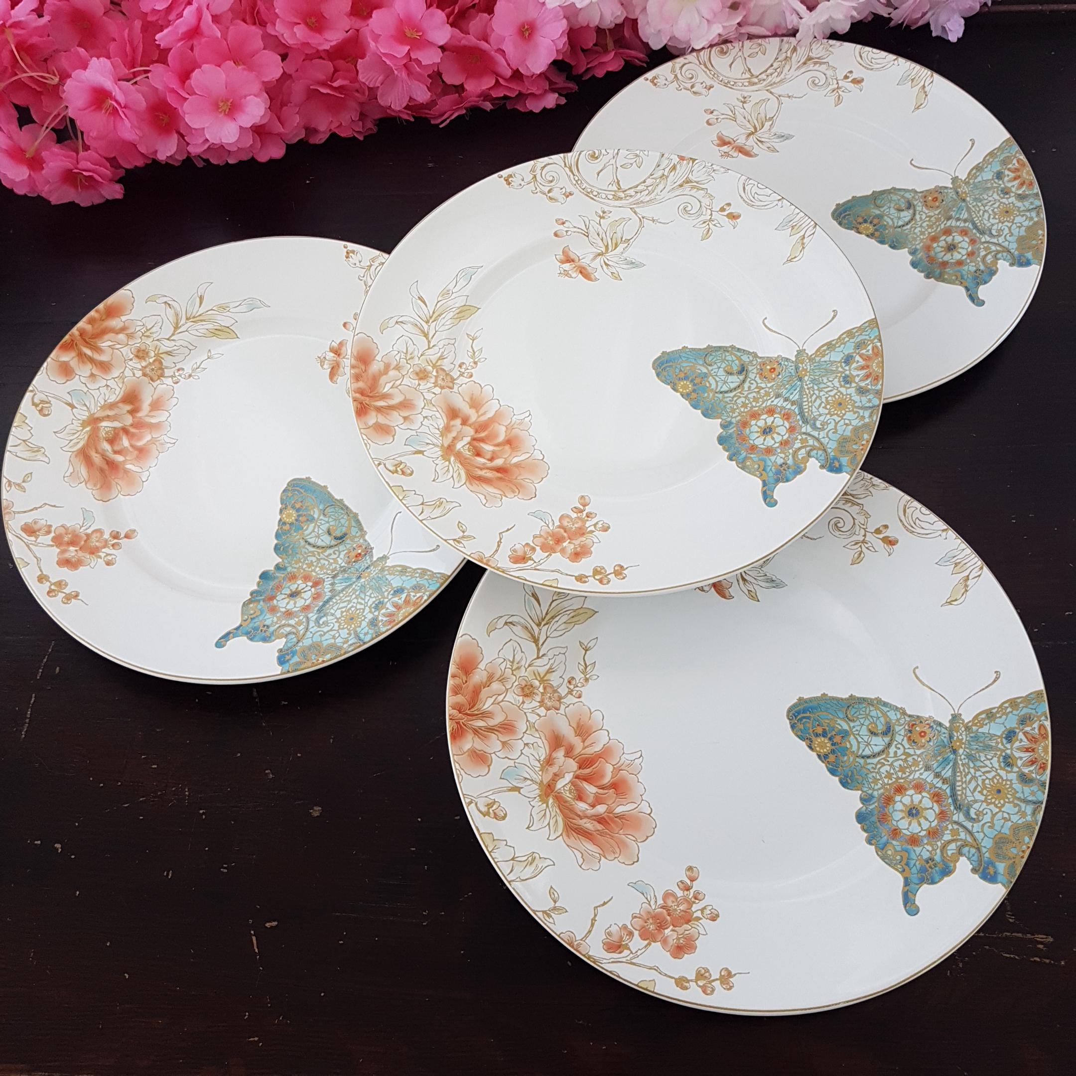 4-piece set of vintage porcelain dinner plates with blue-patterned butterfly. Pretty plates with the modern convenience of being dishwasher & microwave safe!