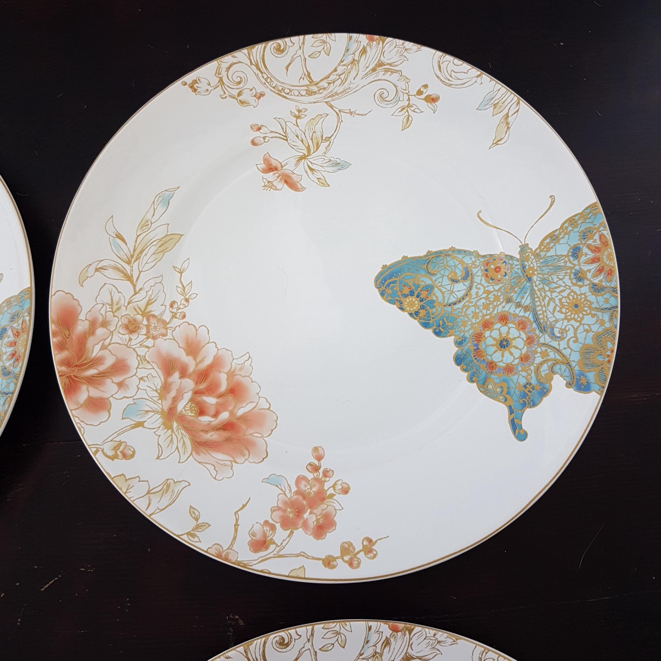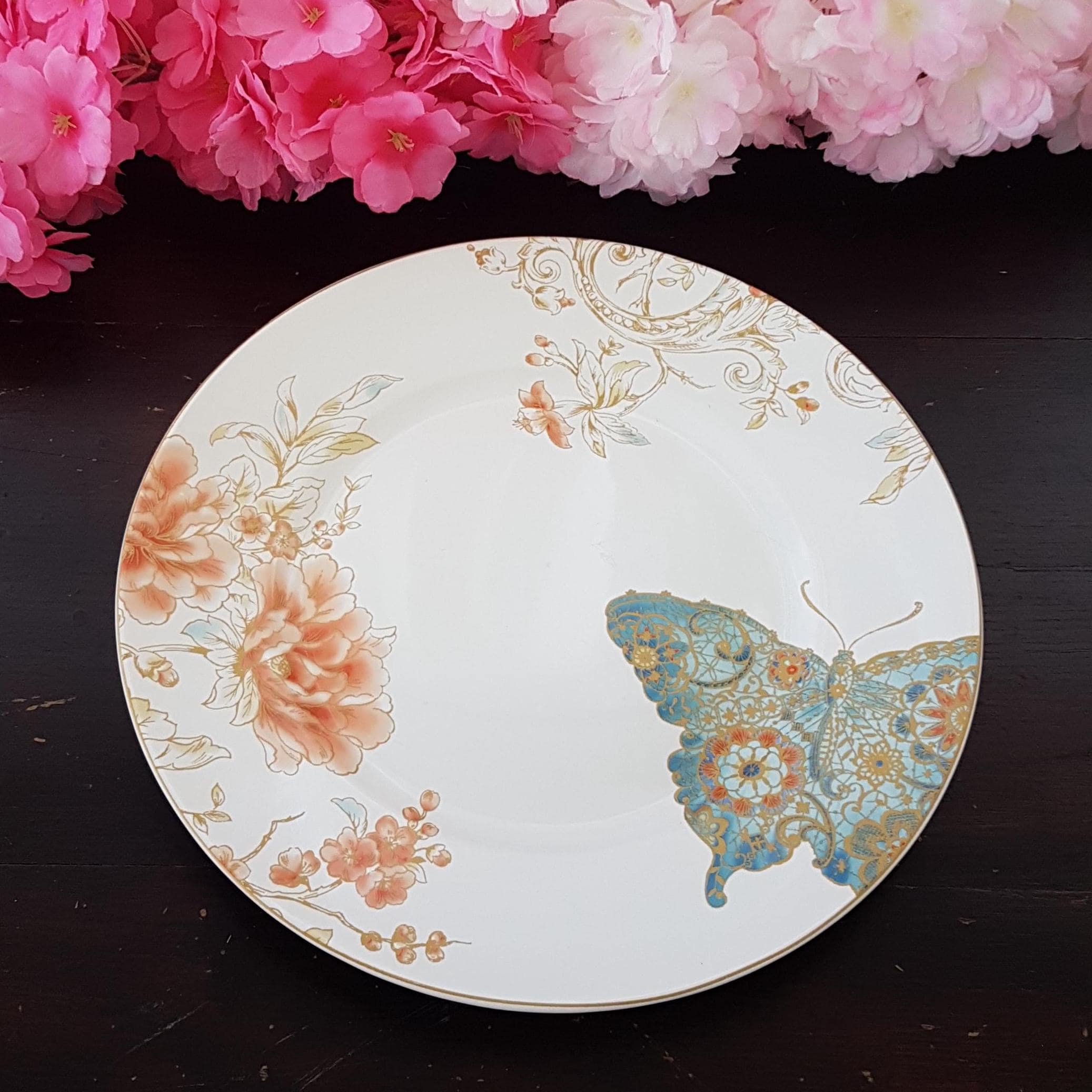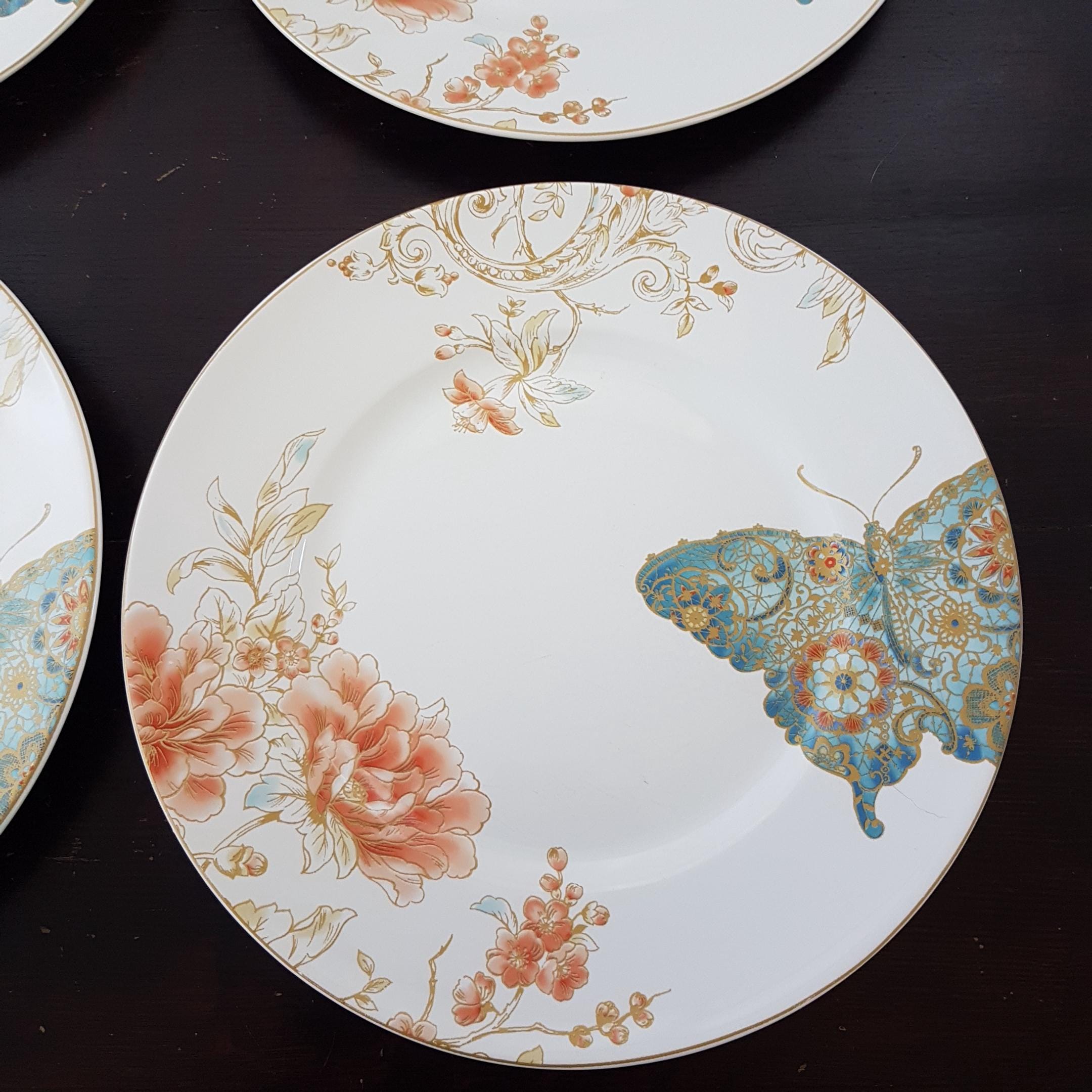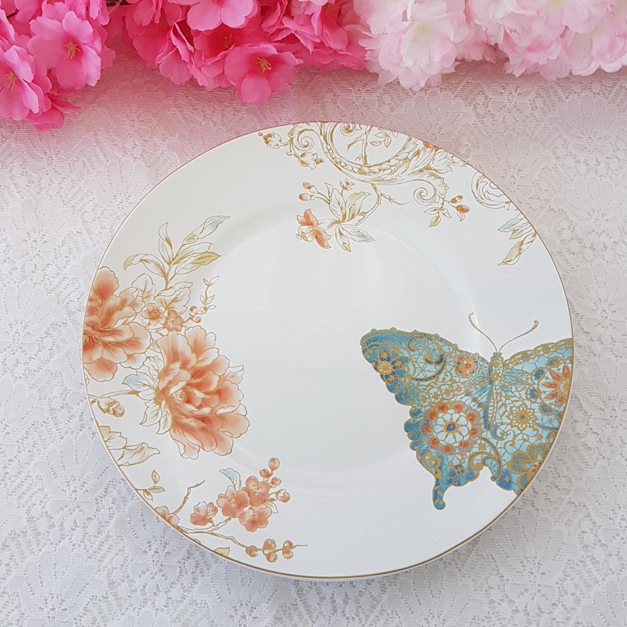 4-piece set of vintage porcelain dinner plates with blue-patterned butterfly. Pretty plates with the modern convenience of being dishwasher & microwave safe!