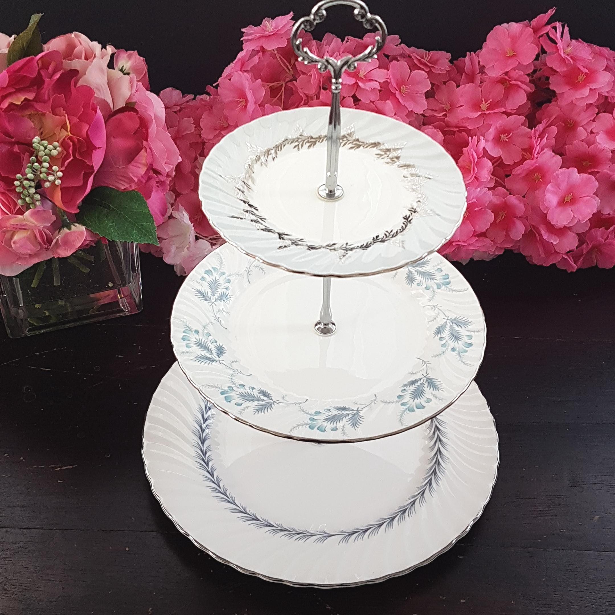 Three tier cake stand, handcrafted by me, using mismatched vintage English bone china plates in blue, gray, white & silver. To complement the silver edgings, plates are paired with new silver-tone hardware.