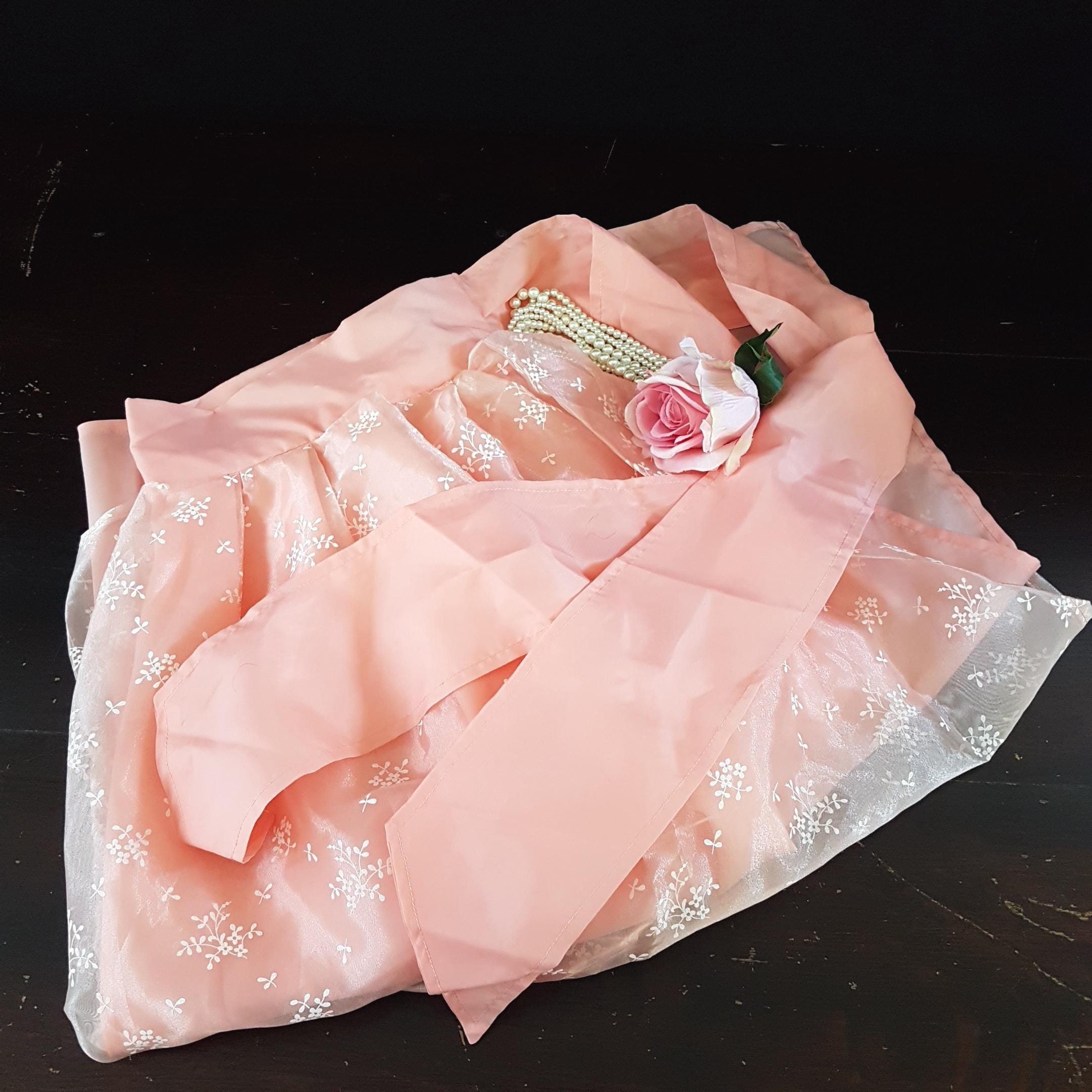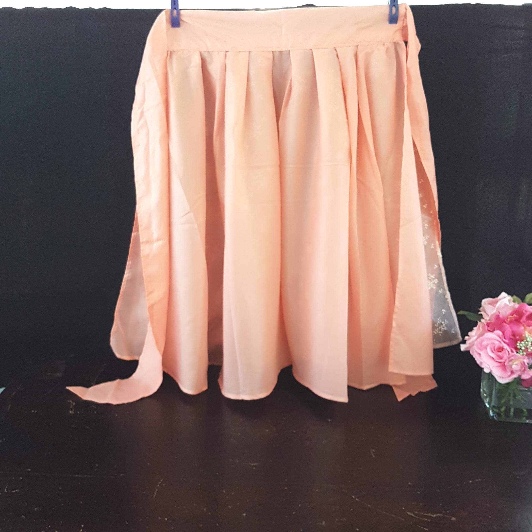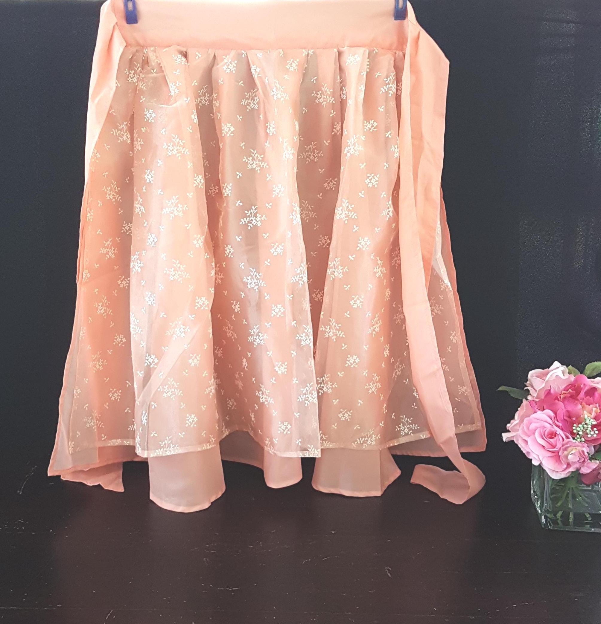 Handmade peach satin, long half apron with a shorter peach tulle & white floral overlay. Wide waist band & long, wide straps. Fabric feels like polyester blend and is a vintage handmade item.