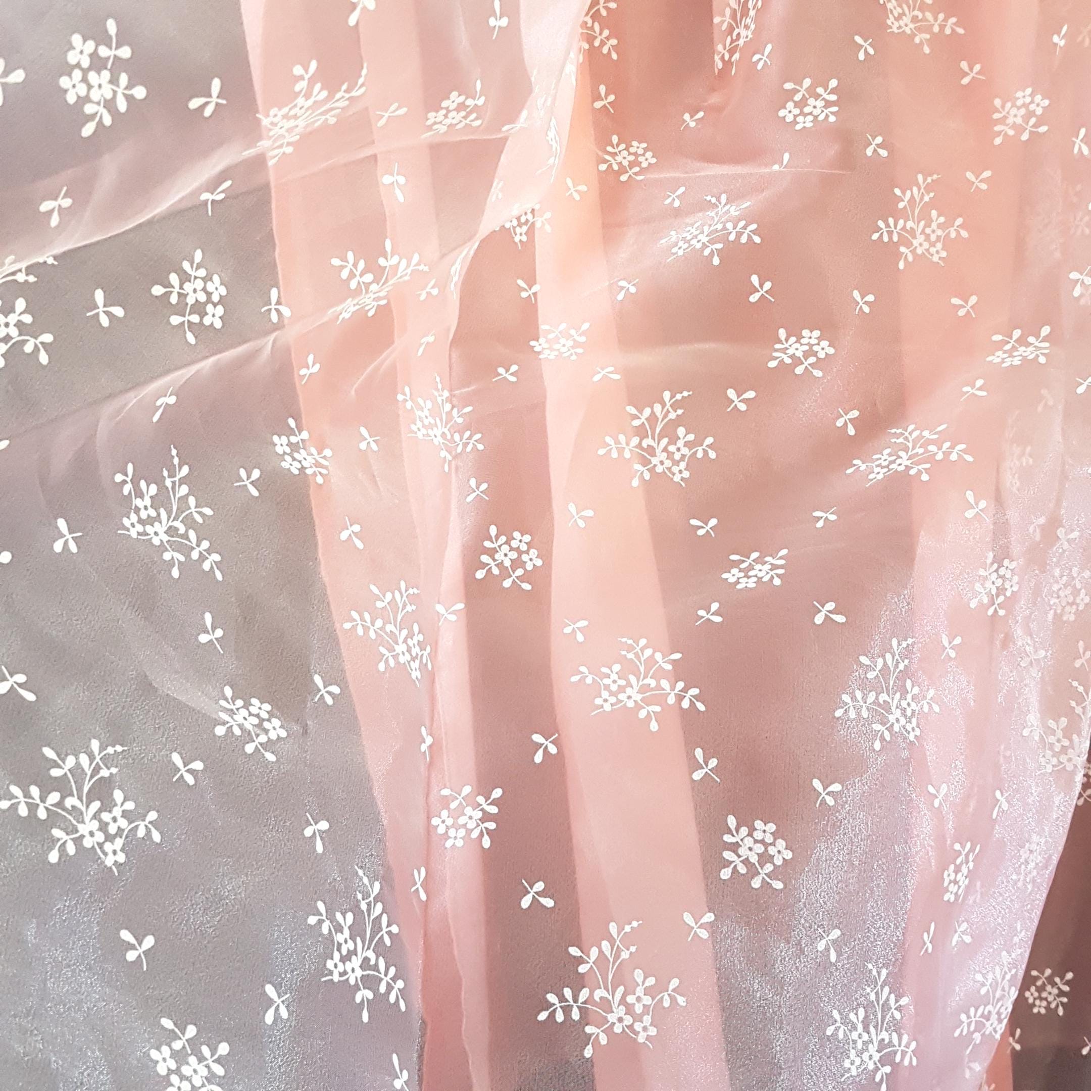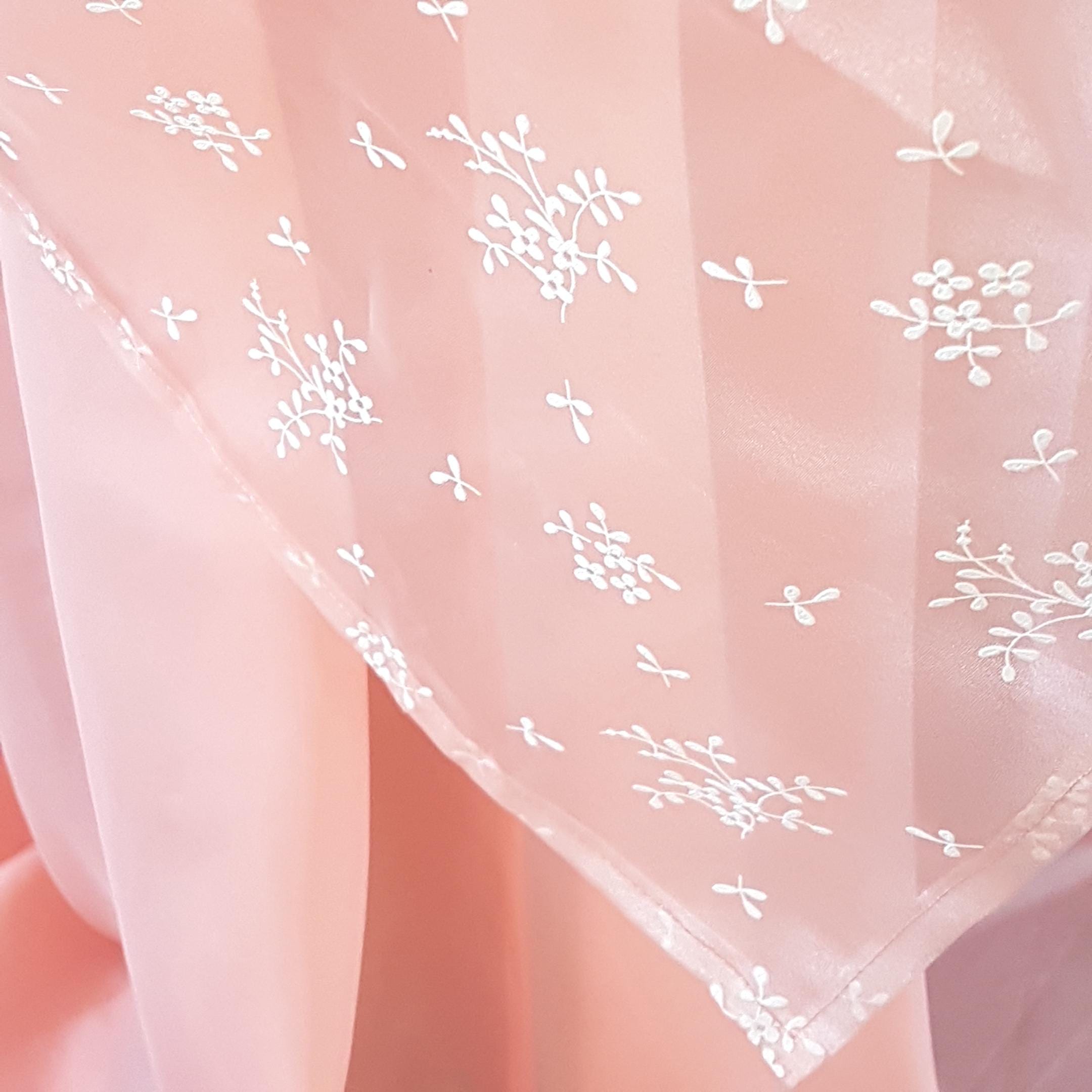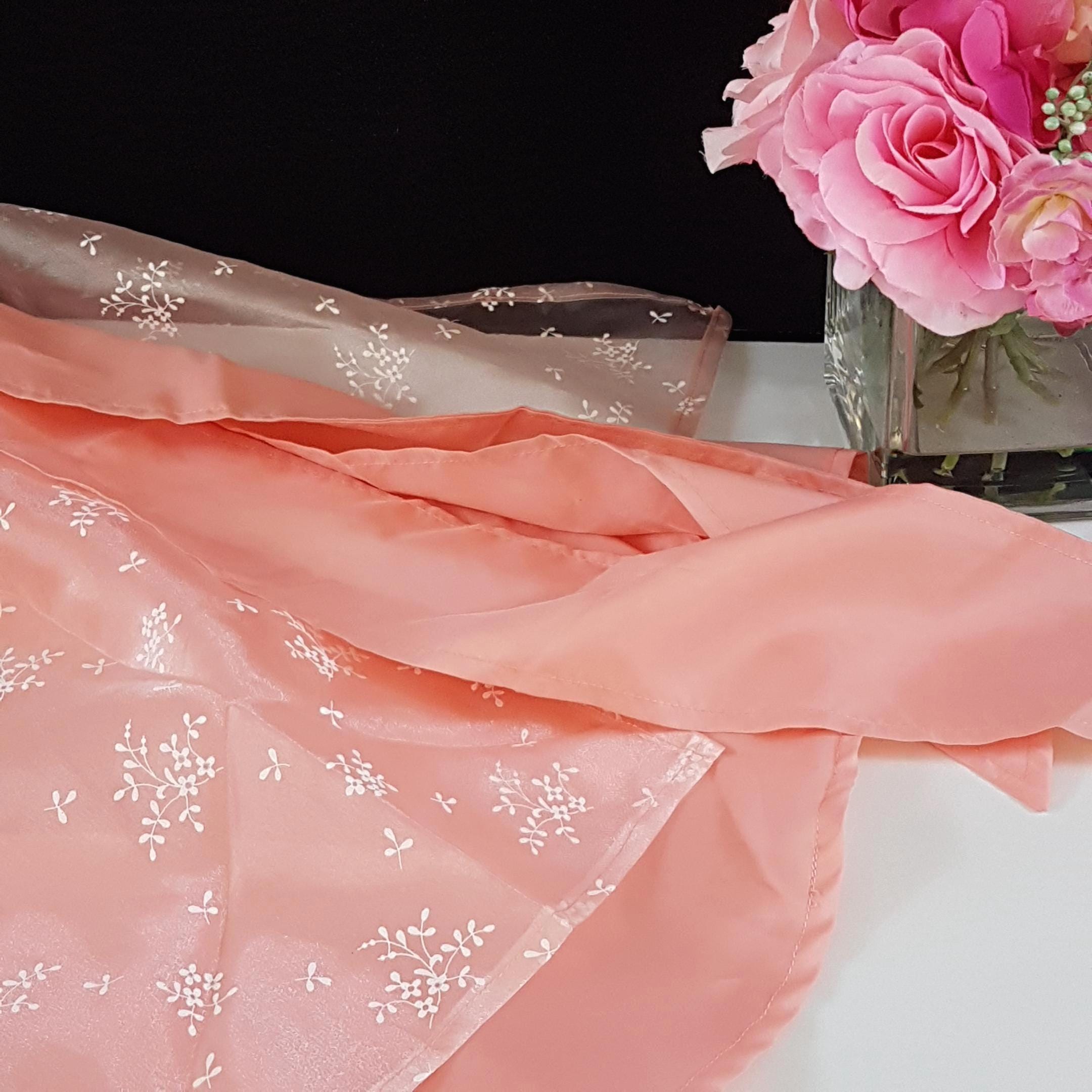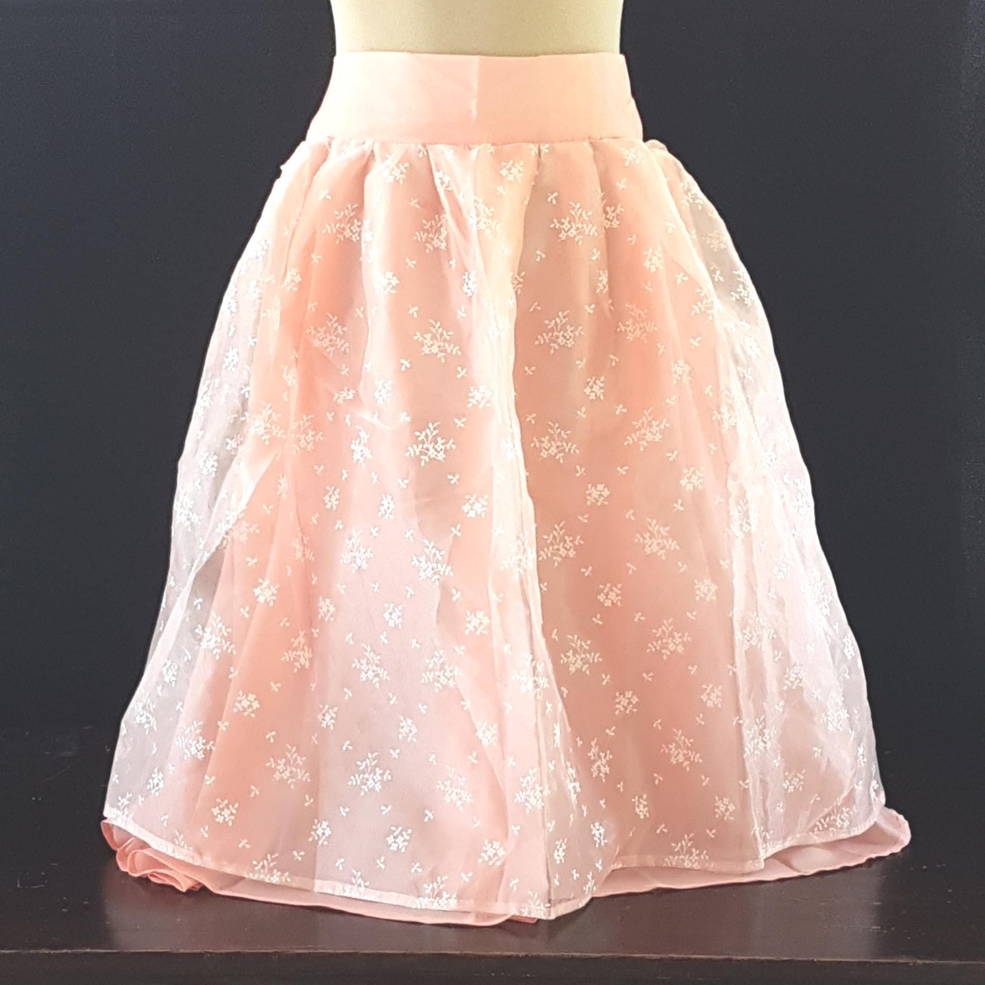 Handmade peach satin, long half apron with a shorter peach tulle & white floral overlay. Wide waist band & long, wide straps. Fabric feels like polyester blend and is a vintage handmade item.