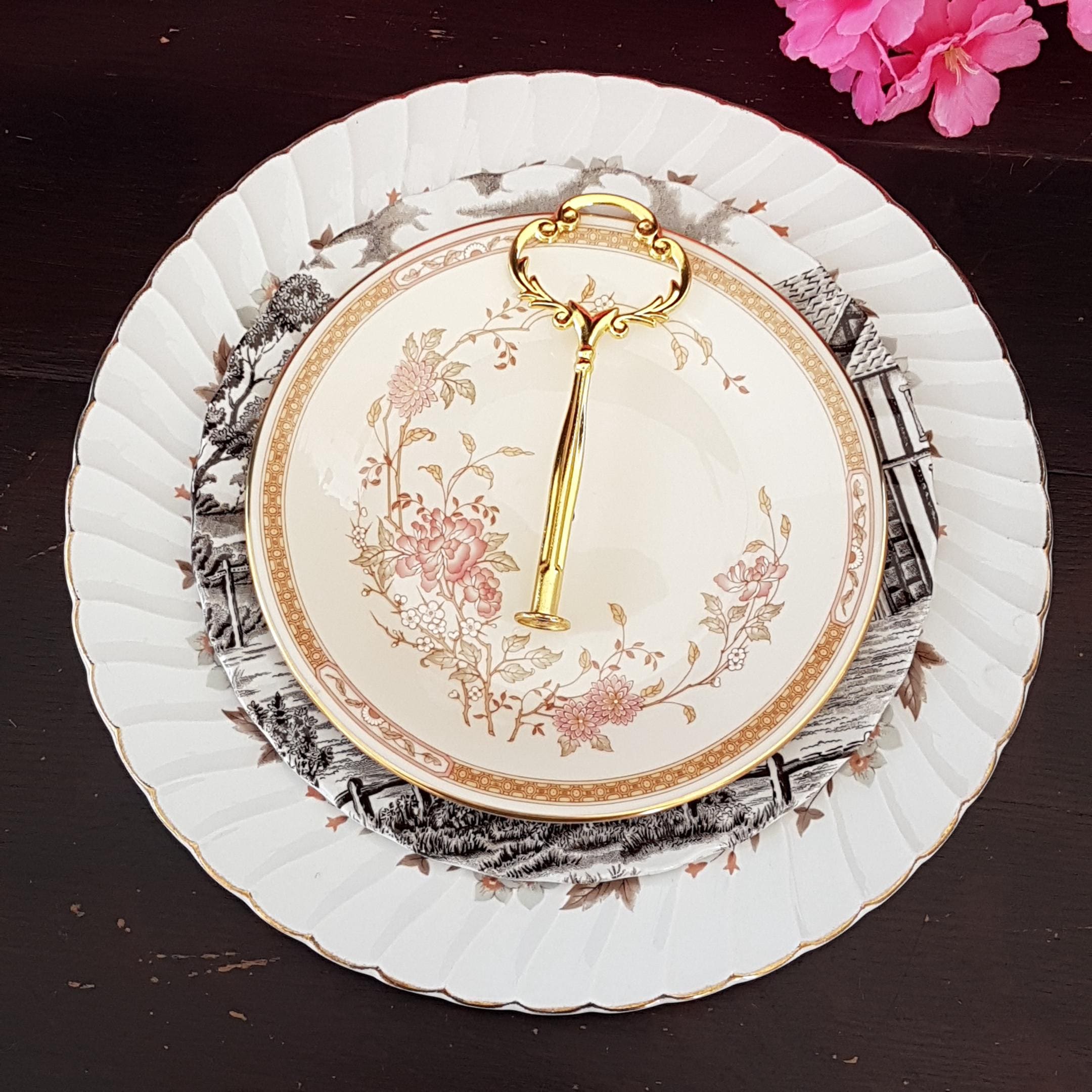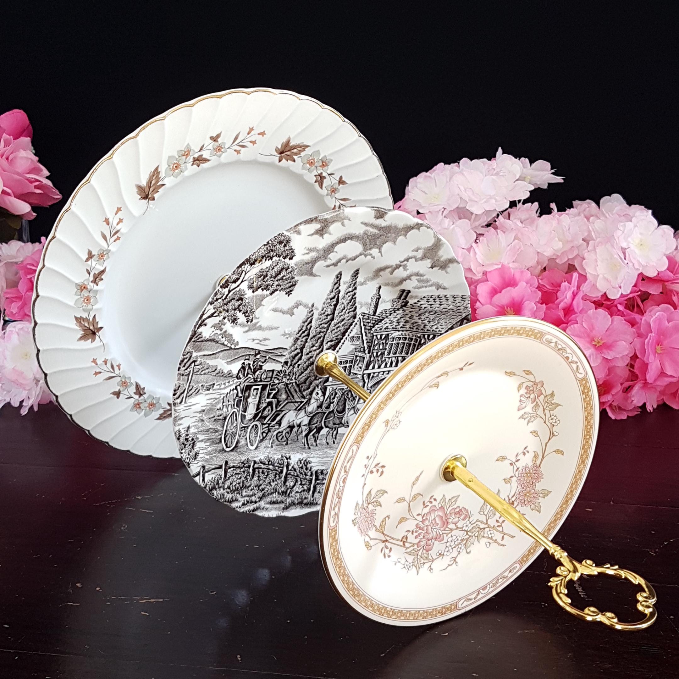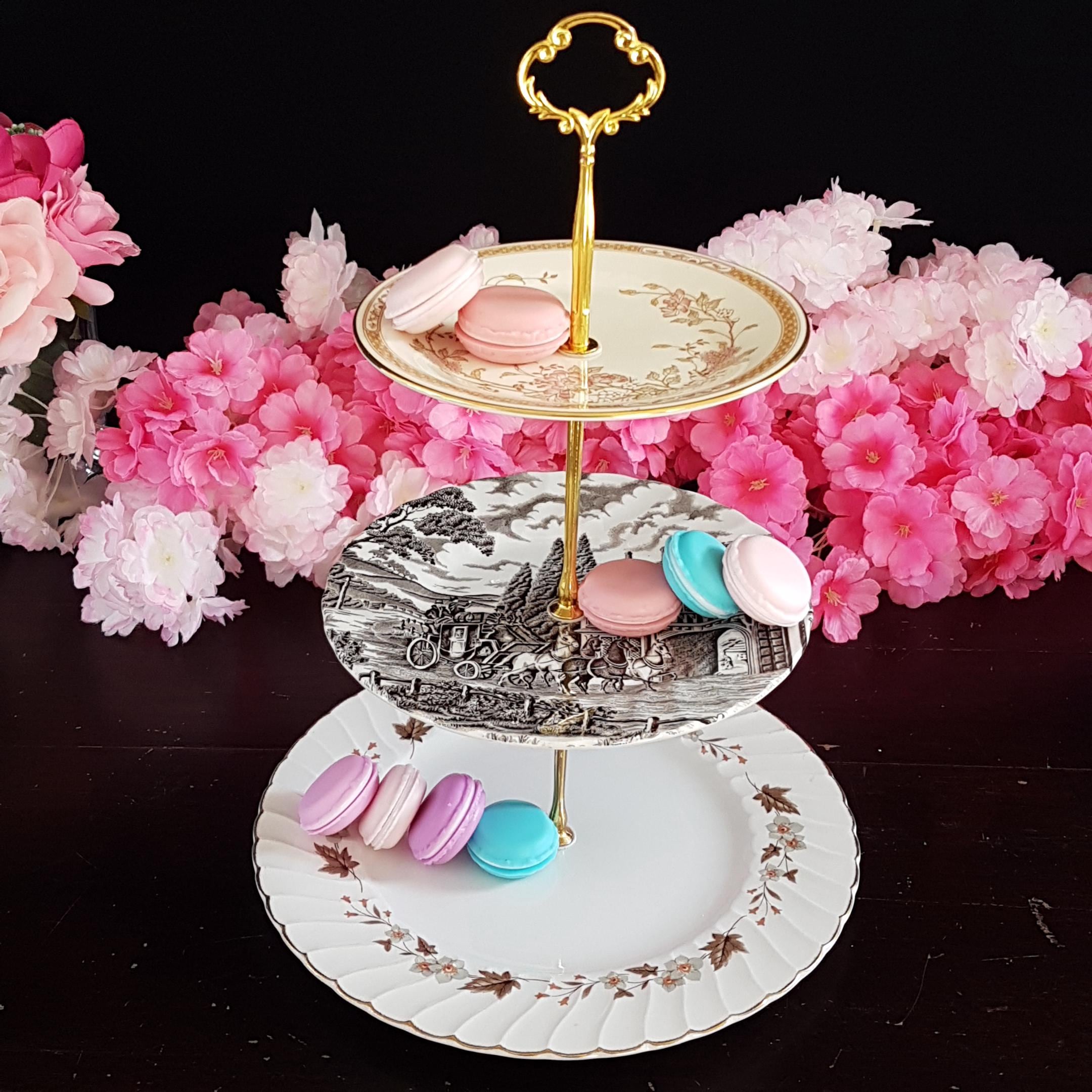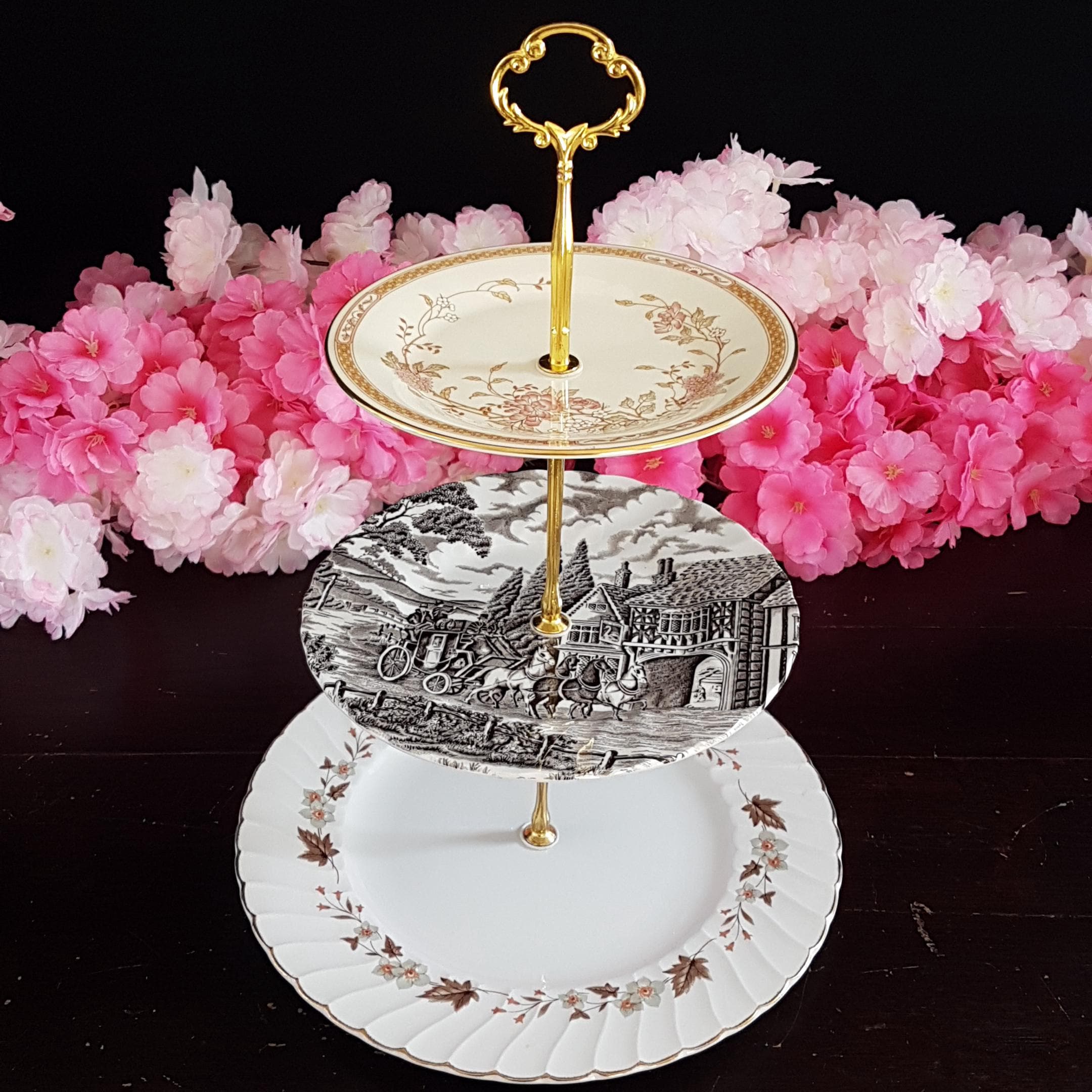 Three tier cake stand, made by me, using mismatched floral plates from England, paired with your choice of new black, white, silver or gold tone hardware.