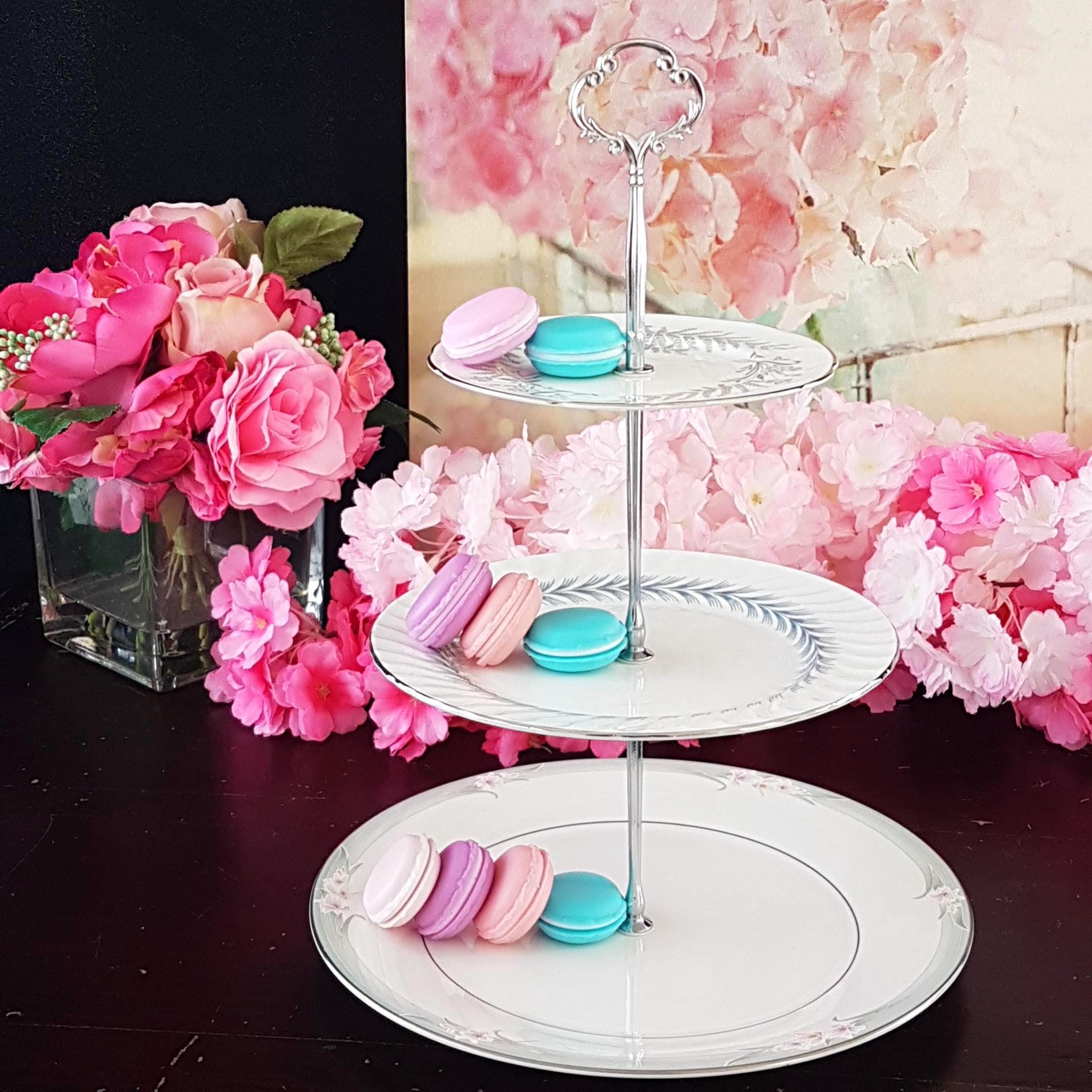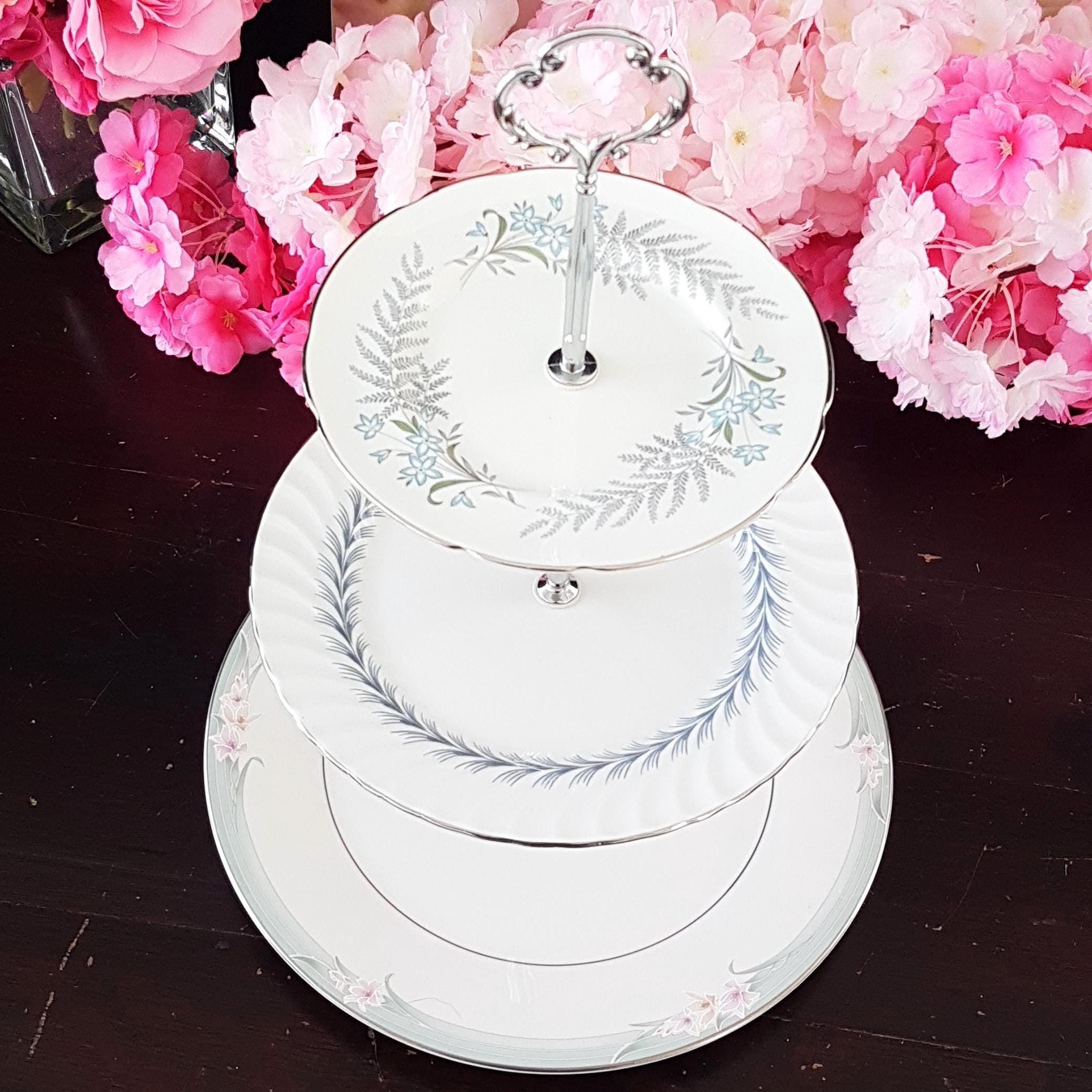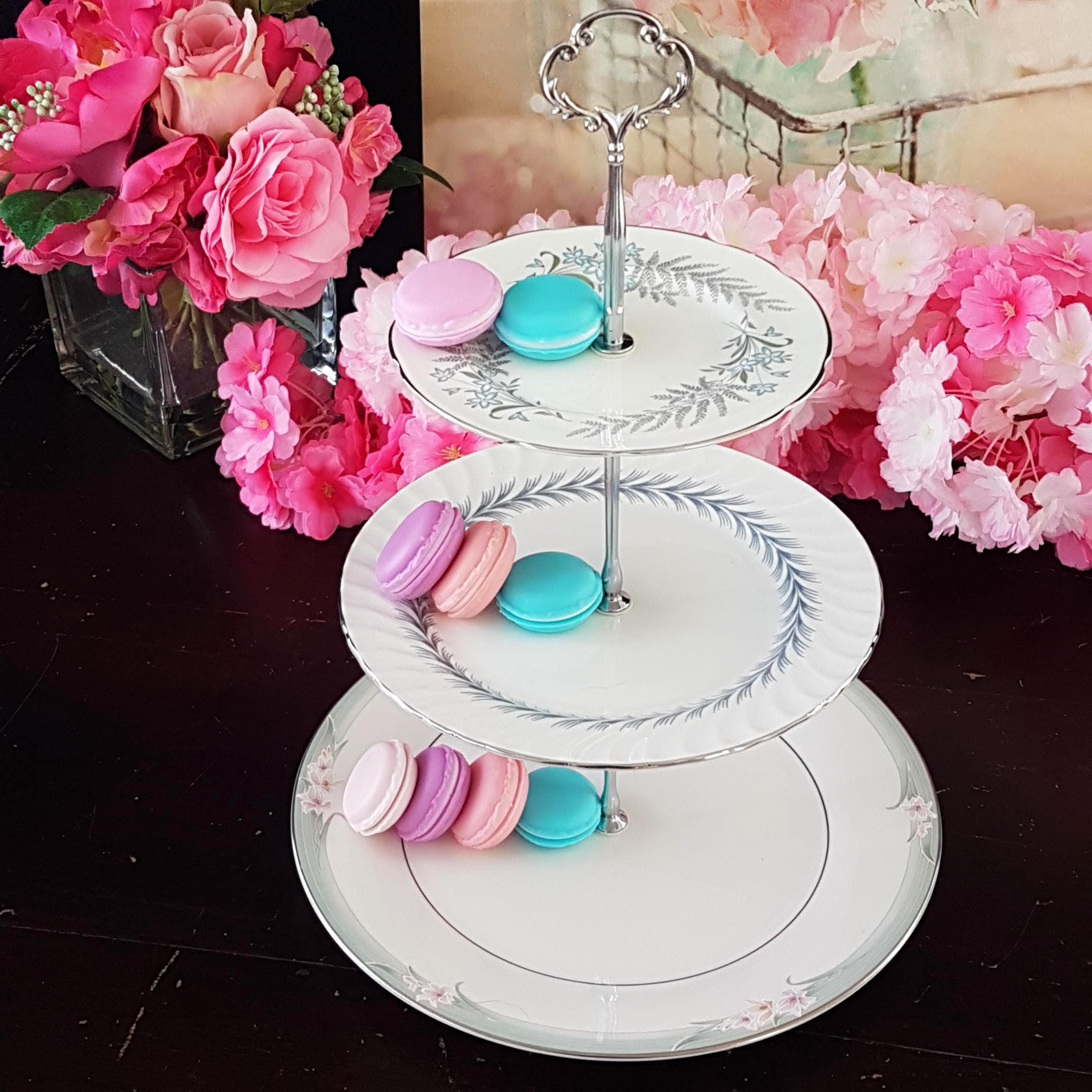 Three tier cake stand, made by me, using mismatched vintage English bone china plates, paired with your choice of new black, white, silver or gold tone hardware.