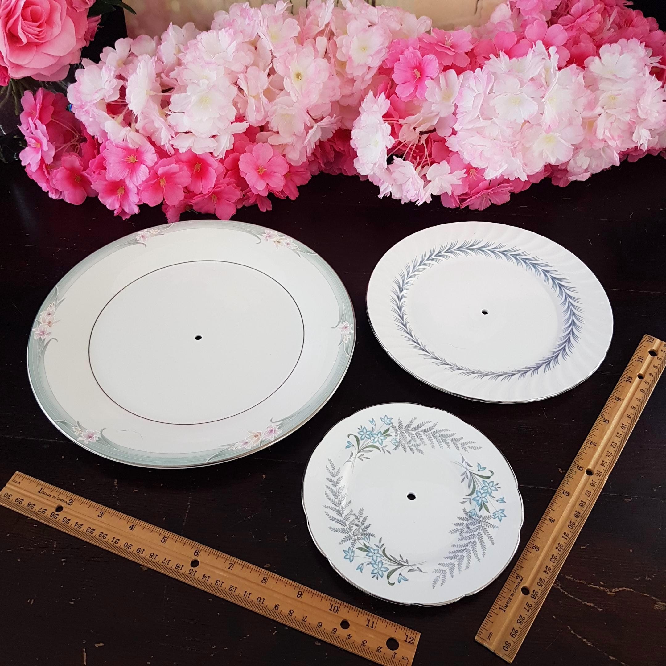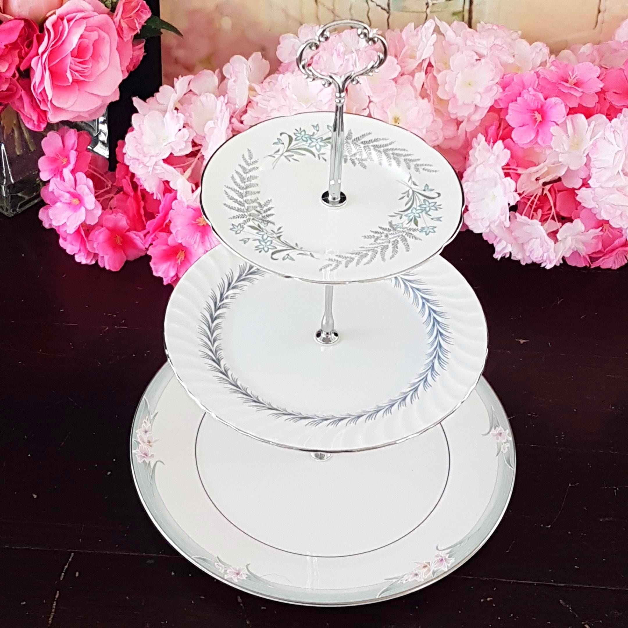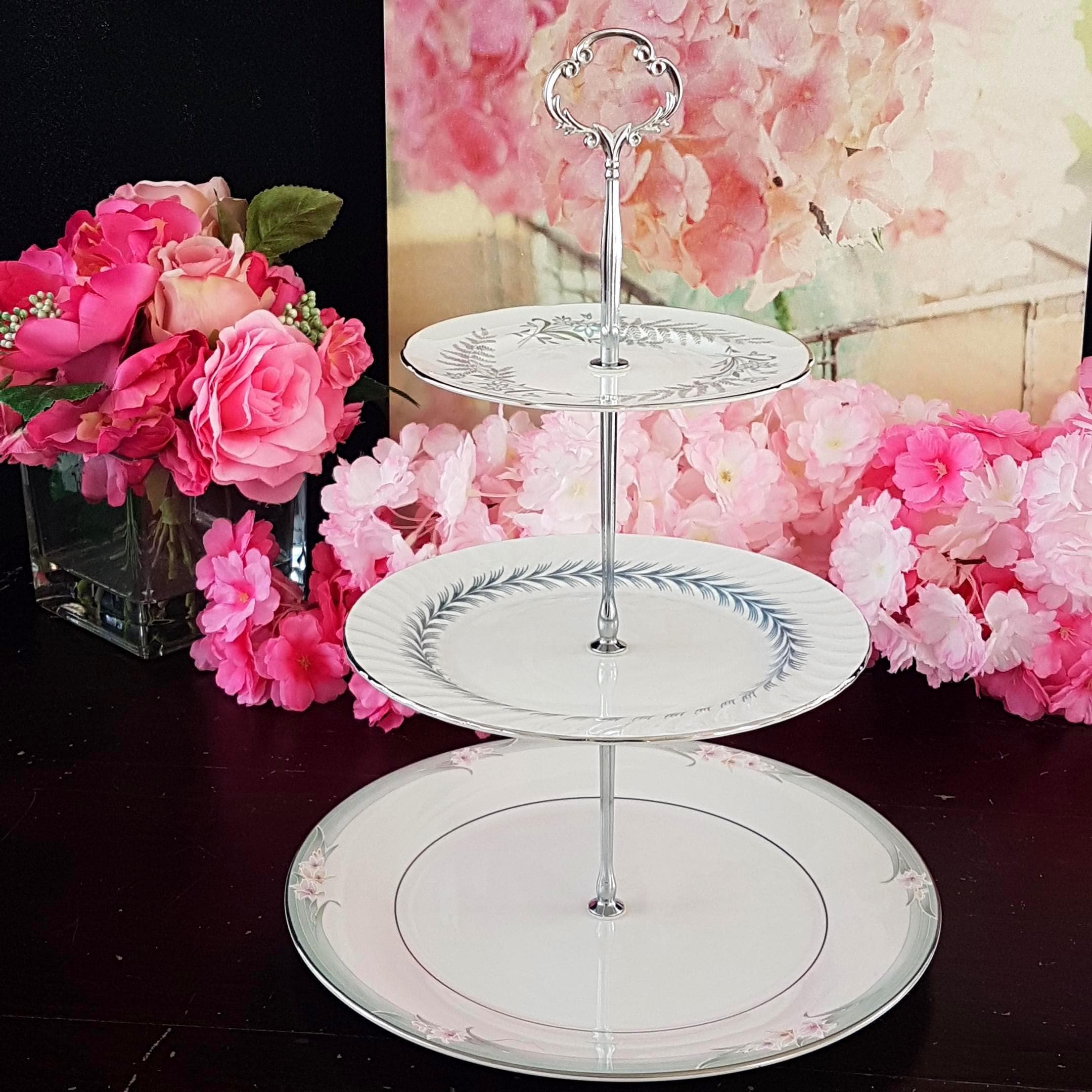 Three tier cake stand, made by me, using mismatched vintage English bone china plates, paired with your choice of new black, white, silver or gold tone hardware.