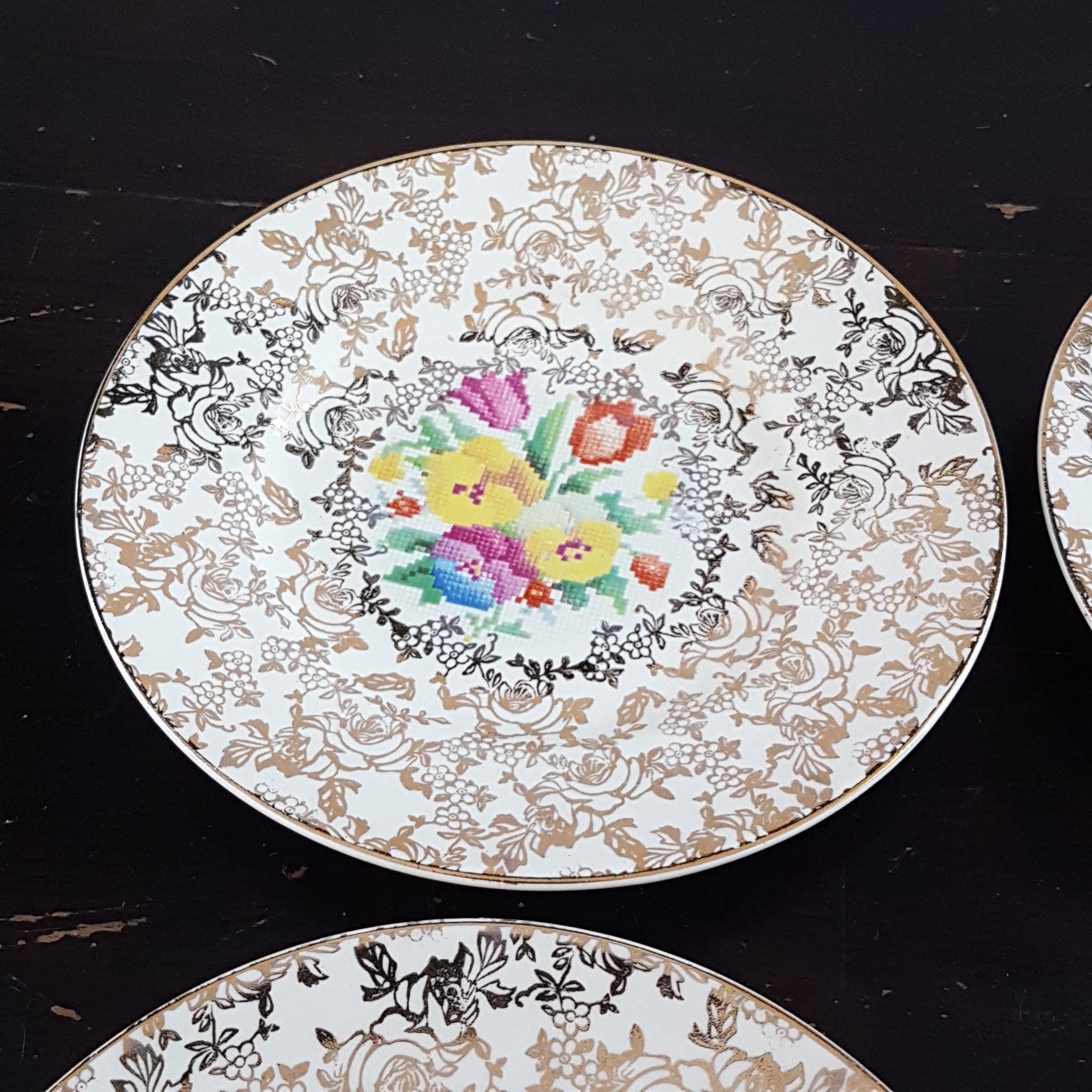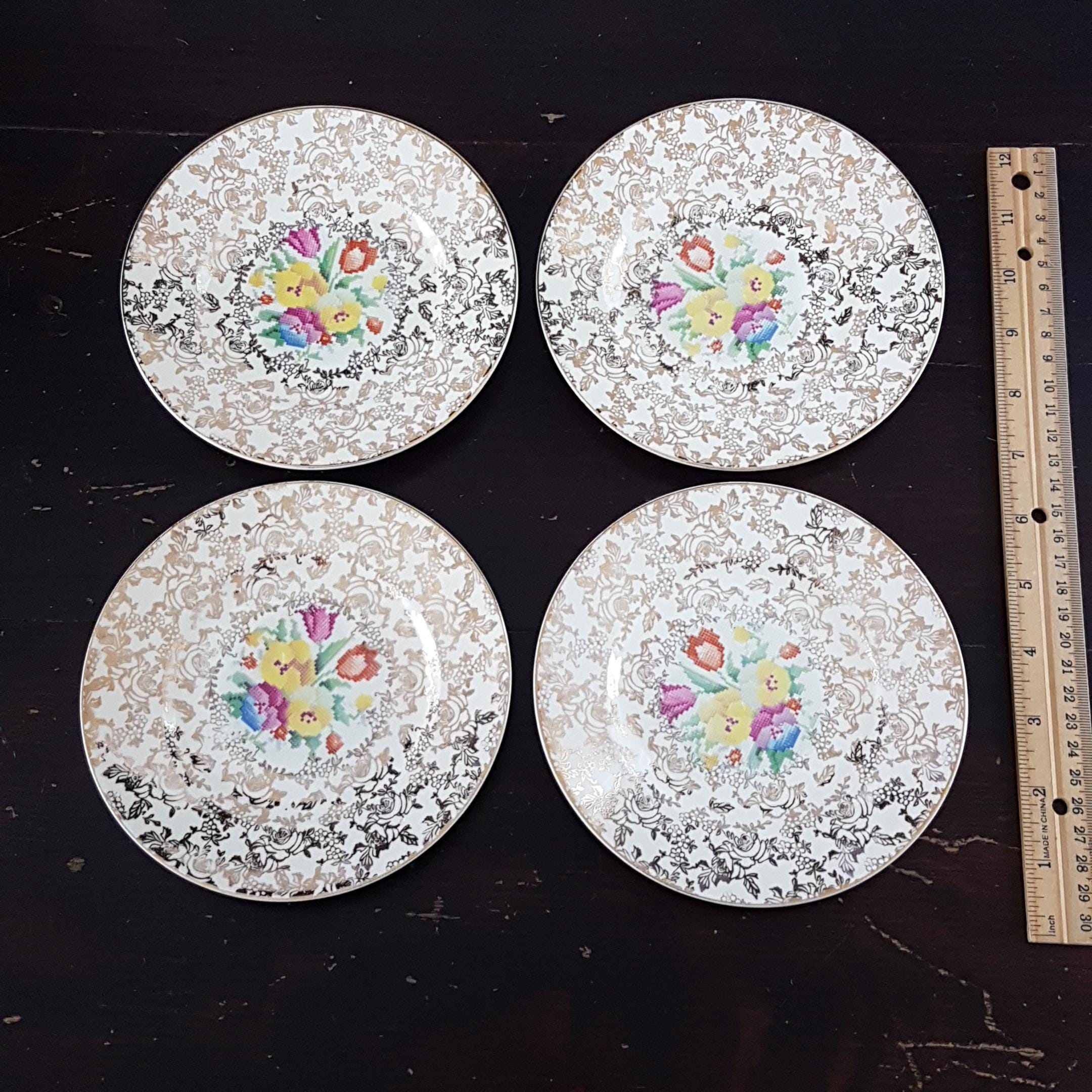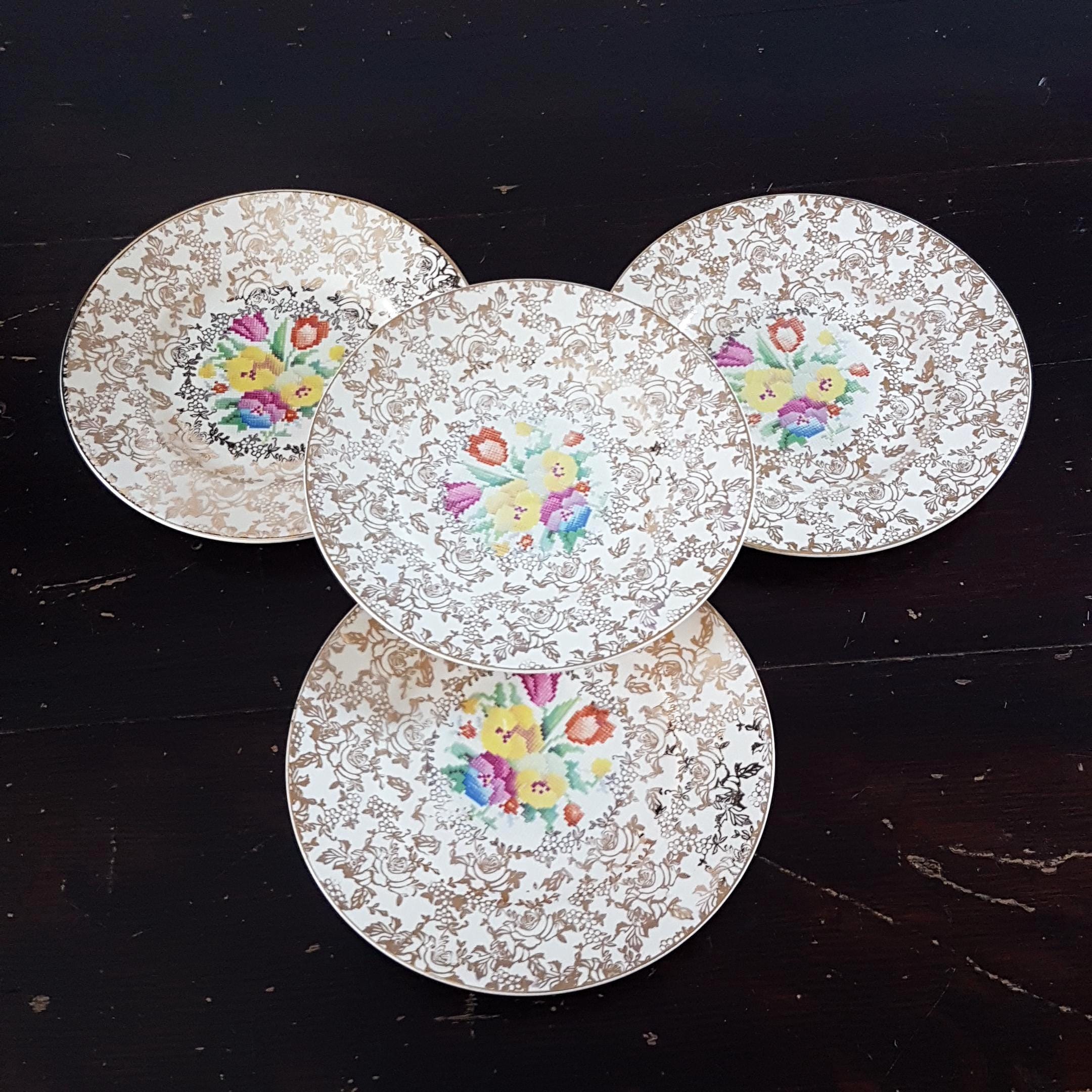 Set of 4 side plates by H &K Tunstall in OLD ENGLISH SAMPLER pattern. Center of plate has petit point, similar to a needlepoint or embroidered /cross stitch floral bouquet. Rest of plate face is hand decorated with gold floral chintz and gold edge.