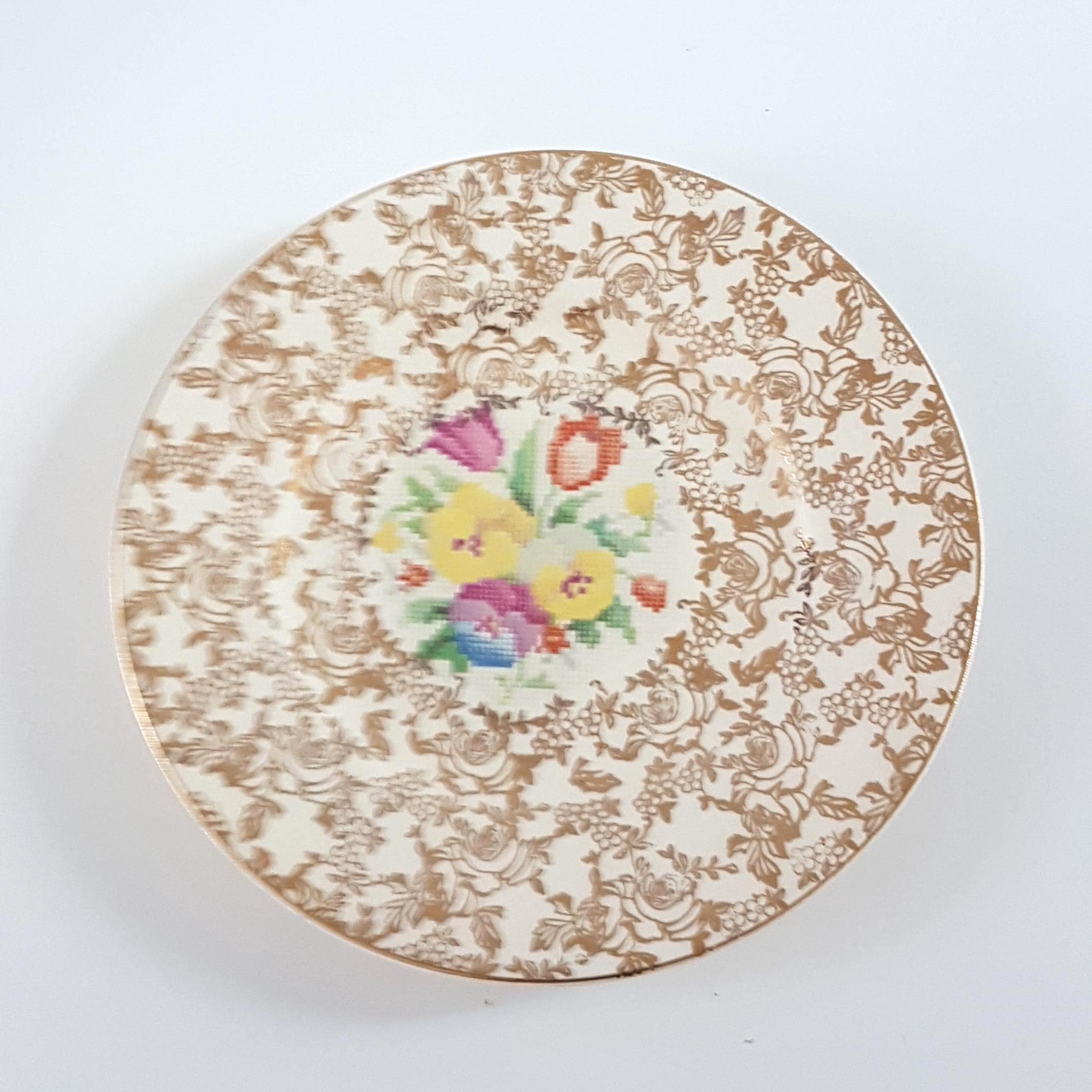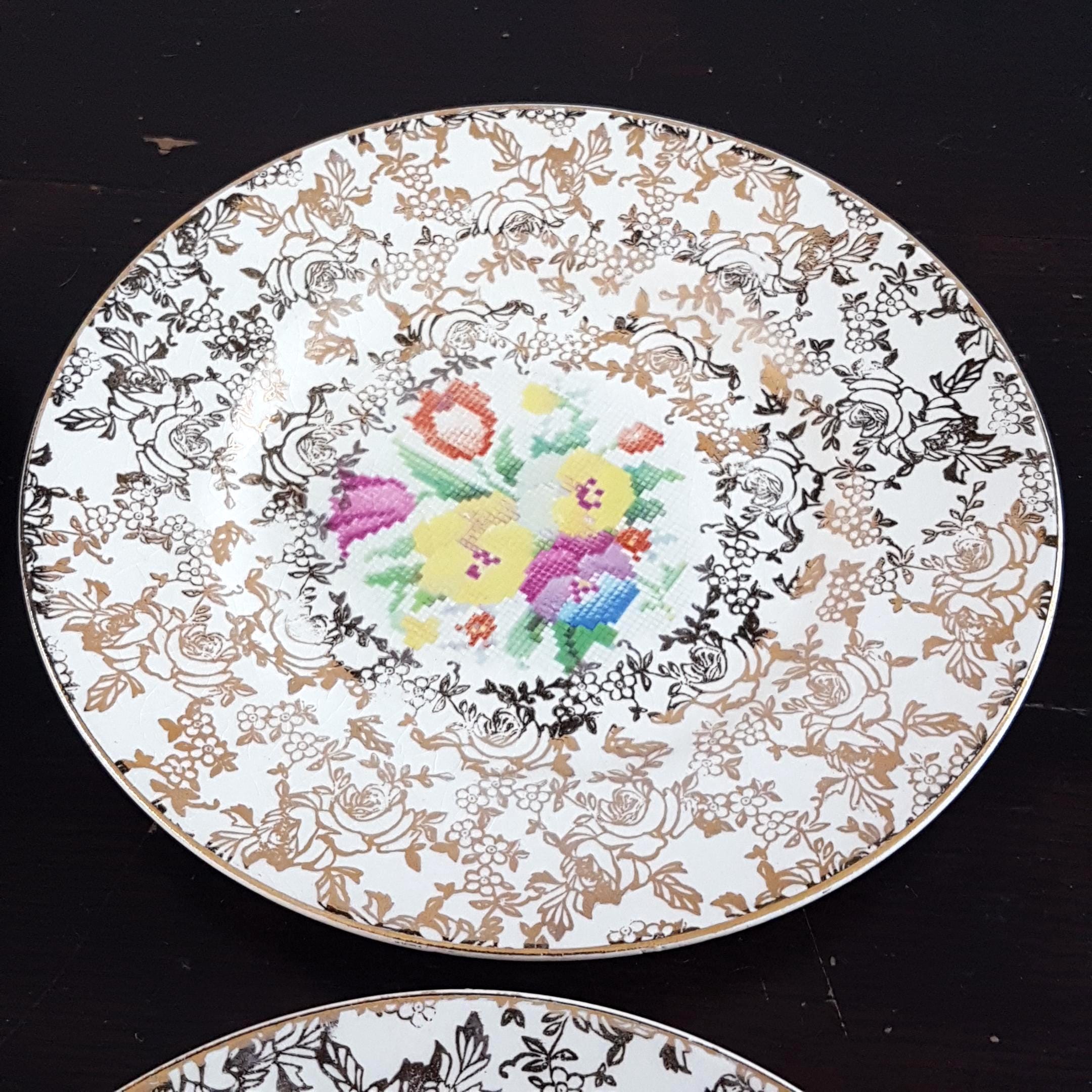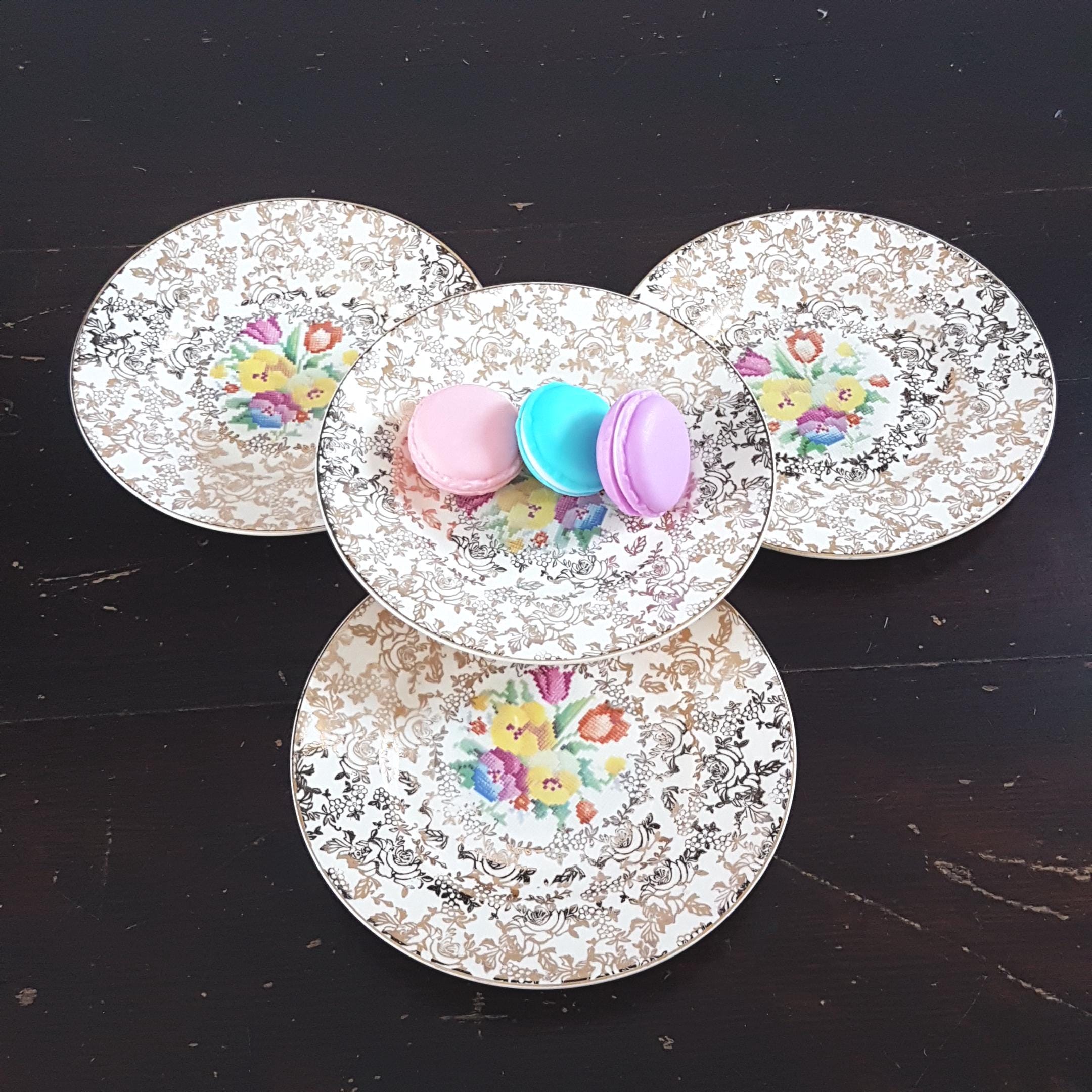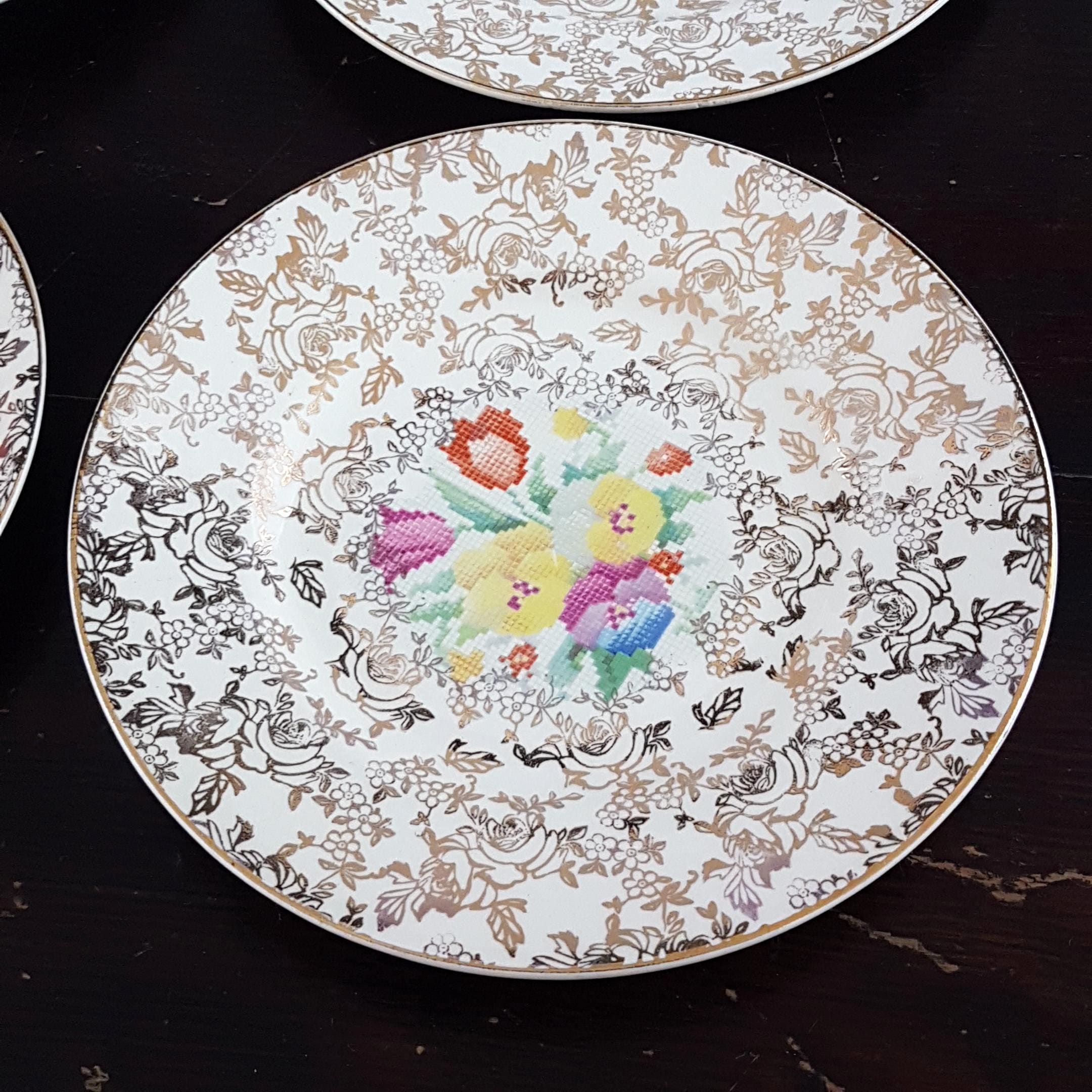 Set of 4 side plates by H &K Tunstall in OLD ENGLISH SAMPLER pattern. Center of plate has petit point, similar to a needlepoint or embroidered /cross stitch floral bouquet. Rest of plate face is hand decorated with gold floral chintz and gold edge.