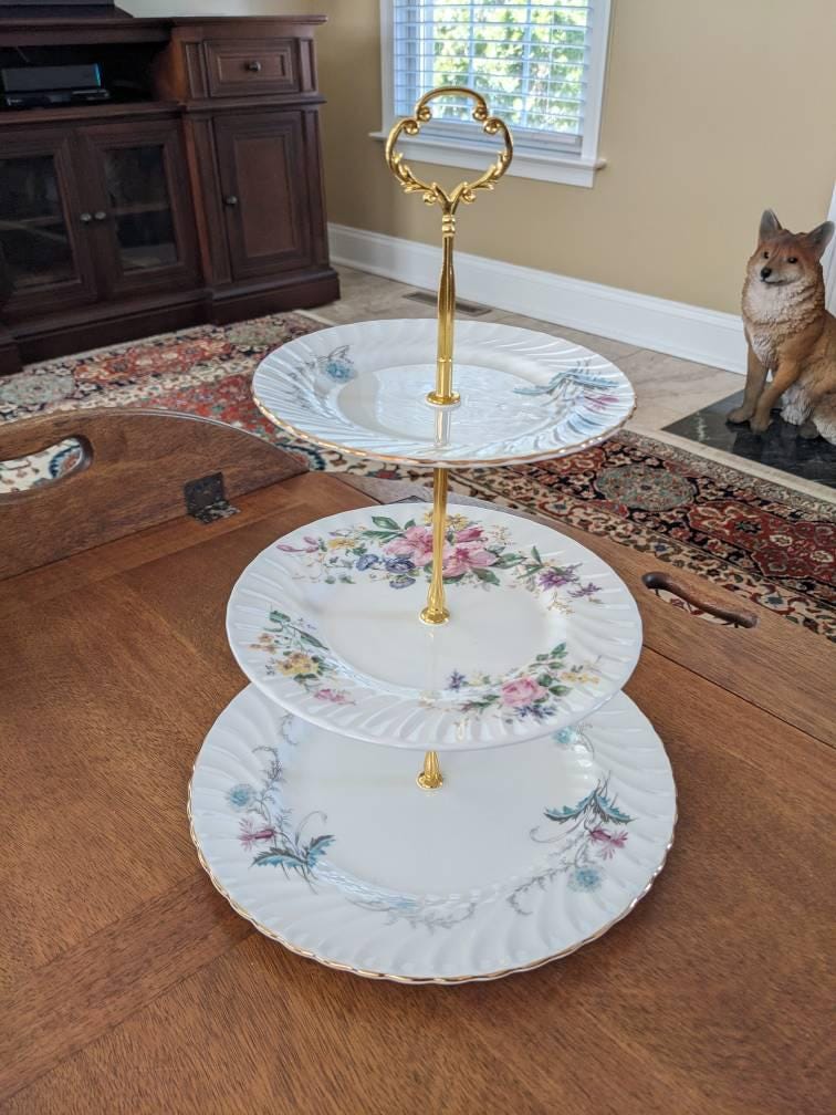 Three tier cake stand, made by me, using mismatched English bone china plates by Royal Albert & Aynsley. To complement the gold trim plates are paired with new gold tone hardware.