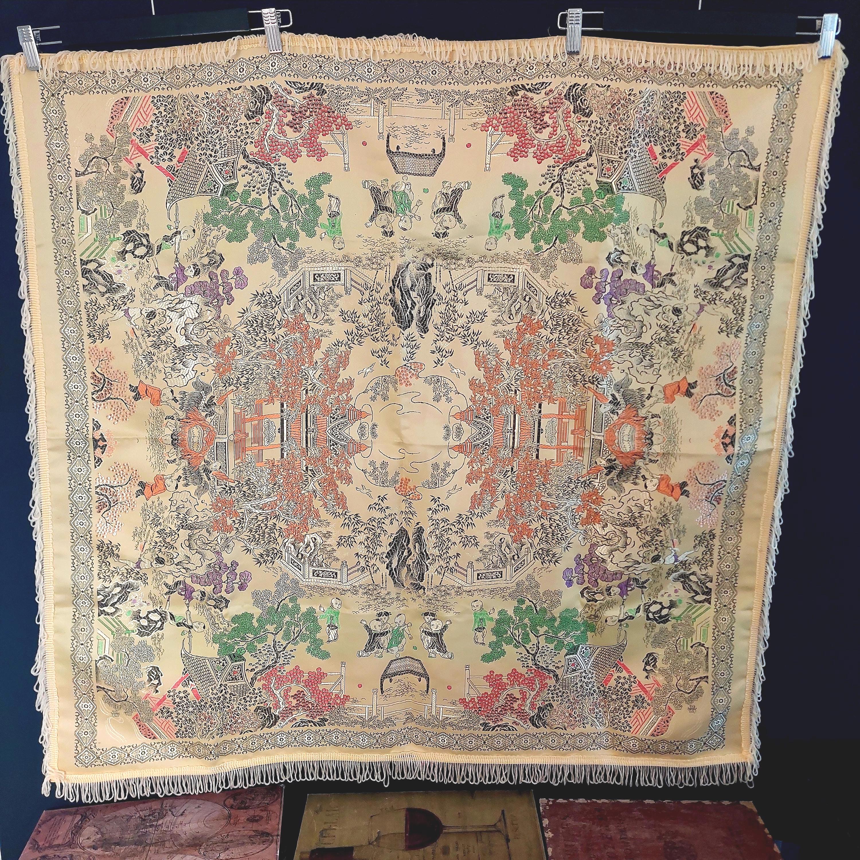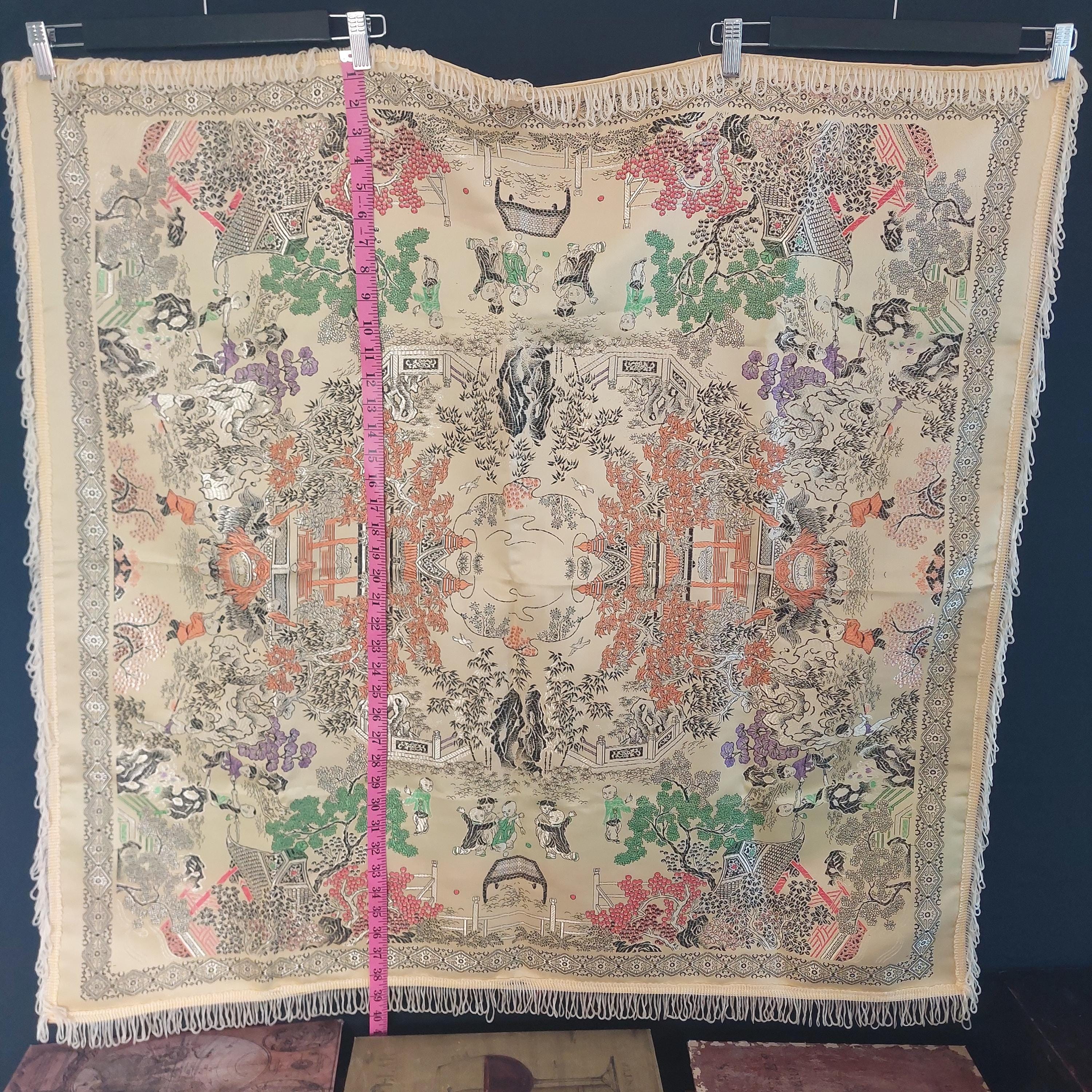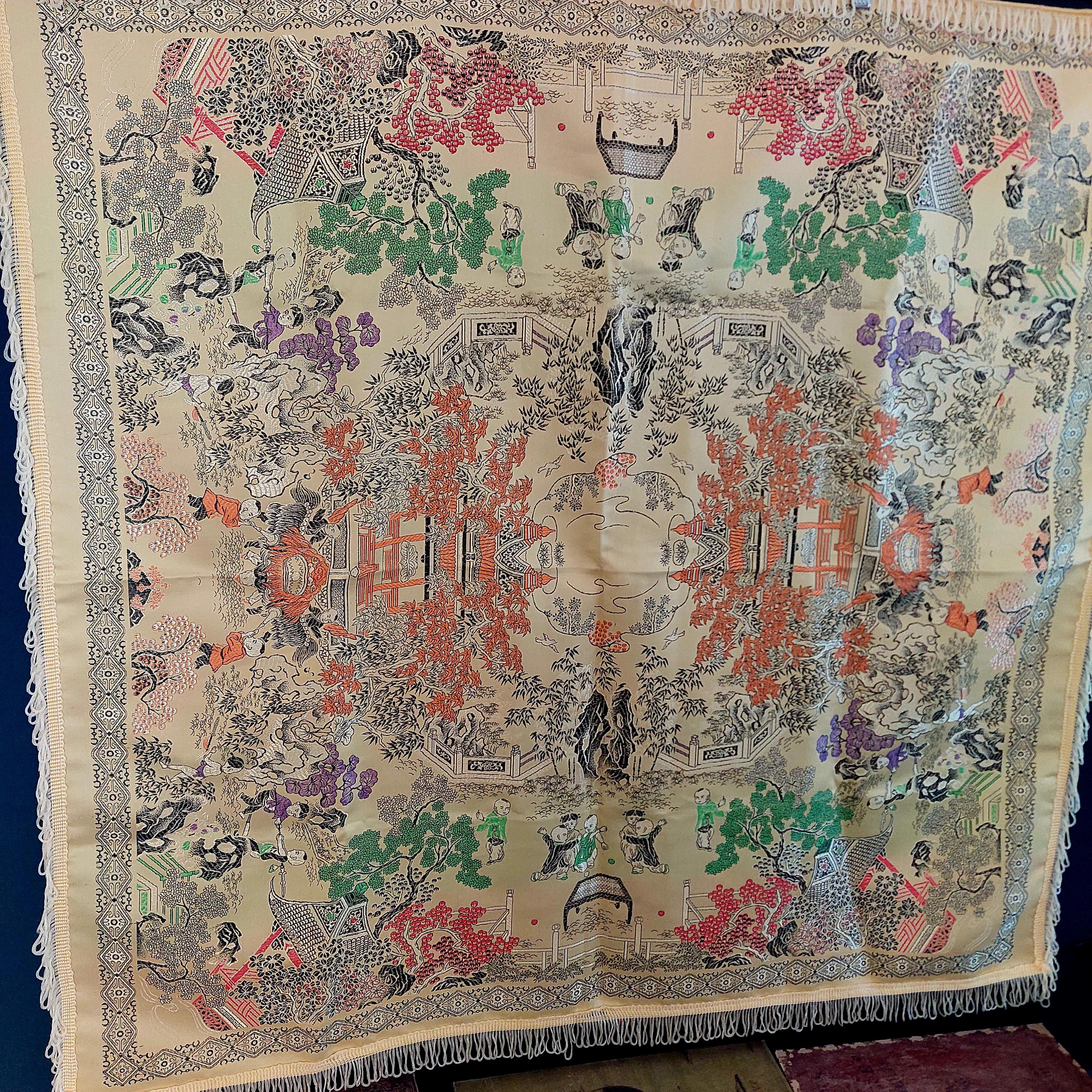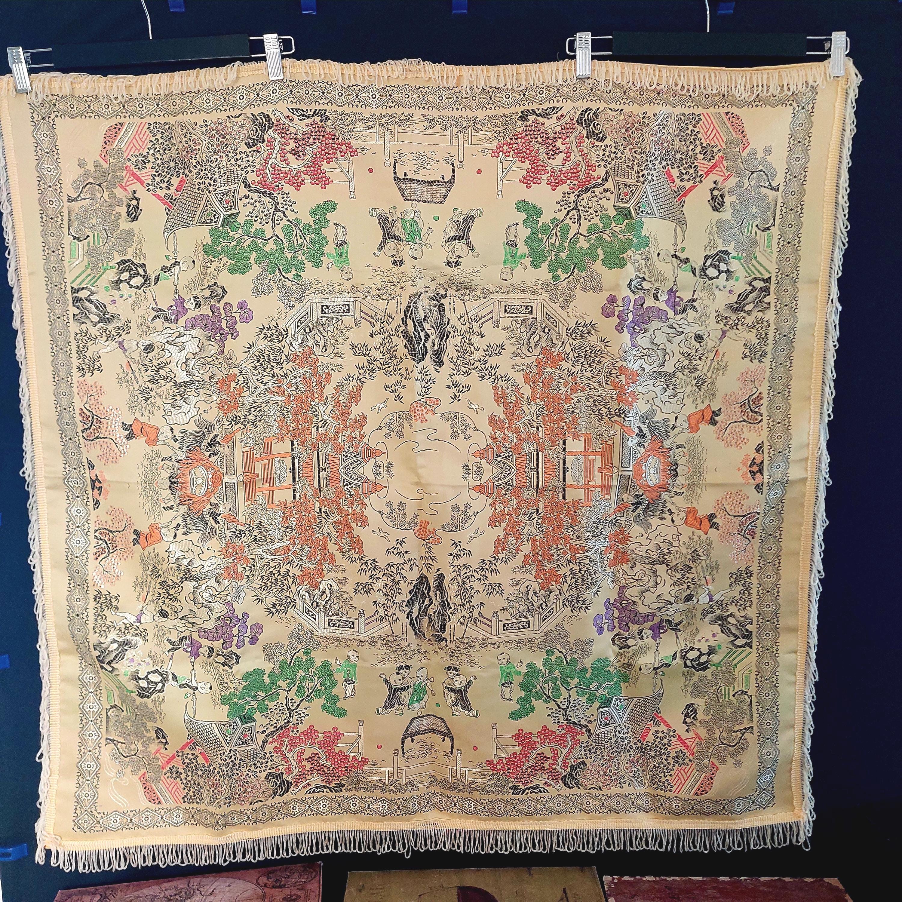 Vintage Asian reversible, square silk tablecloth with loop-style fringe.