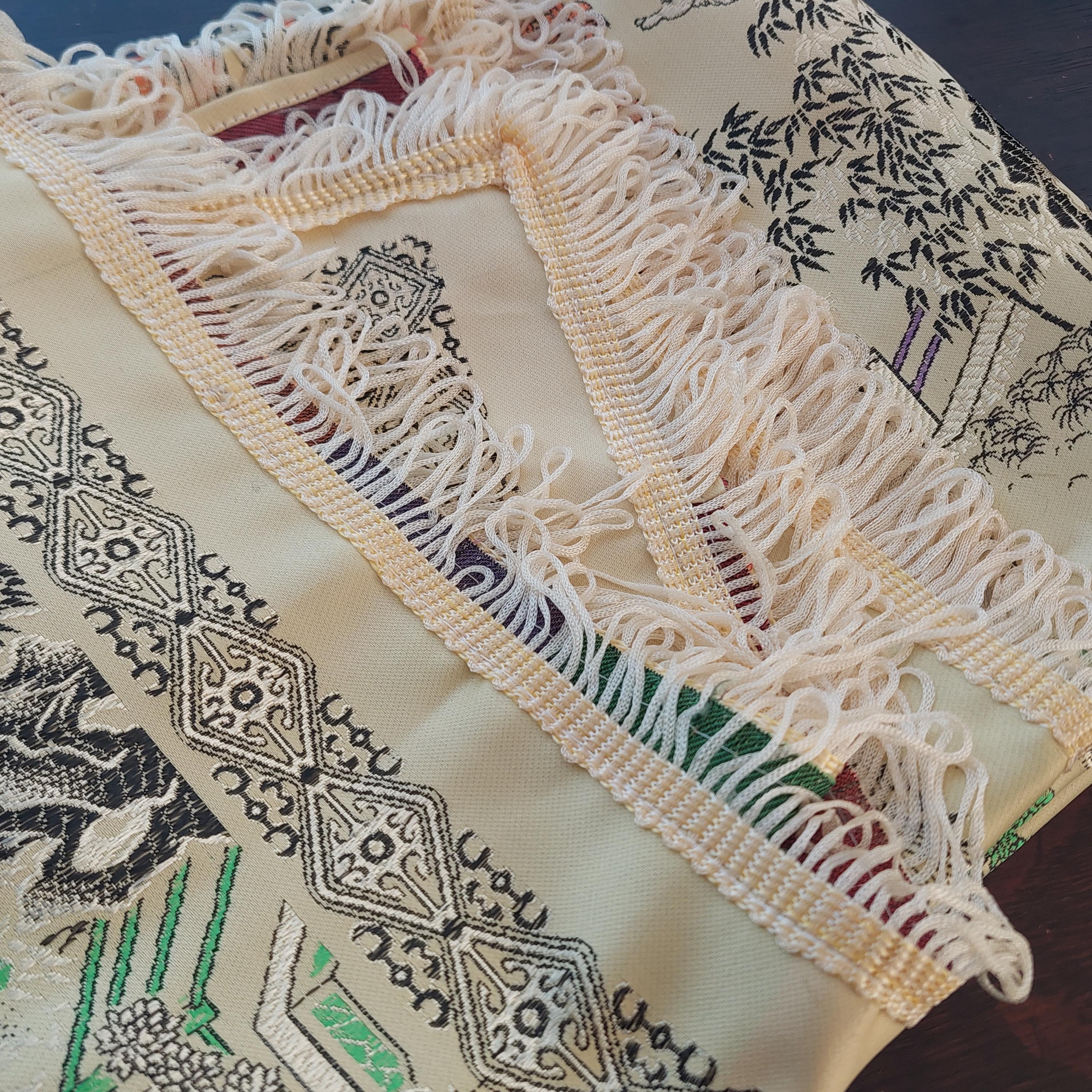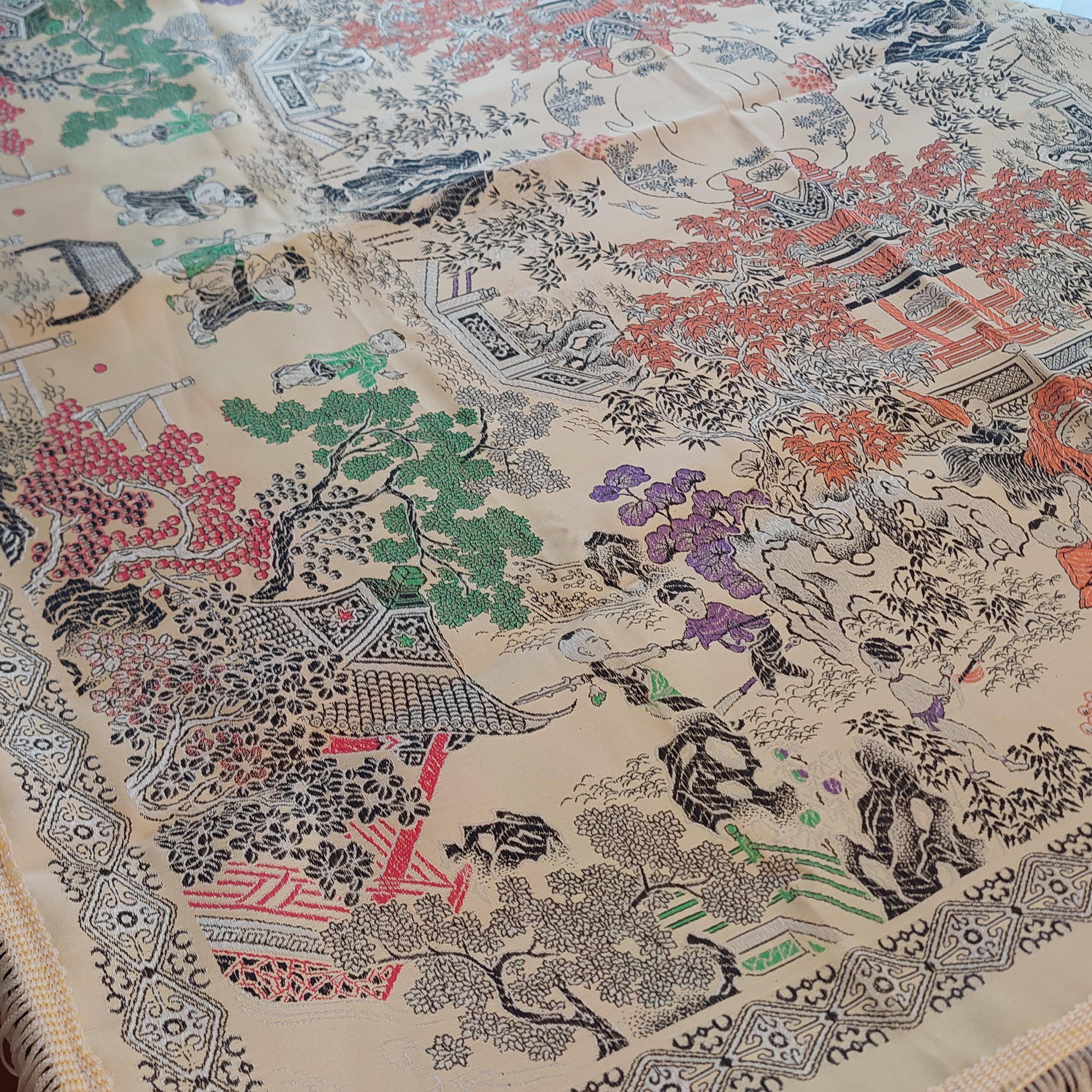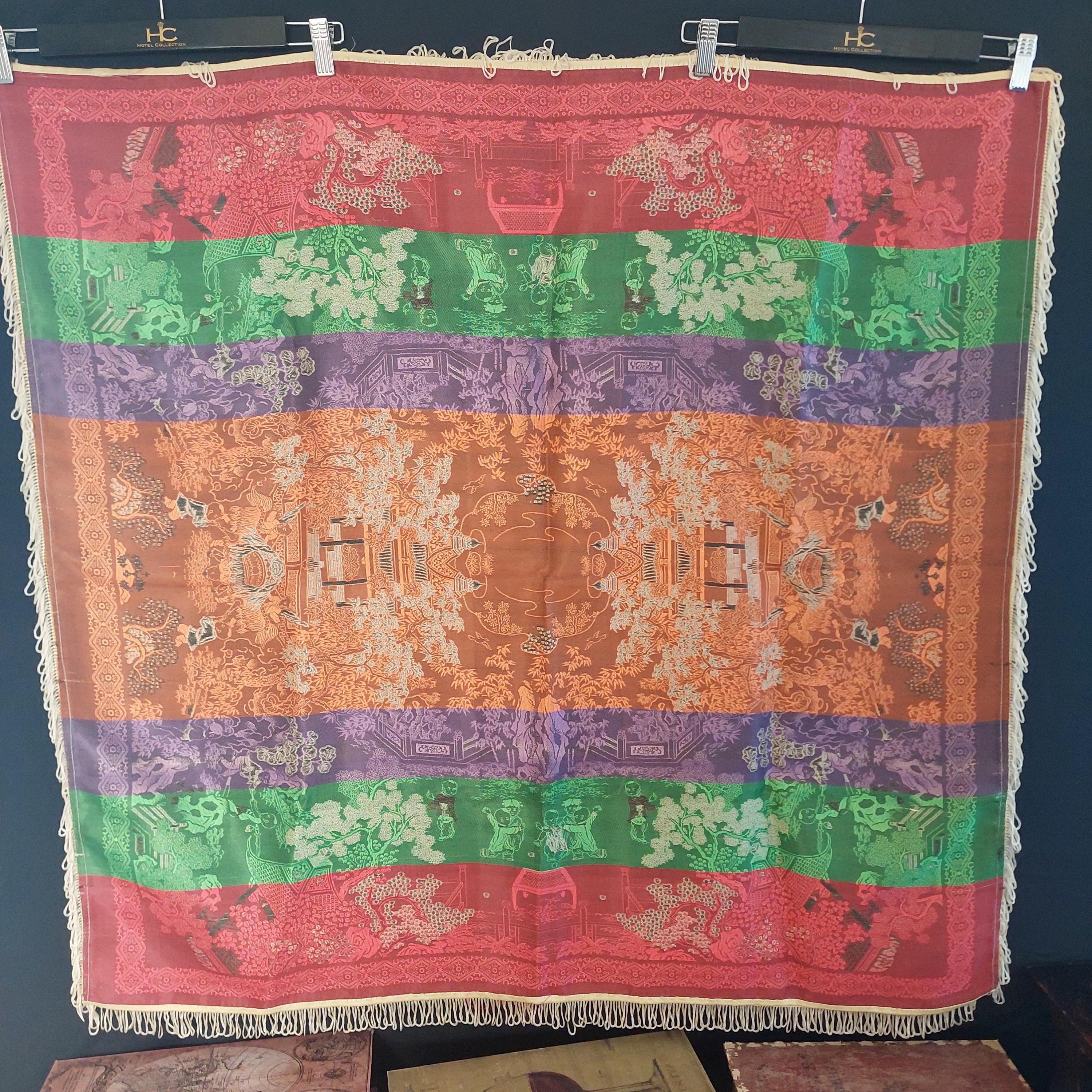 Vintage Asian reversible, square silk tablecloth with loop-style fringe.