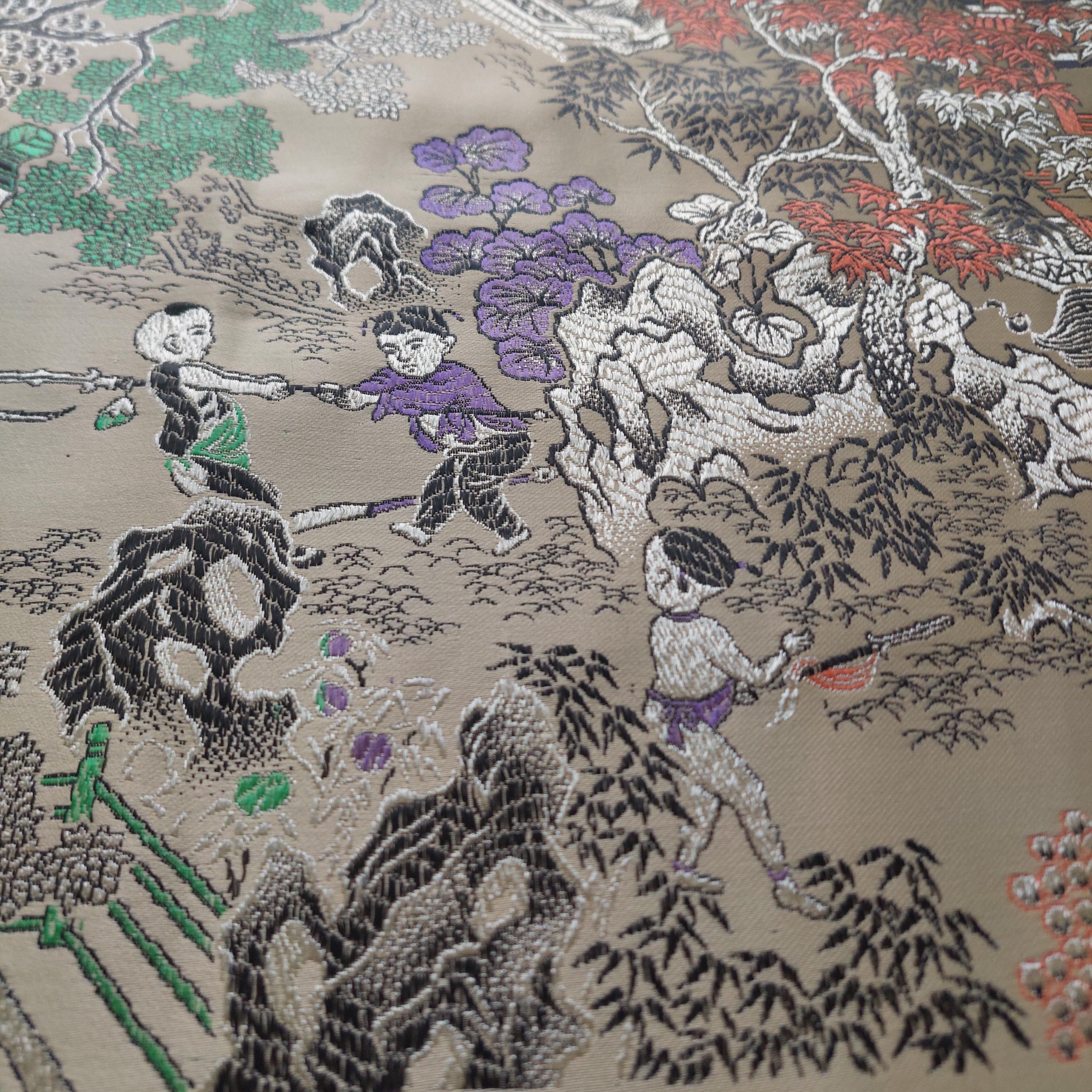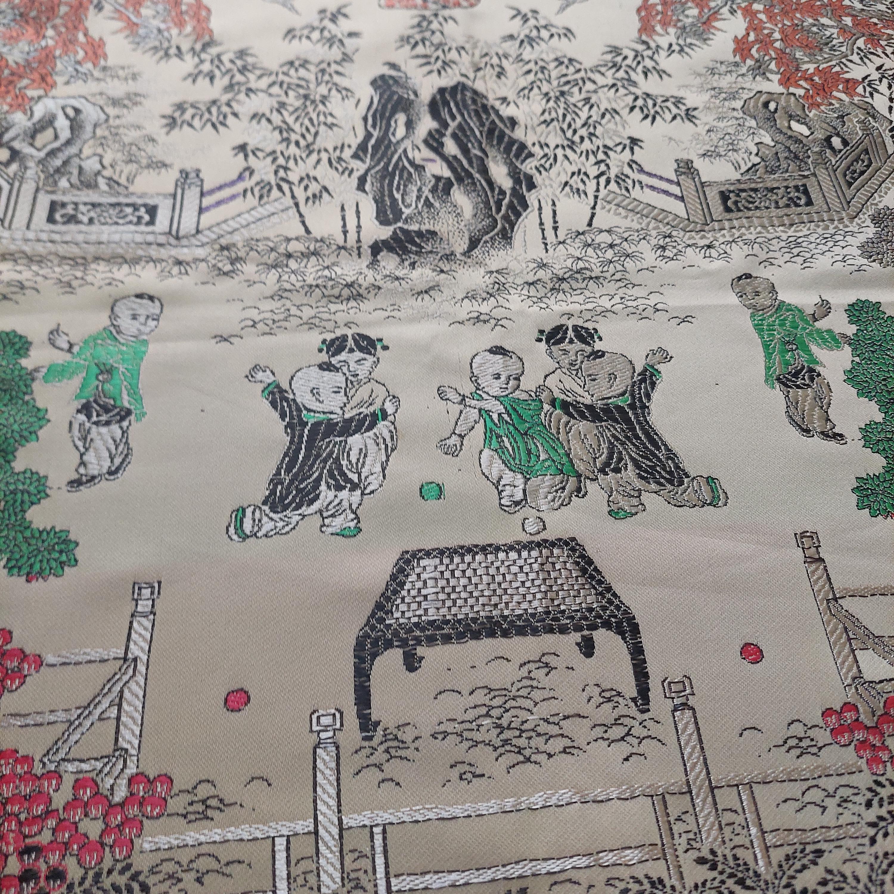 Double-sided fabric features various scenes of children playing, in green, orange, purple and red on a soft buttery yellow background.