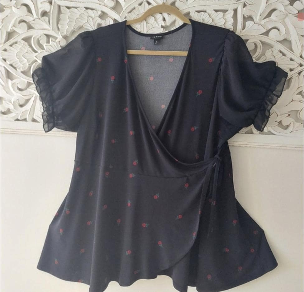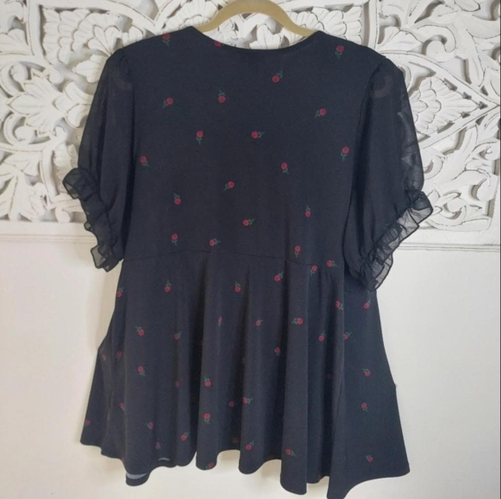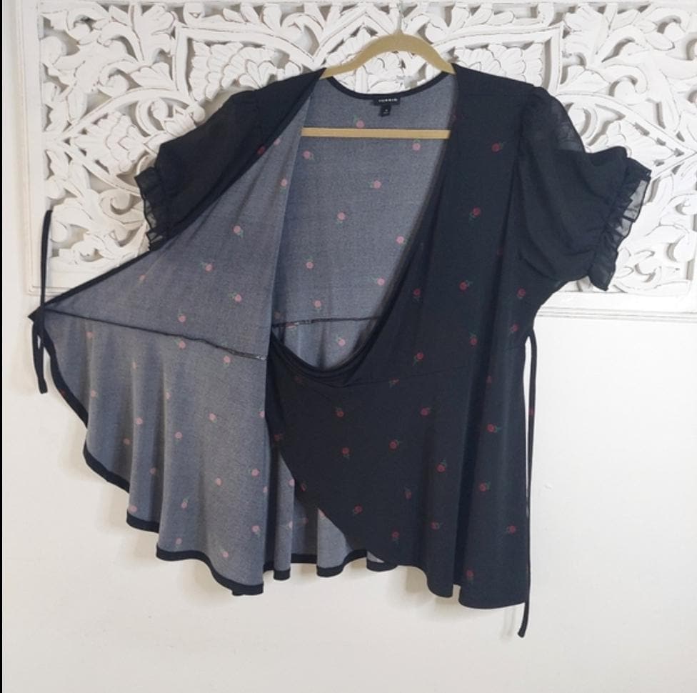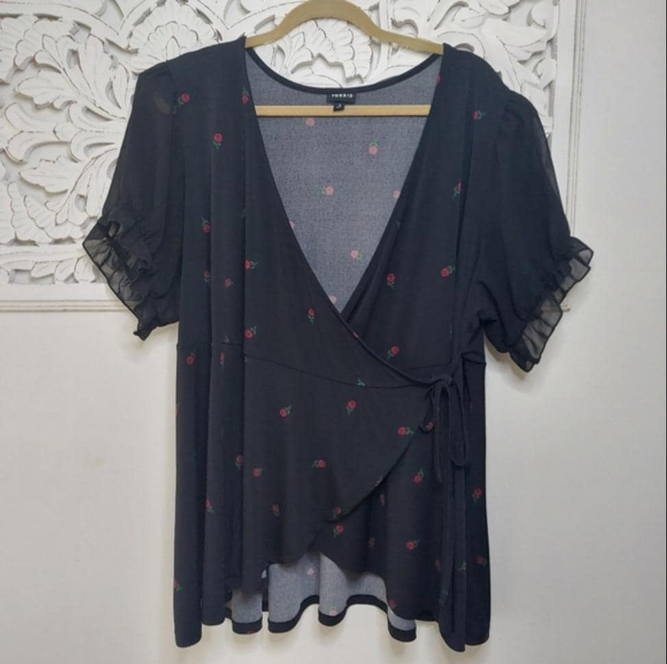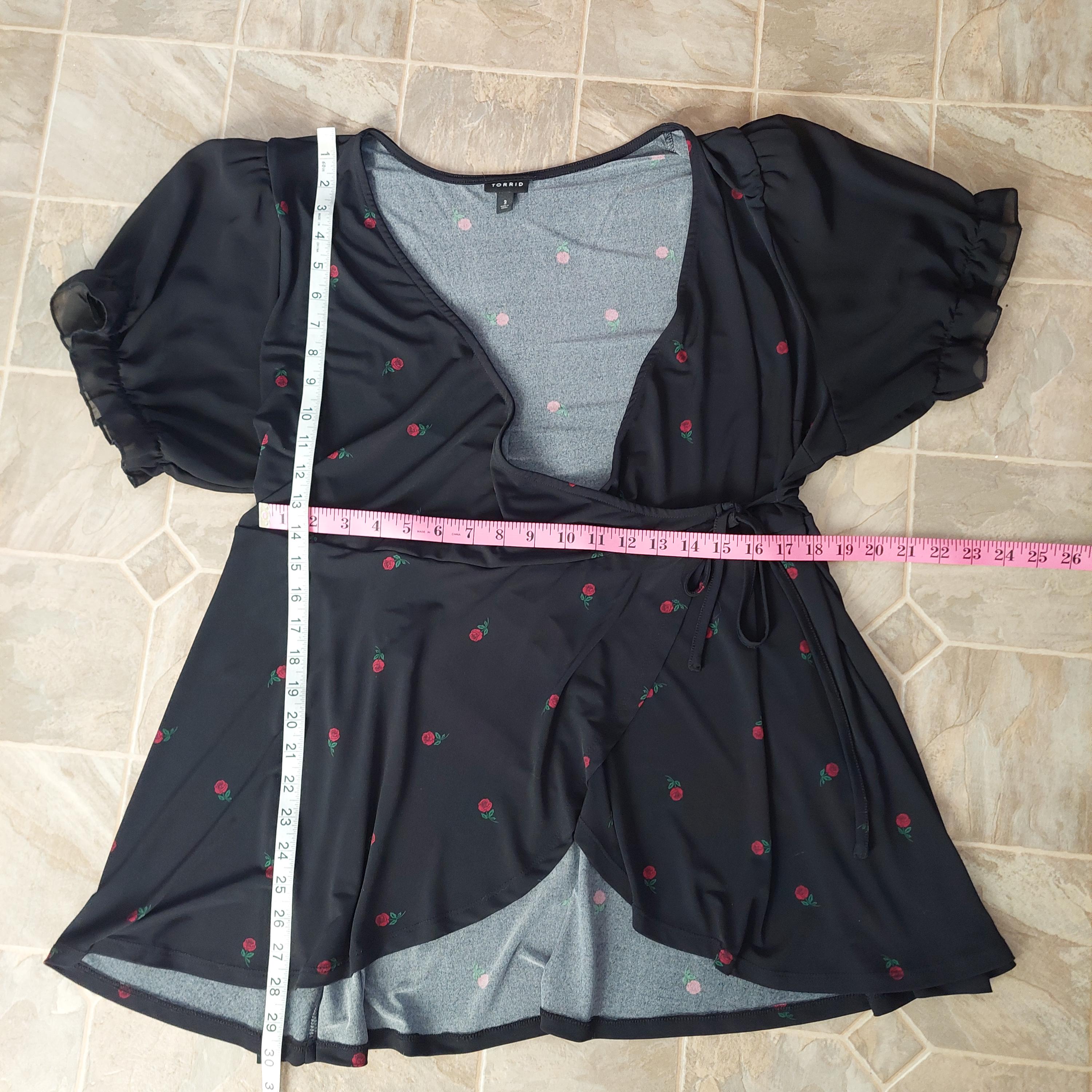 Vintage Torrid 3 black with red rose print surplice top. Easy wear & care. Pull over with a cross-over and single tie front. Feminine black chiffon short sleeves. Versatile - dress it up or wear as business casual to the office.