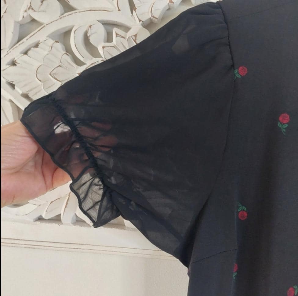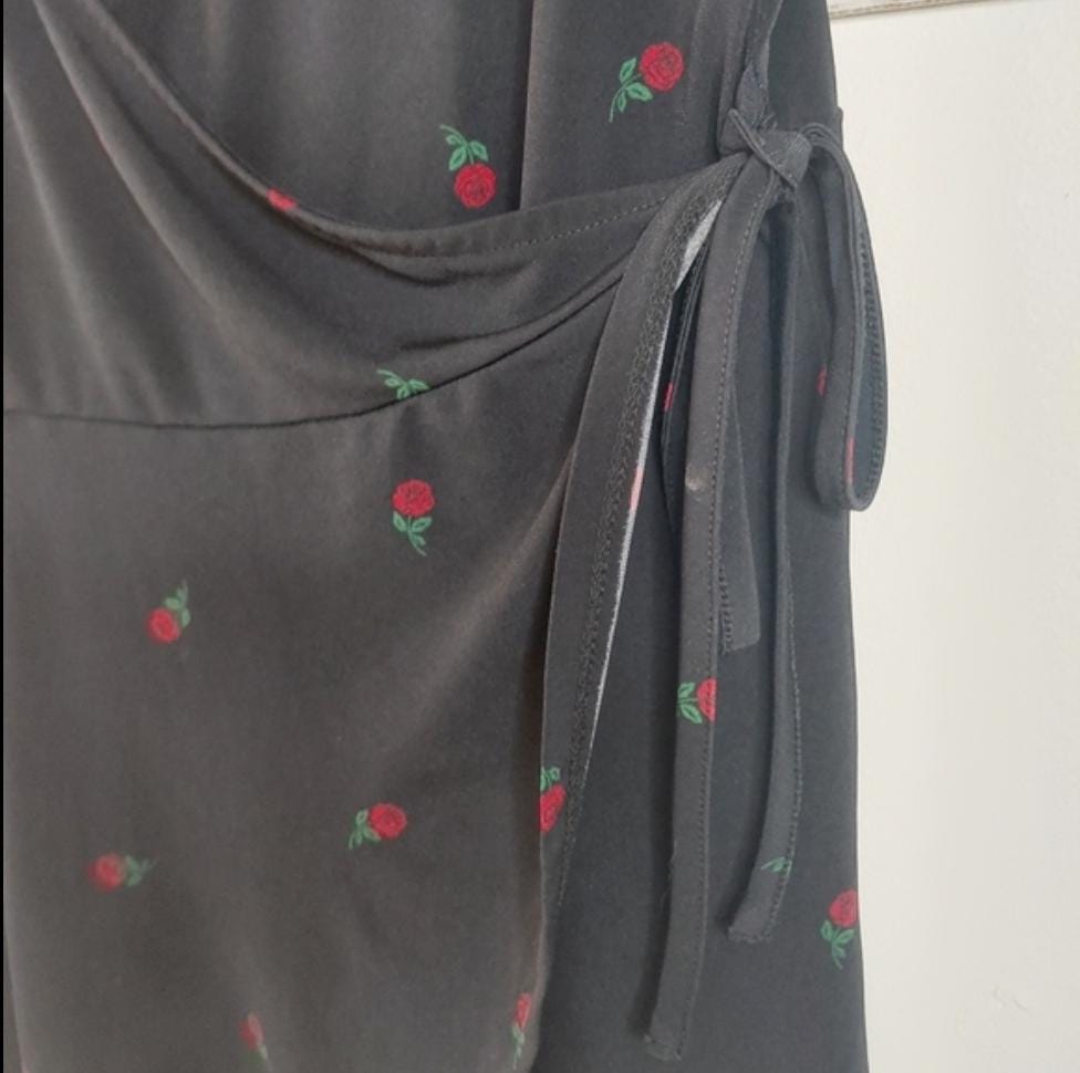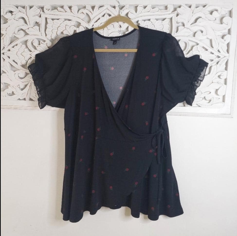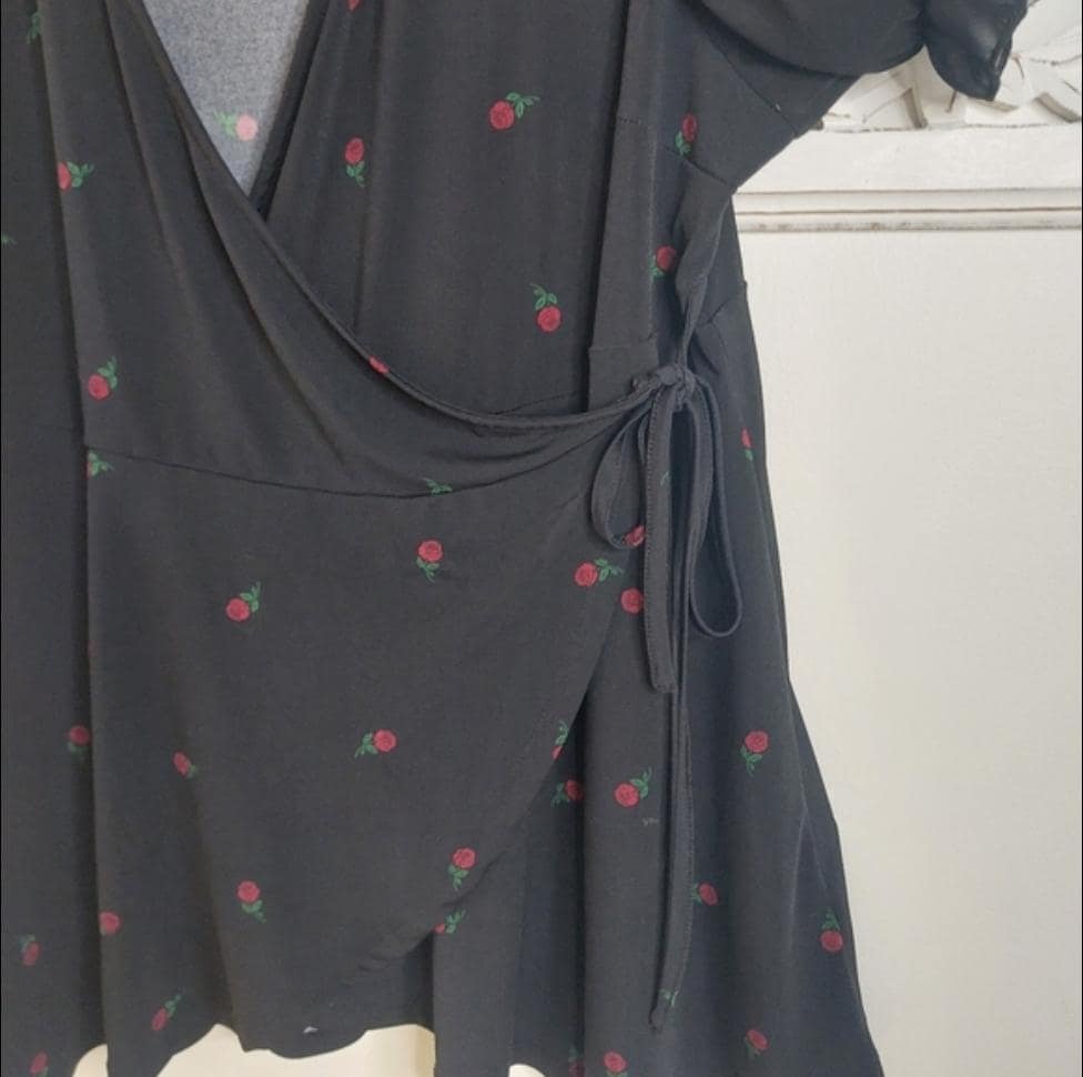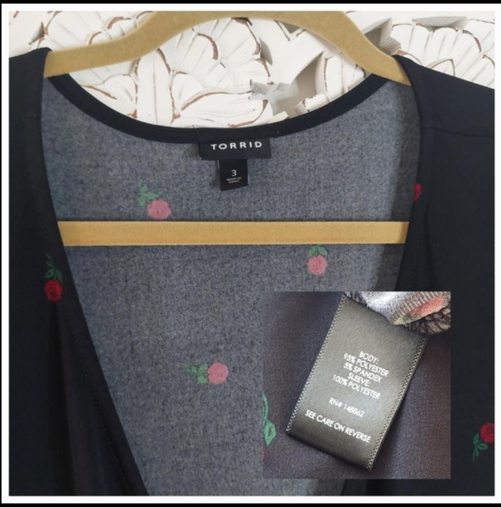 Vintage Torrid 3 black with red rose print surplice top. Easy wear & care. Pull over with a cross-over and single tie front. Feminine black chiffon short sleeves. Versatile - dress it up or wear as business casual to the office.