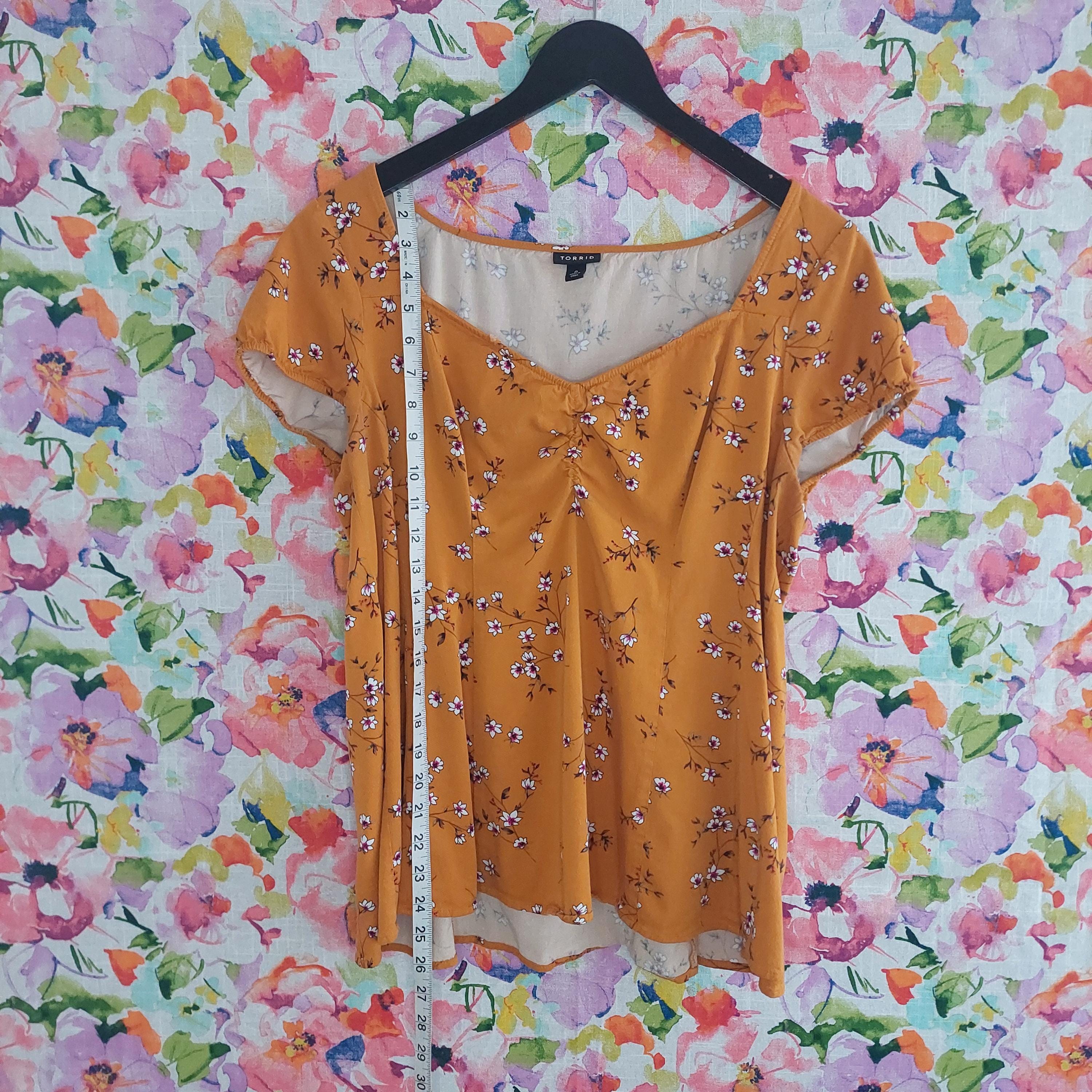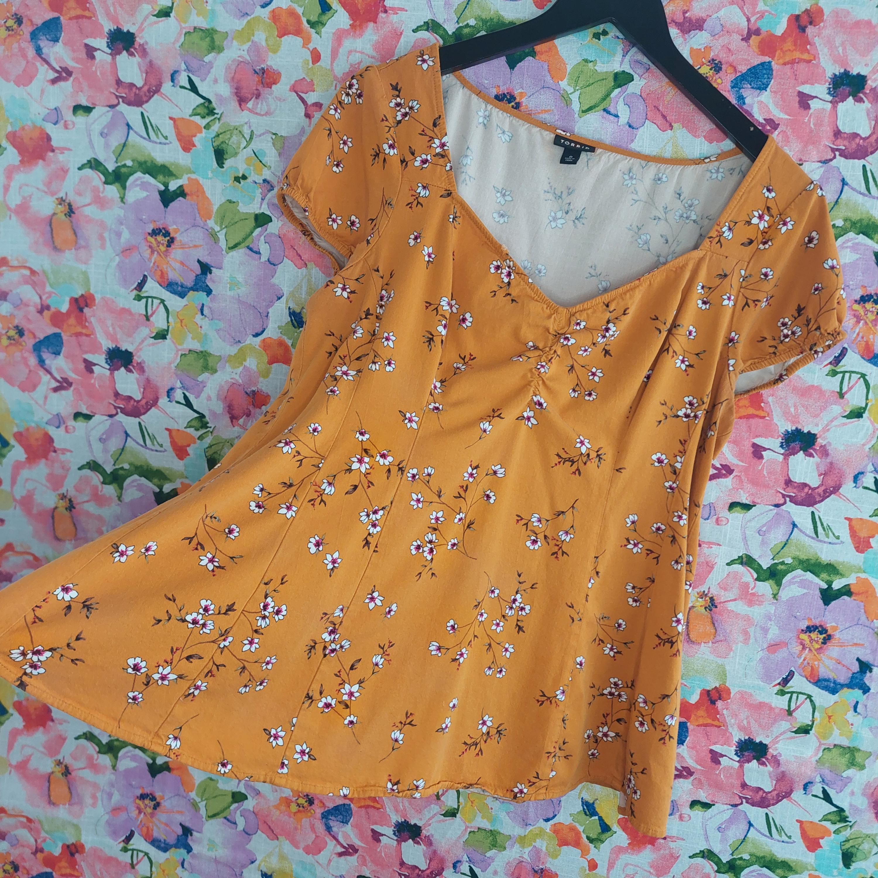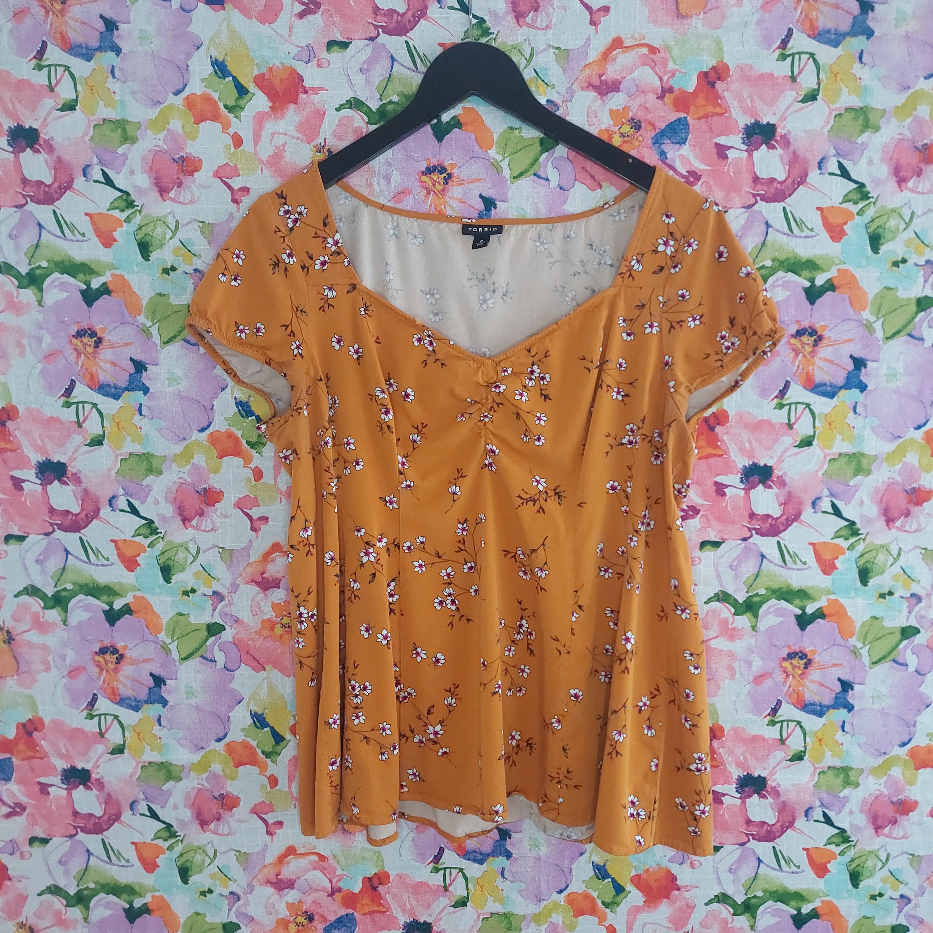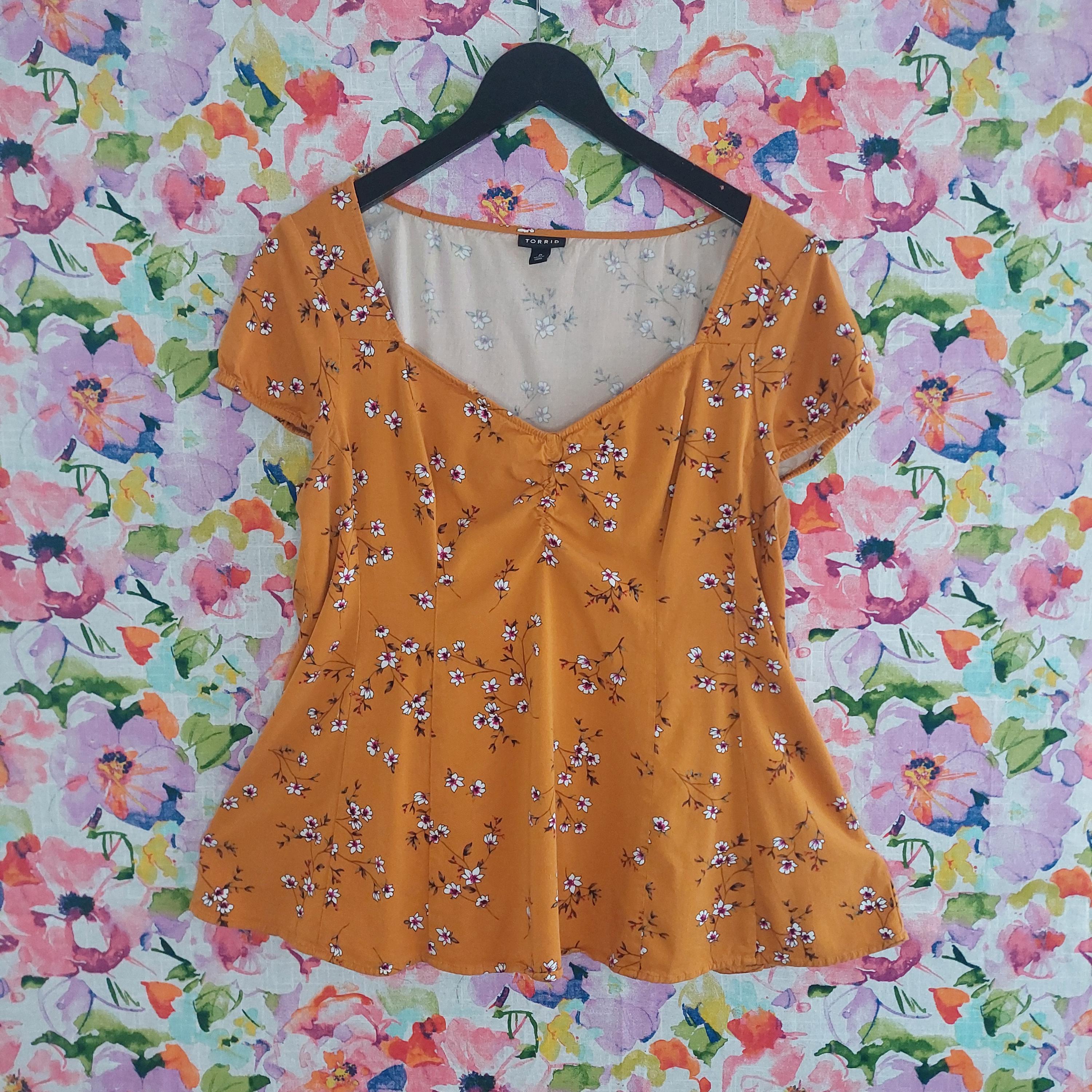 Vintage Torrid golden orange with white & pink florals. Elastic edged short sleeves.