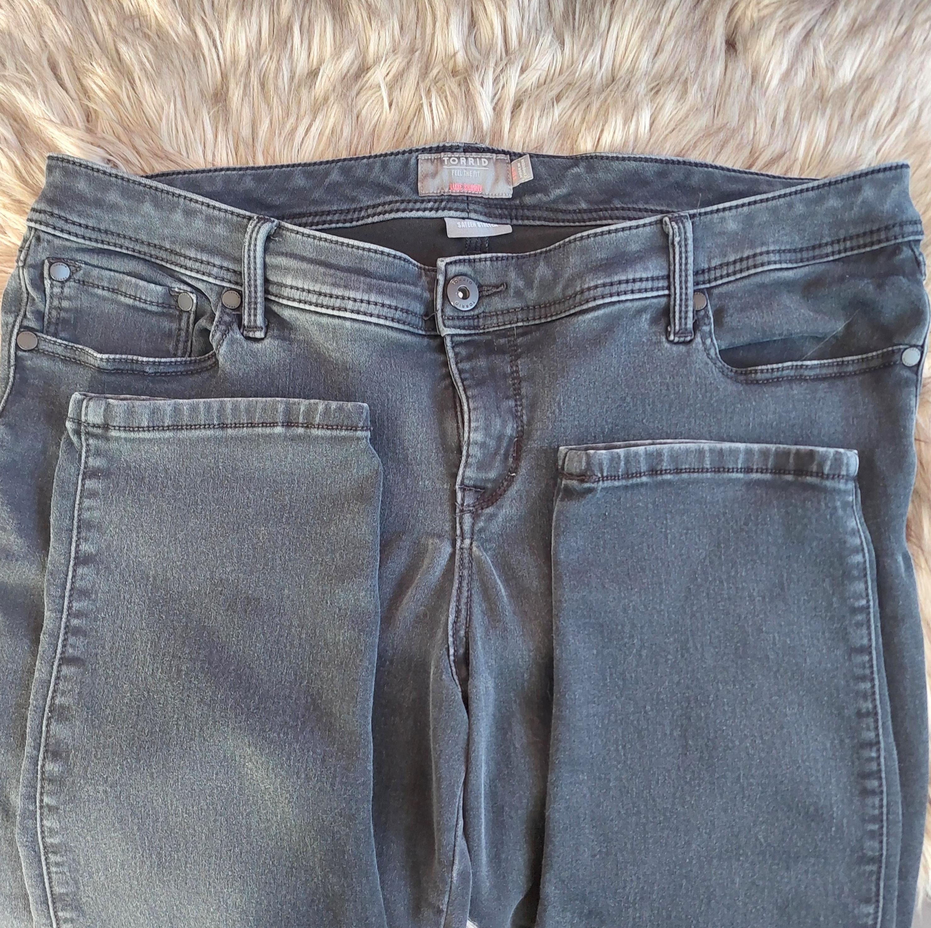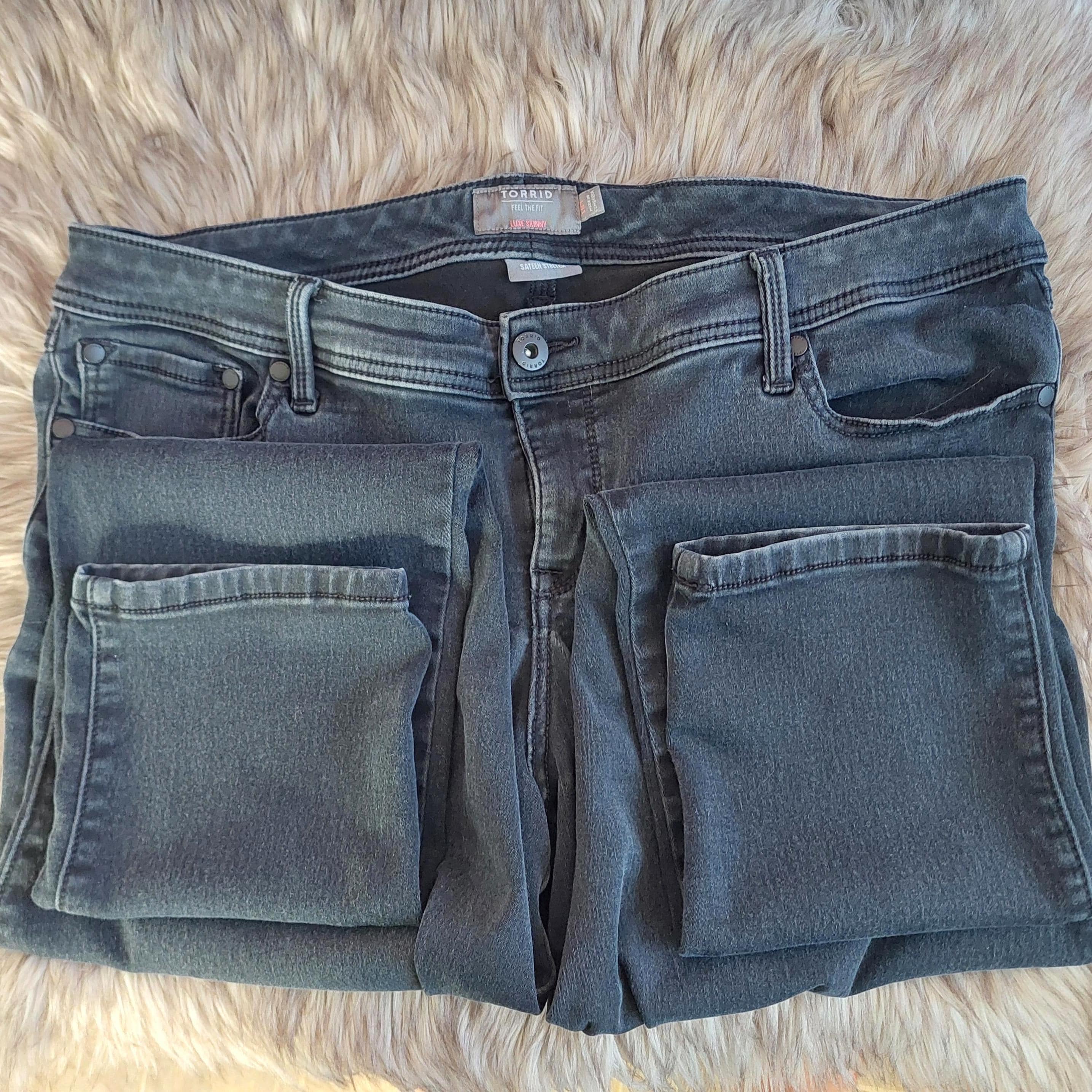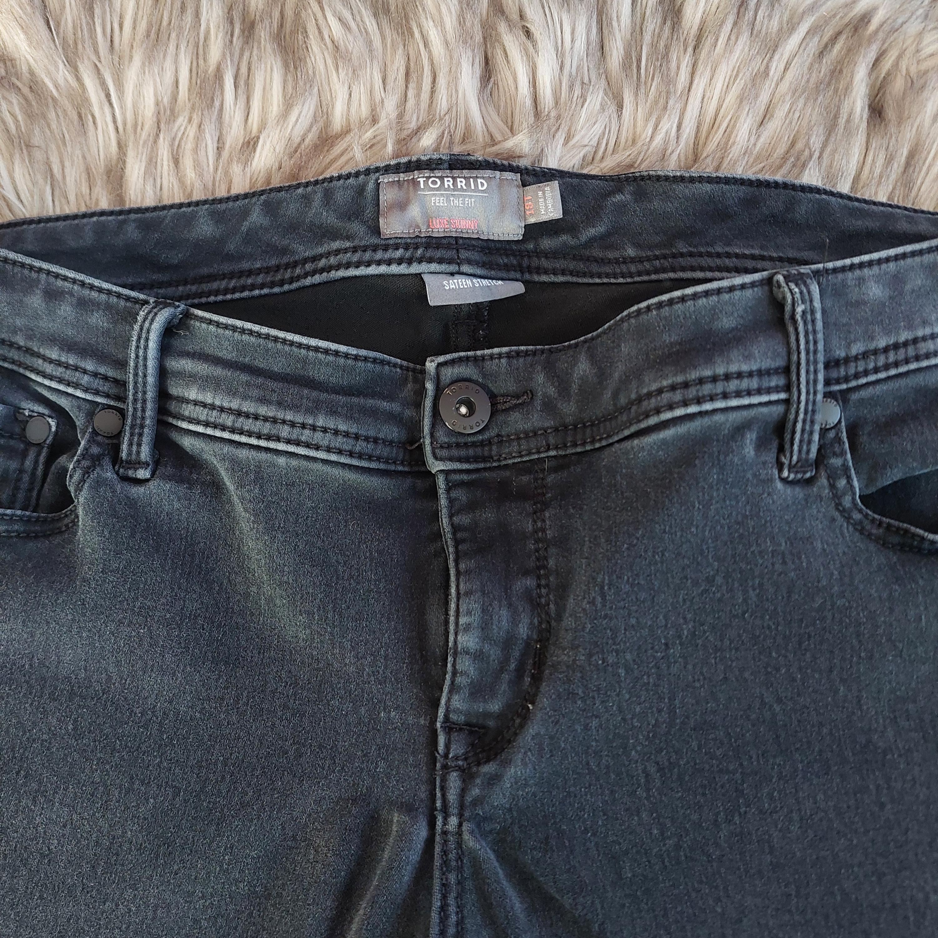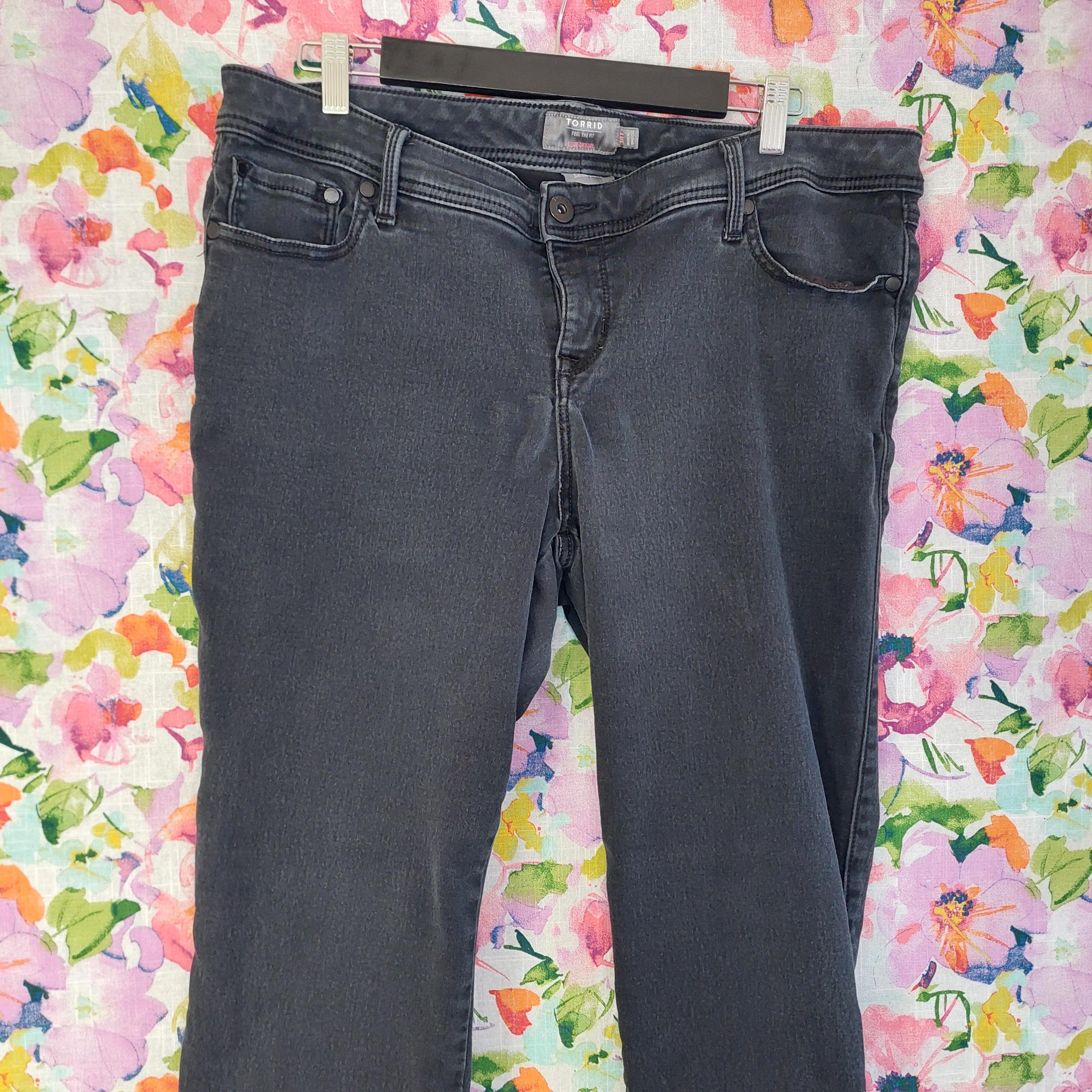 Vintage Torrid Feel The Fit, luxe skinny, sateen stretch, light wash black jeans.
