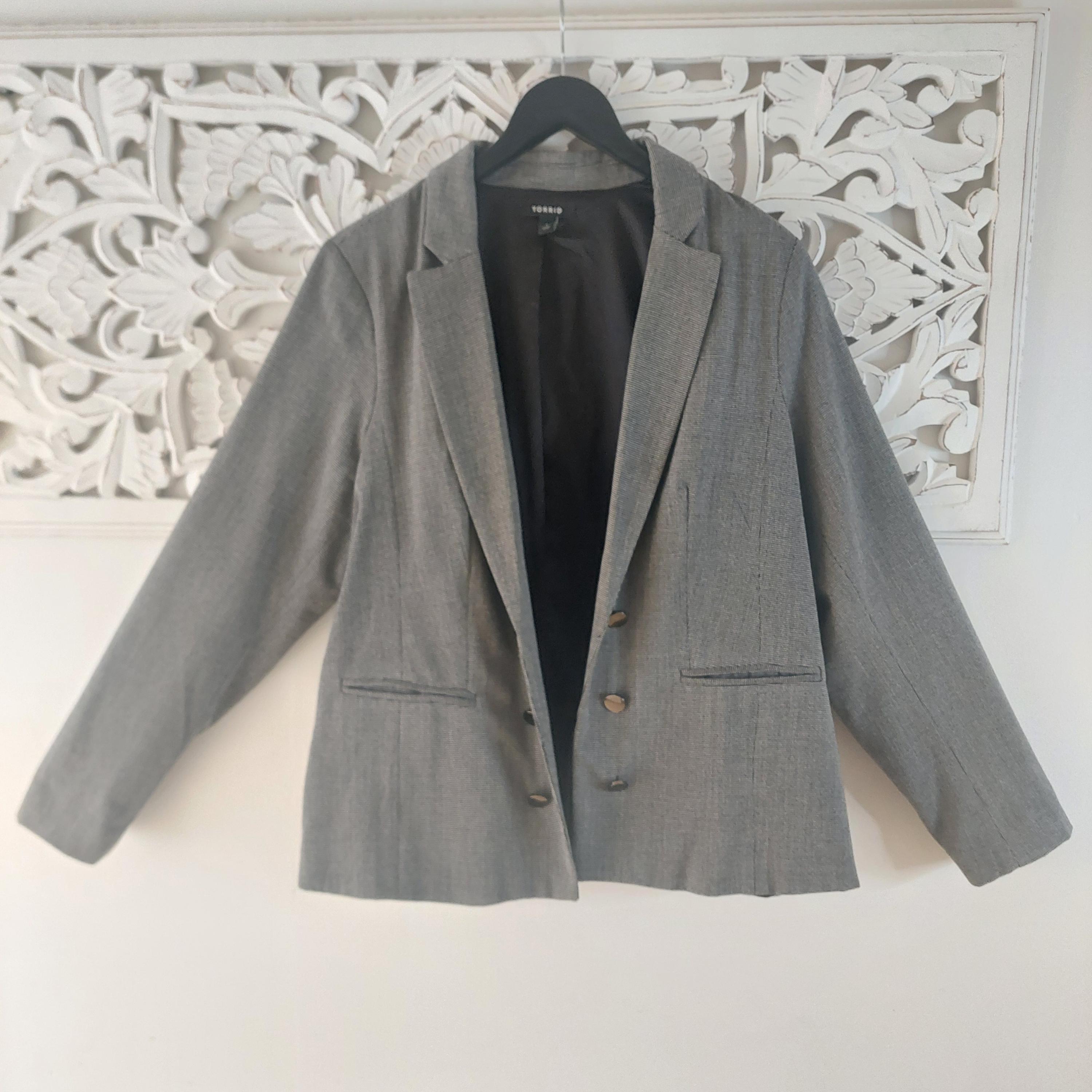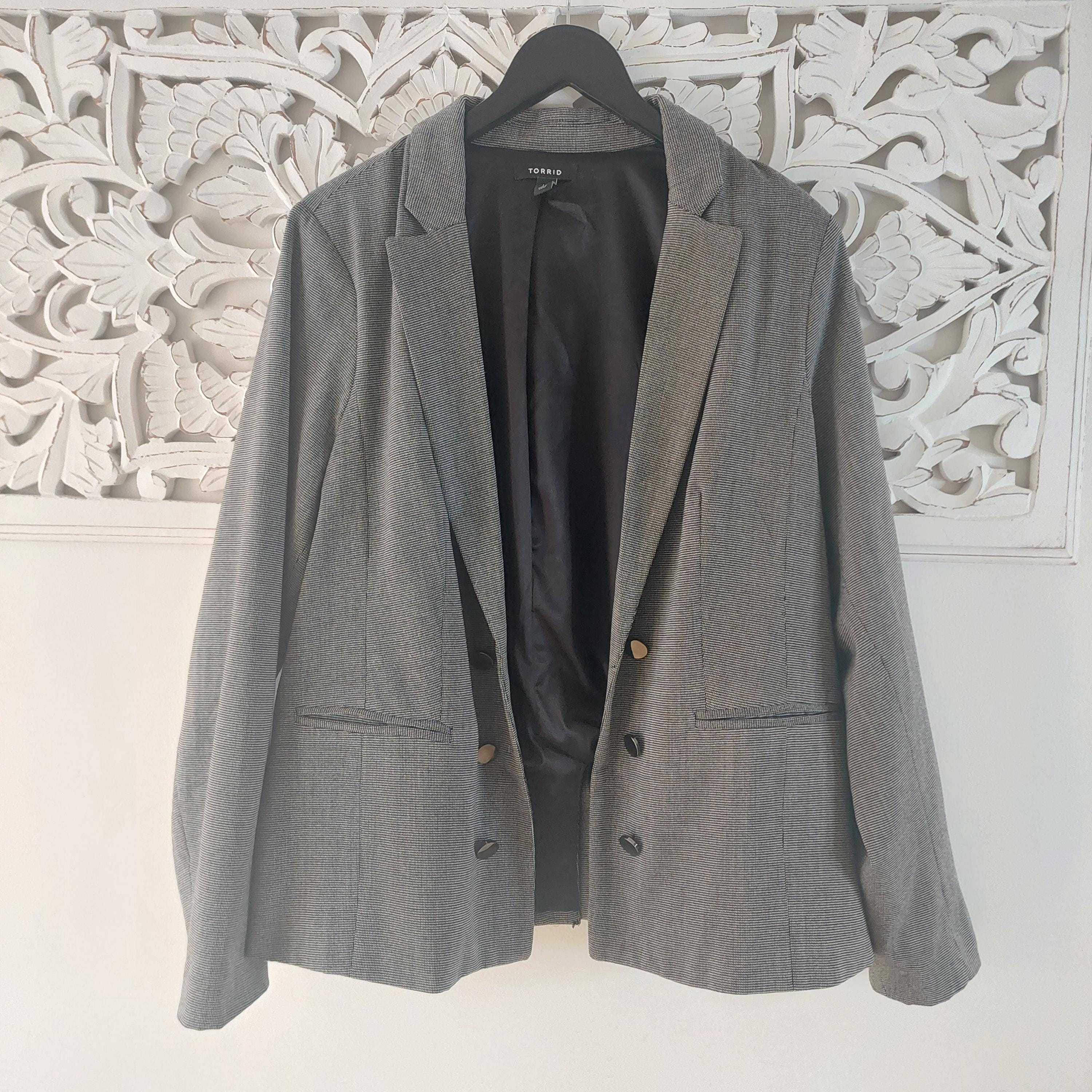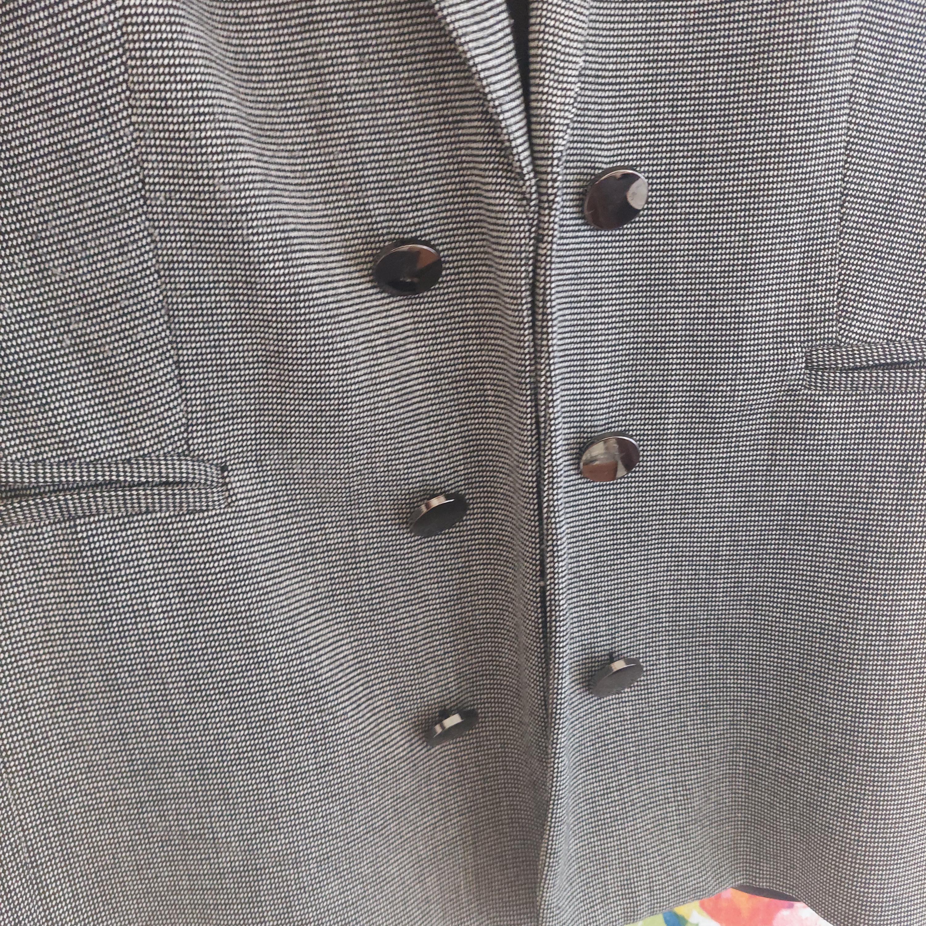 Textured tweed fabric, notched collar with faux double-breasted open front & silver-toned buttons for detail.