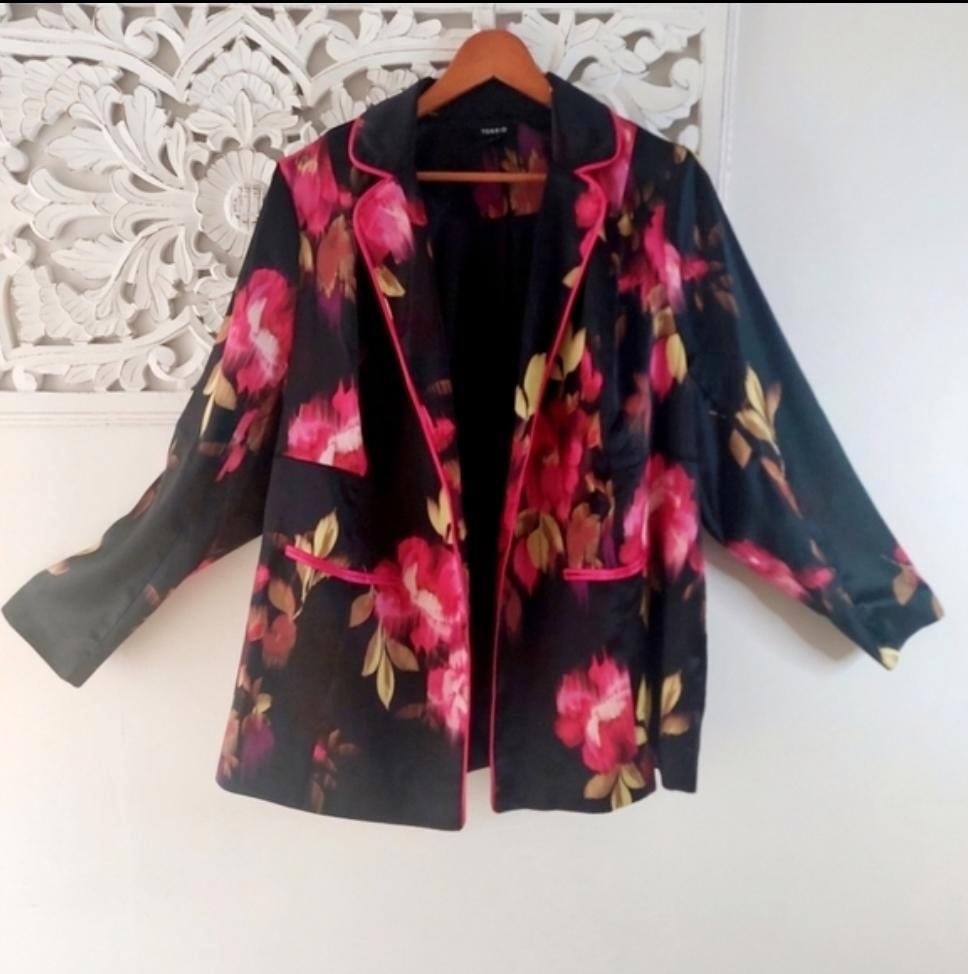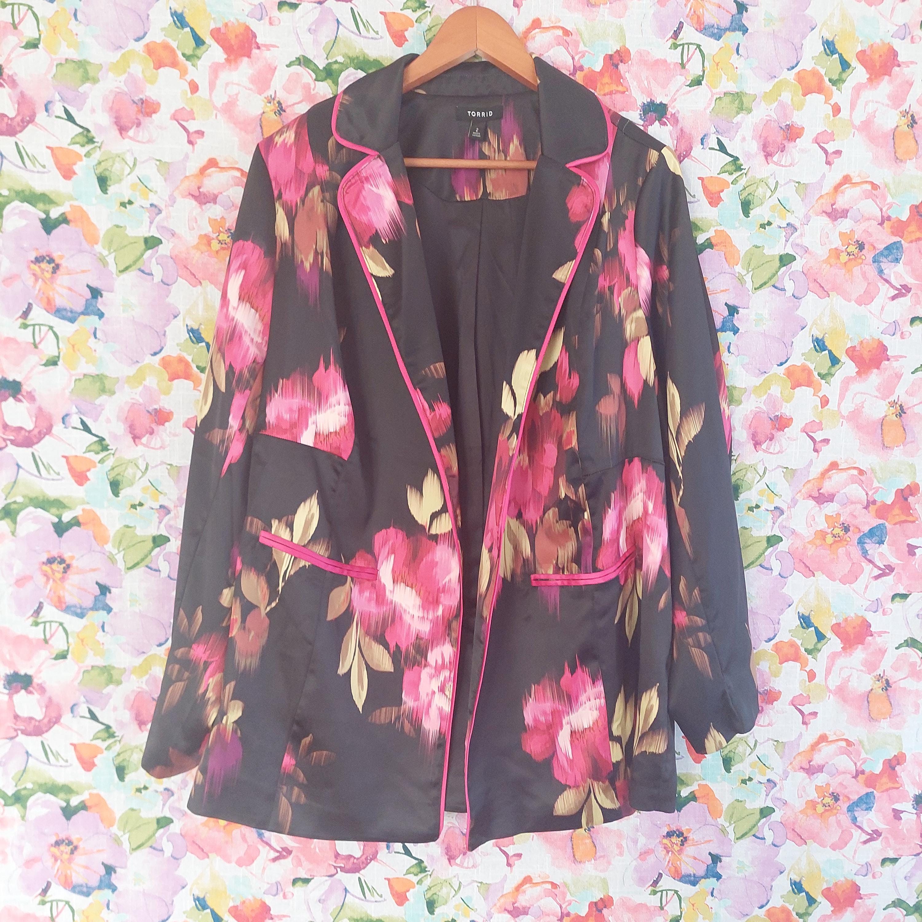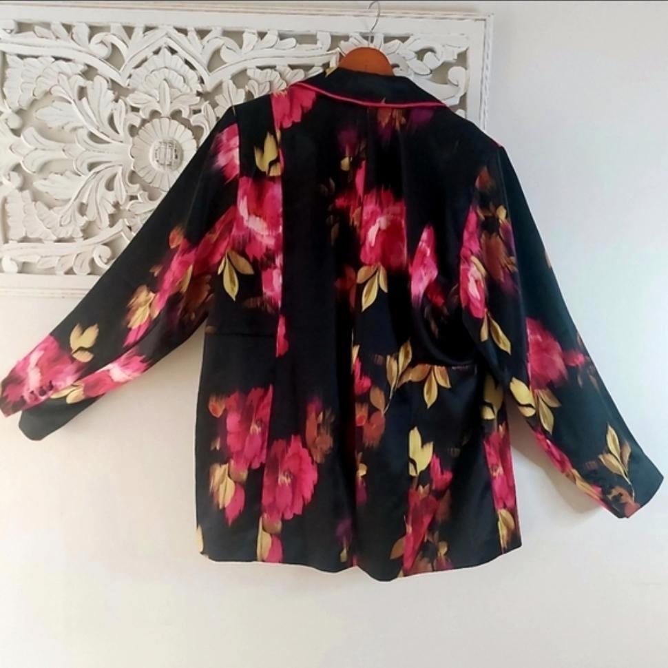 Vintage satin woven soft, silky blazer with colorful print floral pattern.