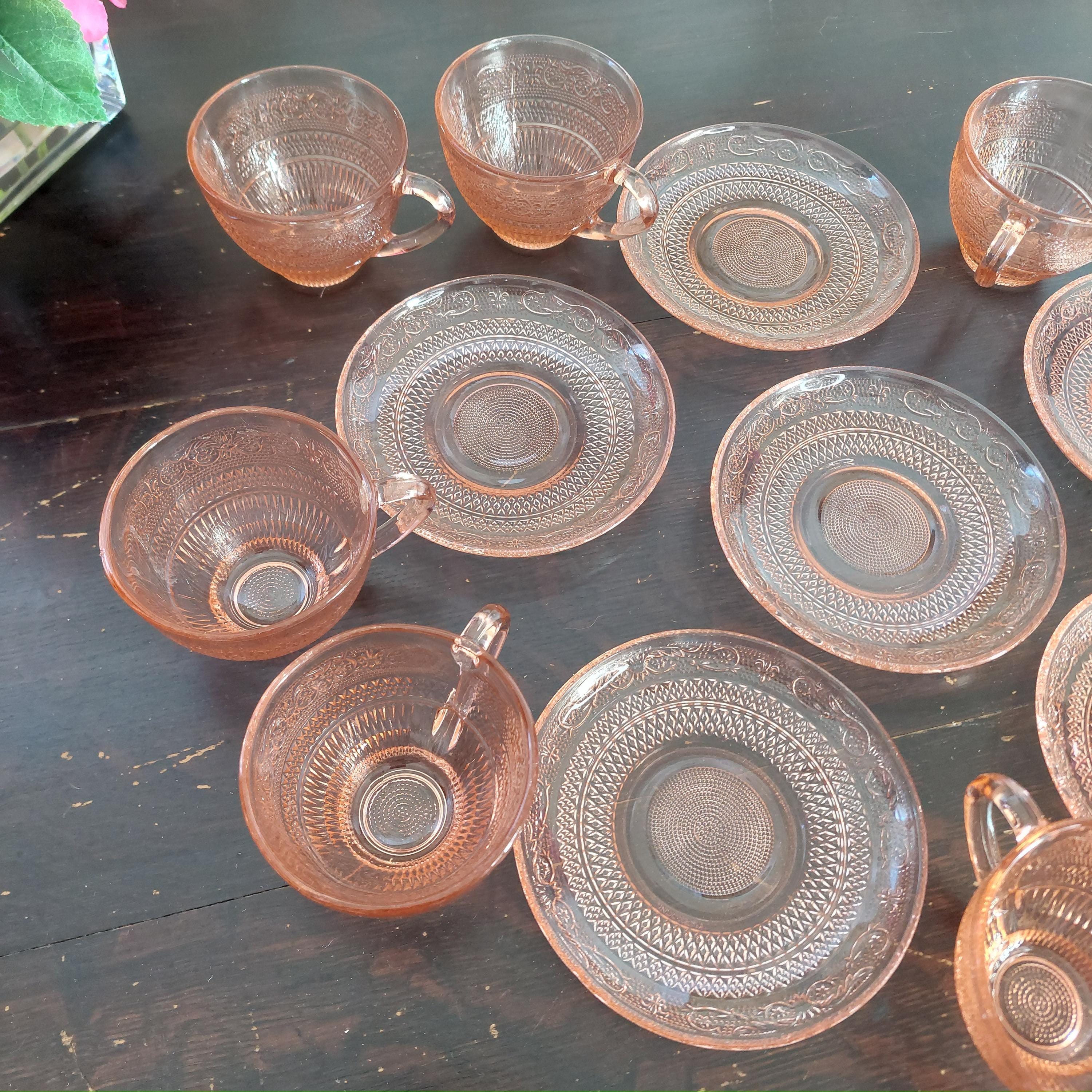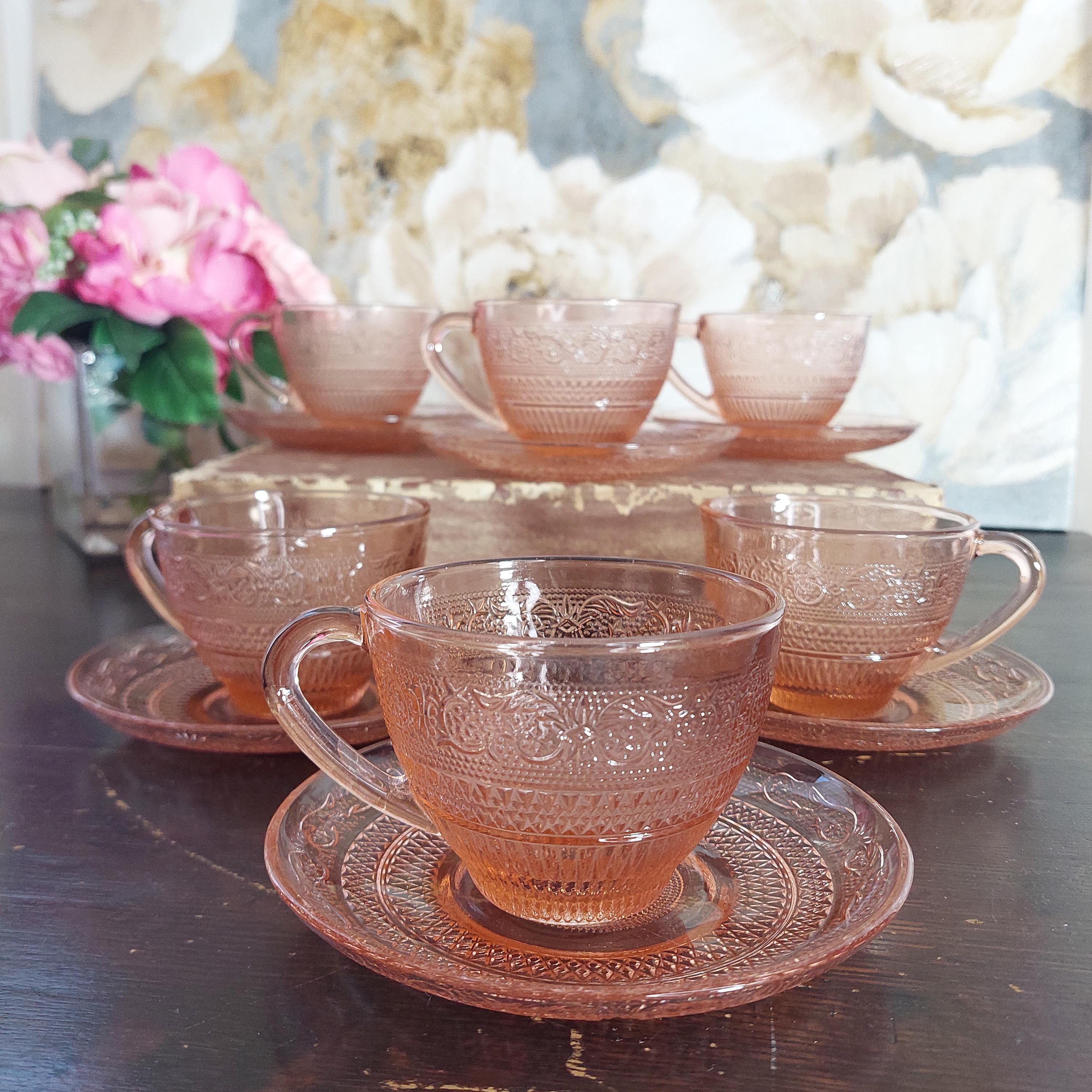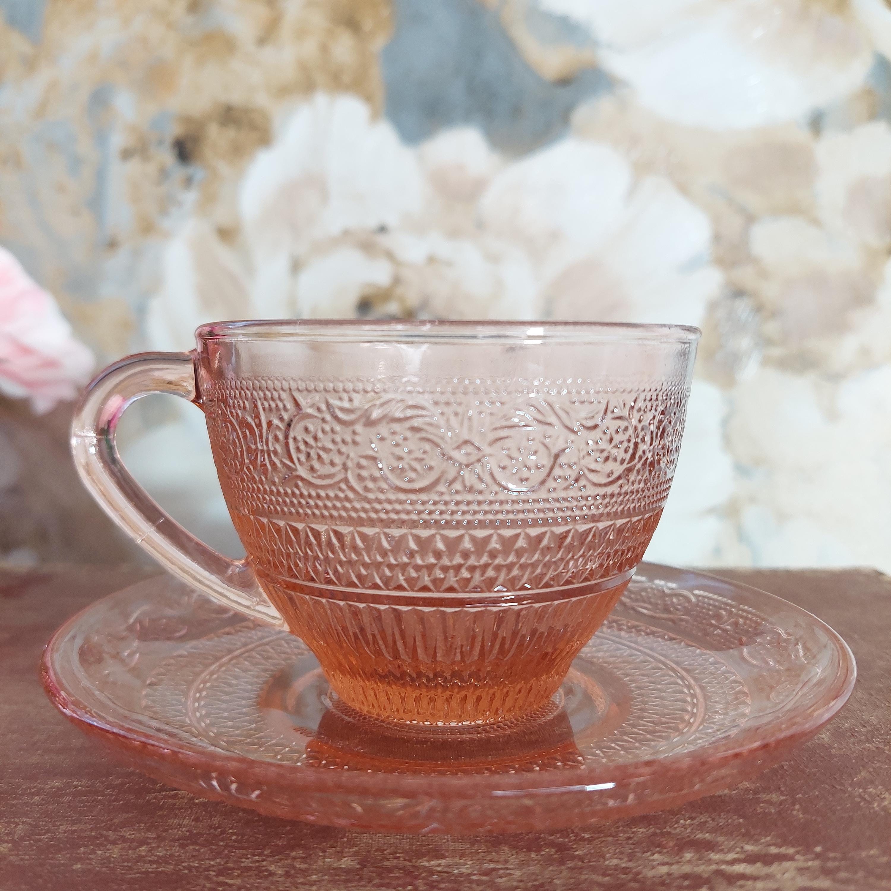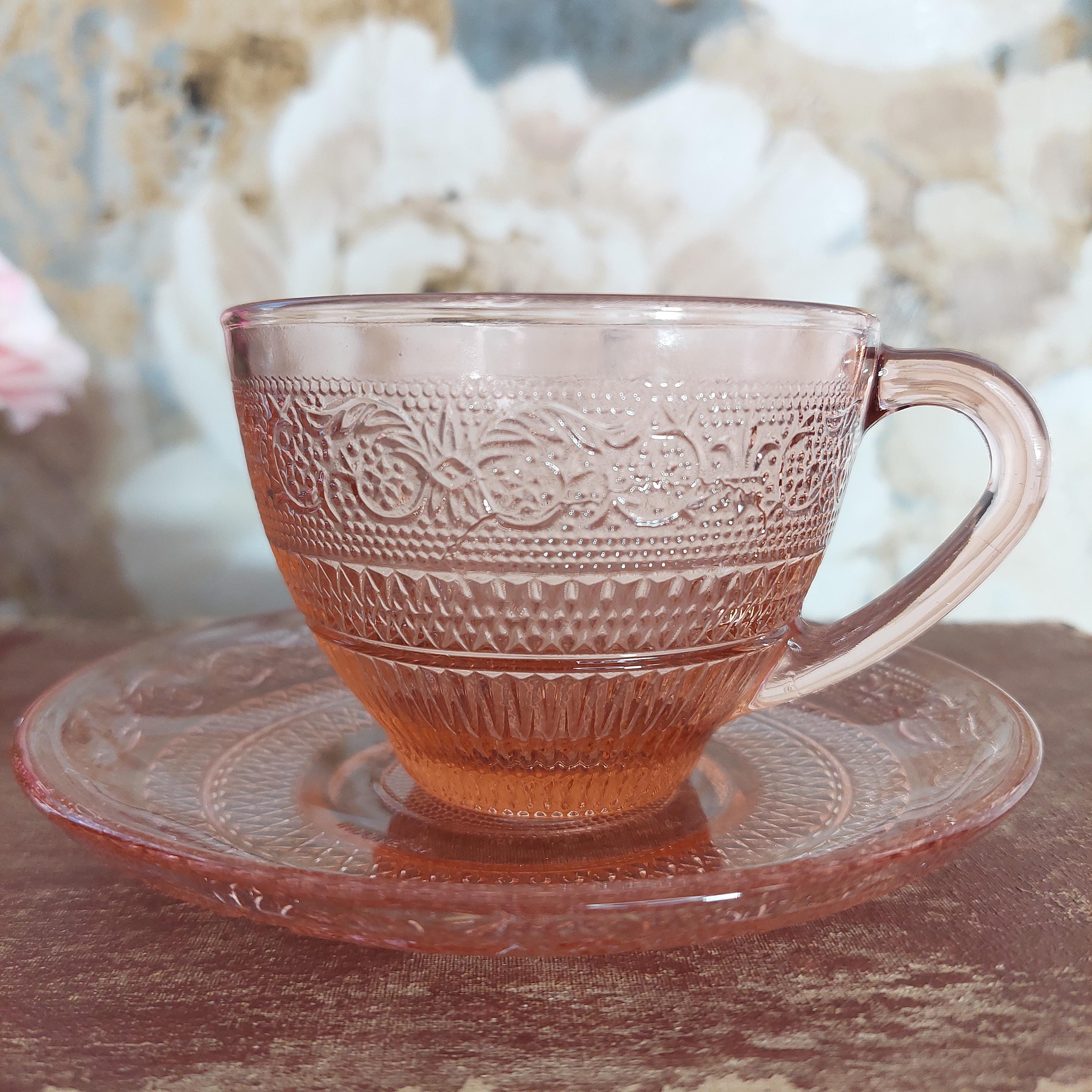 Pretty pink pressed tea cup & saucer glassware by KIG Indonesia in a pretty Fleur-de-Lis and trellis pattern.