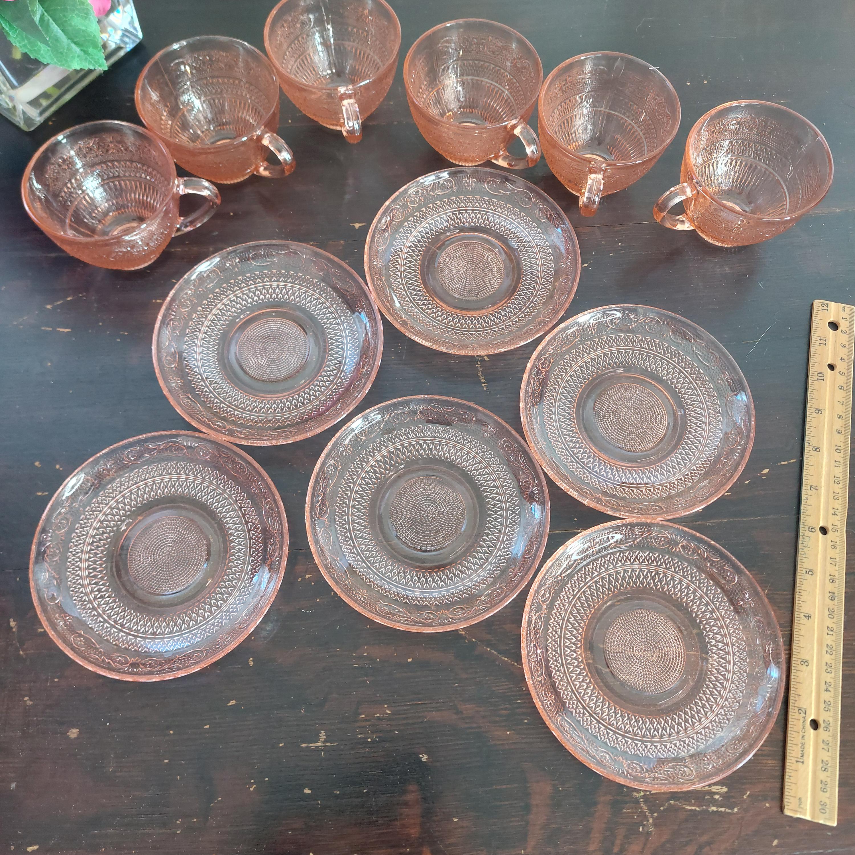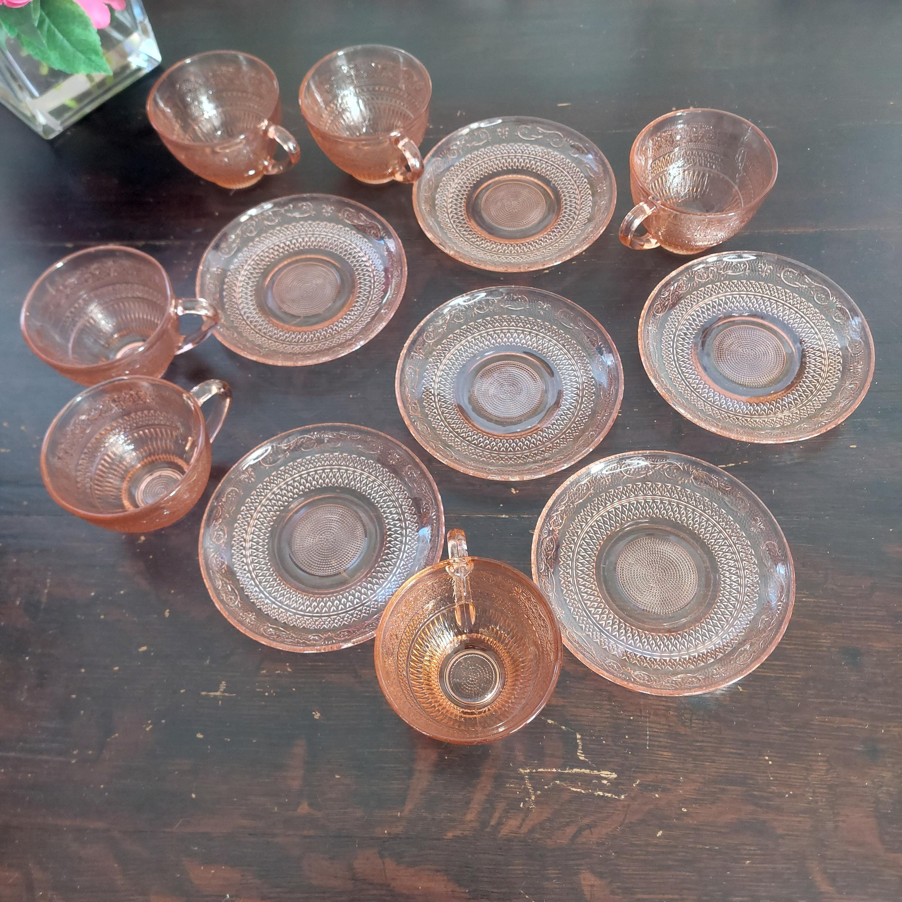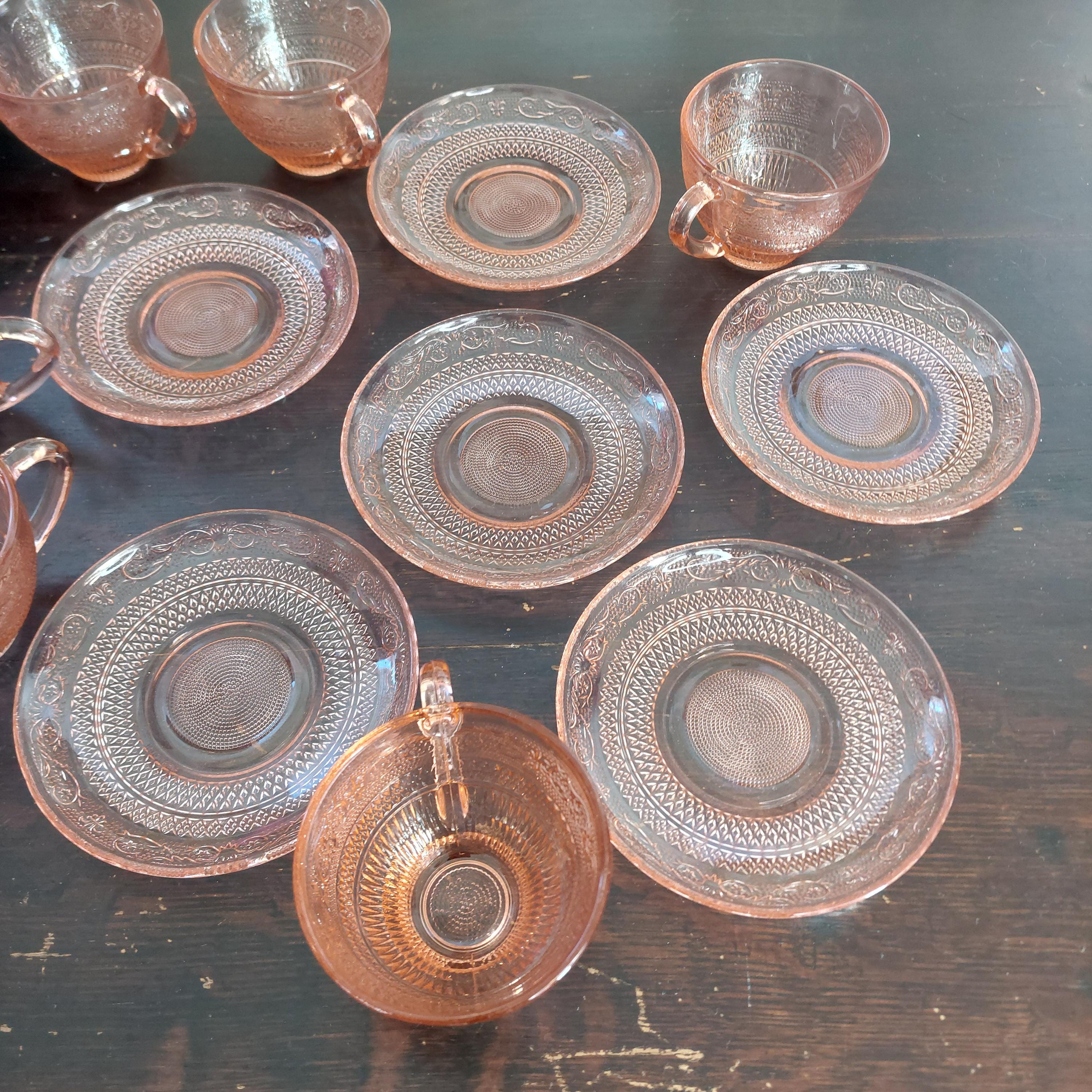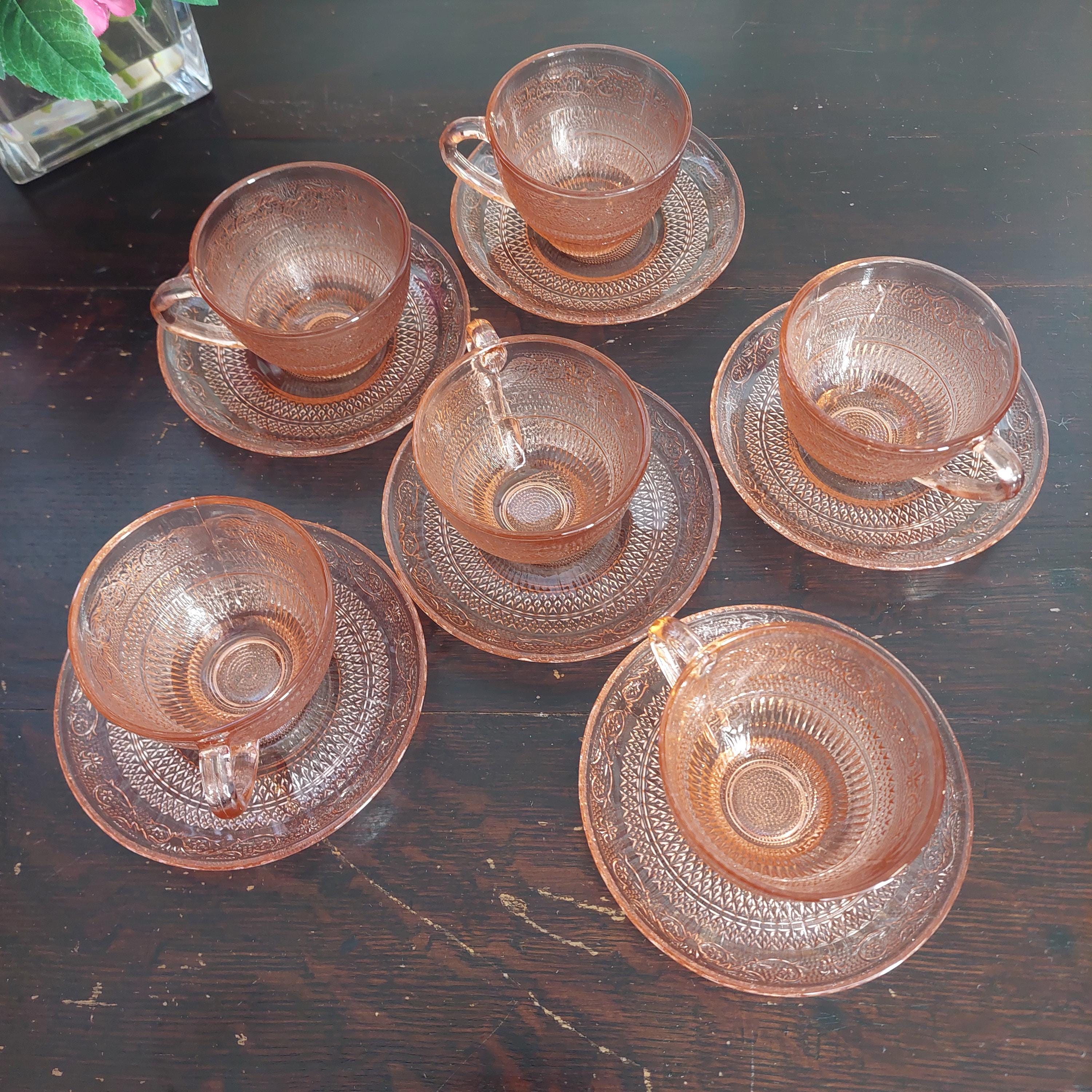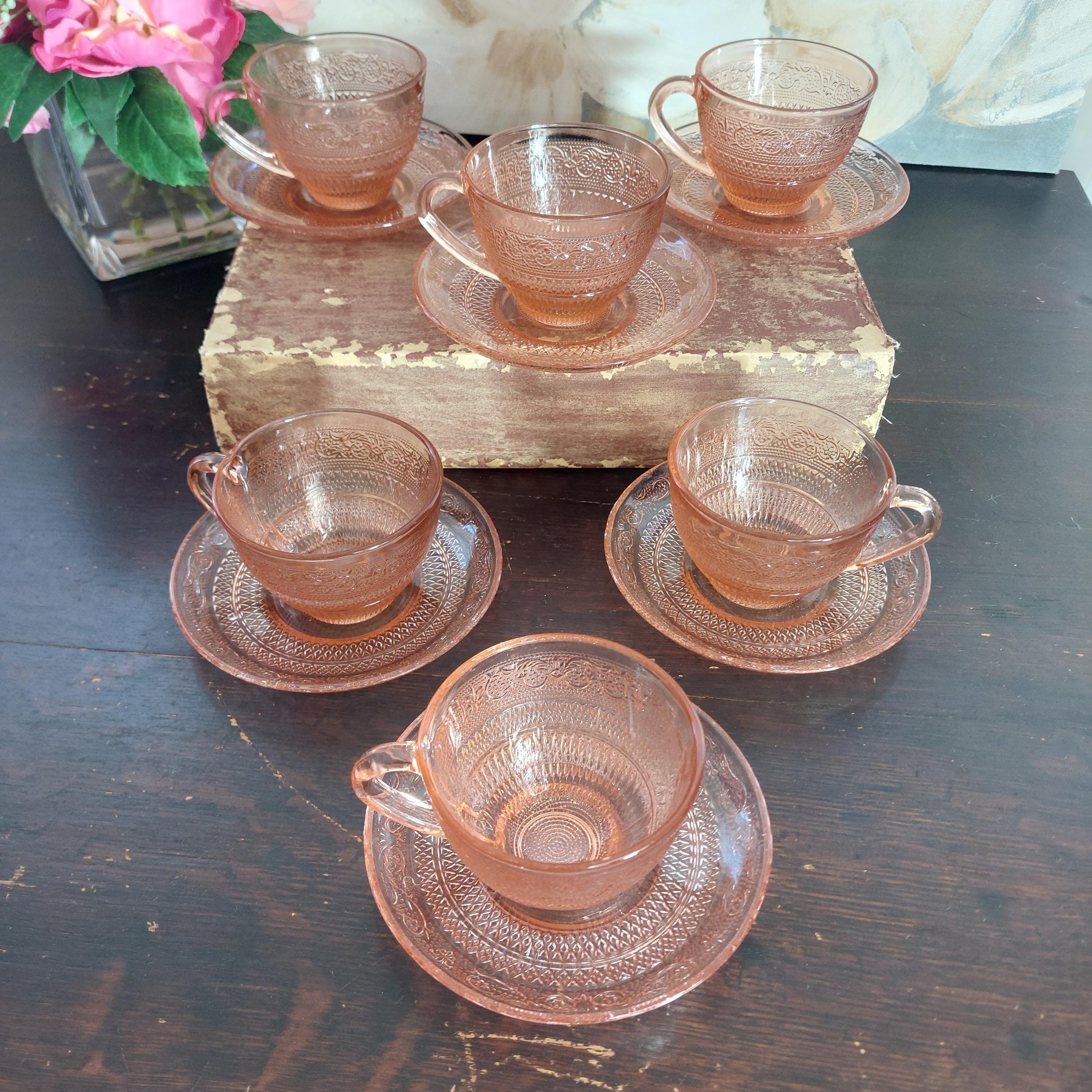 Pretty pink pressed tea cup & saucer glassware by KIG Indonesia in a pretty Fleur-de-Lis and trellis pattern.