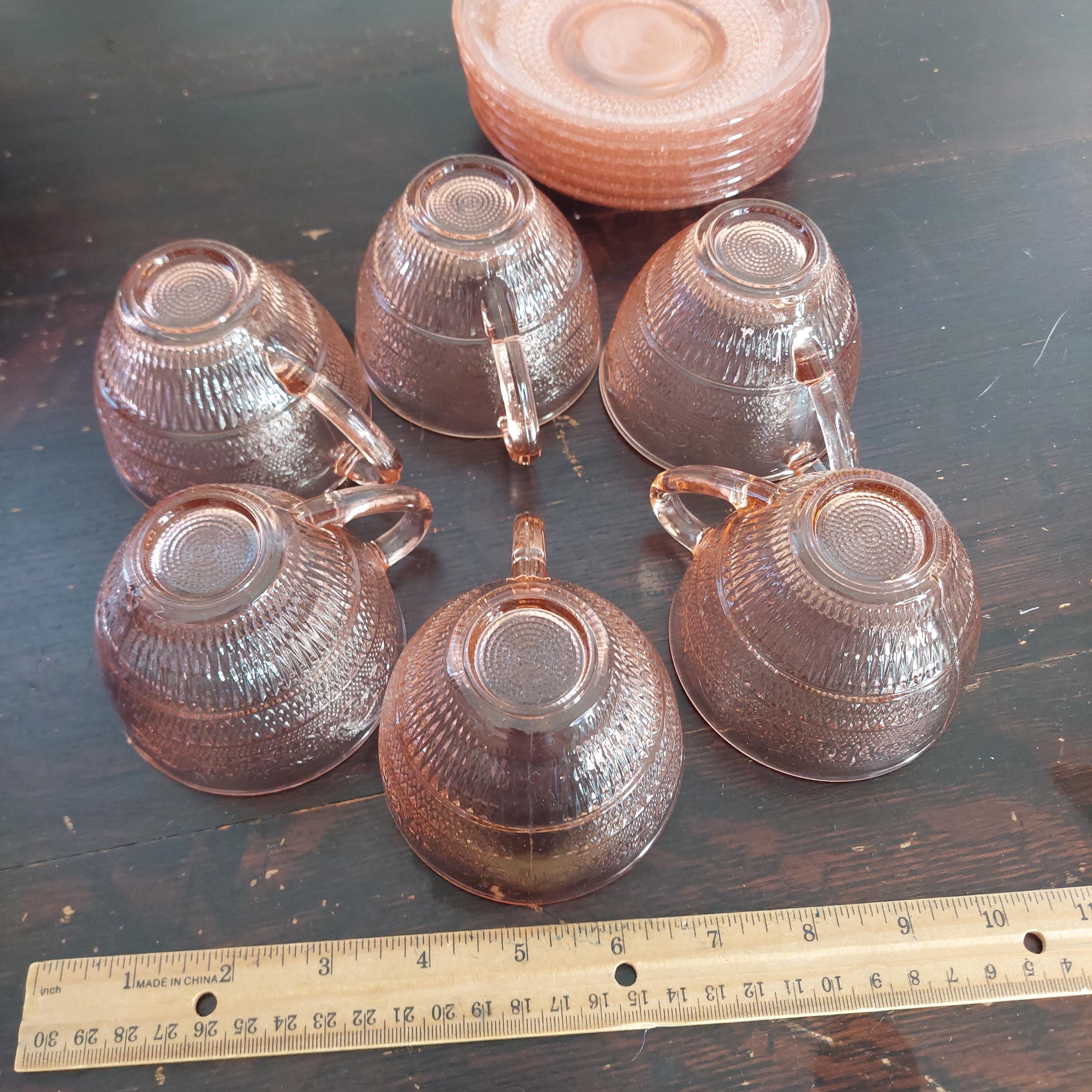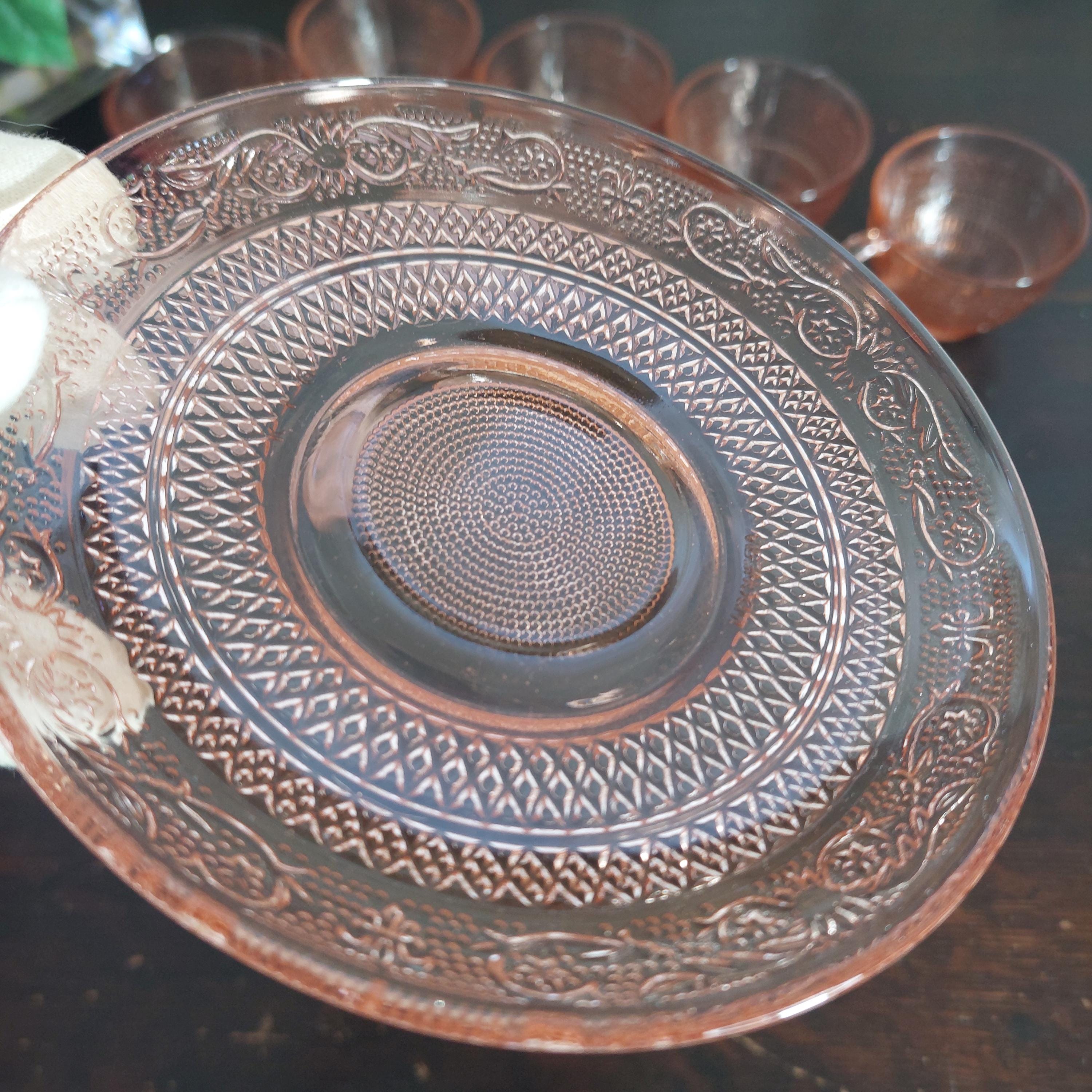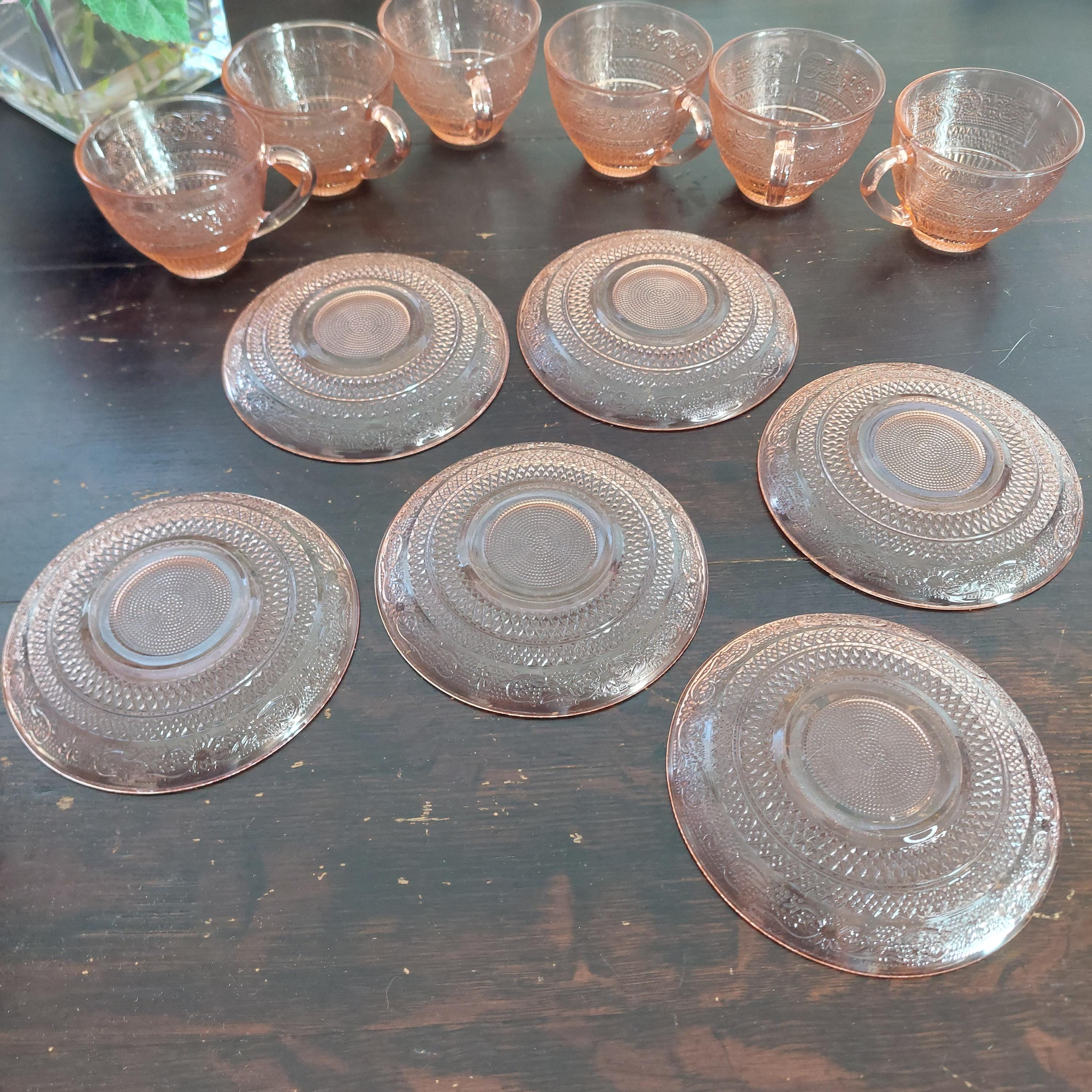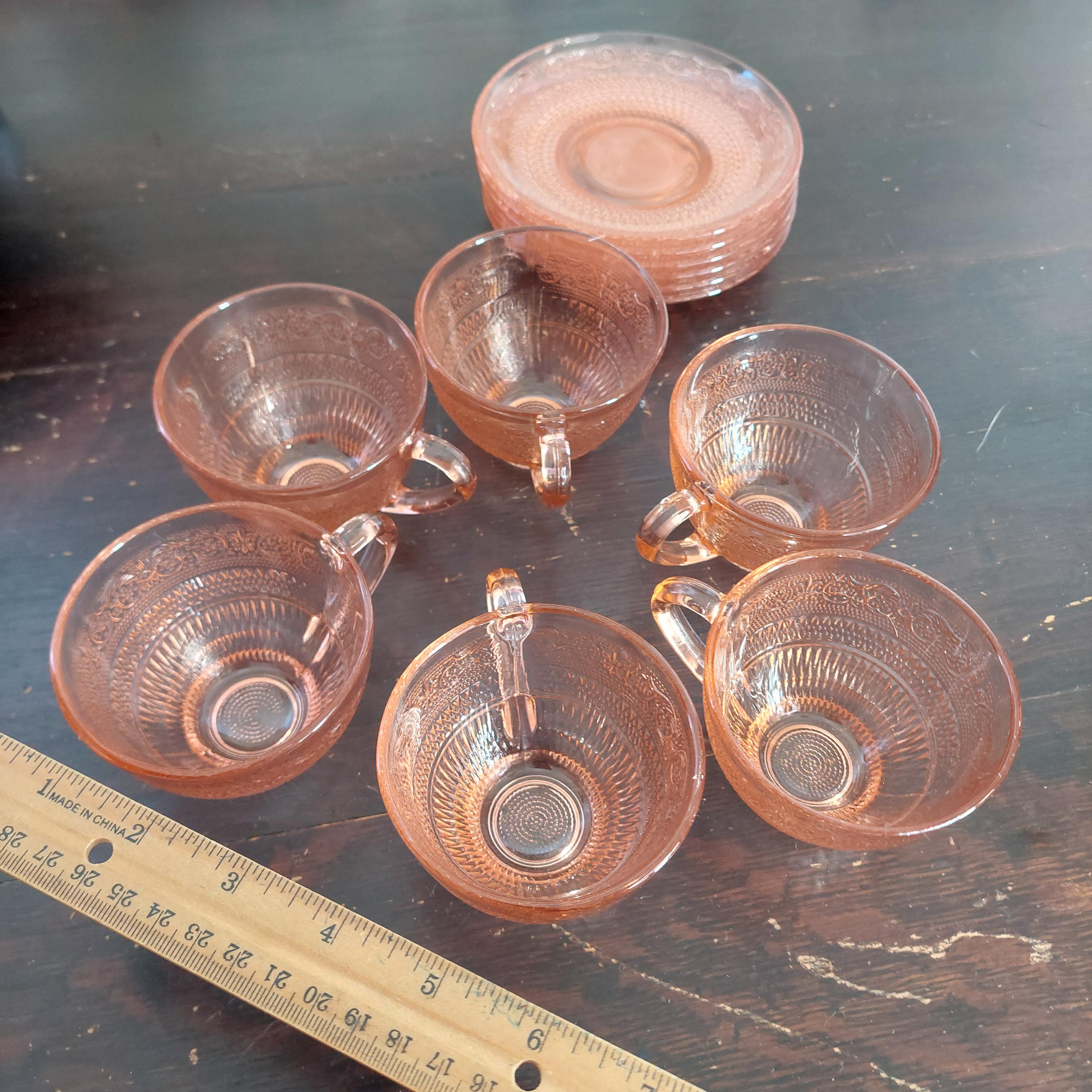 Pretty pink pressed tea cup & saucer glassware by KIG Indonesia in a pretty Fleur-de-Lis and trellis pattern.