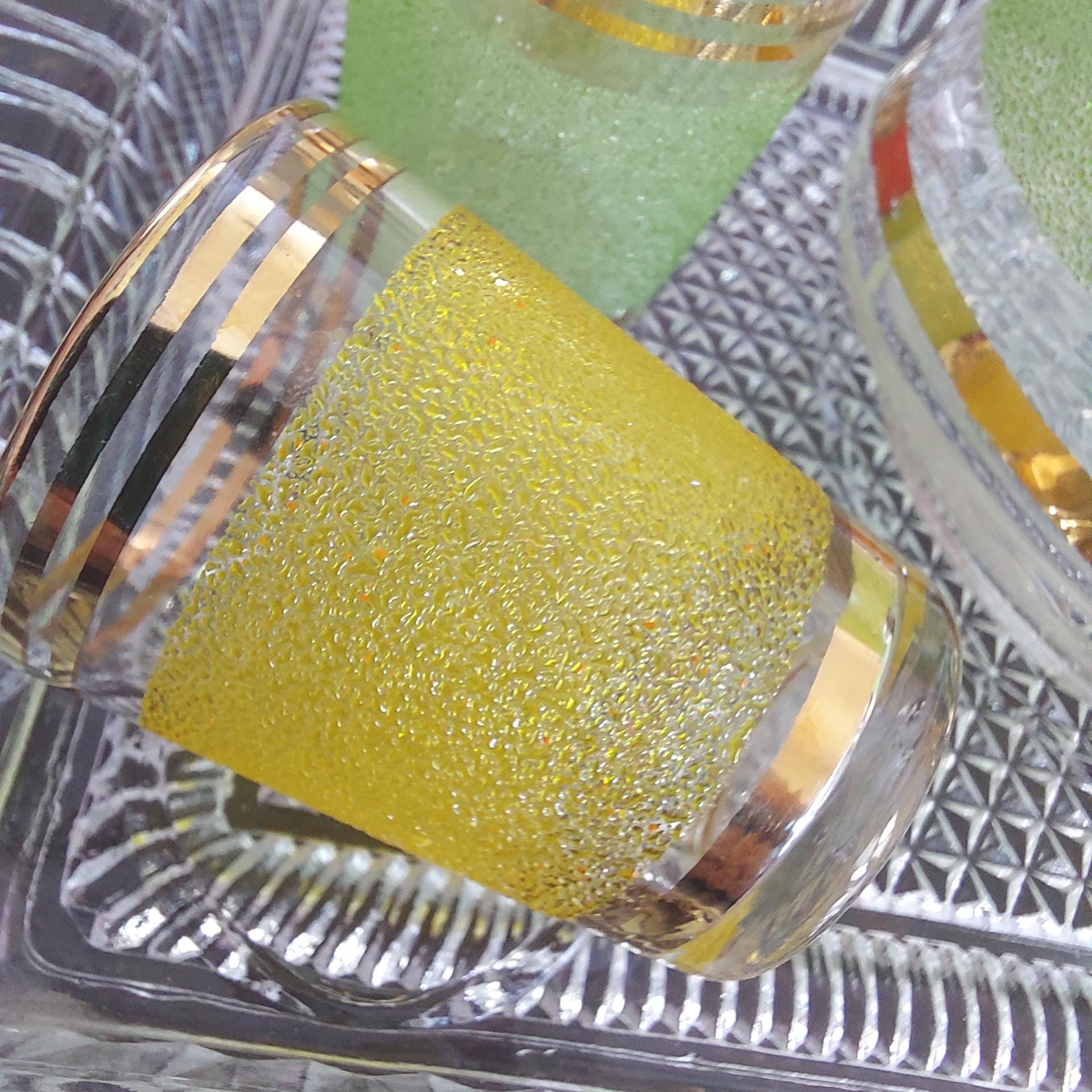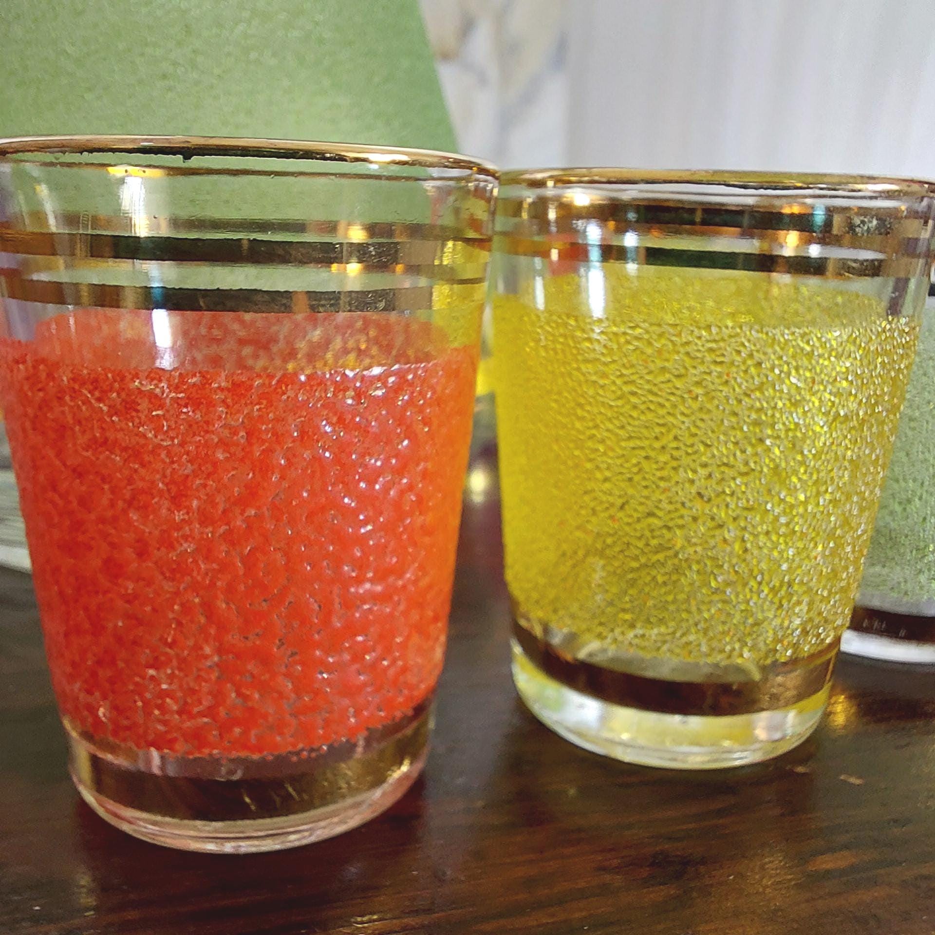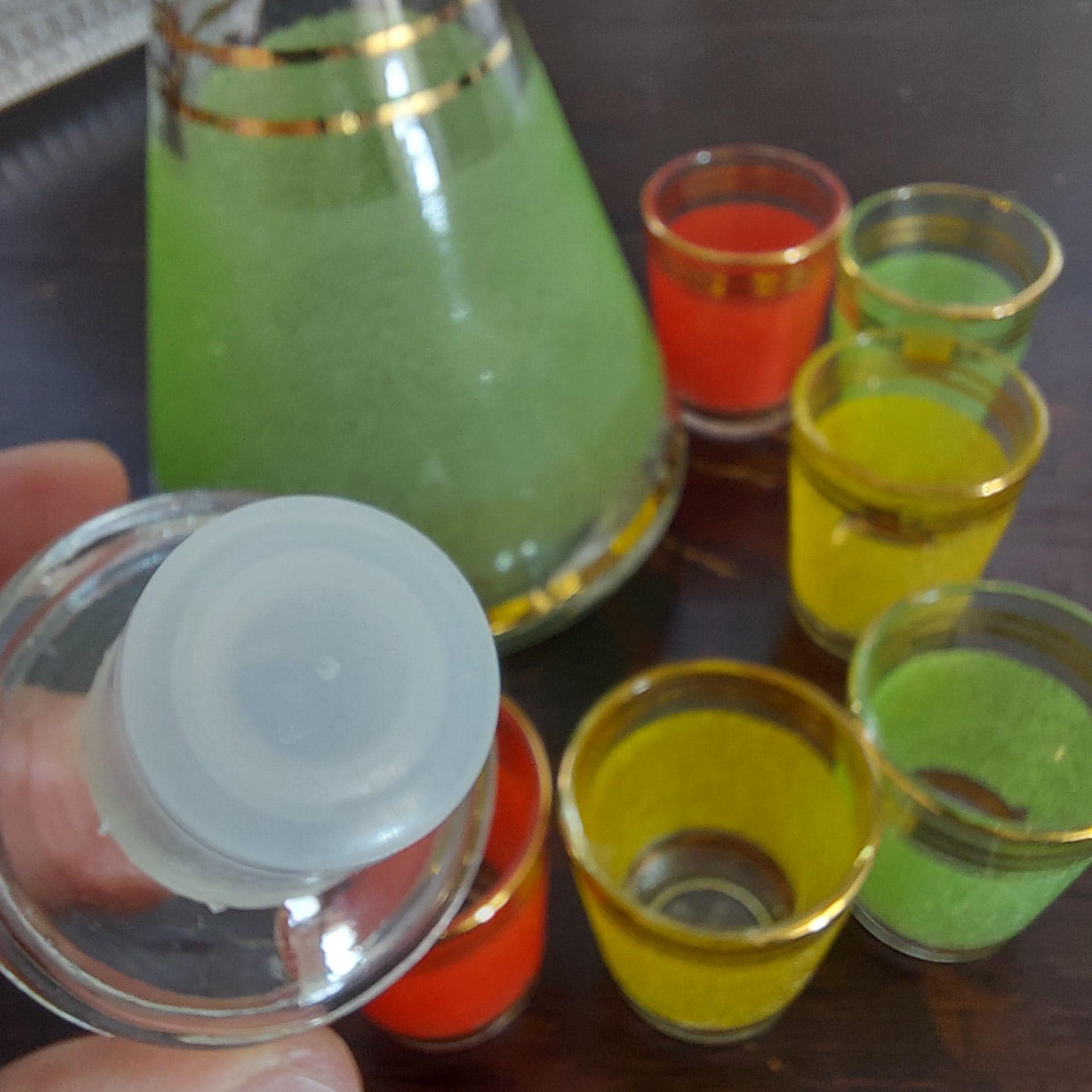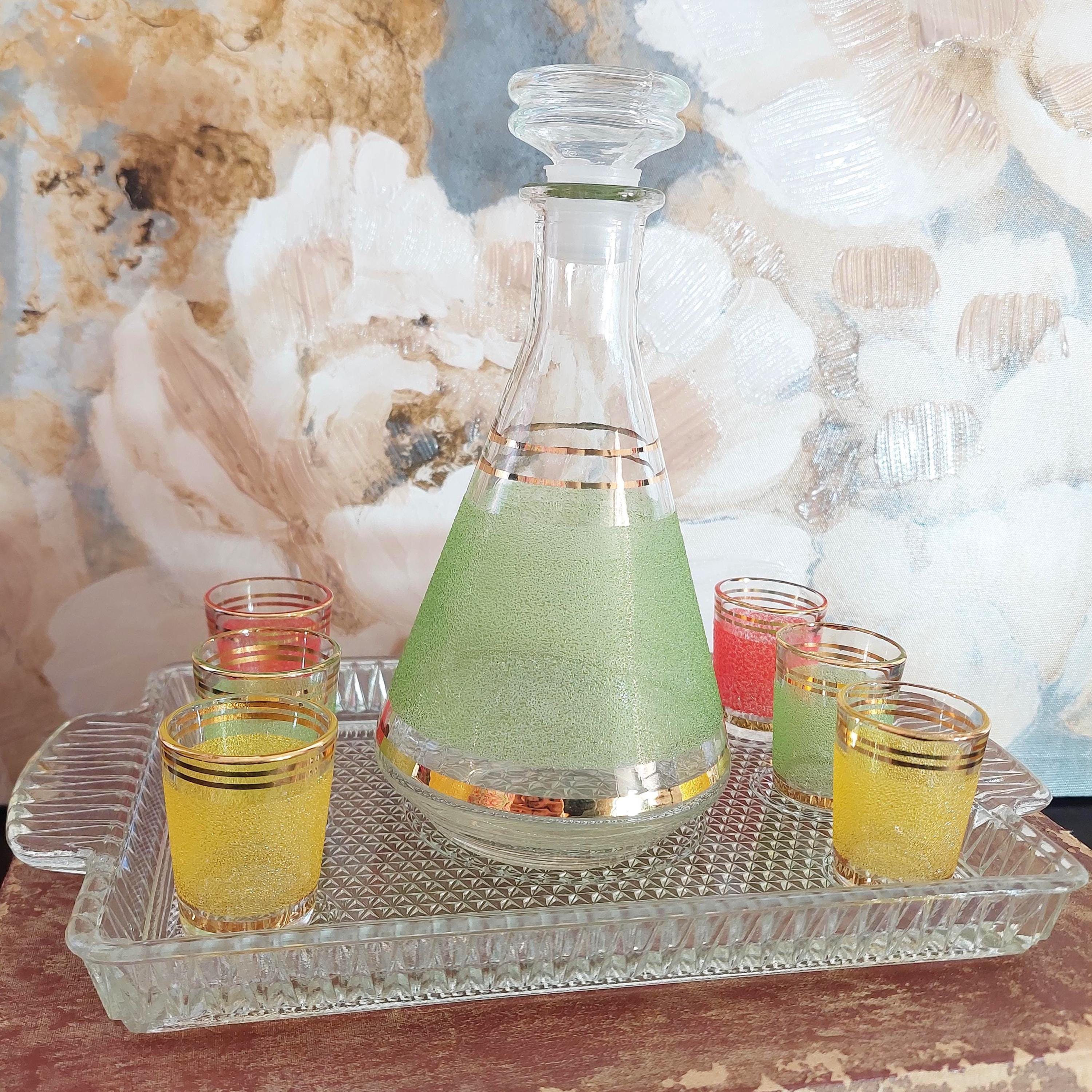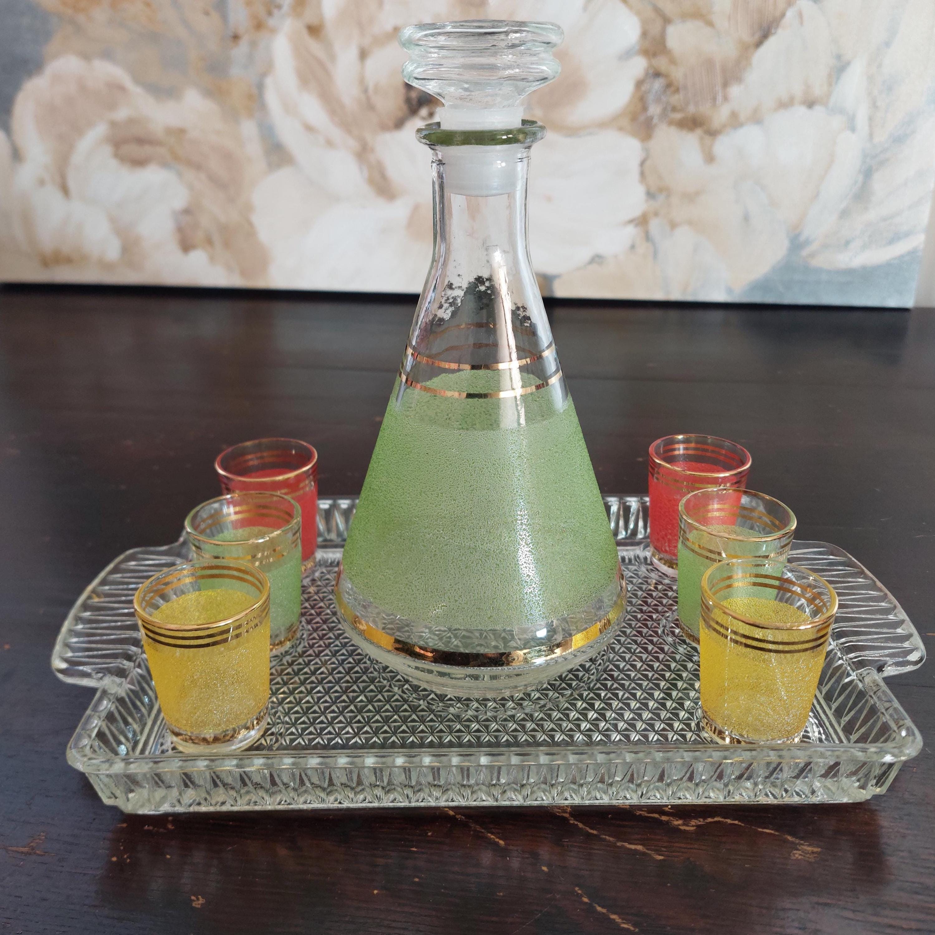Mid-Century French liqueur 8-piece decanter set. Decanter & shot glasses have a textured surface and gold trim.