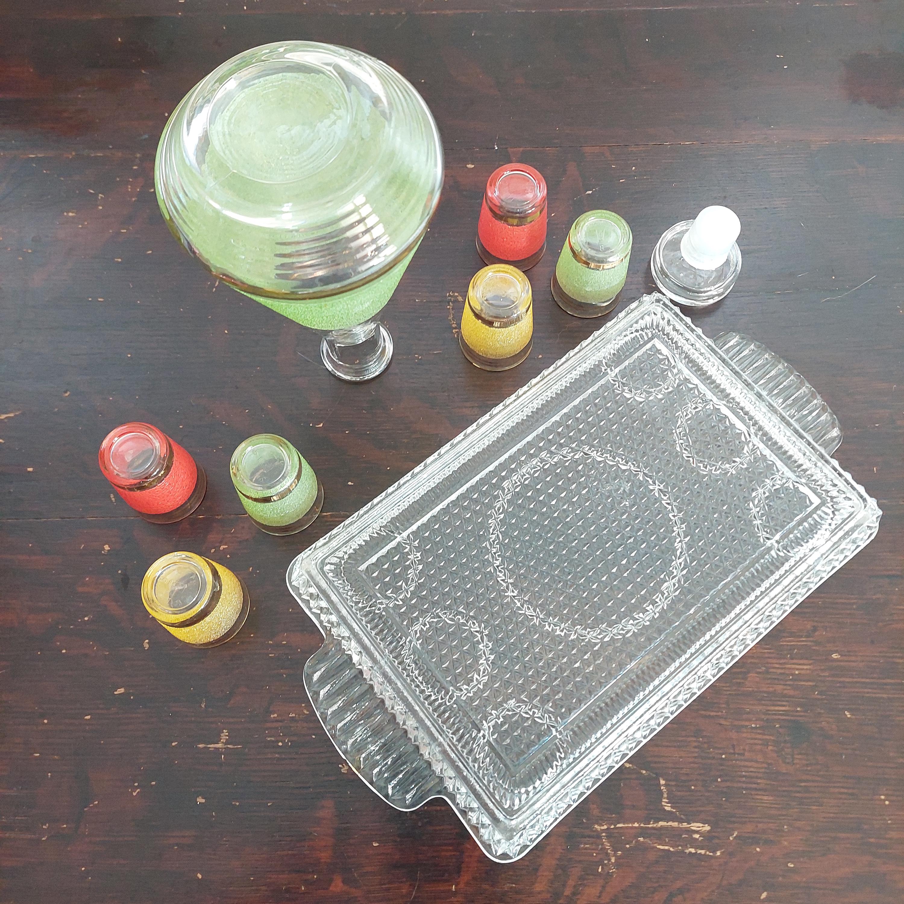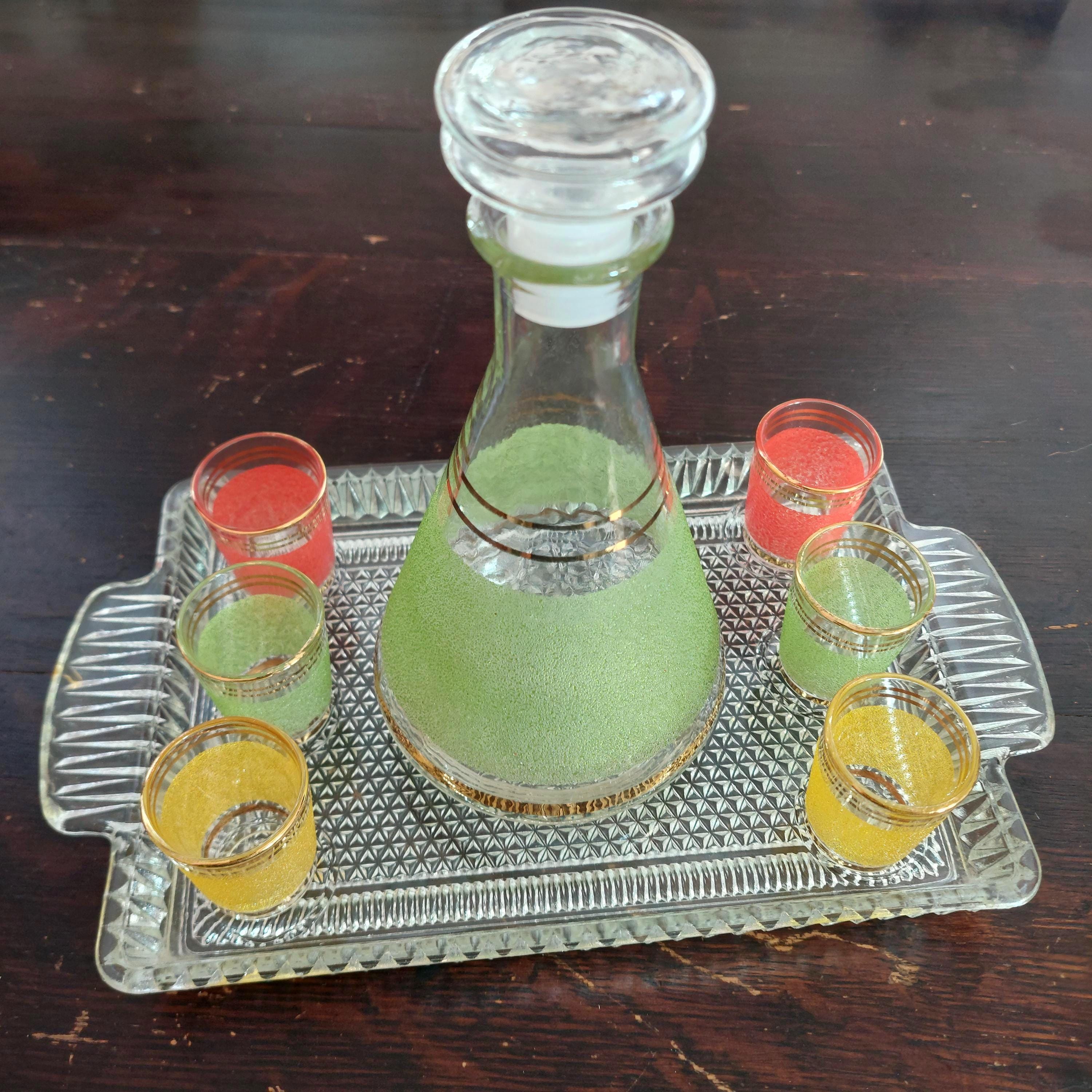 8-piece set includes decanter with stopper, 6 shot glasses and glass tray.