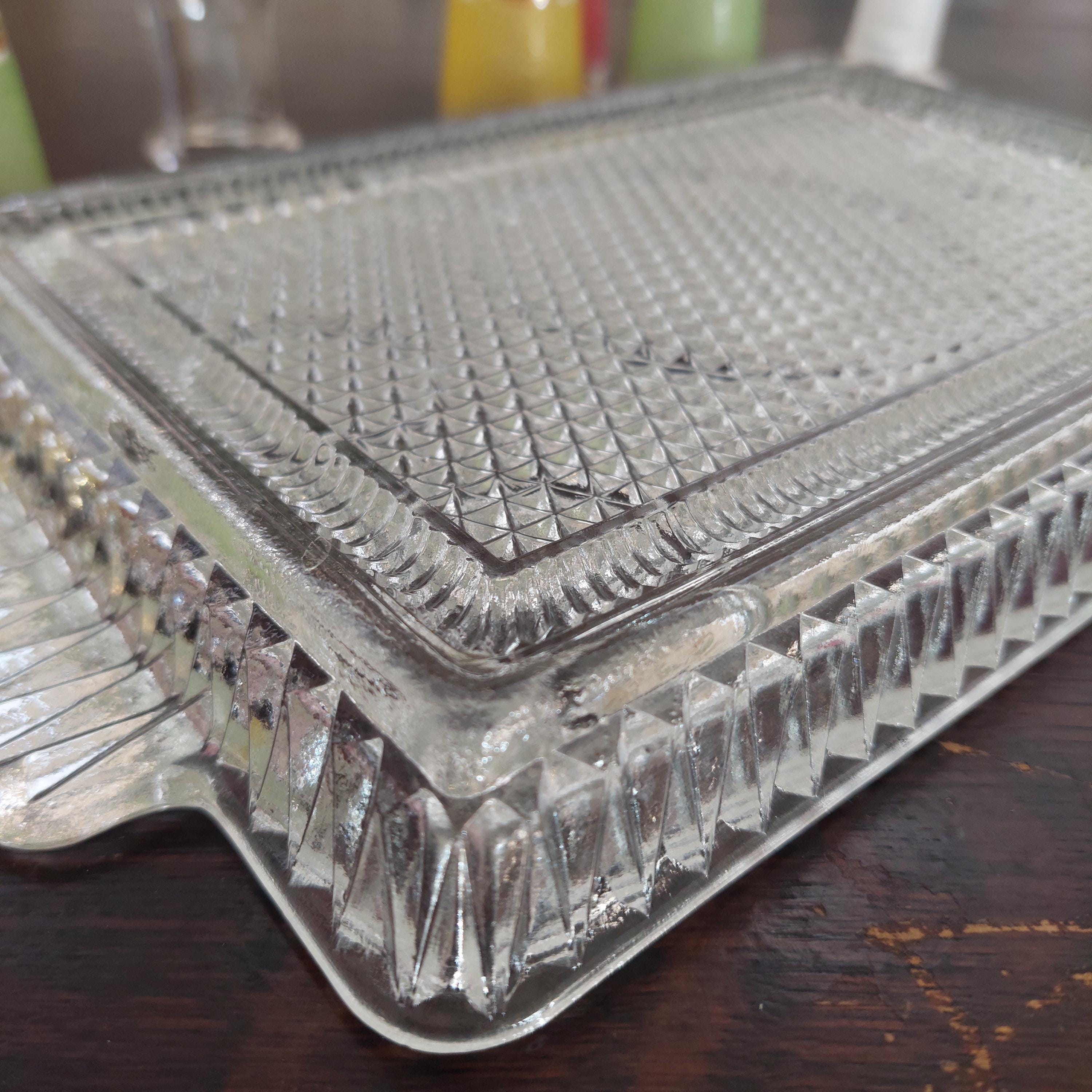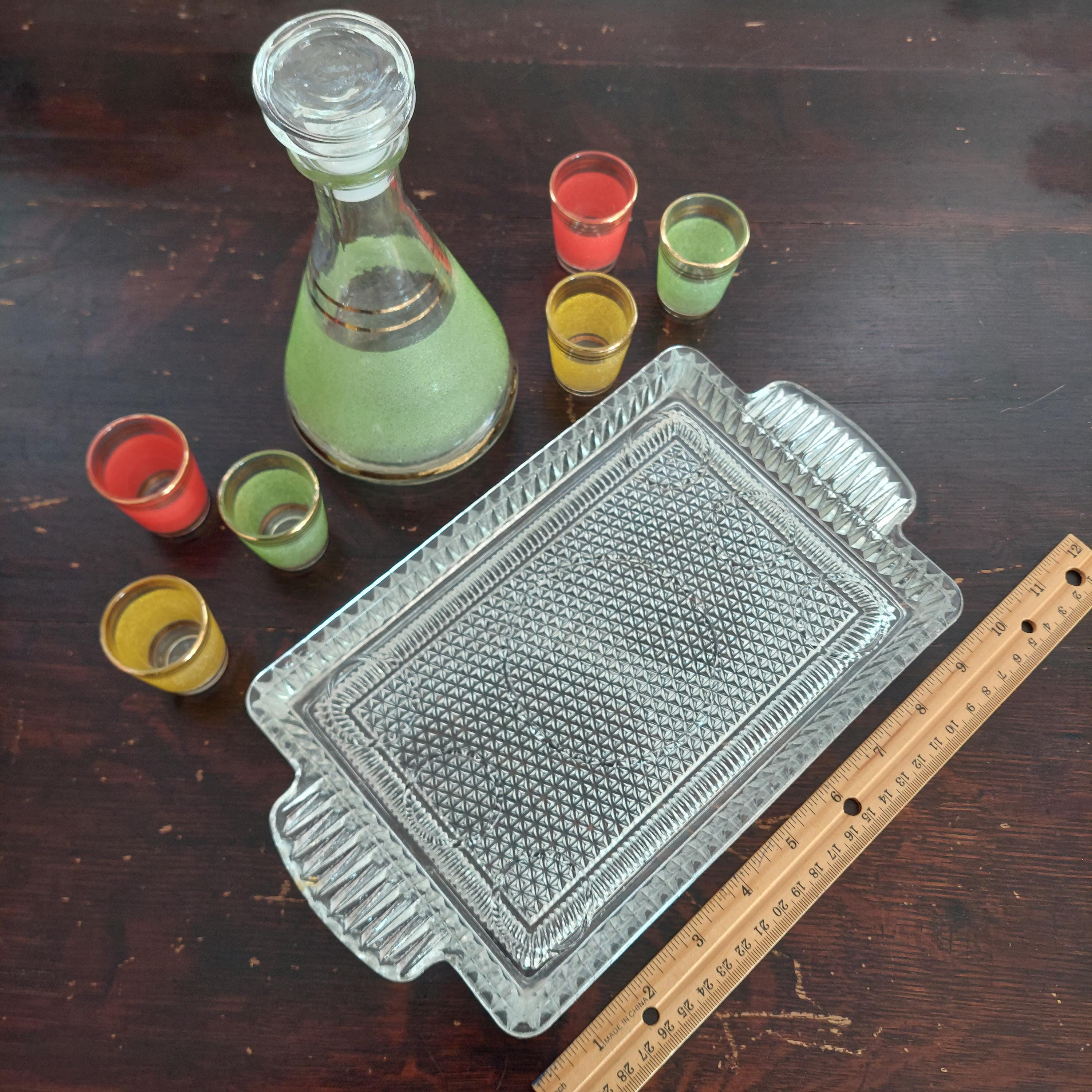 Thick pressed glass tray has a smooth top surface & is molded to fit the decanter & shot glasses.